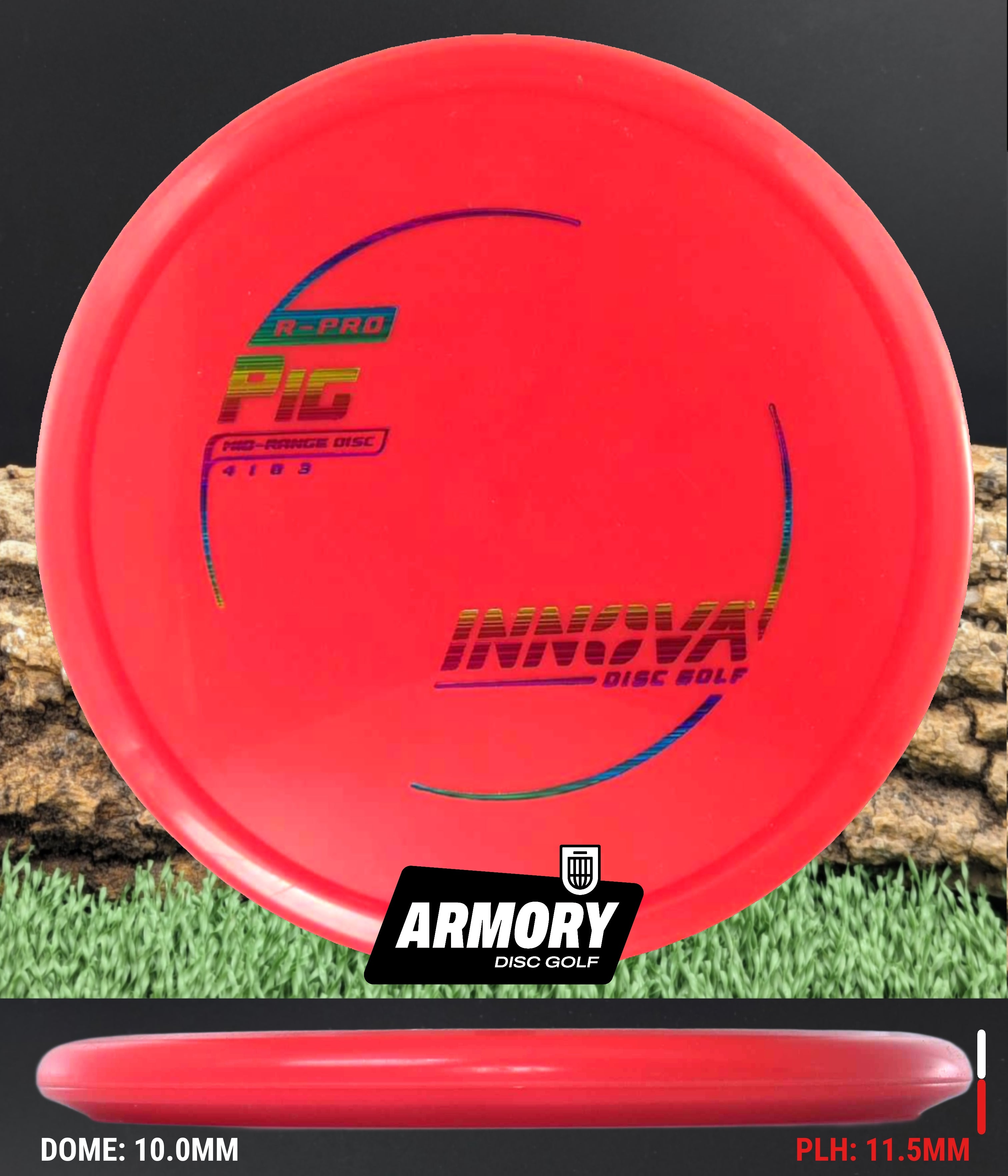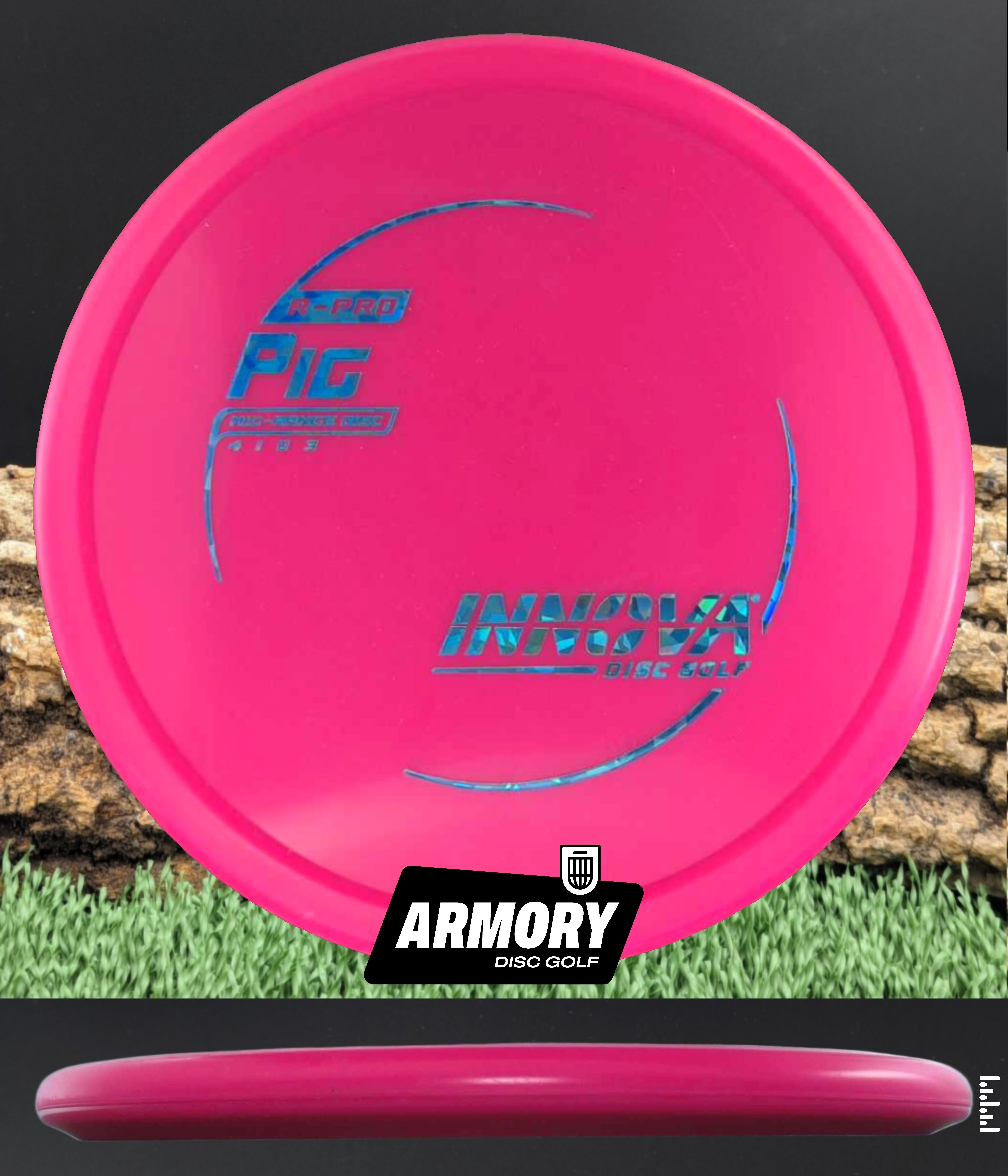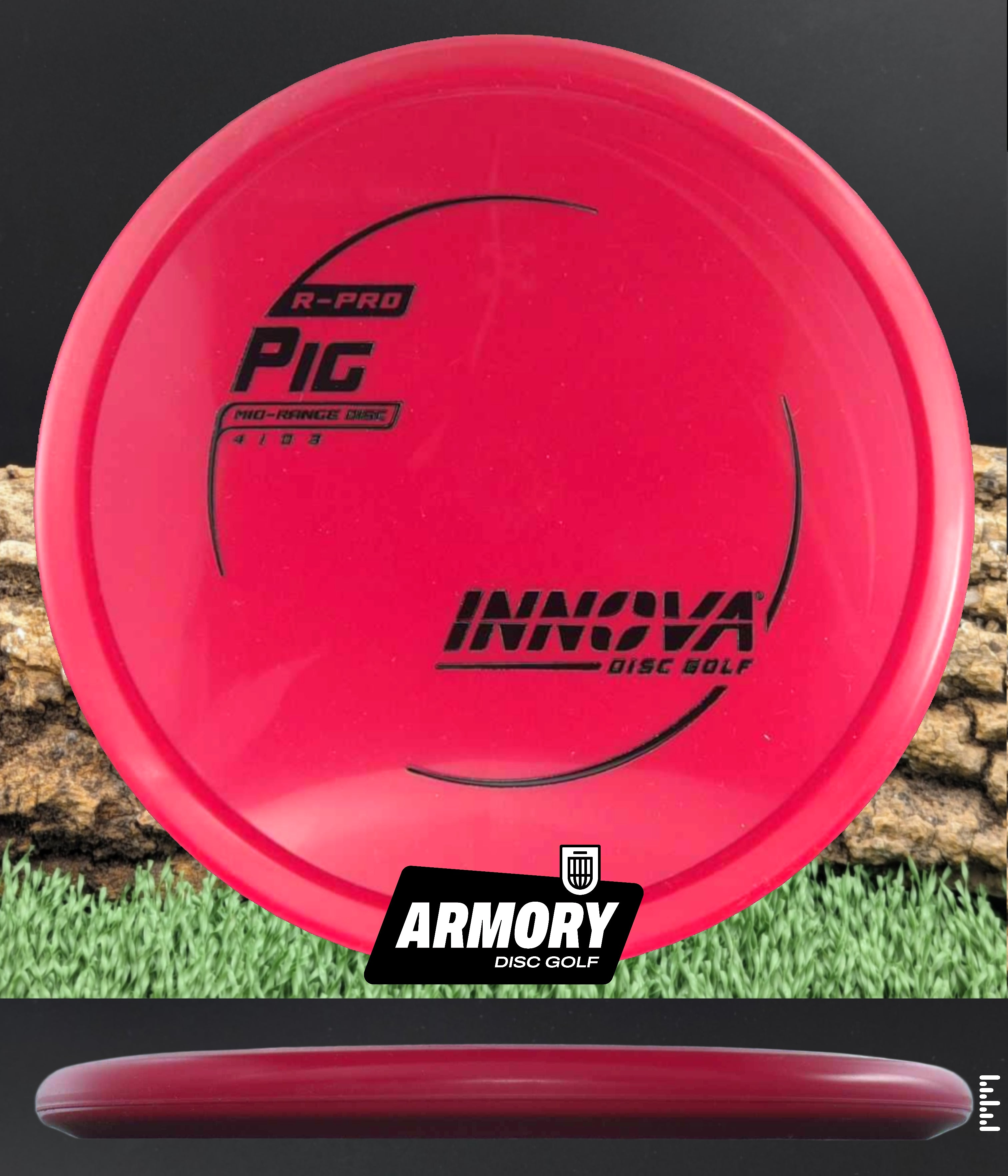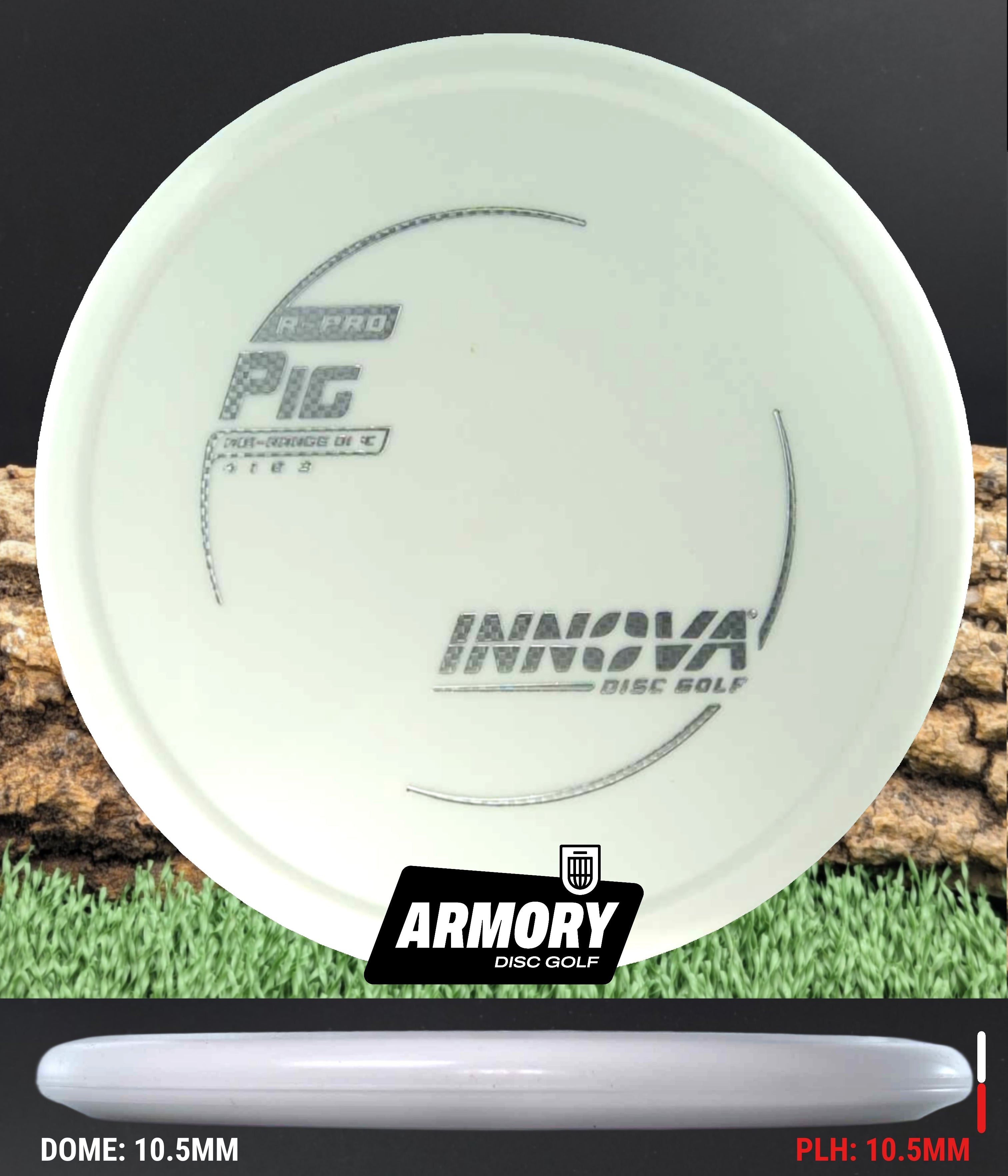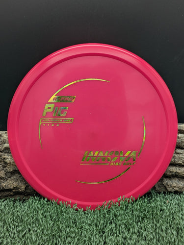 The Innova Pig is a reliable overstable putt and approach disc designed for precision shots in all weather conditions. Featuring a unique thumb track and blunt nose, disc delivers exceptional torque resistance and predictable fade, making it ideal for forehand approaches, headwind putts, and controlled upshots. The Pig's low-profile design and R-Pro plastic blend provide superior grip and durability while minimizing skip and ground action.