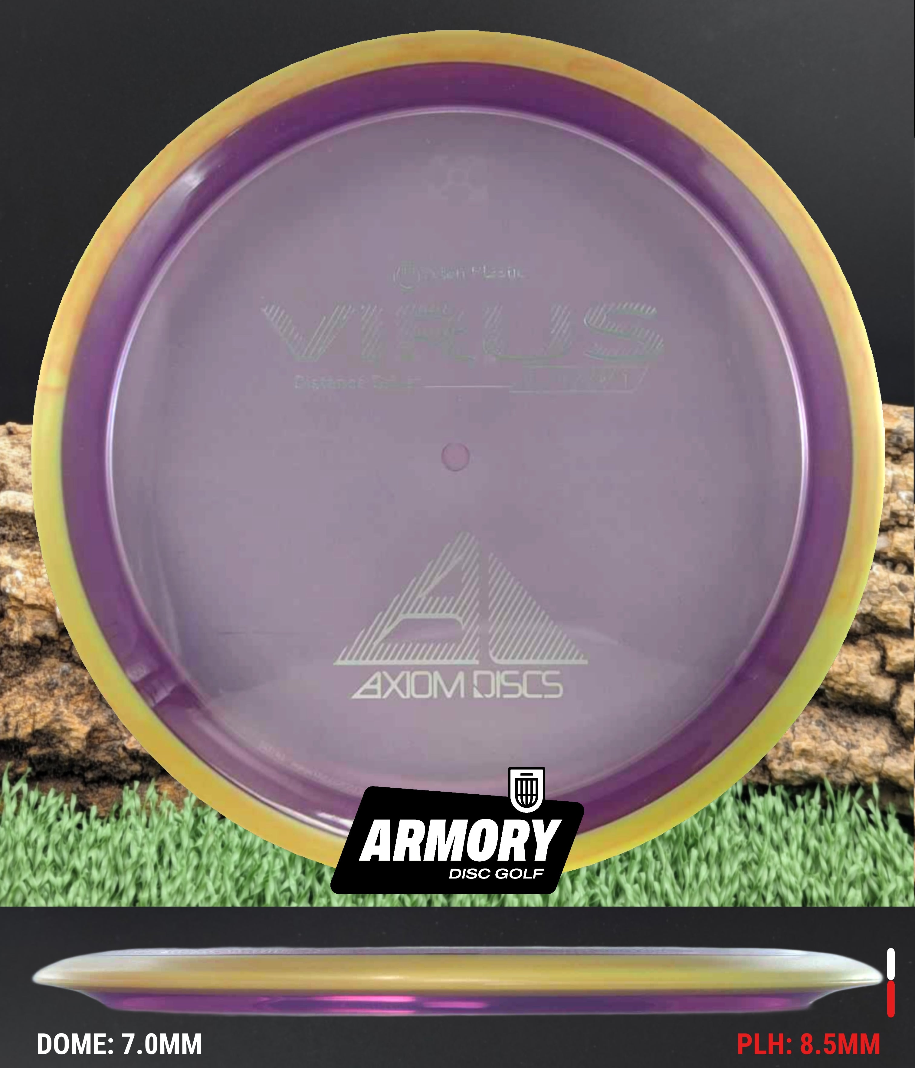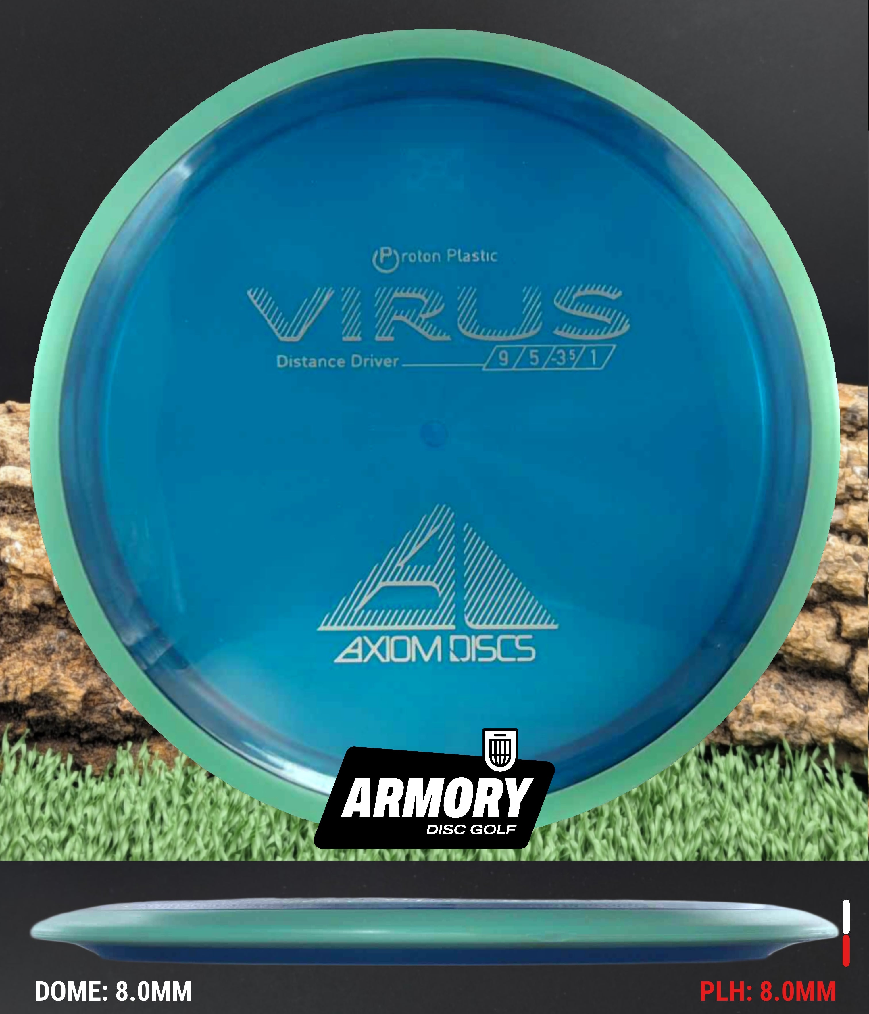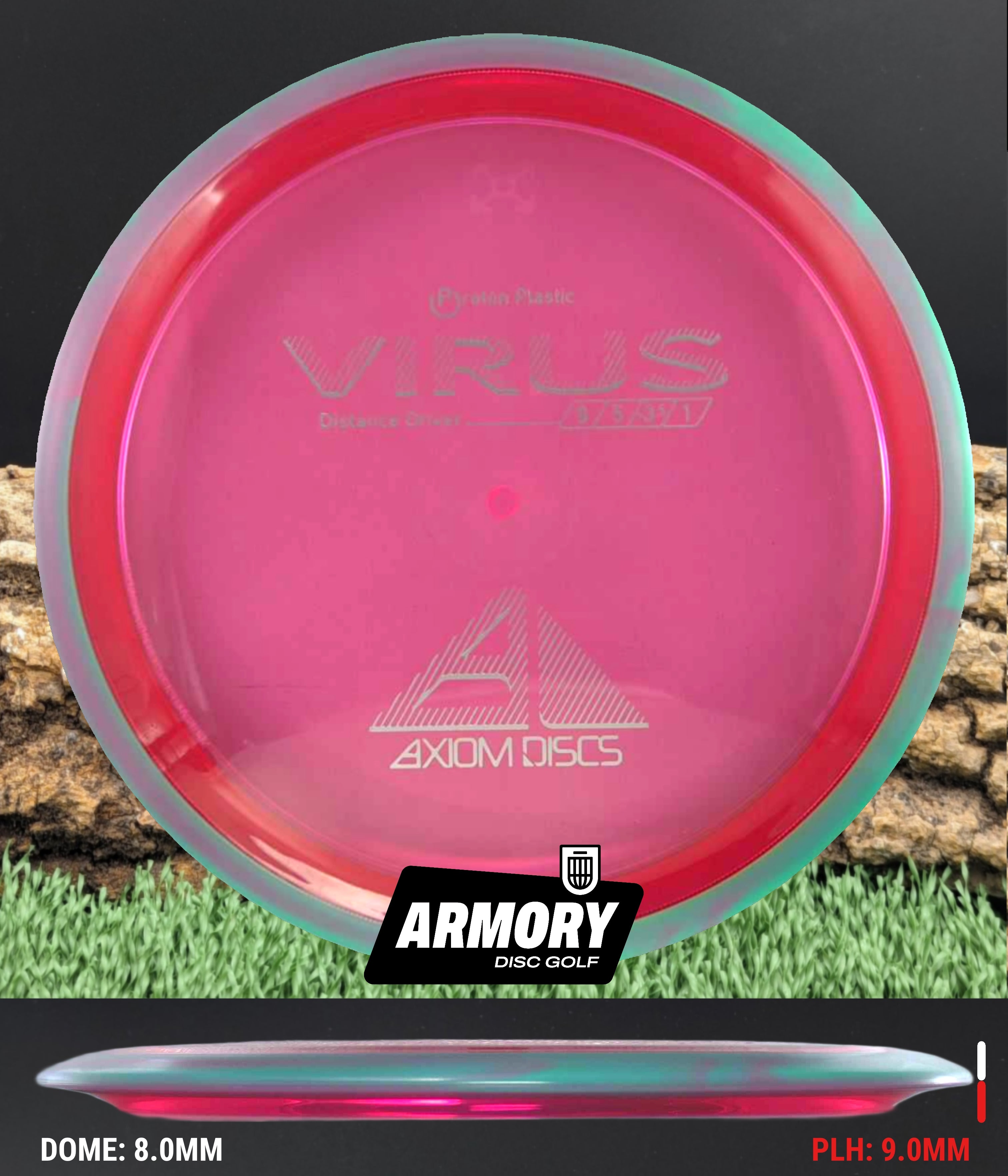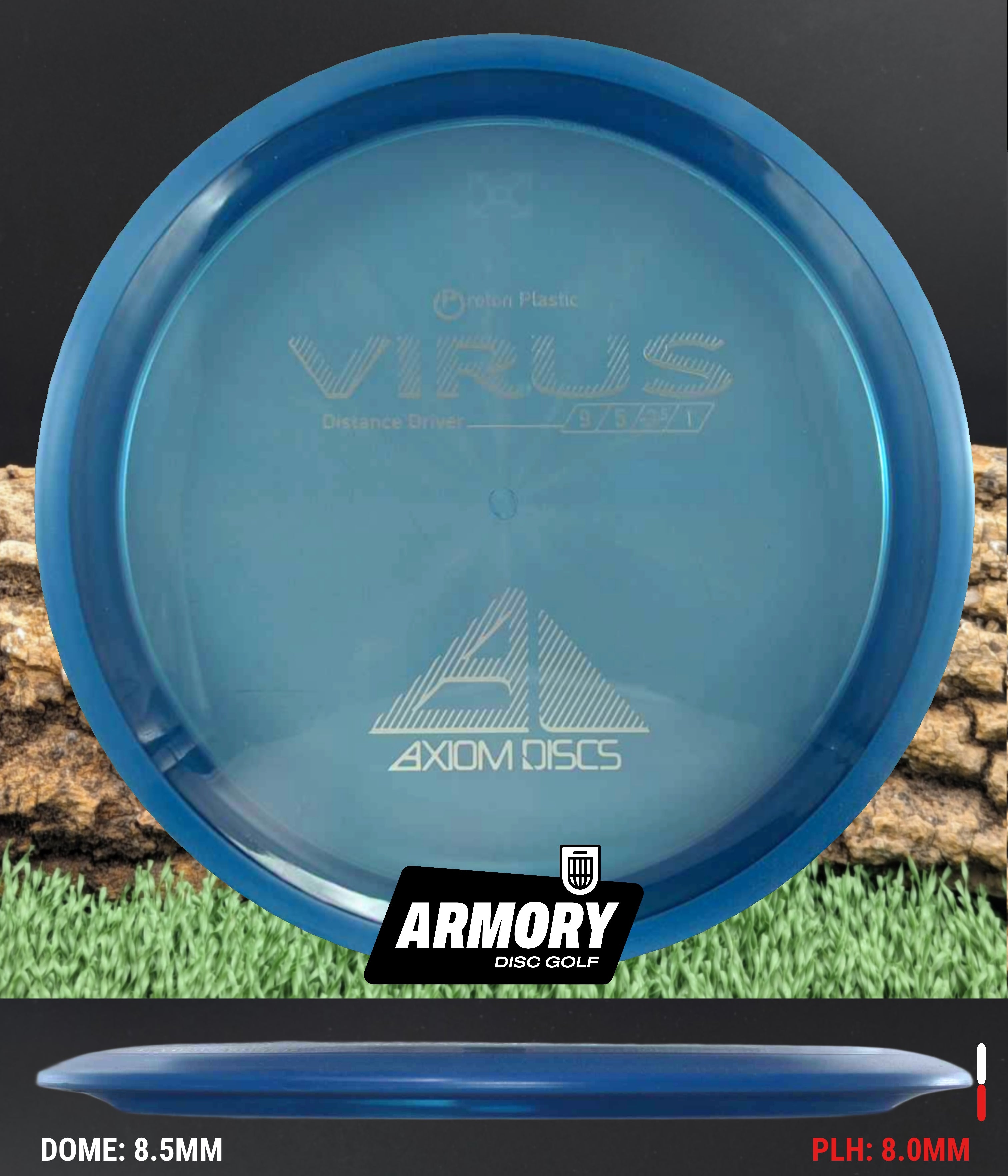The Virus is Axiom’s easiest to throw distance driver, with a glide and responsive understability that keeps it in the air. Power throwers will be able to flex huge turnover shots with straight forward fade. Average throwers will be able to extend and shape lines using the Virus’ turn and gentle fade. Compared to the MVP lineup, the Virus resembles a worn-in Impulse.
