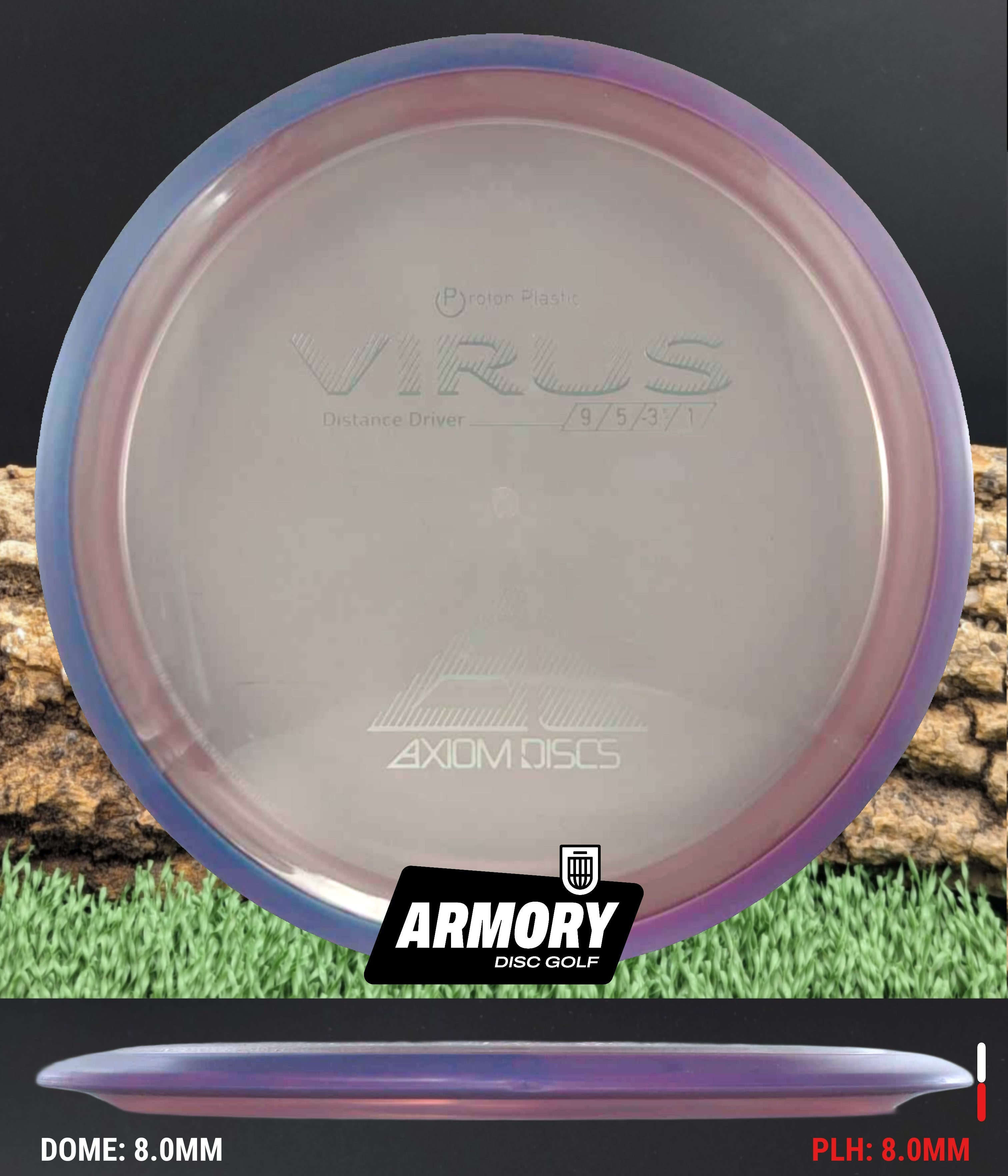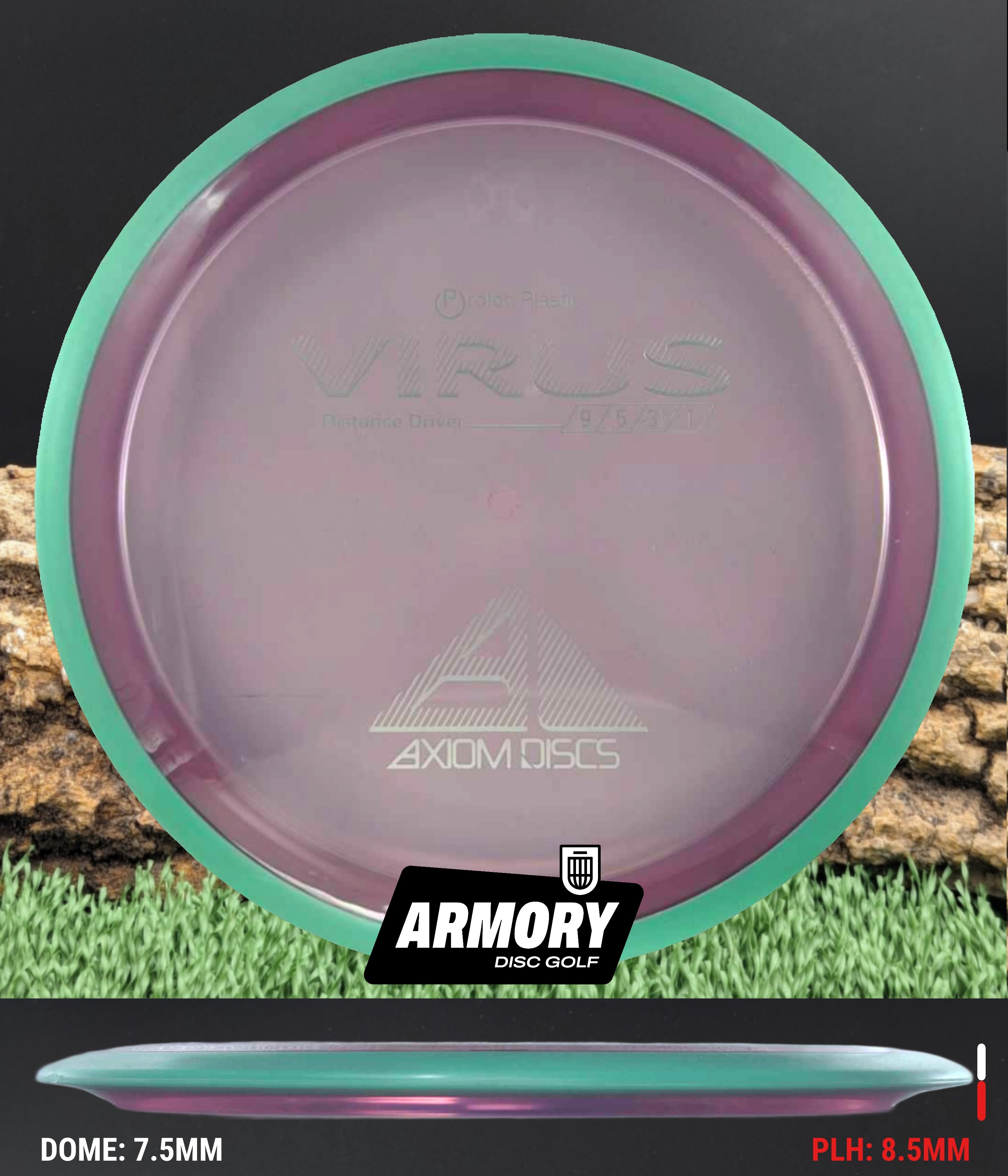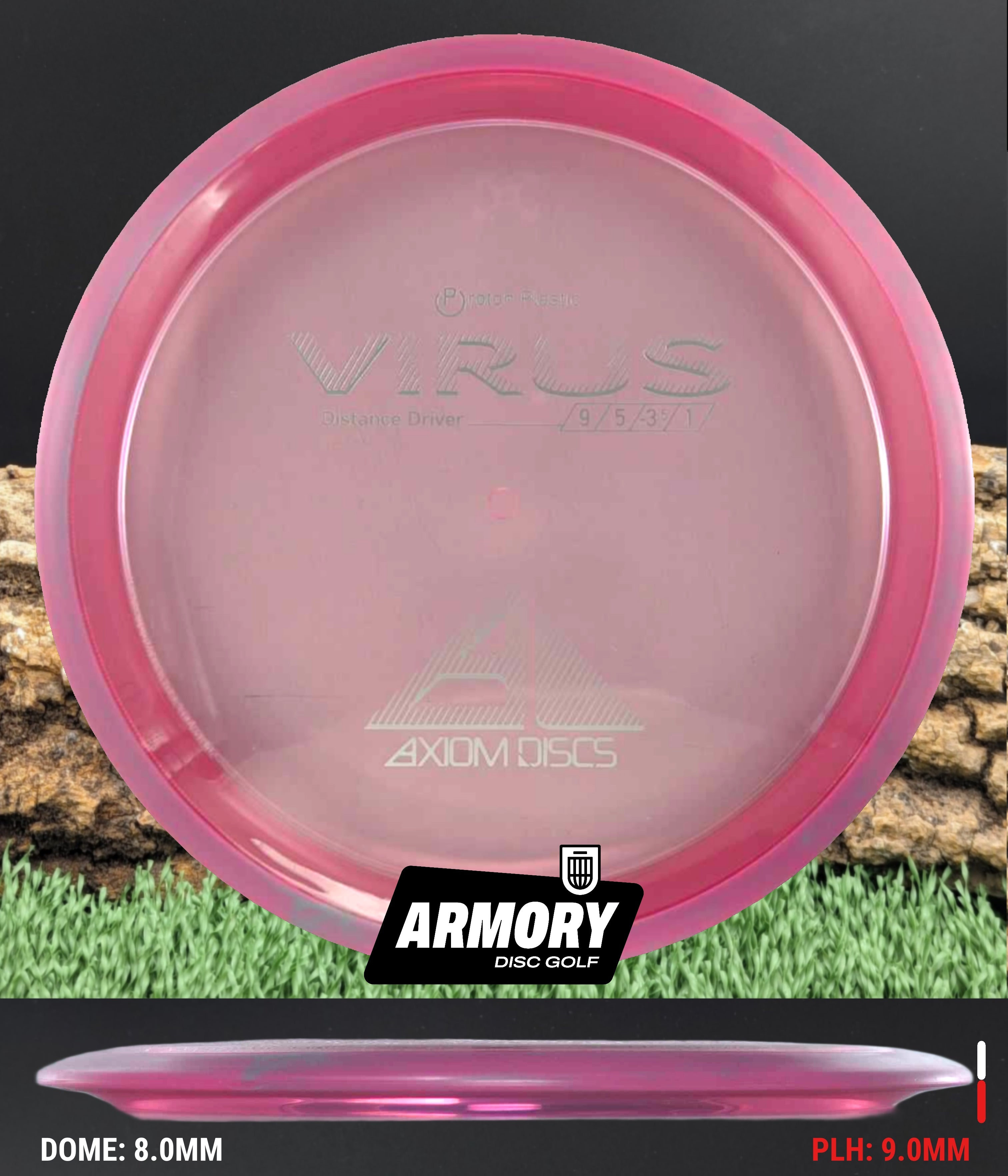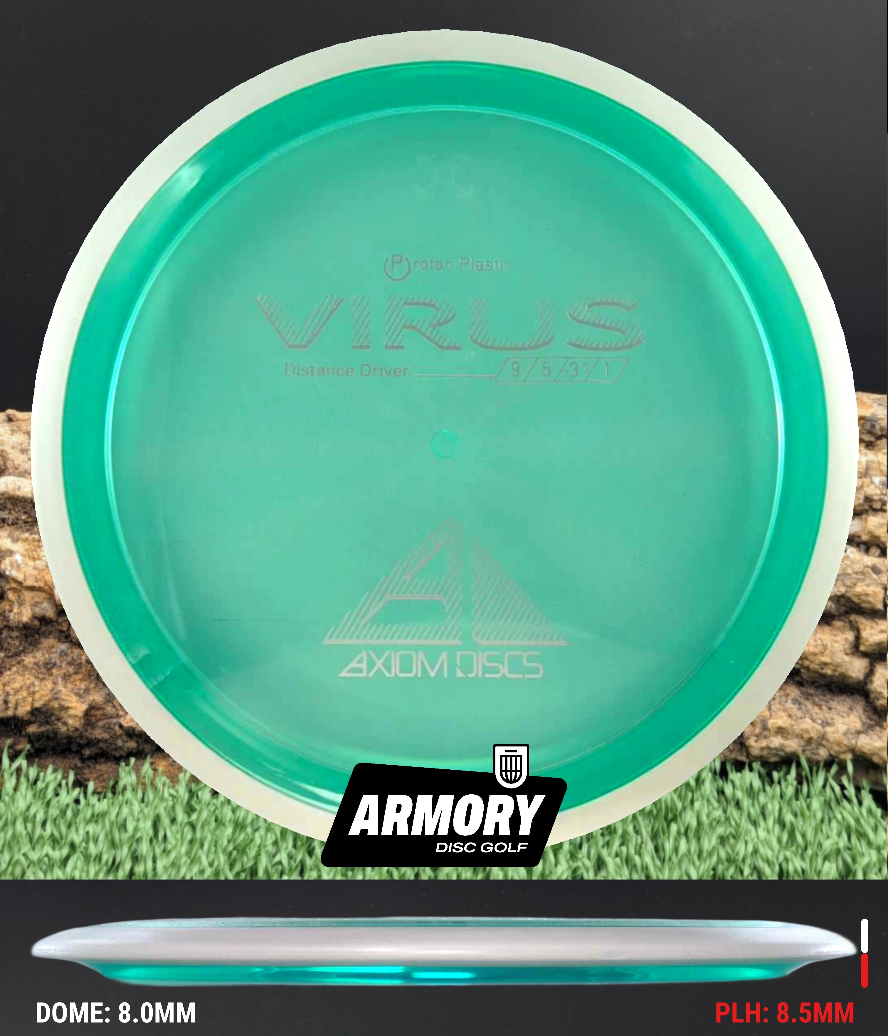 The Virus is Axiom’s easiest to throw distance driver, with a glide and responsive understability that keeps it in the air. Power throwers will be able to flex huge turnover shots with straight forward fade. Average throwers will be able to extend and shape lines using the Virus’ turn and gentle fade. Compared to the MVP lineup, the Virus resembles a worn-in Impulse.