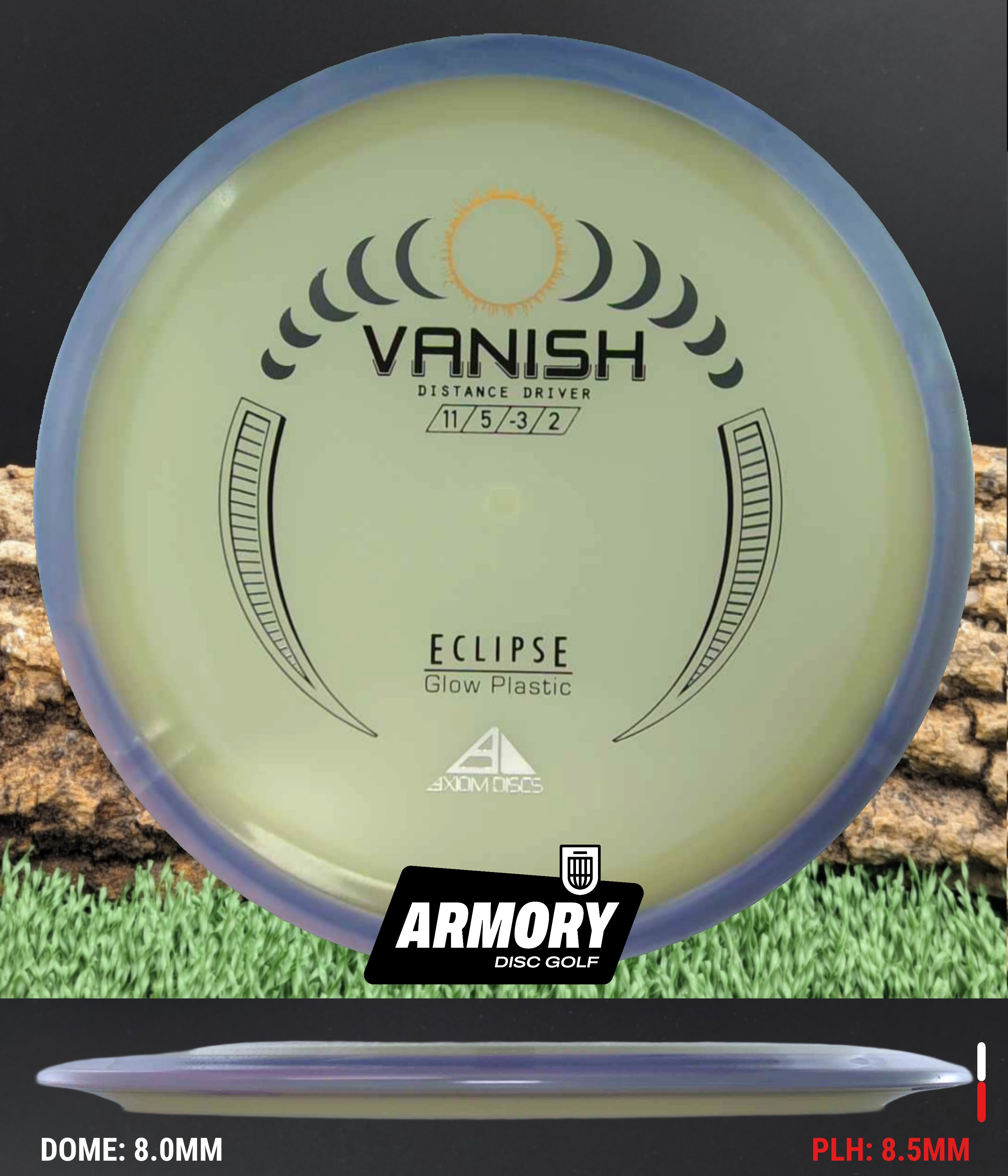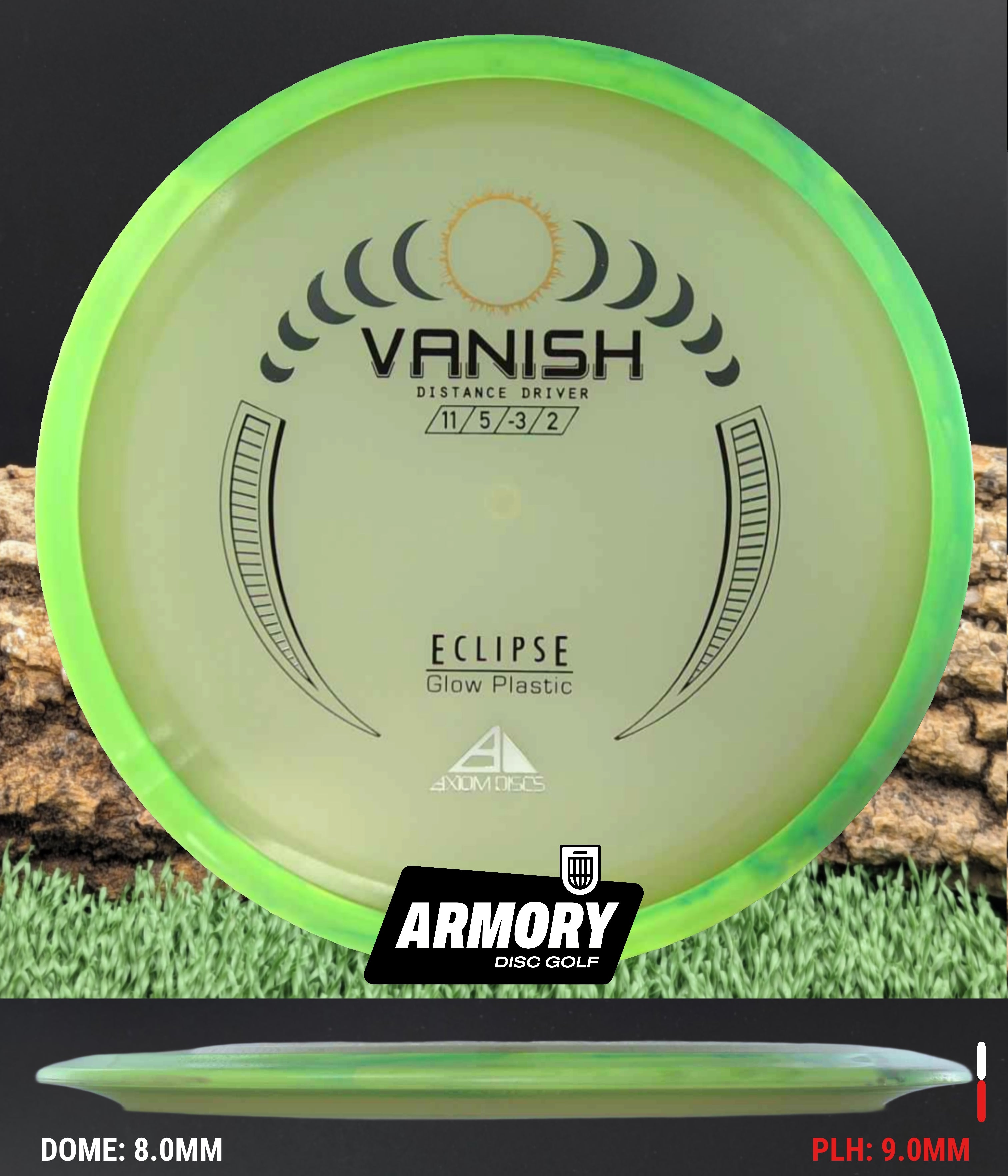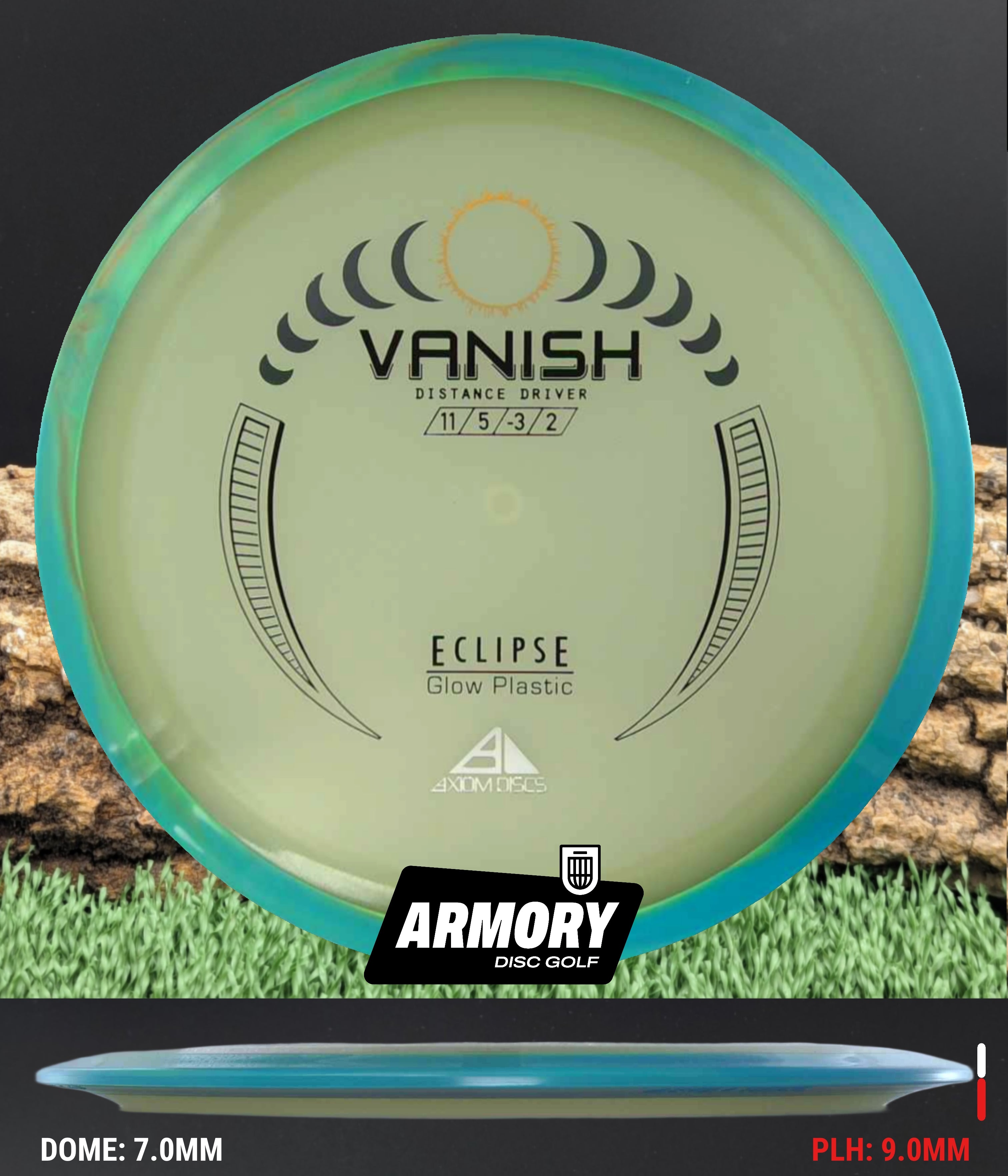 Glow season never ends with the Axiom Eclipse Vanish, now officially part of Axiom’s year-round stock lineup. Molded in Eclipse plastic, known across disc golf for its industry-leading glow and reliable durability, this 11-speed distance driver is built to carve clean lines day or night.