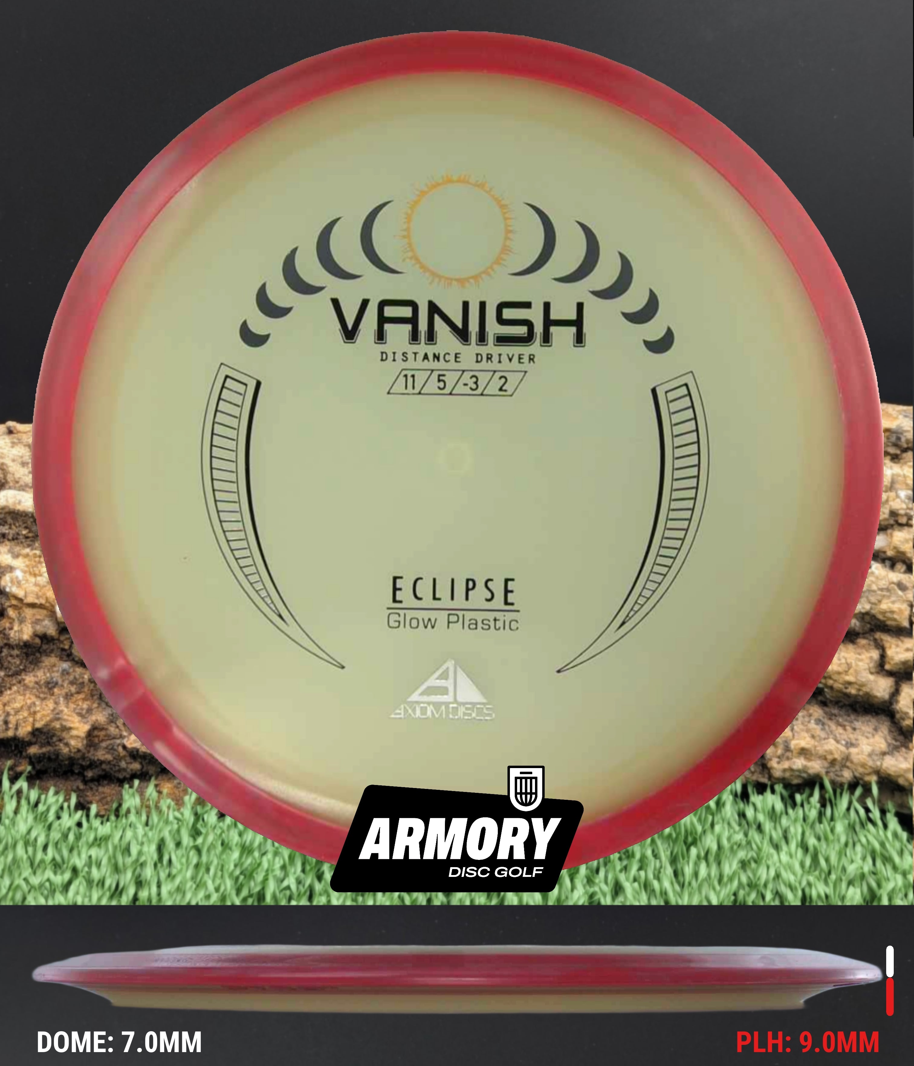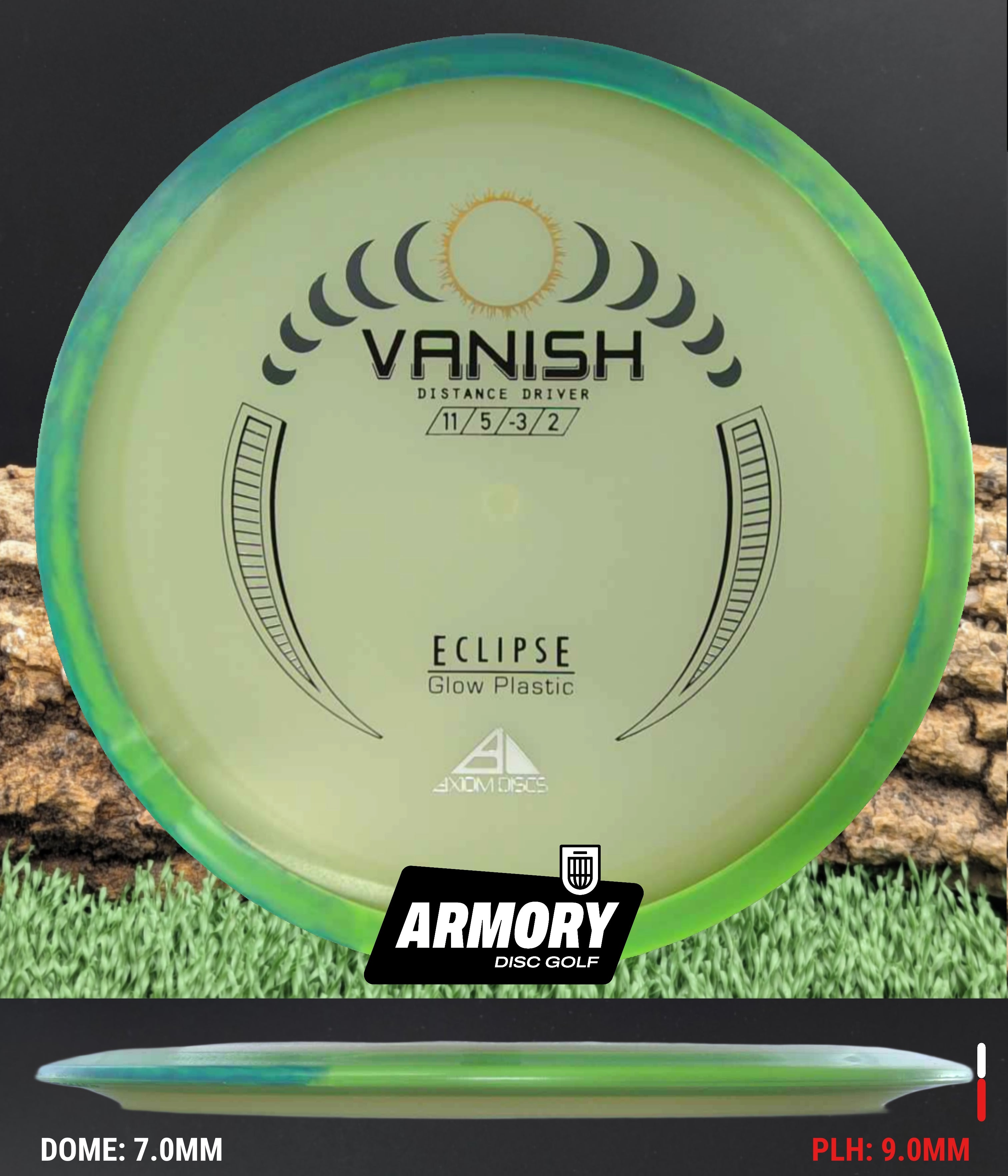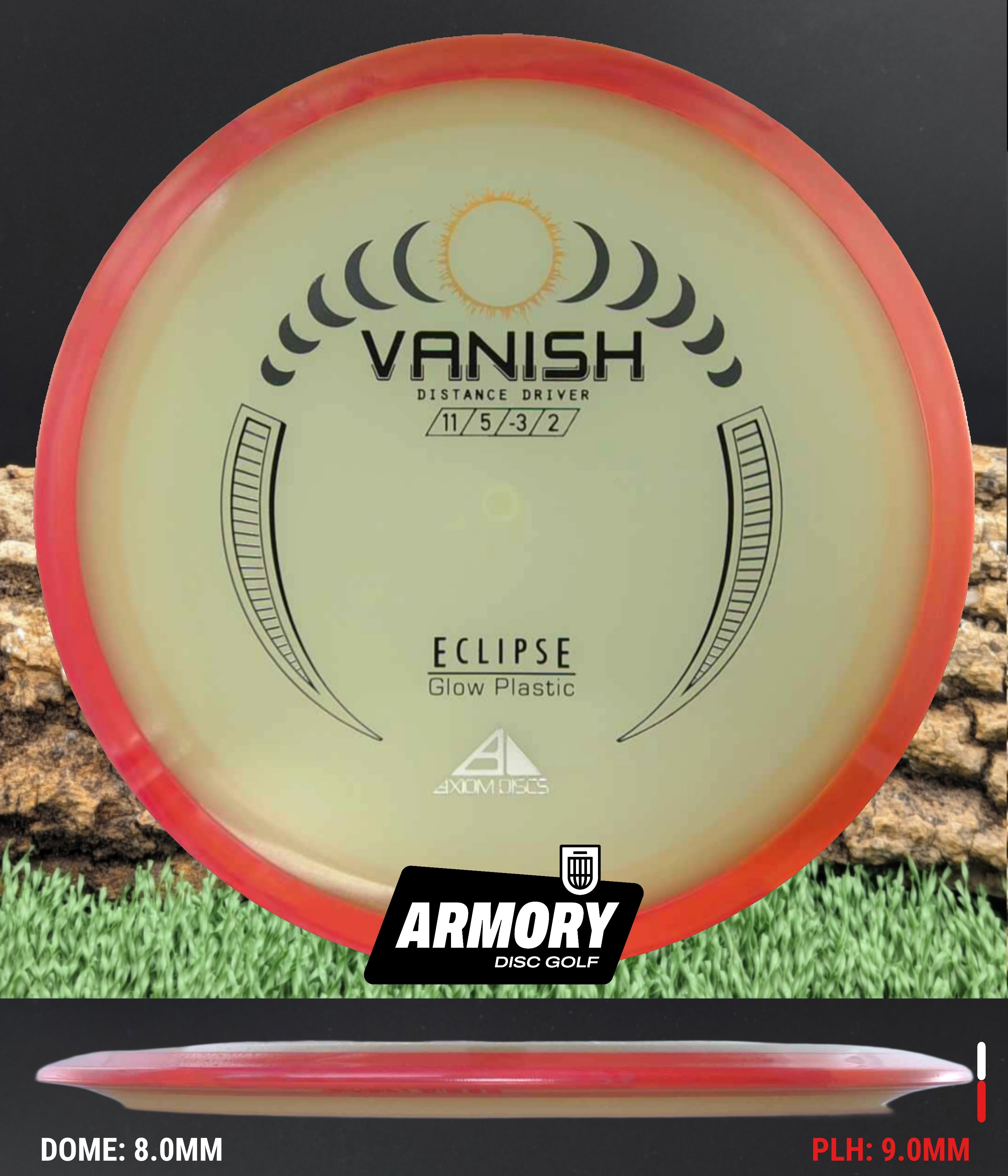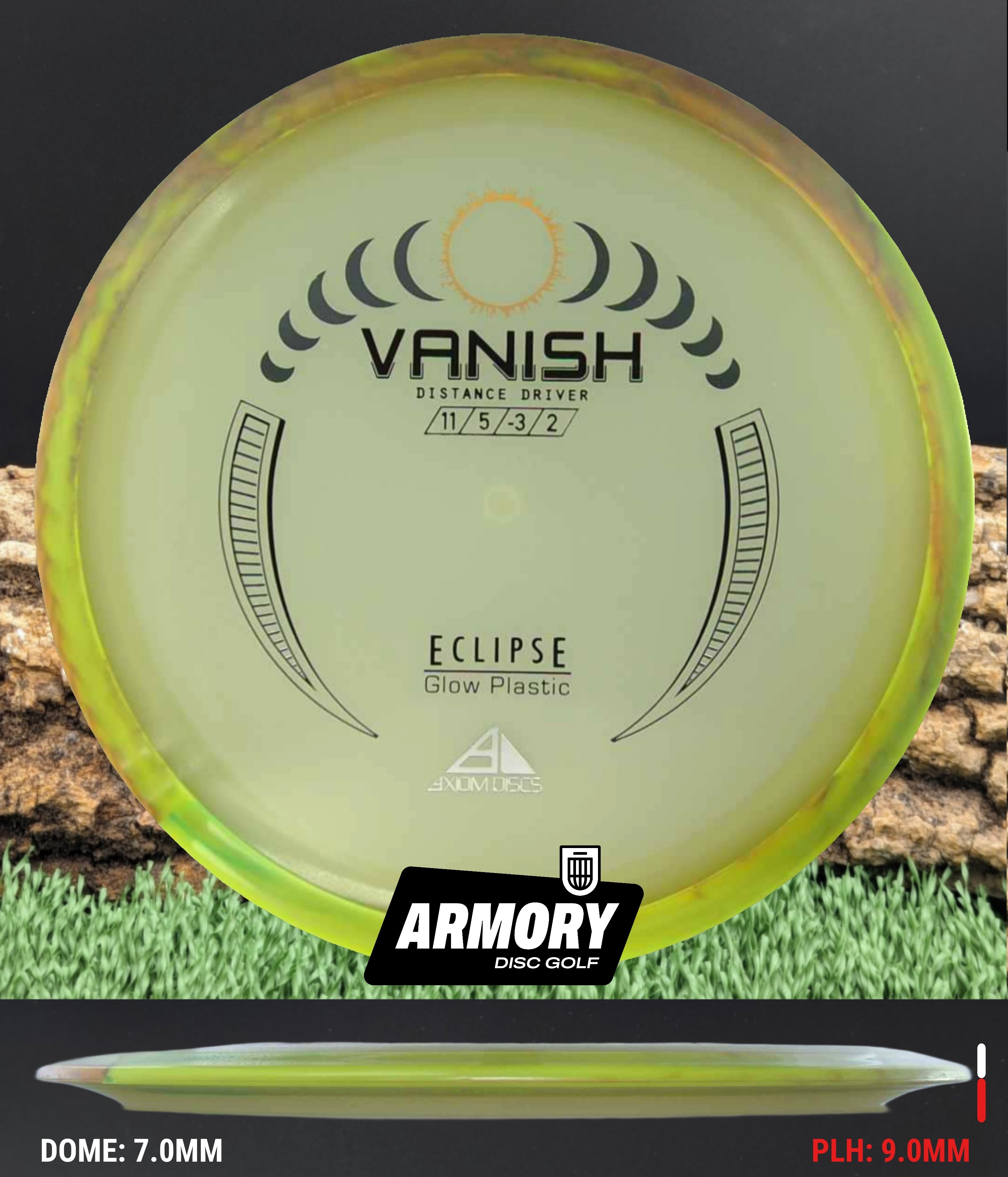 Glow season never ends with the Axiom Eclipse Vanish, now officially part of Axiom’s year-round stock lineup. Molded in Eclipse plastic, known across disc golf for its industry-leading glow and reliable durability, this 11-speed distance driver is built to carve clean lines day or night.