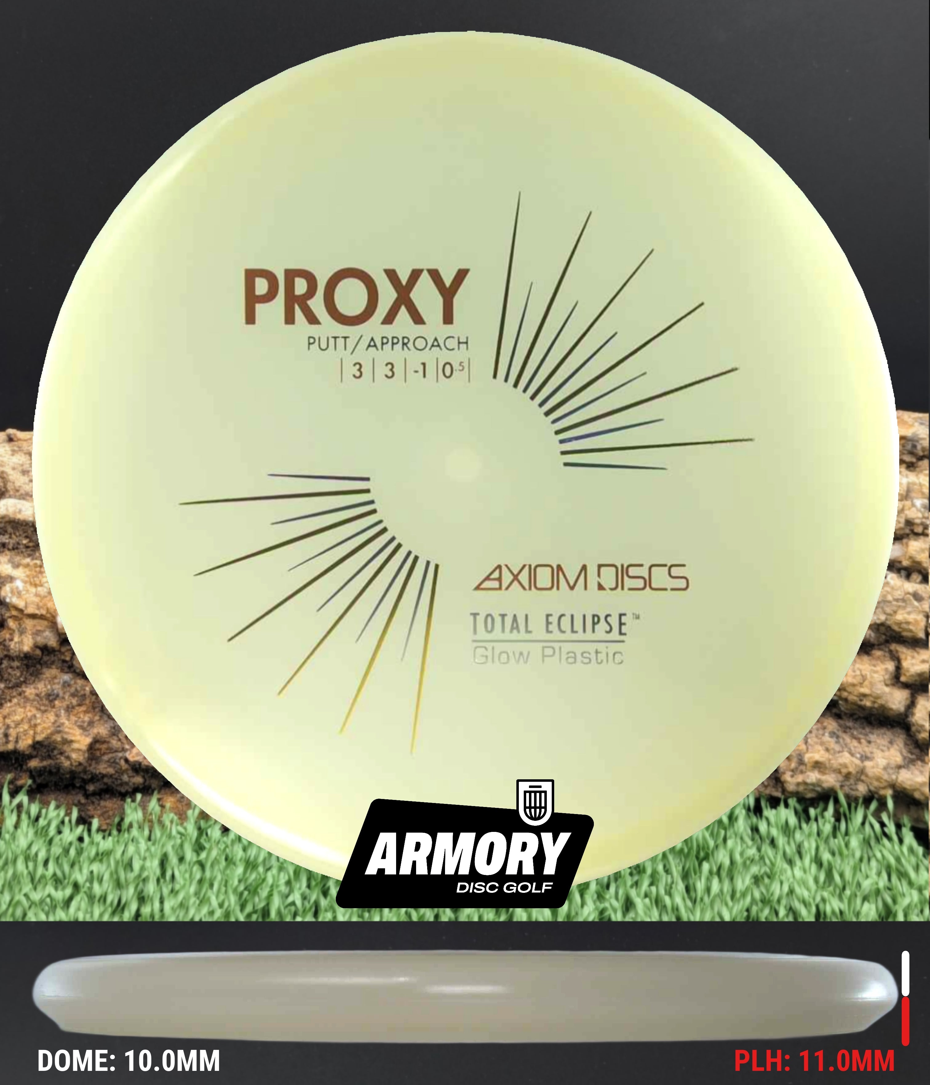 The second addition to our stock Total Eclipse catalog for this release is the Axiom Proxy! Sharing a core with the Axiom Envy, the Proxy maintains the low-profile feel and solid grip of the Envy, but with a more neutral flight path out of the box. High-speed turn and a forward fading finish set the Proxy up to be an incredibly versatile disc for shot shaping through wooded holes, around corners, or just laser straight shots. Now available any time of the year in the color glow cores and rims of Total Eclipse plastic - Green, Blue, Purple, Teal, and White - you can reliably add the Proxy to your bag for day or night. Experience one of the most versatile putters in the MVP family by grabbing your own Total Eclipse Proxy!