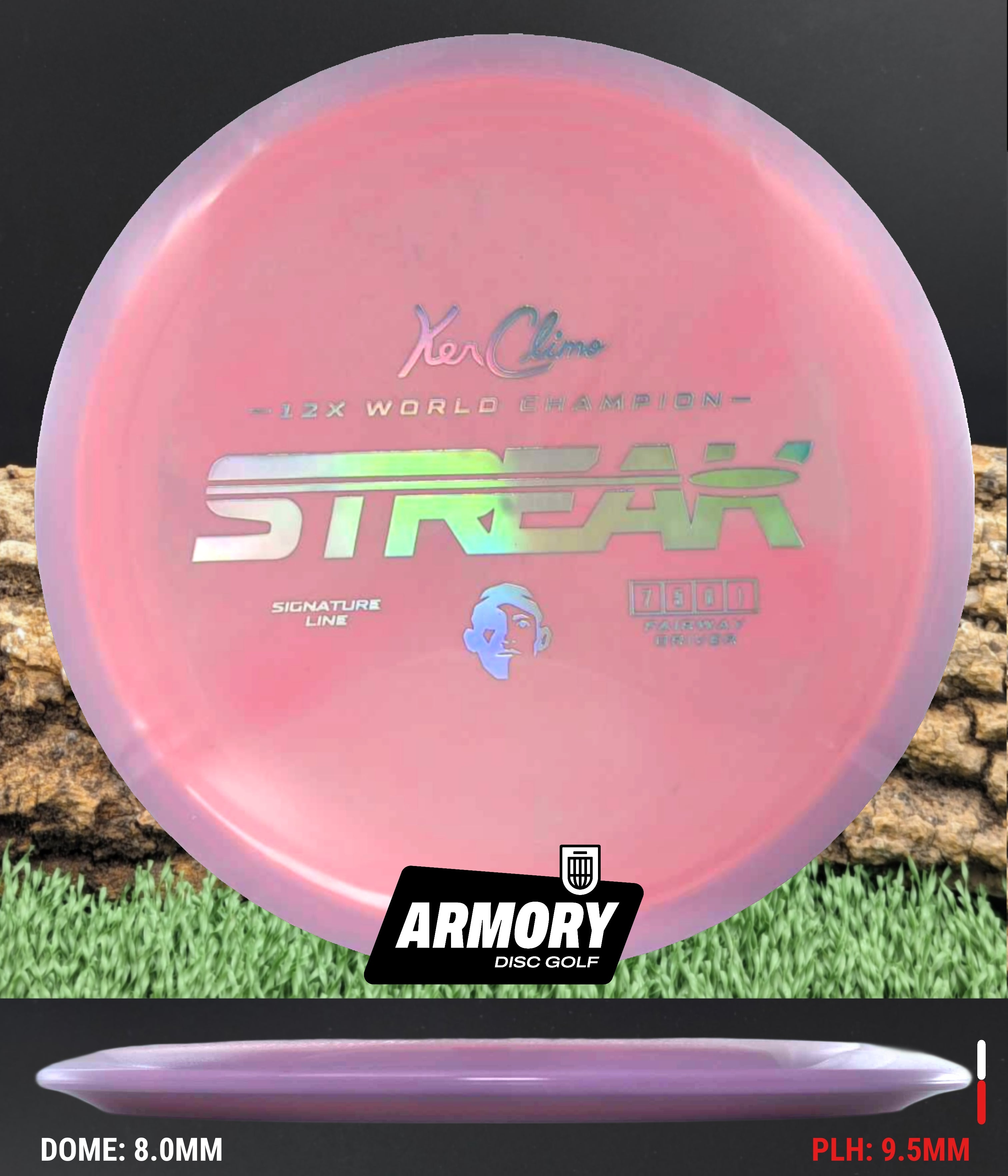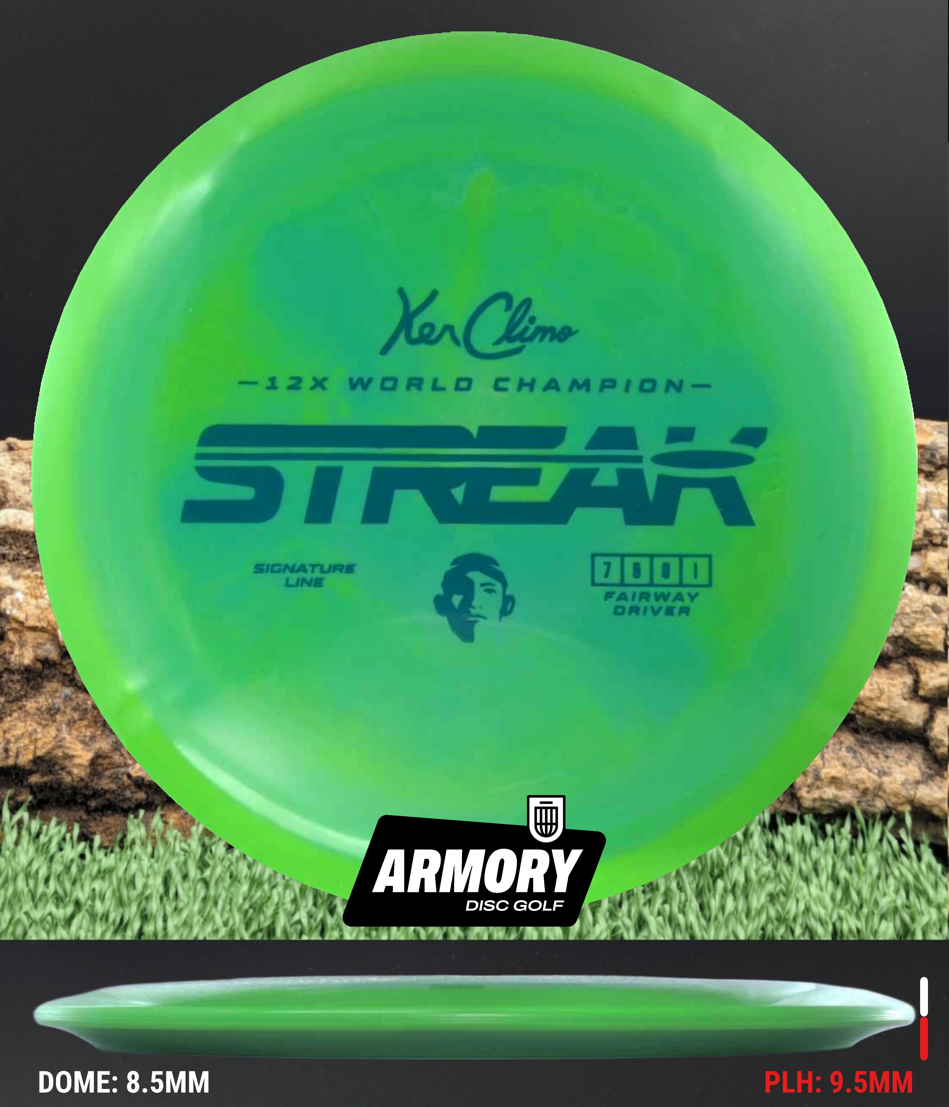 Inspired by Ken Climo’s unprecedented nine-year World Title streak, the Streak debuts as the first fairway driver in the Climo Disc Golf lineup. Built for players chasing dependable, repeatable results, the Streak pairs neutral stability with high glide and a gentle, late fade—a straight, trustworthy flight you can lean on round after round.