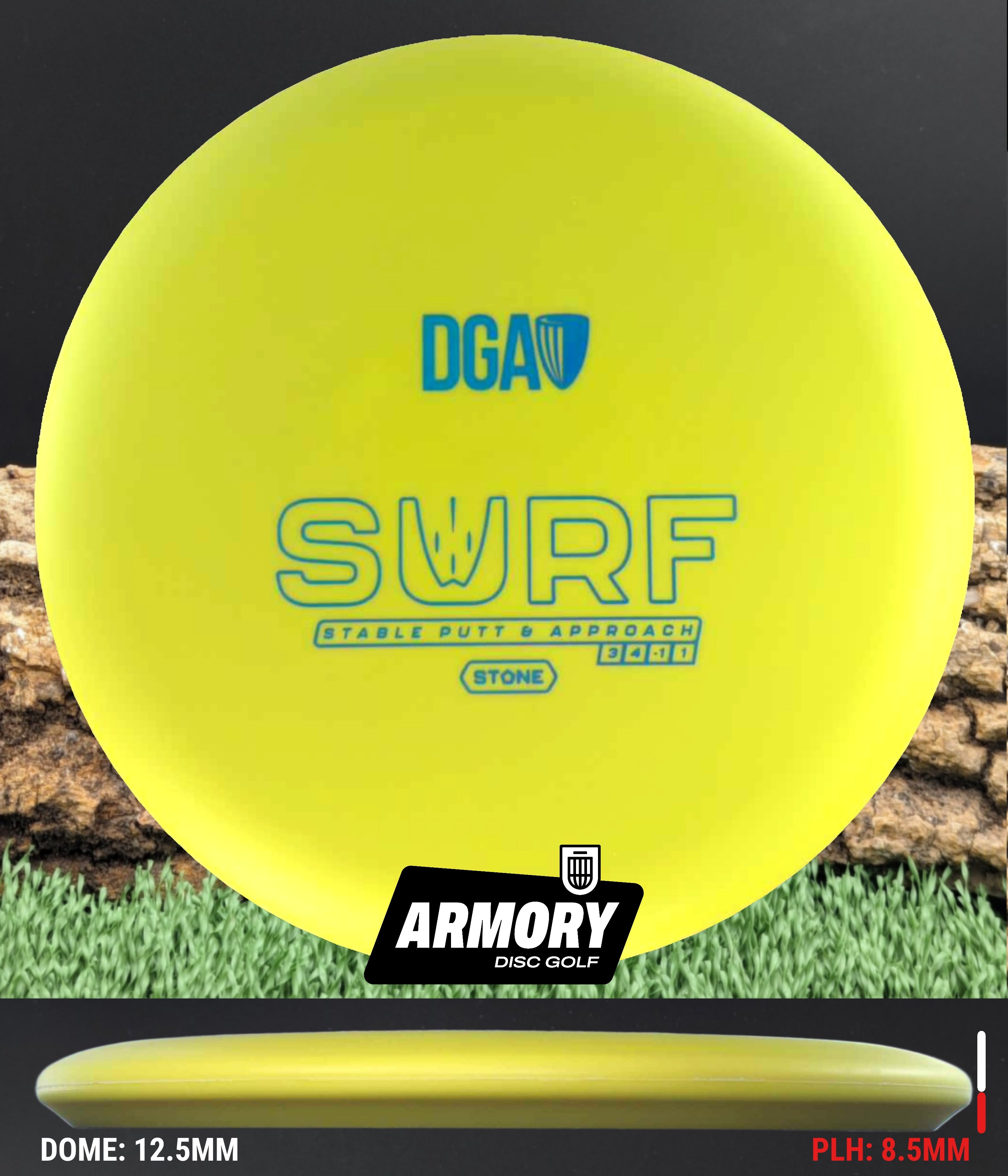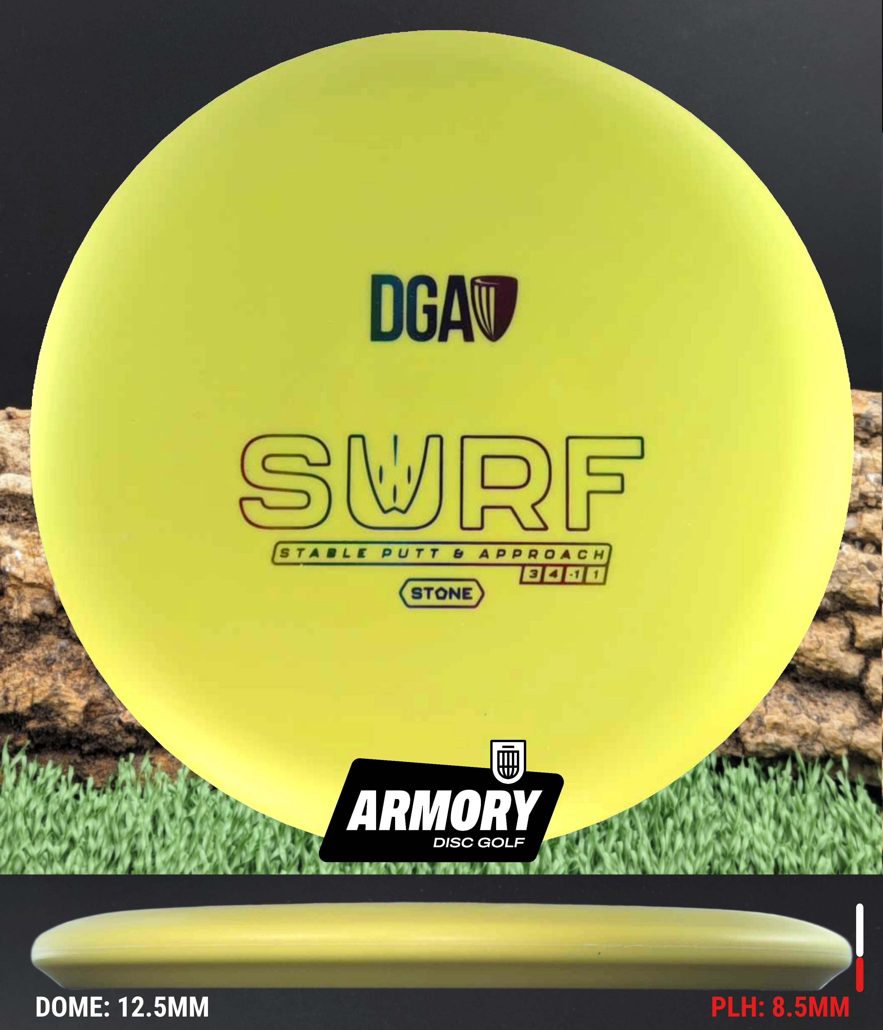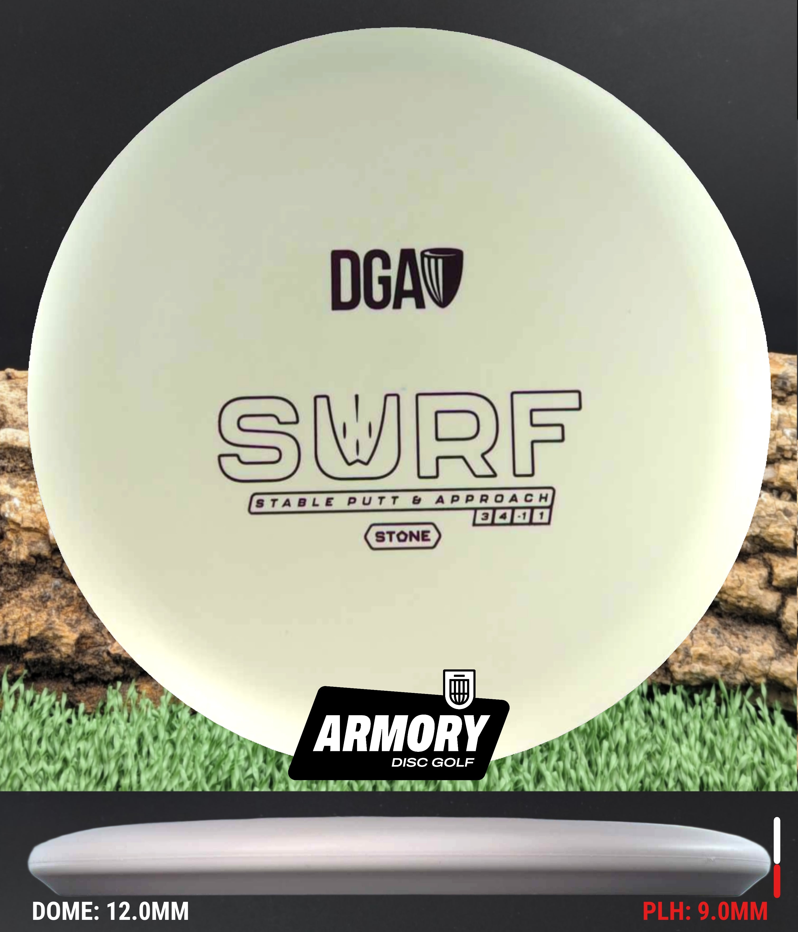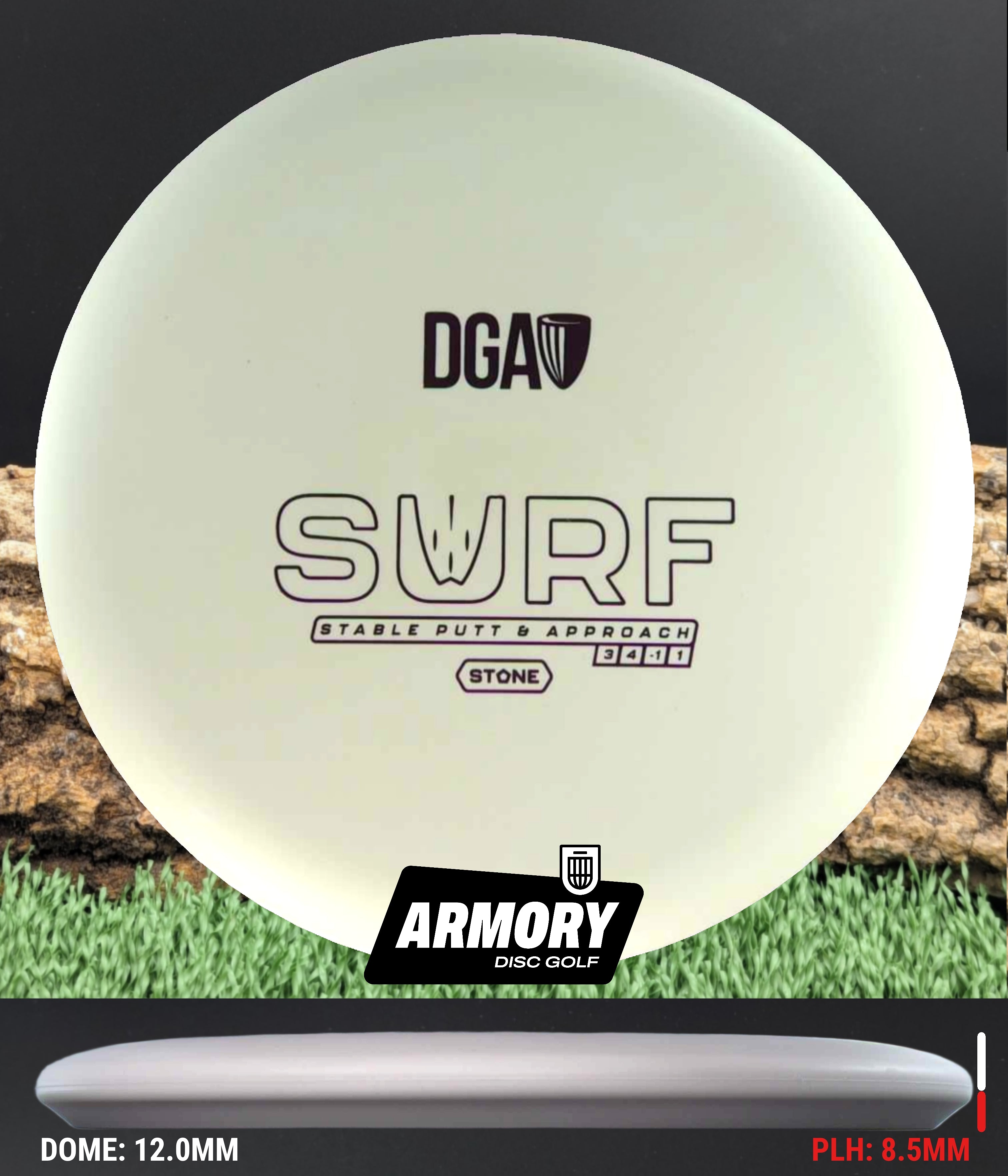 The DGA Stone Surf is a stable putt & approach disc that is beadless and fairly shallow with a neutral flight. This disc will hold just about any line you throw it on, providing pinpoint accuracy on upshots and putts.