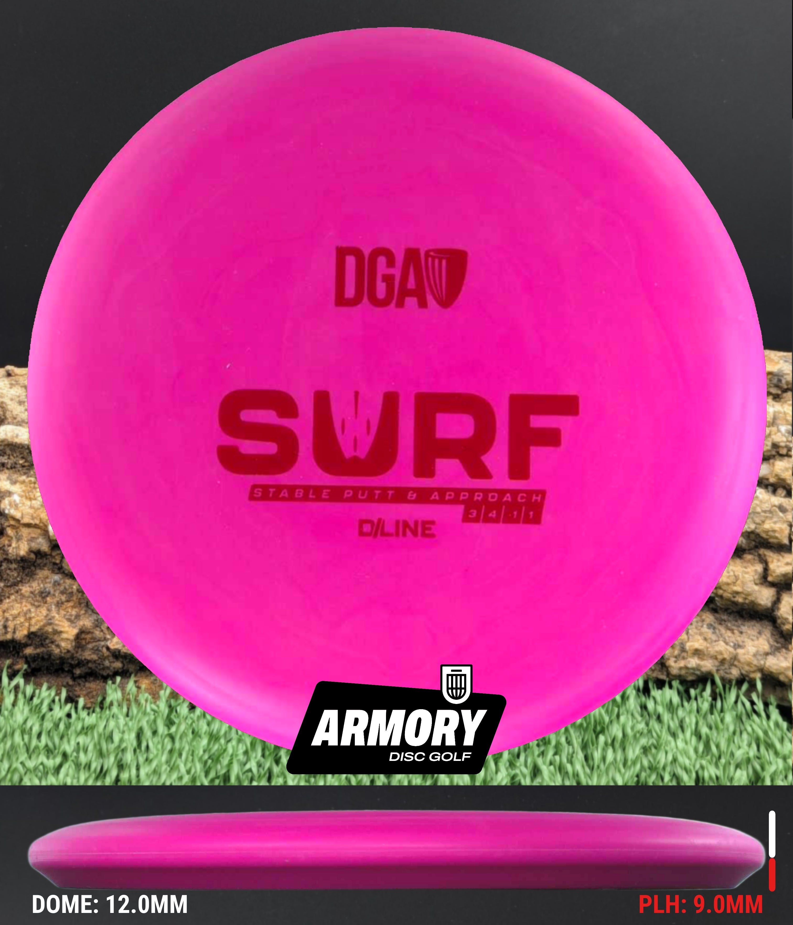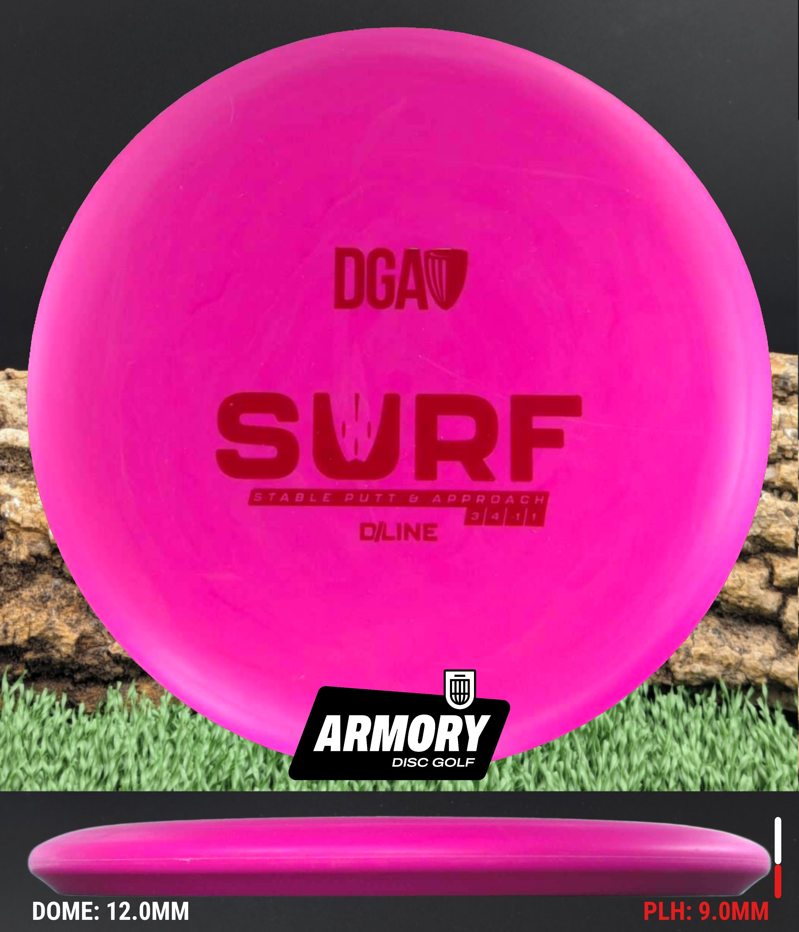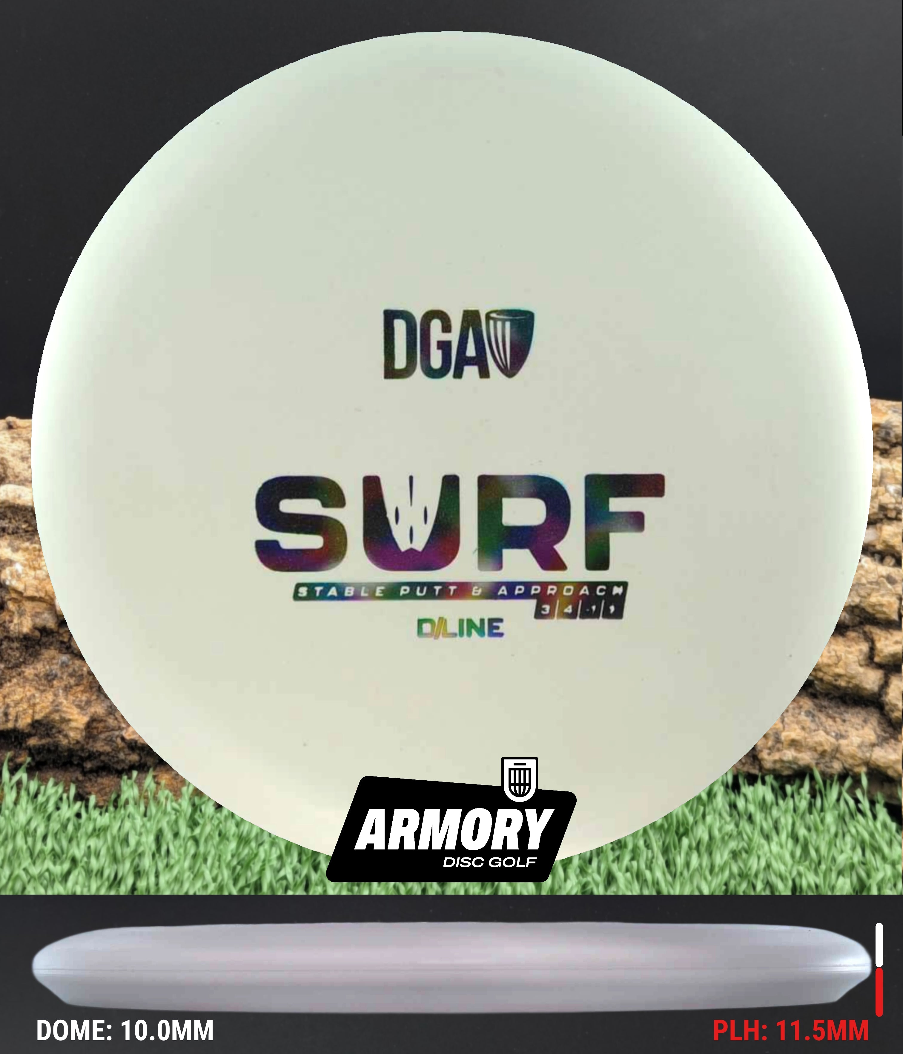The DGA Stone Surf is a stable putt & approach disc that is beadless and fairly shallow with a neutral flight. This disc will hold just about any line you throw it on, providing pinpoint accuracy on upshots and putts.