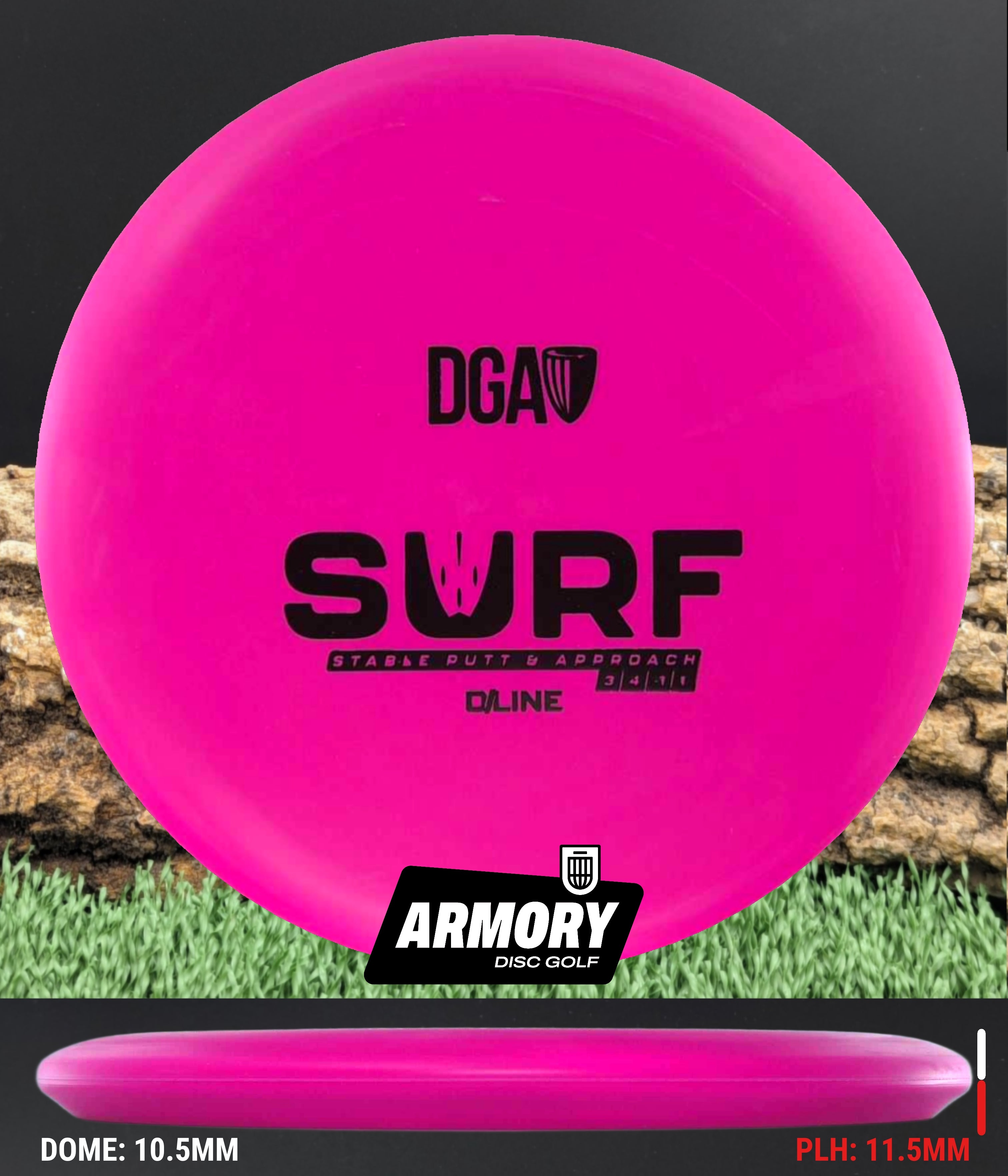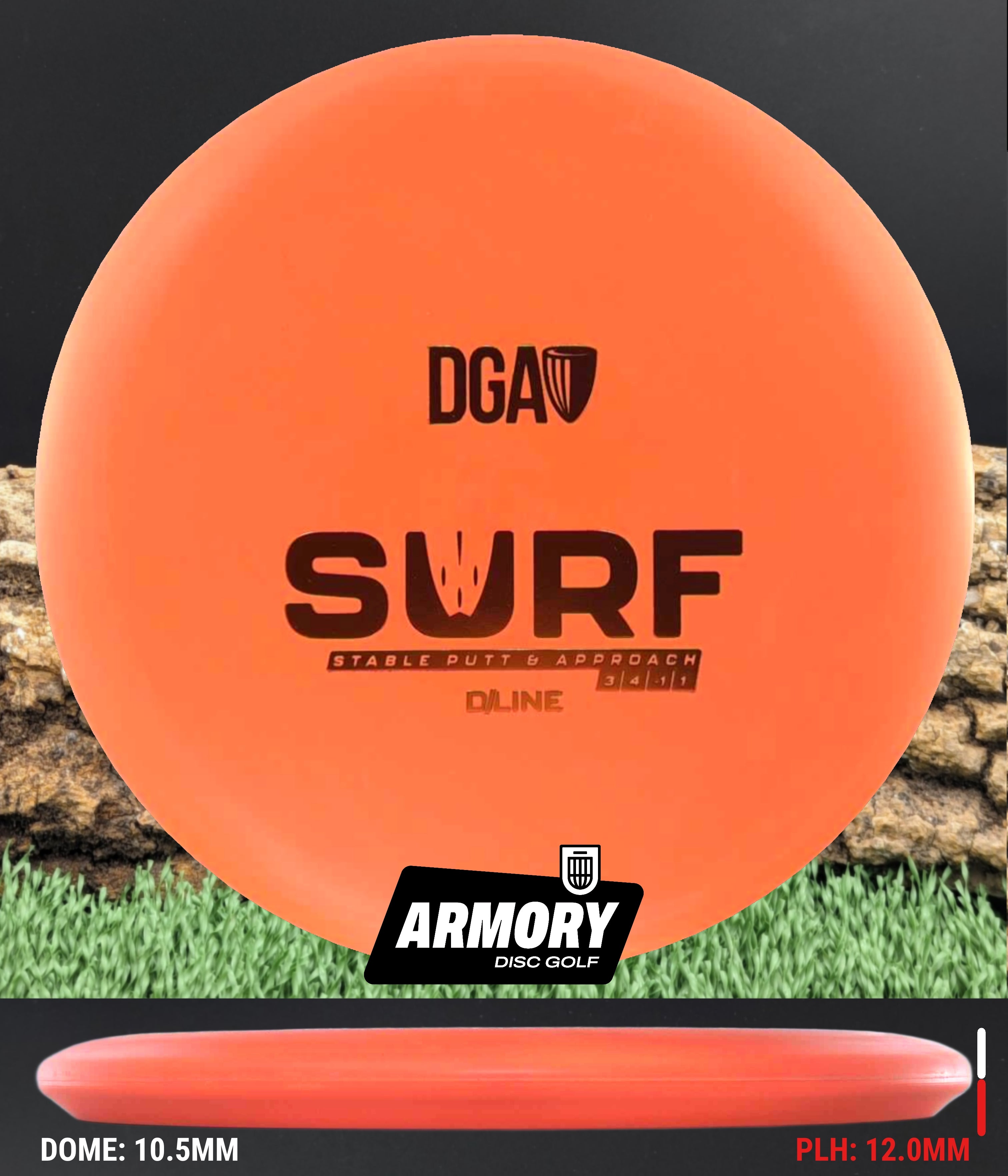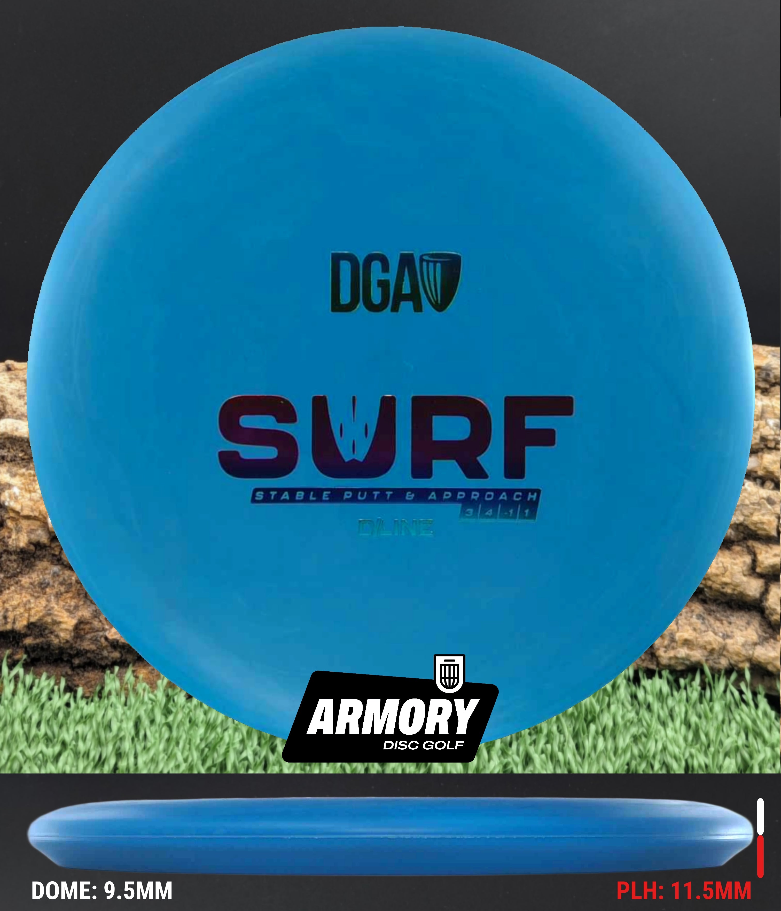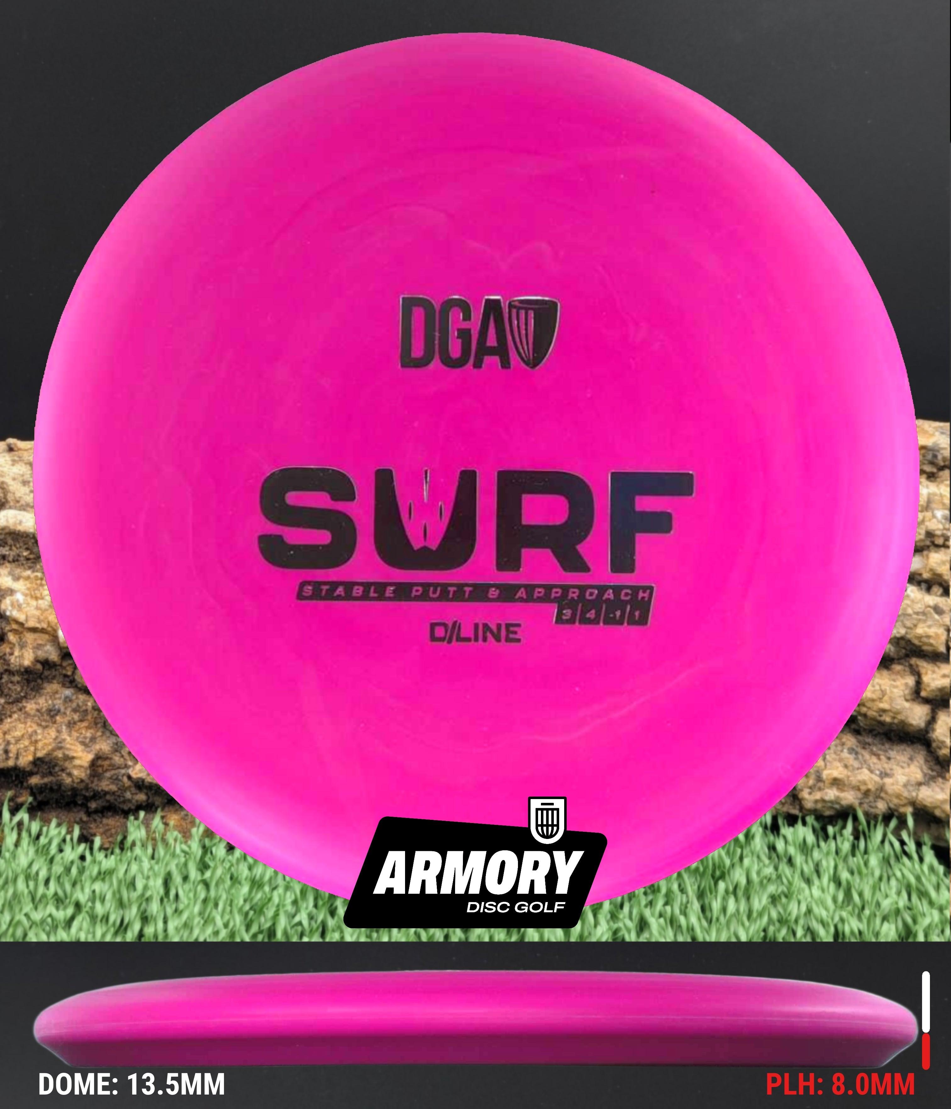 The DGA Stone Surf is a stable putt & approach disc that is beadless and fairly shallow with a neutral flight. This disc will hold just about any line you throw it on, providing pinpoint accuracy on upshots and putts.