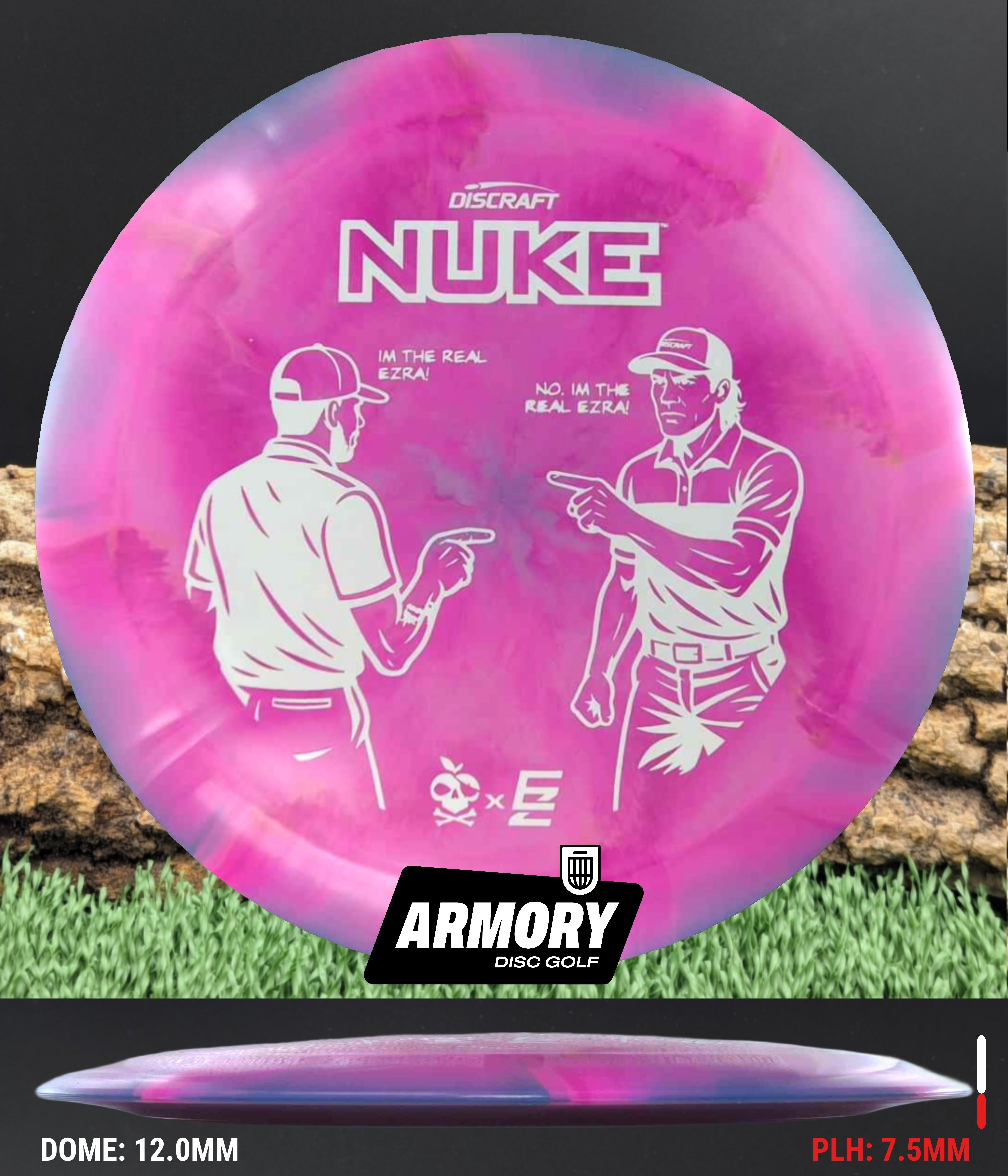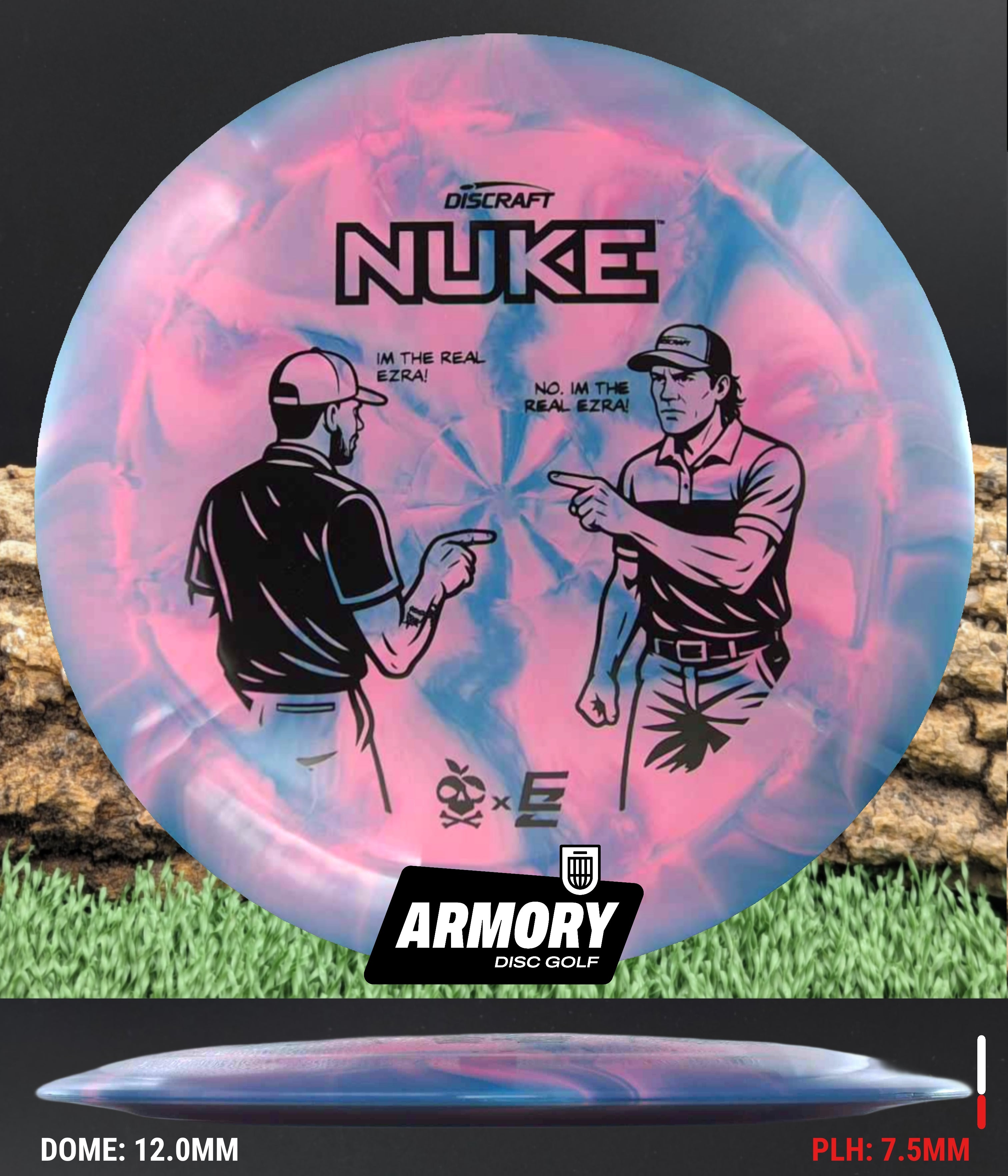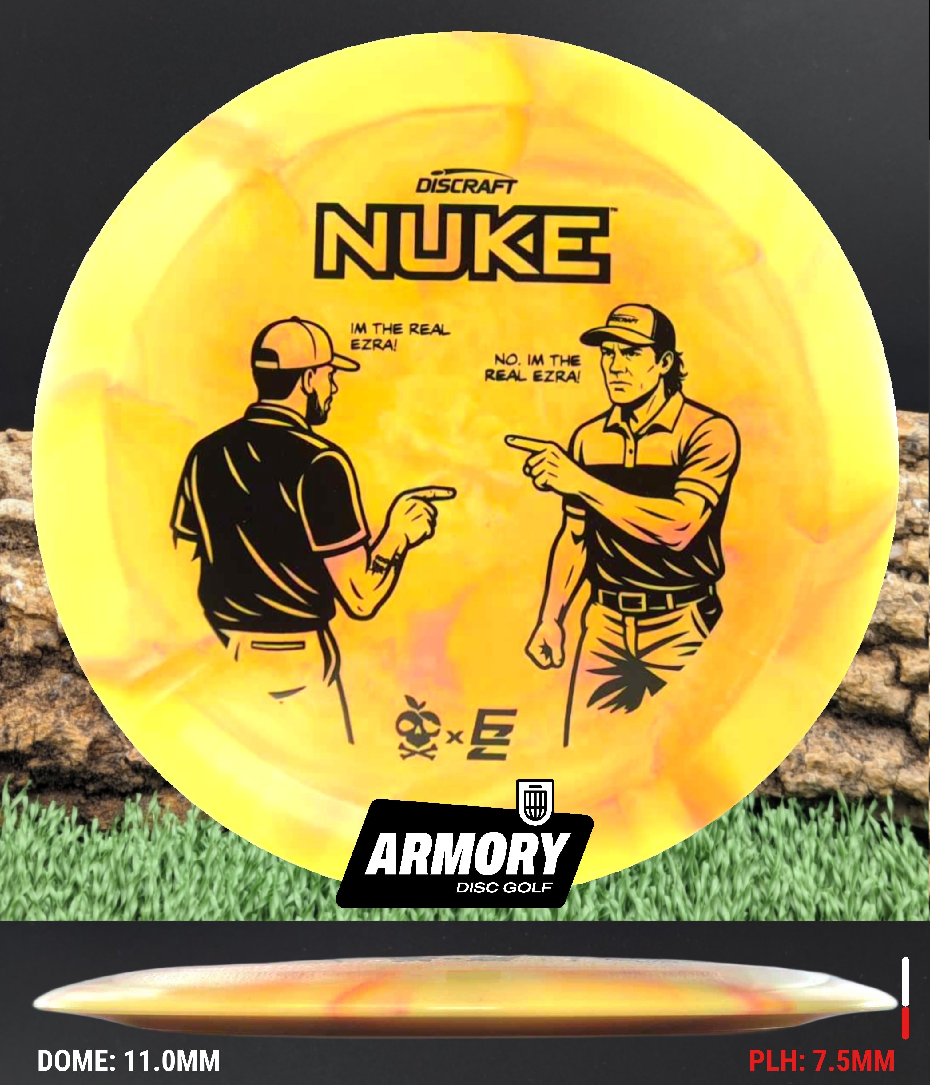 The Discraft Nuke is a staple in distance driver lineups worldwide — fast, glidey, and predictably stable. This Ezra vs Ezra edition brings together two of Discraft’s biggest personalities, Ezra Aderhold and Ezra Robinson, in a tongue-in-cheek collaboration stamped with humor and packed with power.