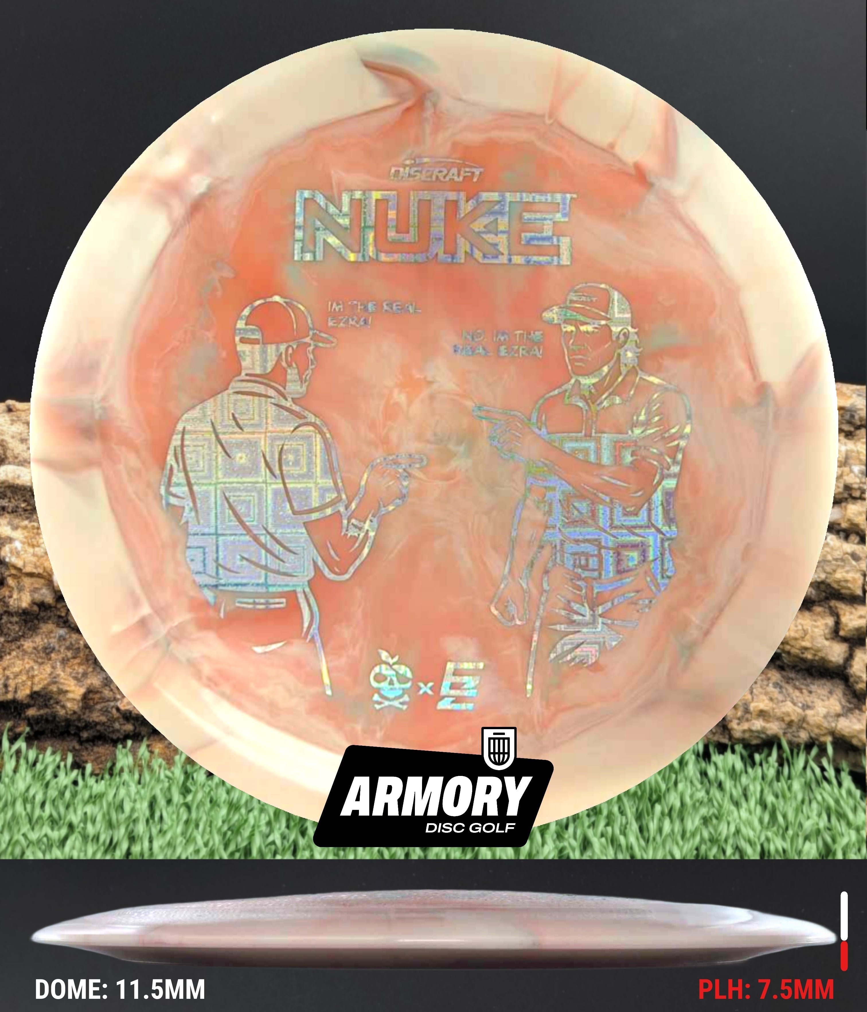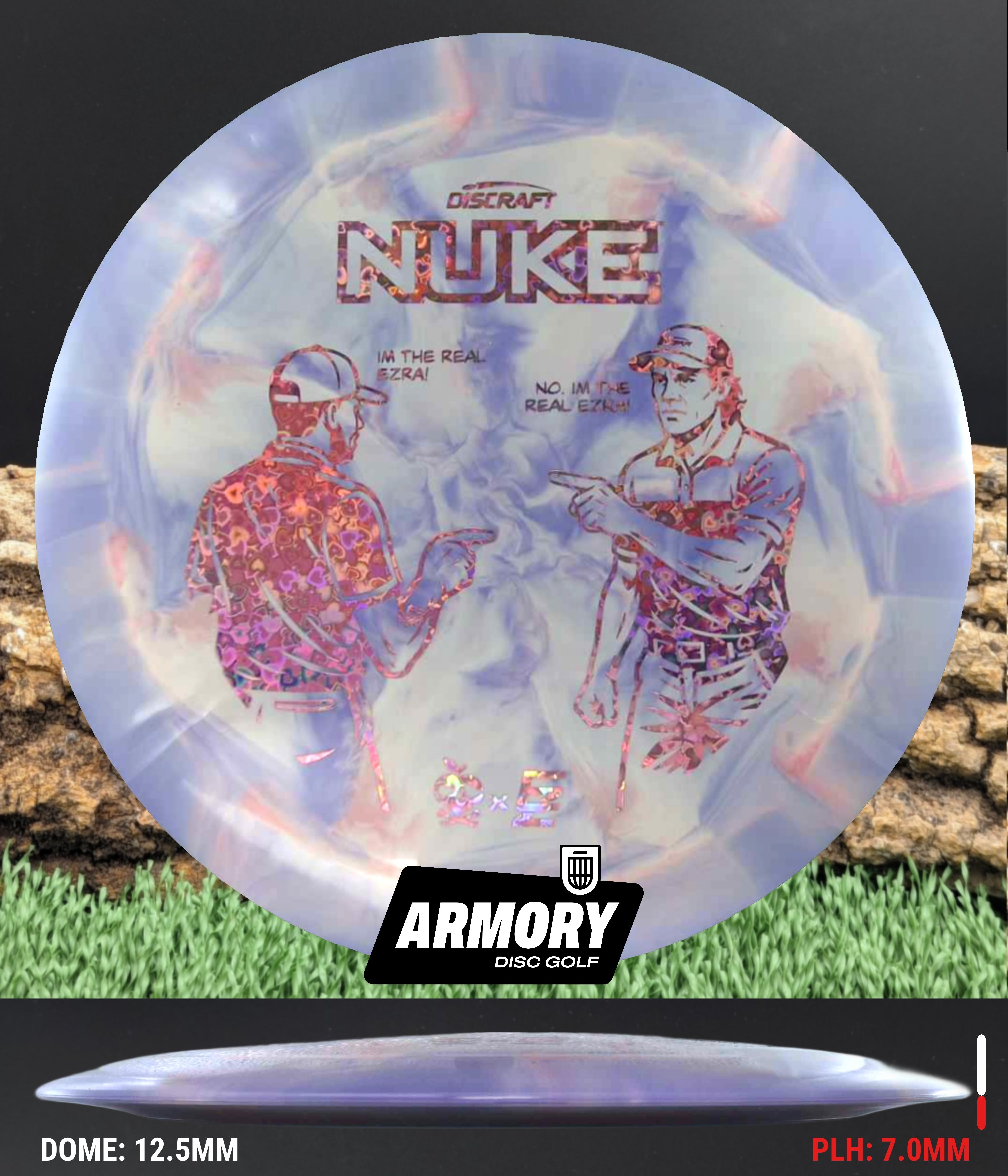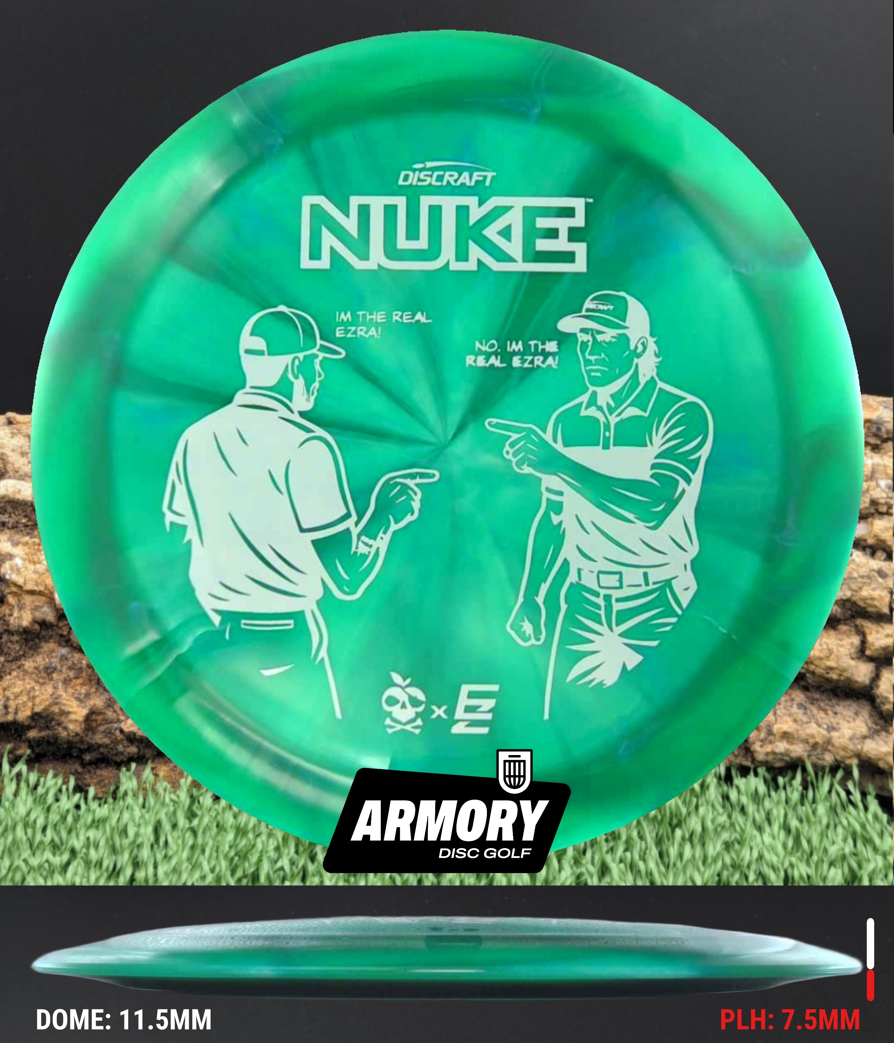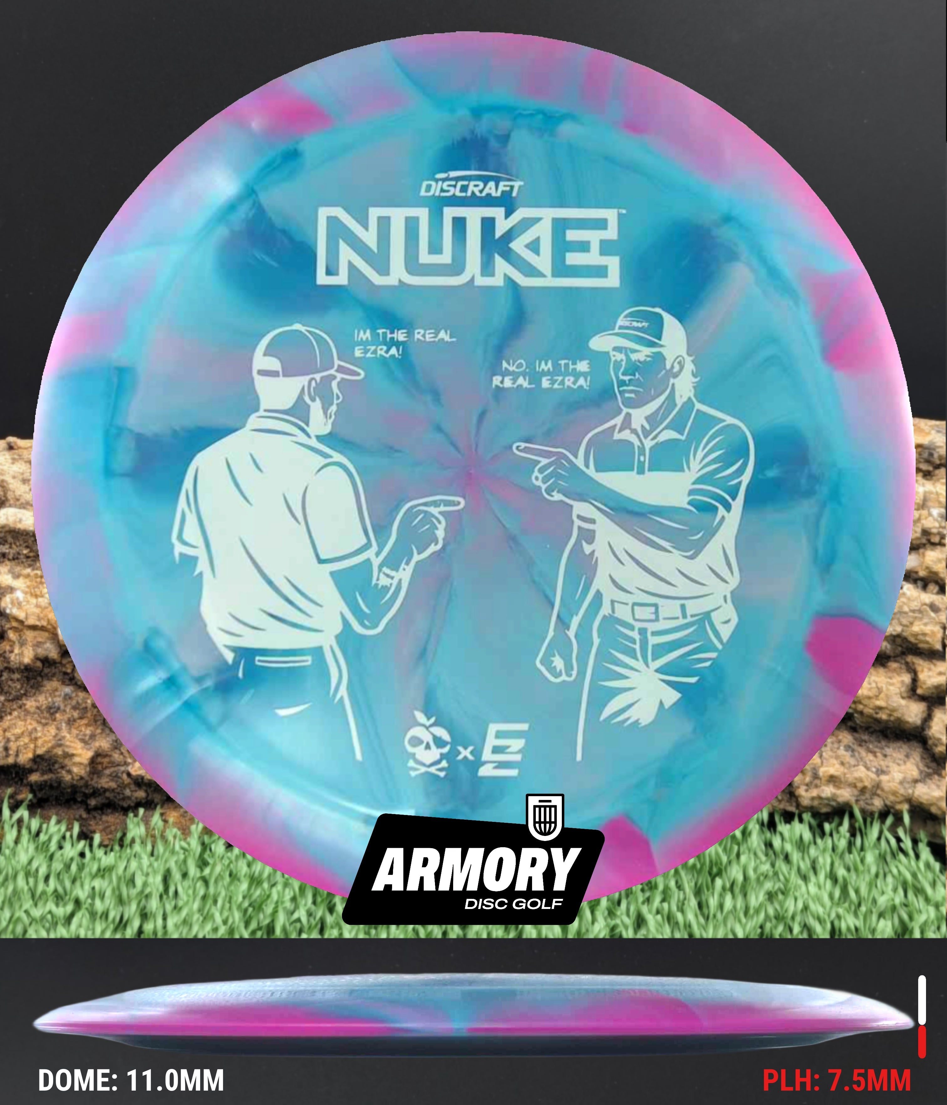 The Discraft Nuke is a staple in distance driver lineups worldwide — fast, glidey, and predictably stable. This Ezra vs Ezra edition brings together two of Discraft’s biggest personalities, Ezra Aderhold and Ezra Robinson, in a tongue-in-cheek collaboration stamped with humor and packed with power.
