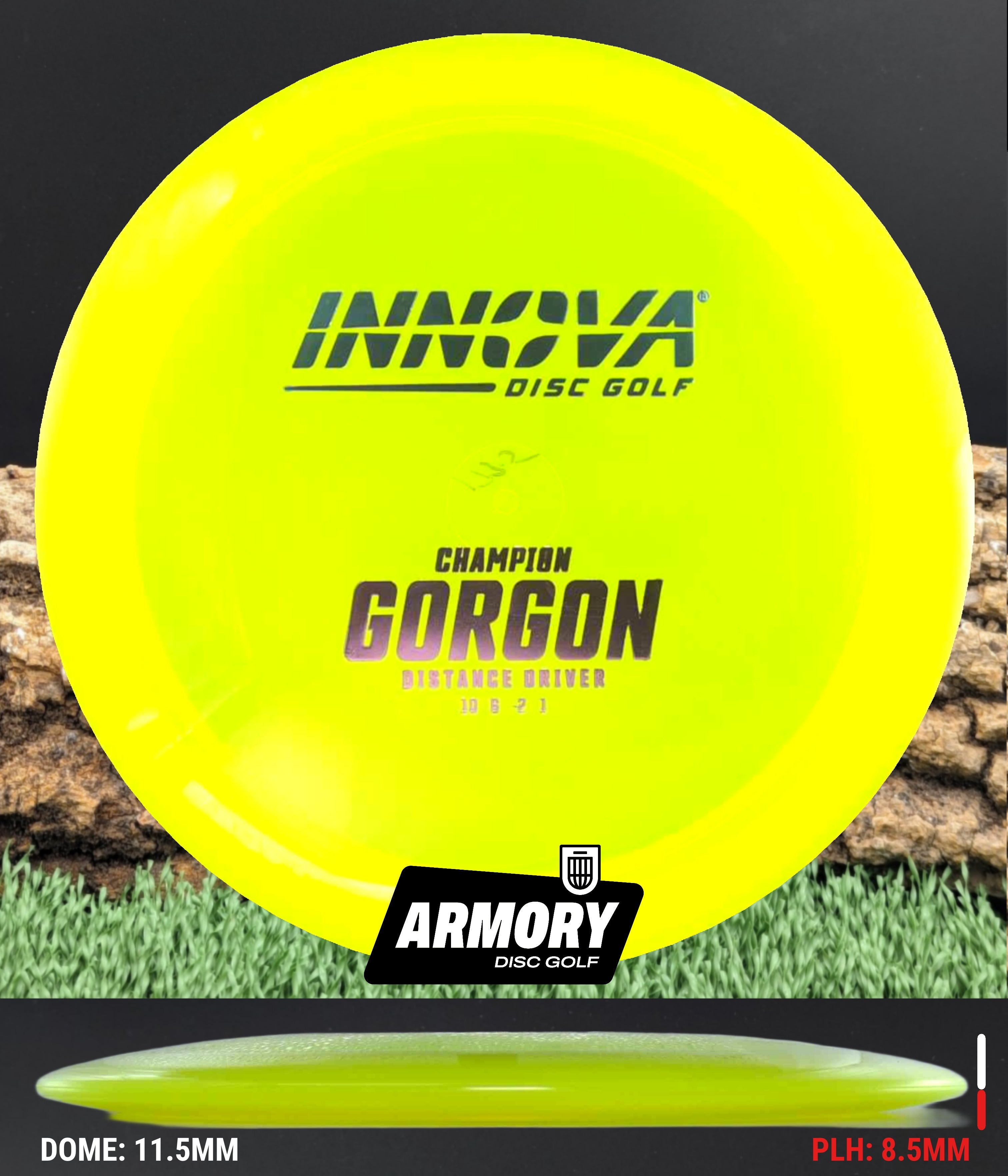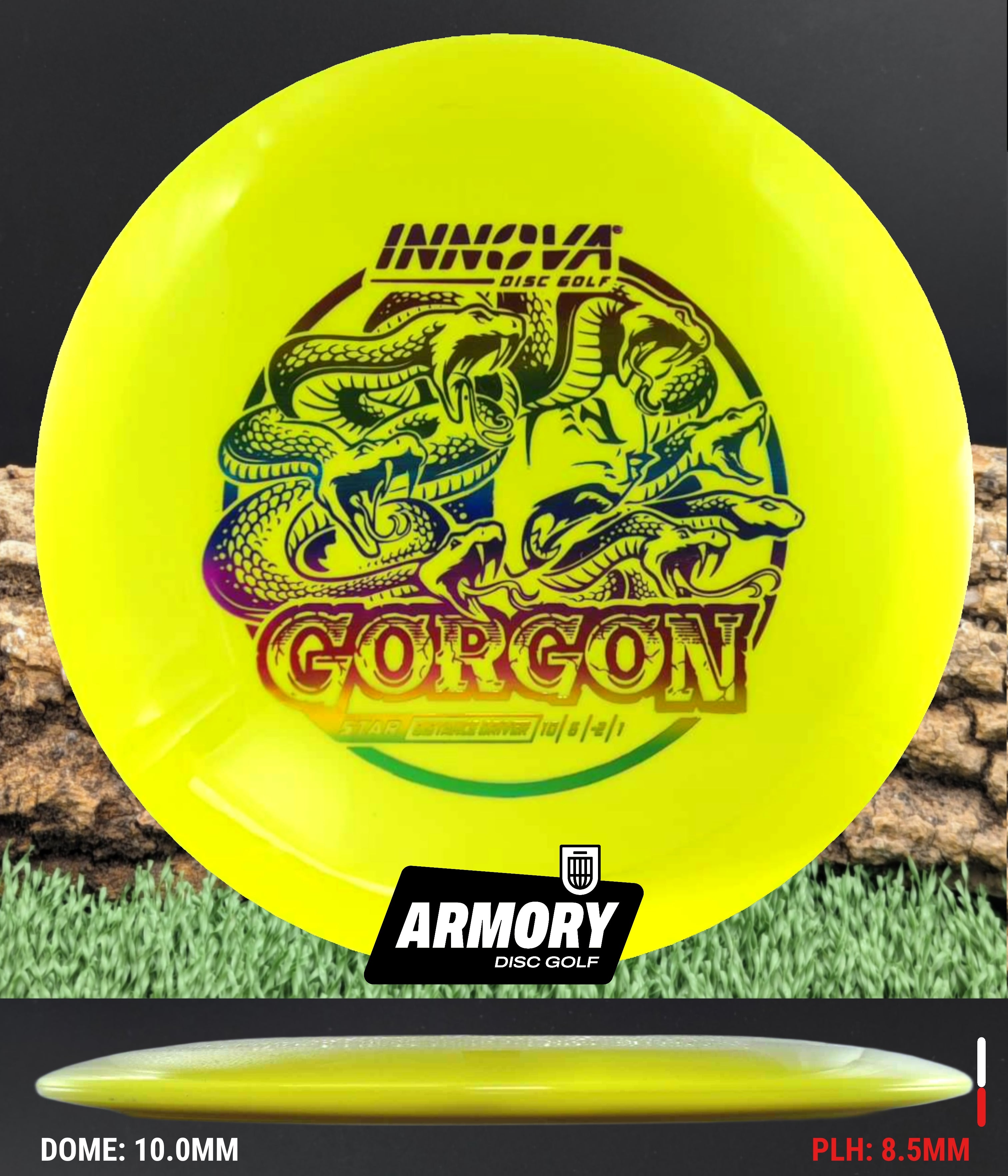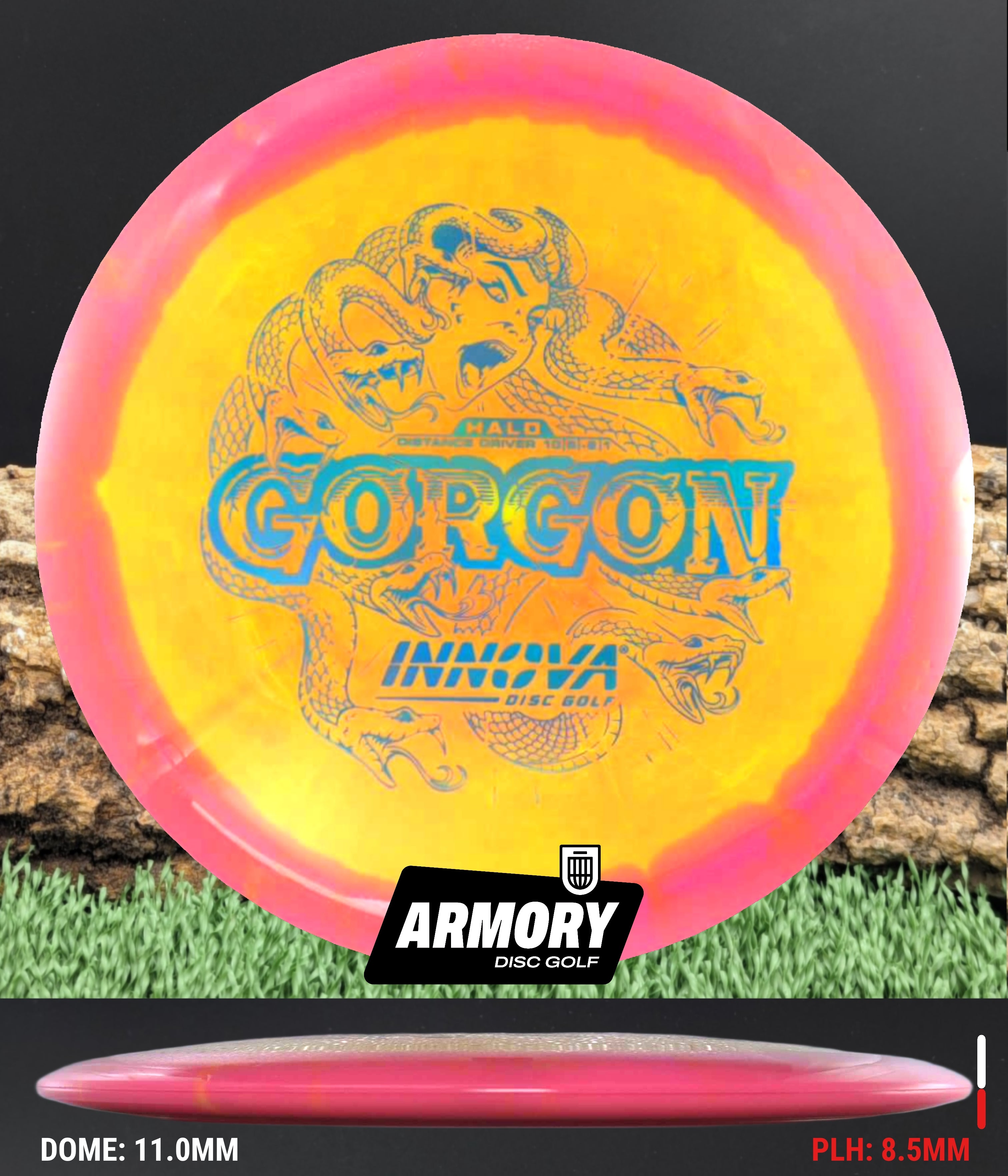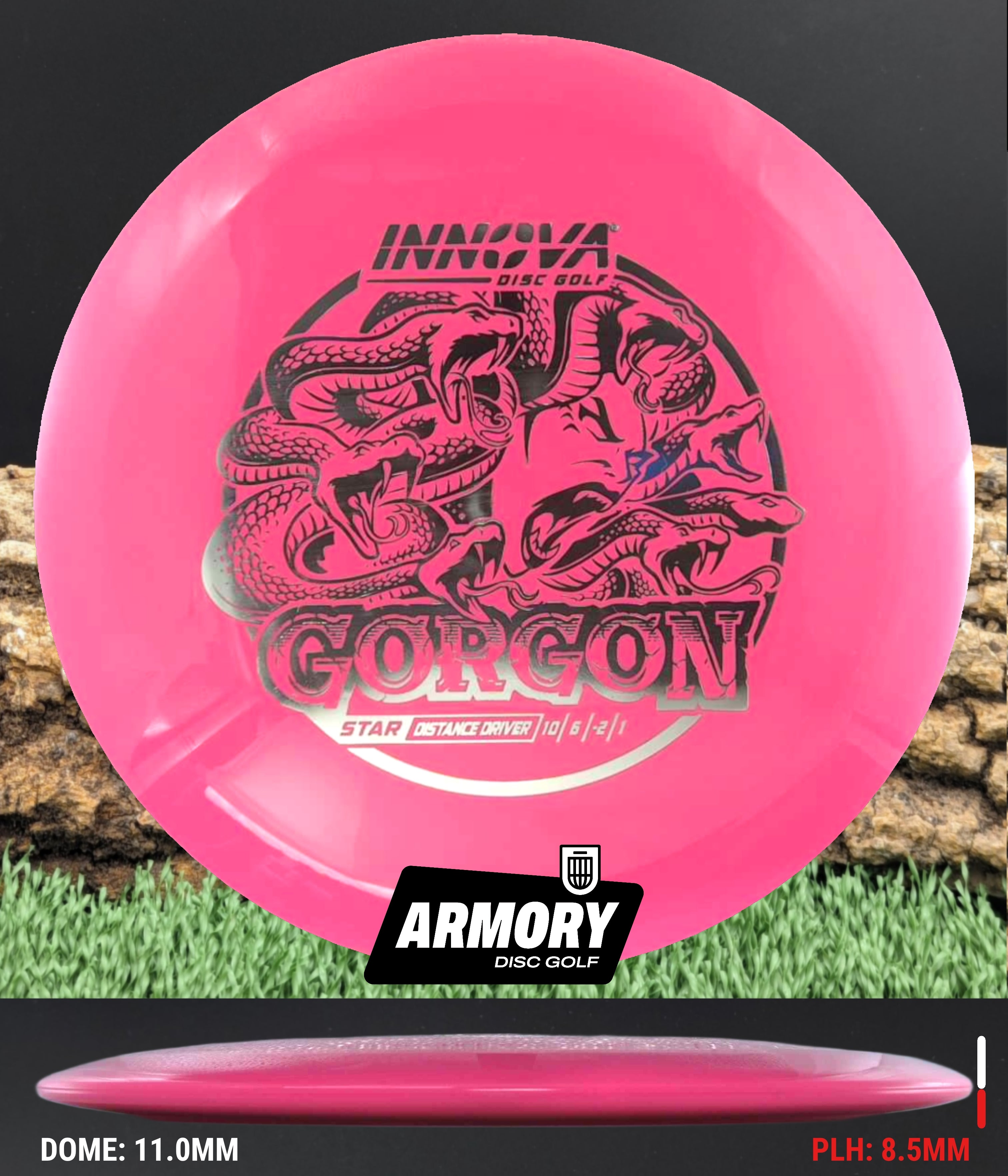 Introducing the Gorgon, a disc that merges the feel, precision, and ease of a Fairway Driver with the reach of a Distance Driver. Its flight? Arrow-straight glide with a steadfast fade, mirroring the Gorgon's unwavering gaze. Experience the legend—drive like a deity, conquer the course.