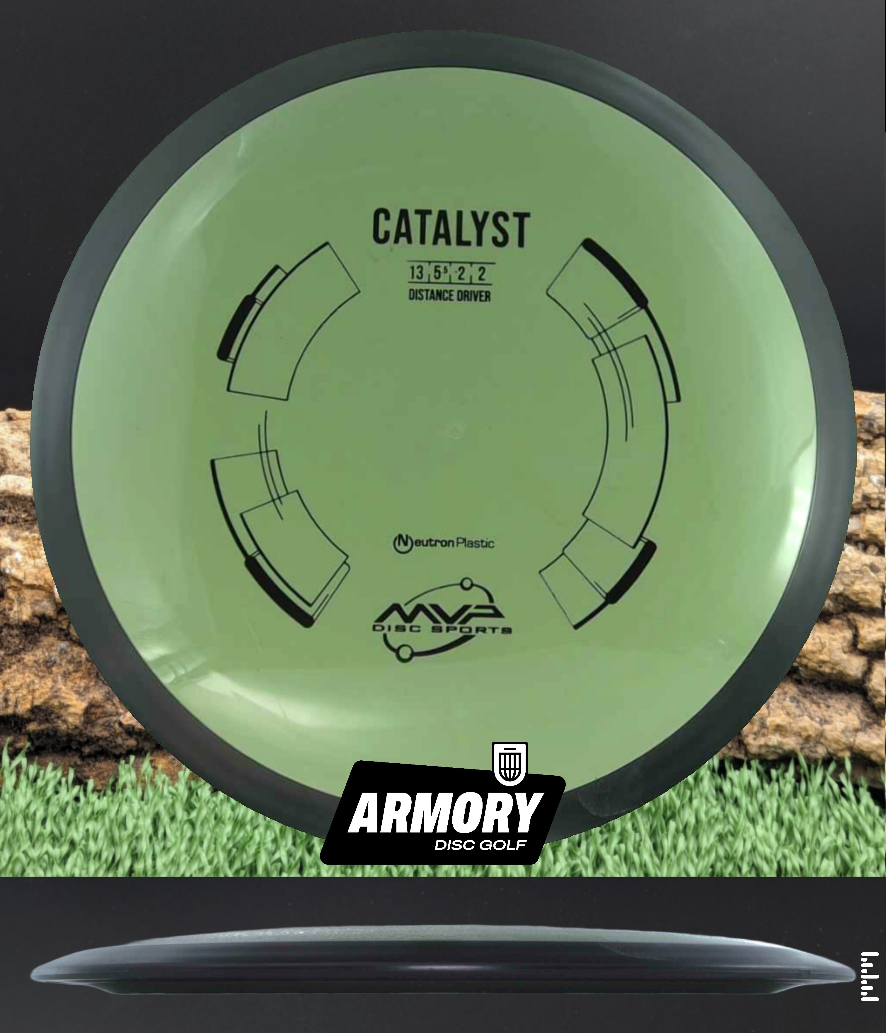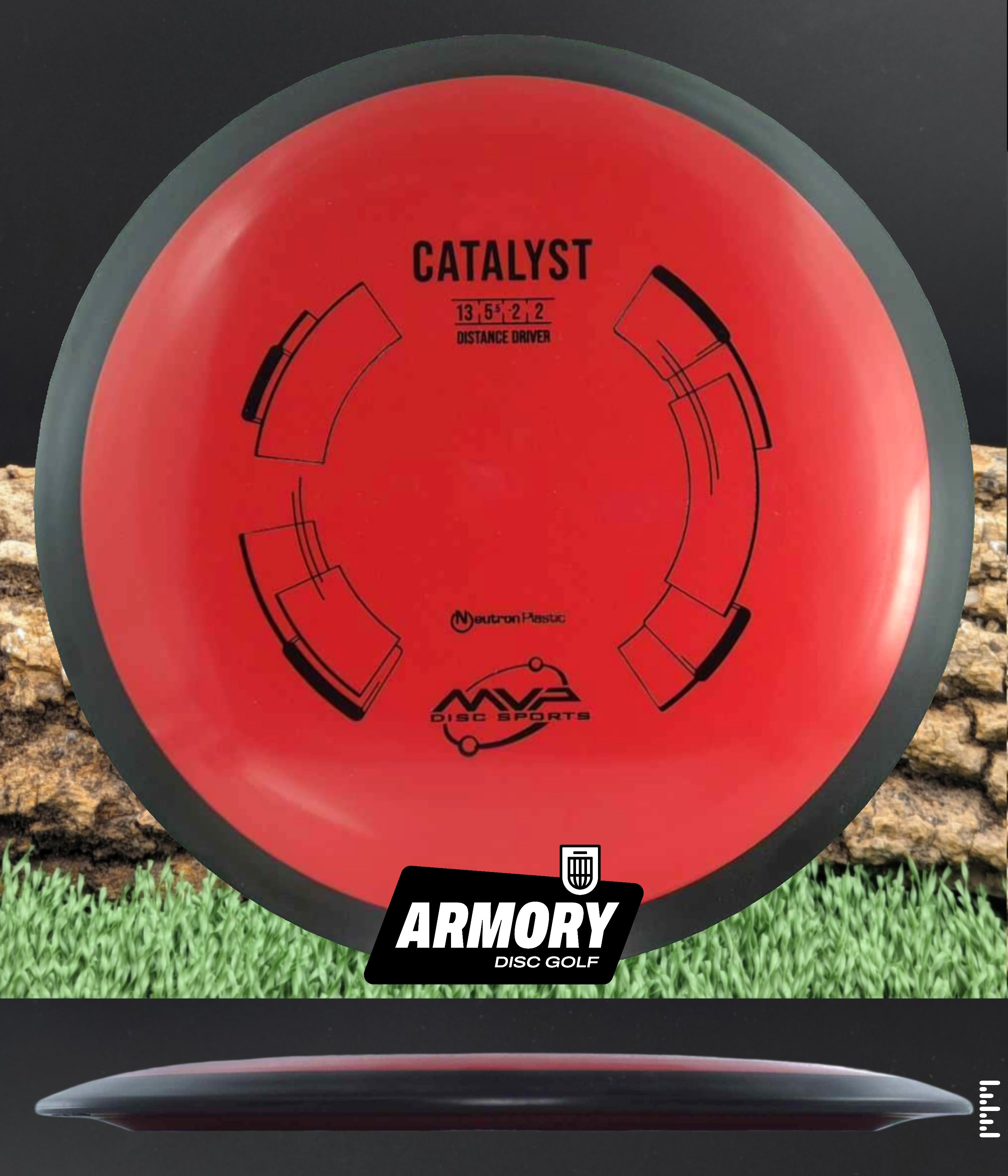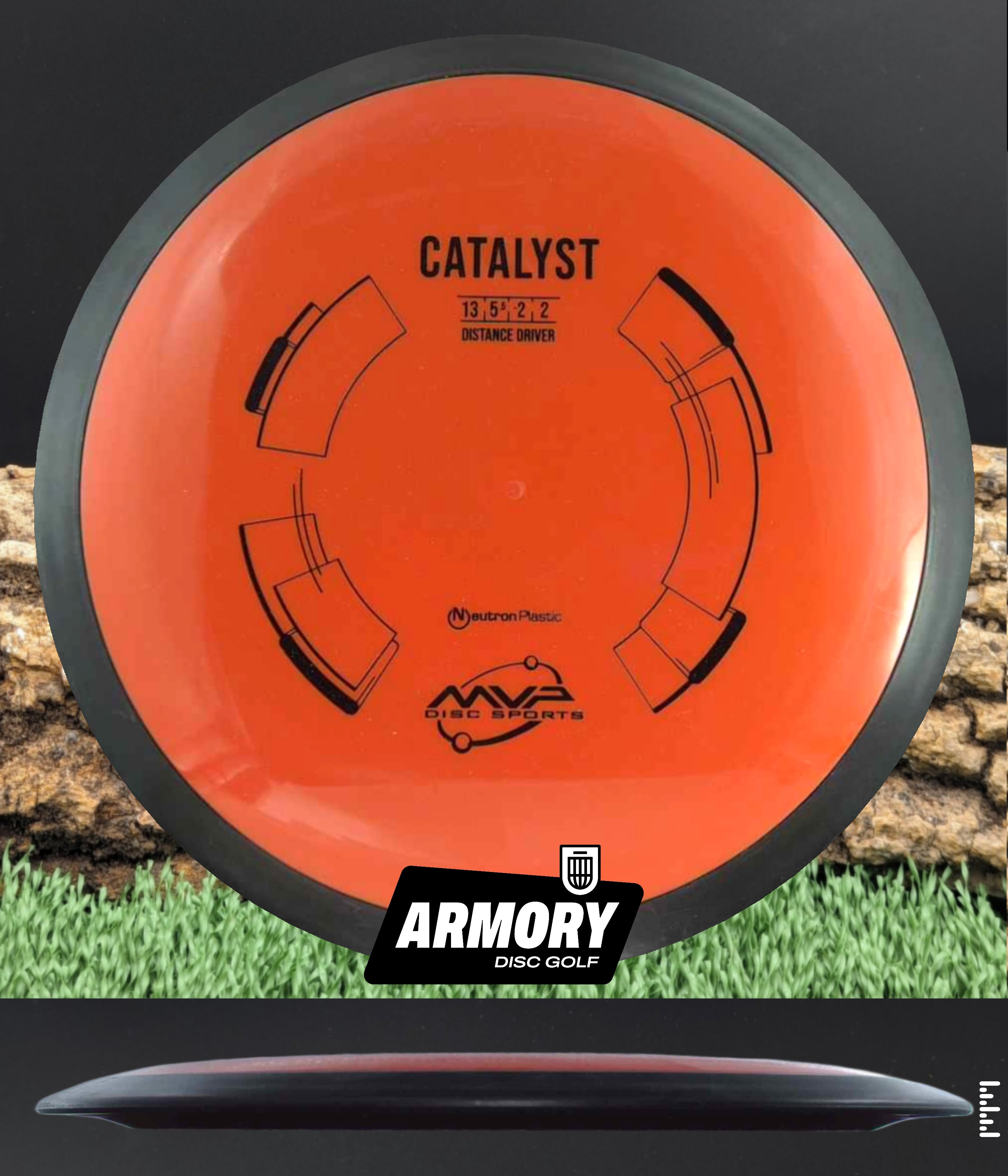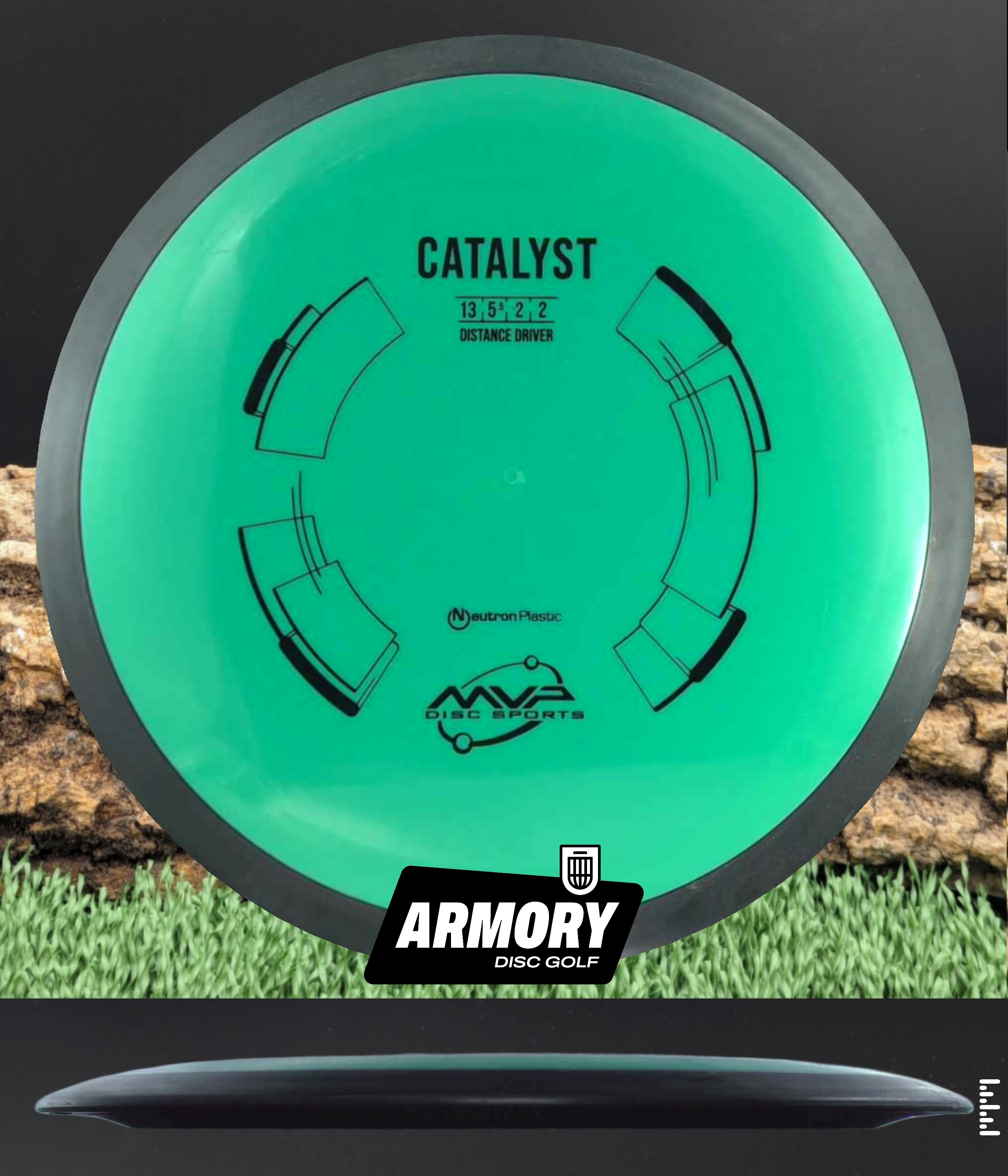 The Catalyst is a perfect starter for big distance. Its stability profile lends itself to being incredibly useful even when underpowered. Catalyst is similar to a longer Wave. High power throwers will be able to control rollers, sky anhyzers, and tight turns, while average to low power players will get easy distance with great glide, and a power responsive amount of turn-to-straight. The Catalyst is molded with the same core and nice even dome as the Octane, yielding extra glide for maximum distance shots.