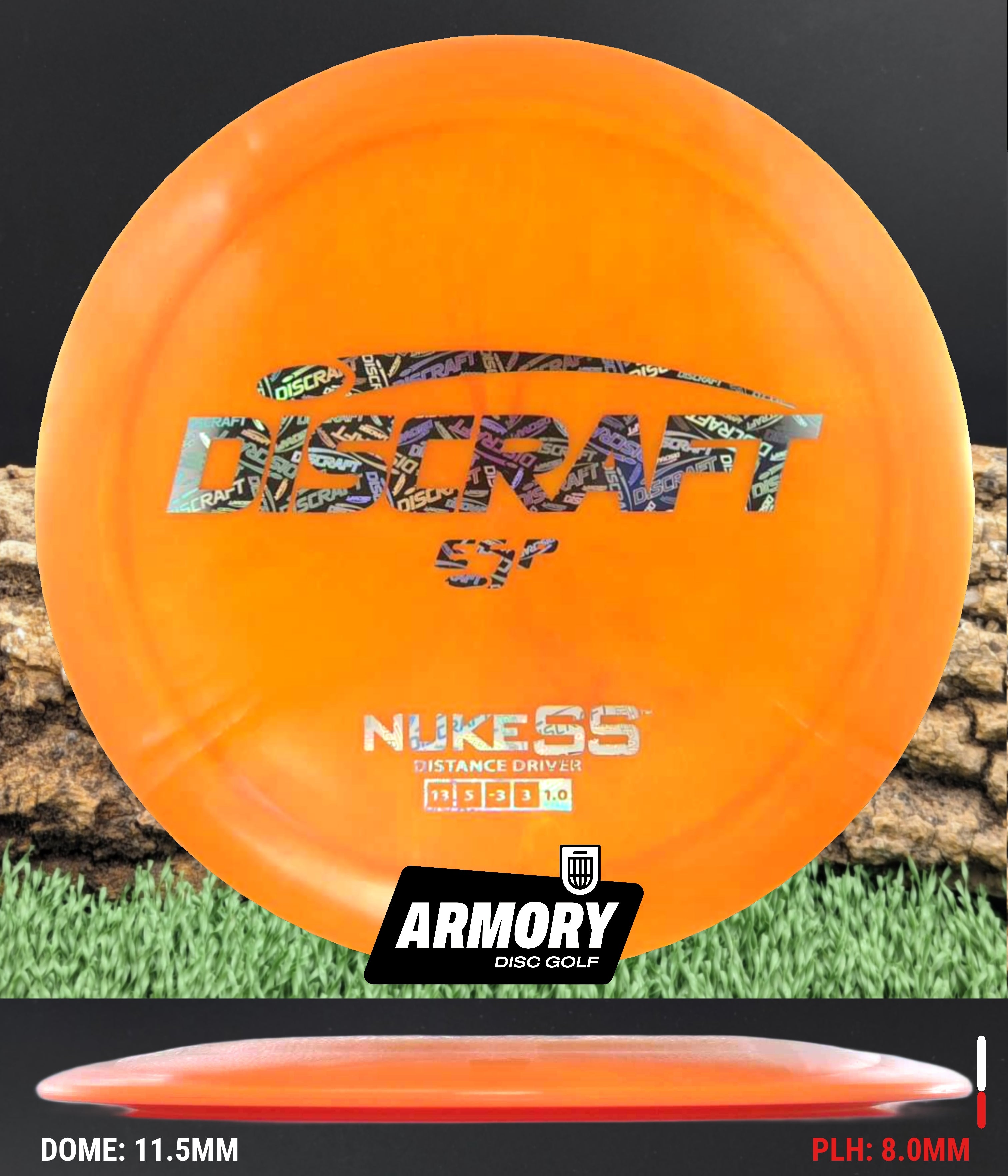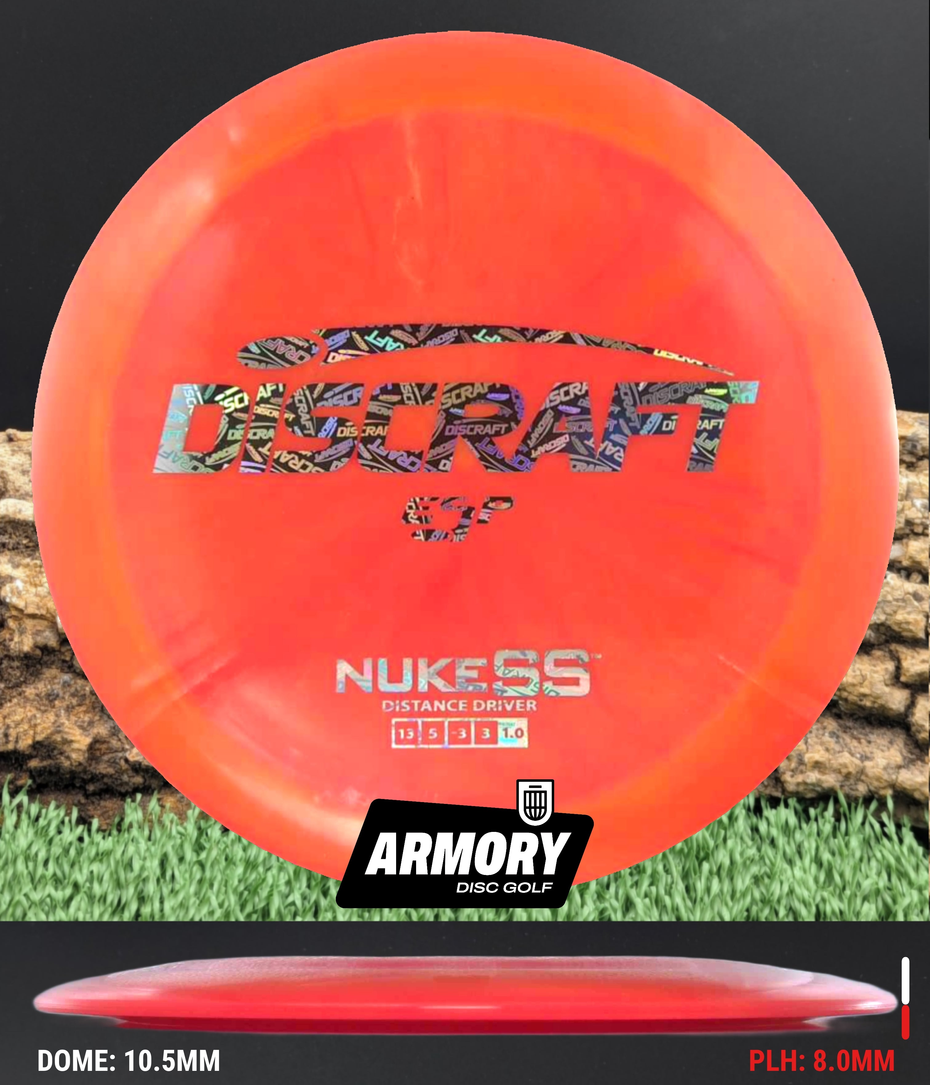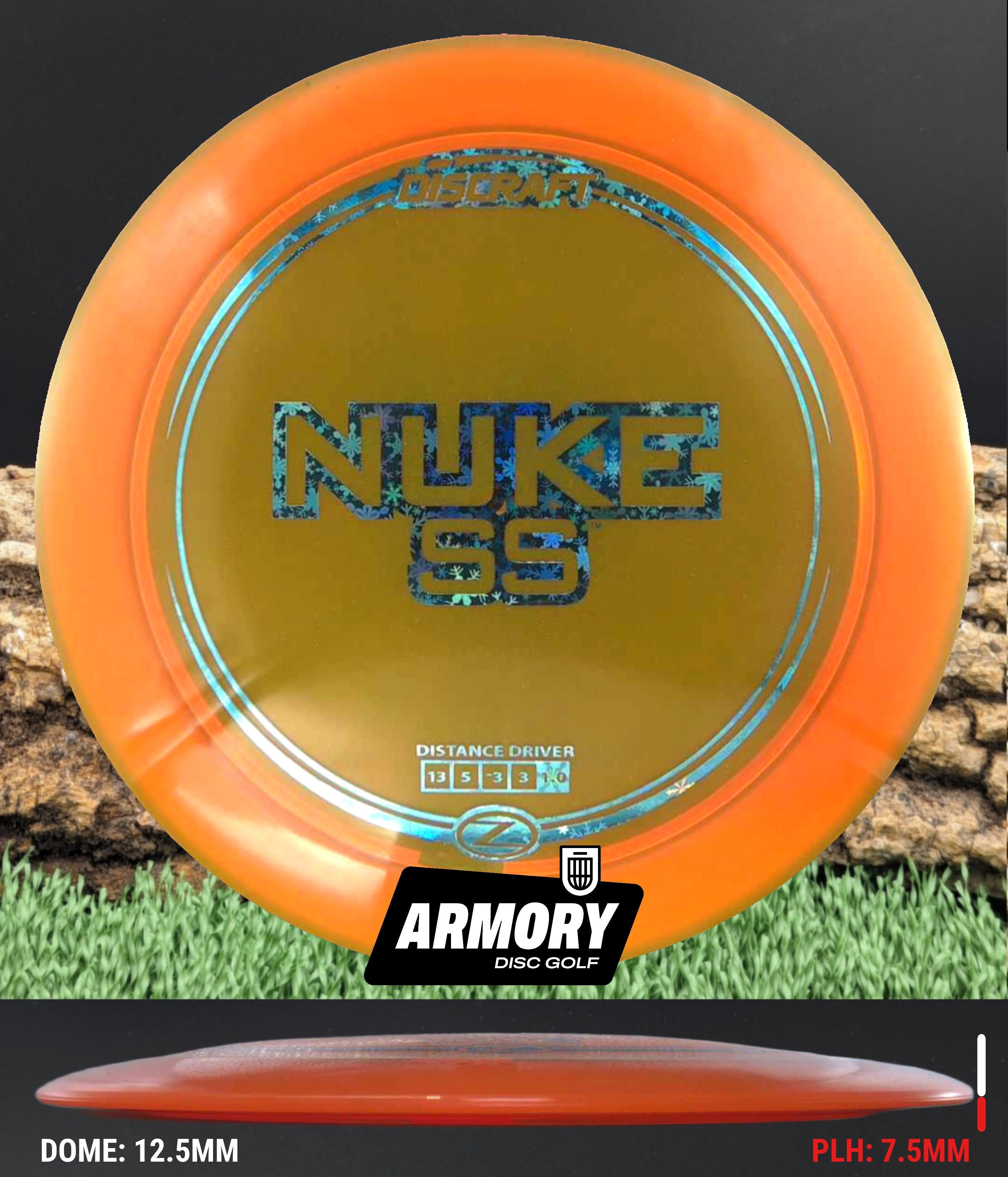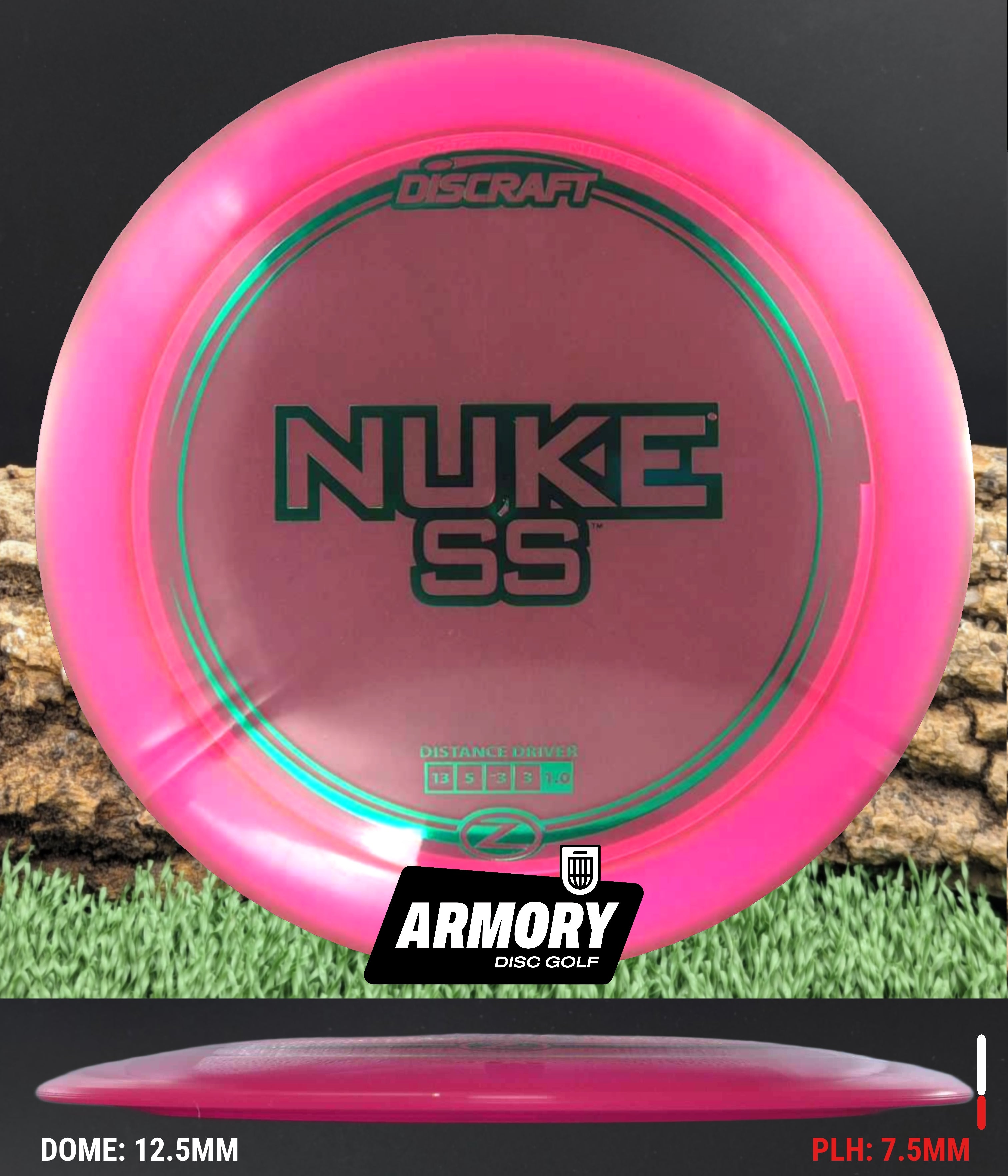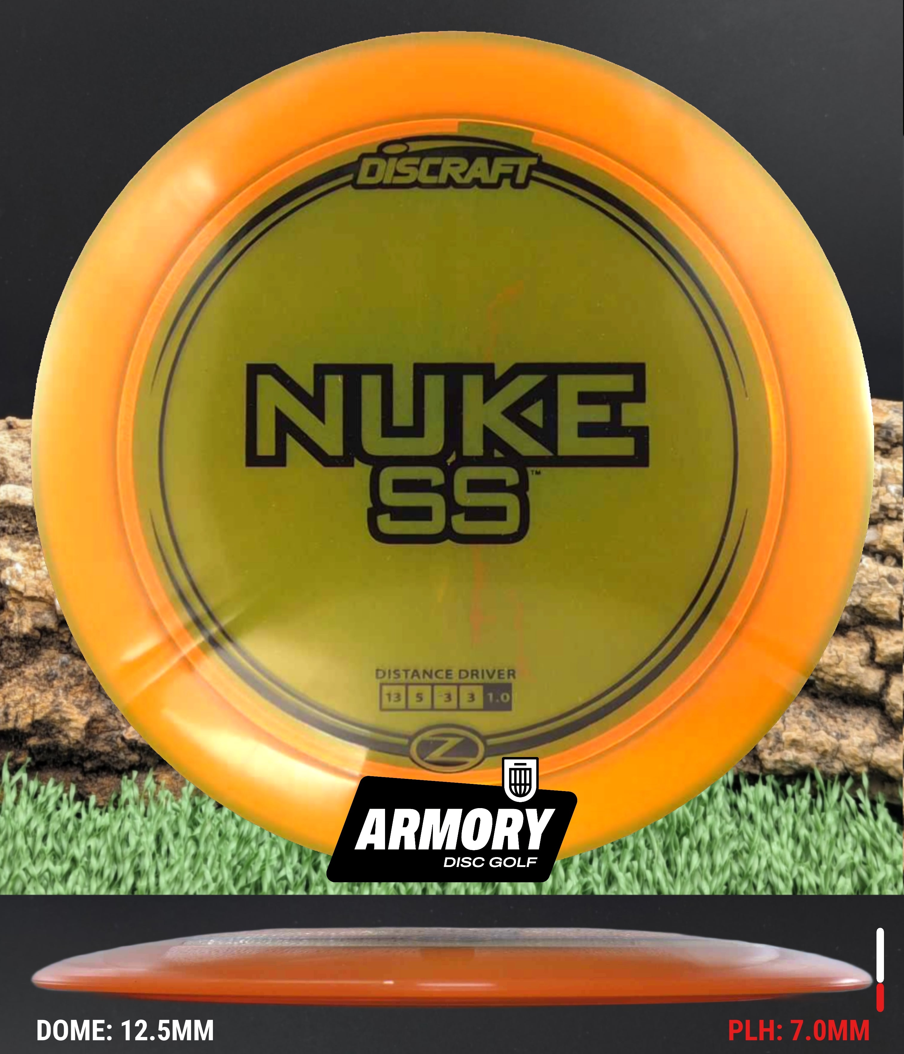 The Discraft Nuke SS  is a high-speed distance driver designed for players seeking maximum distance with less power. As a more understable version of the popular Nuke, this disc features a speed rating of 13 with enhanced turn, making it ideal for players with moderate arm speeds. The "SS" (Super Straight) variant offers improved glide and a more pronounced turning flight path compared to the standard Nuke.
