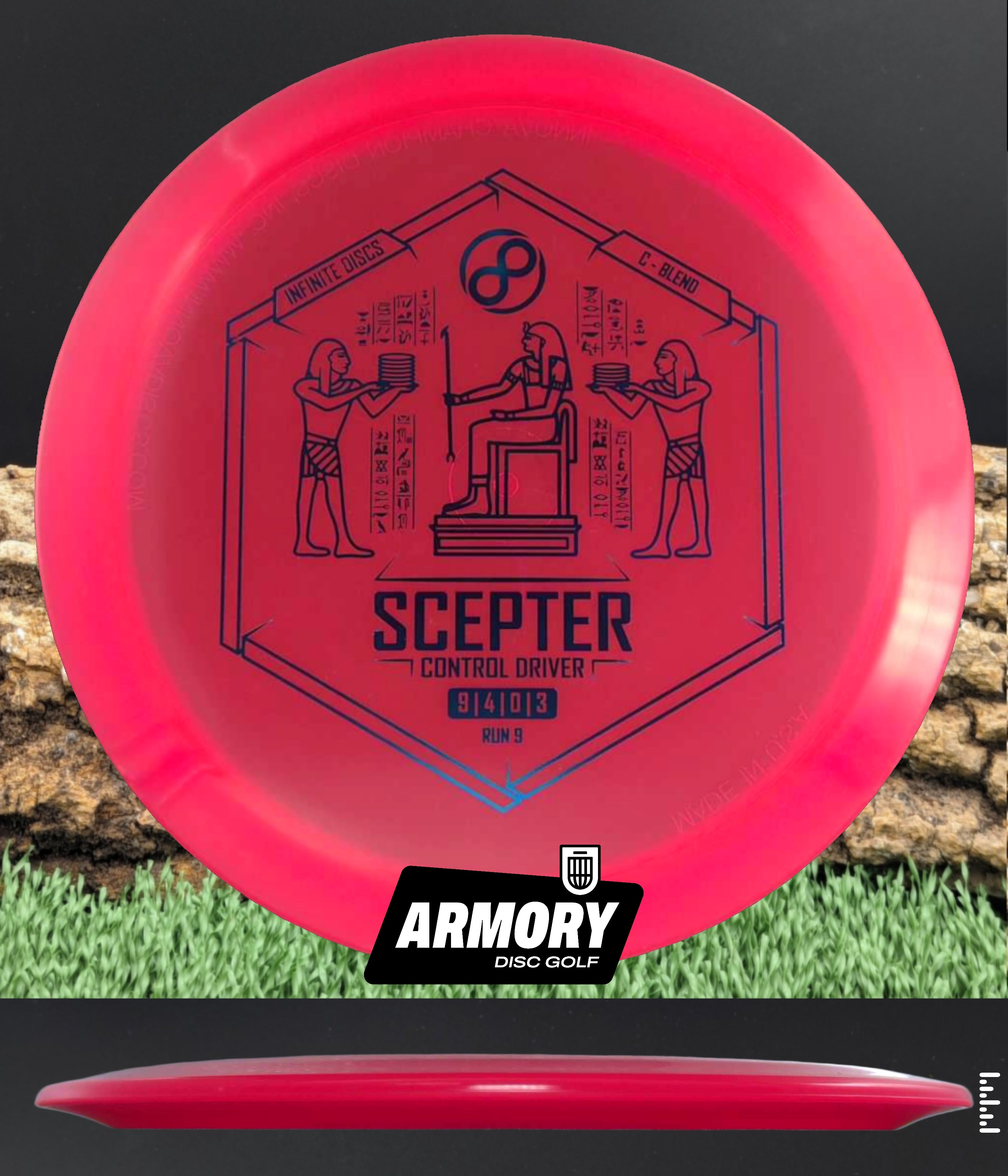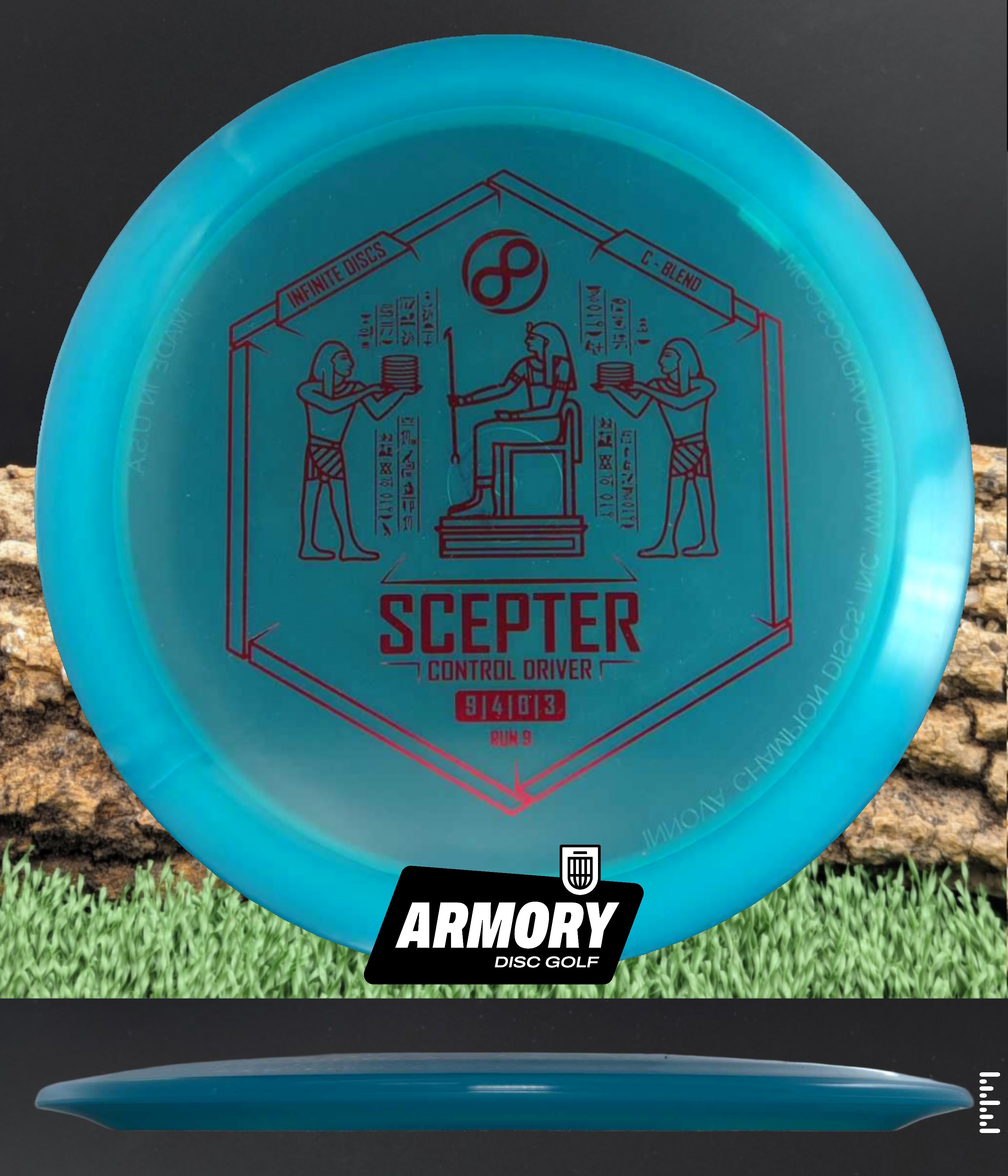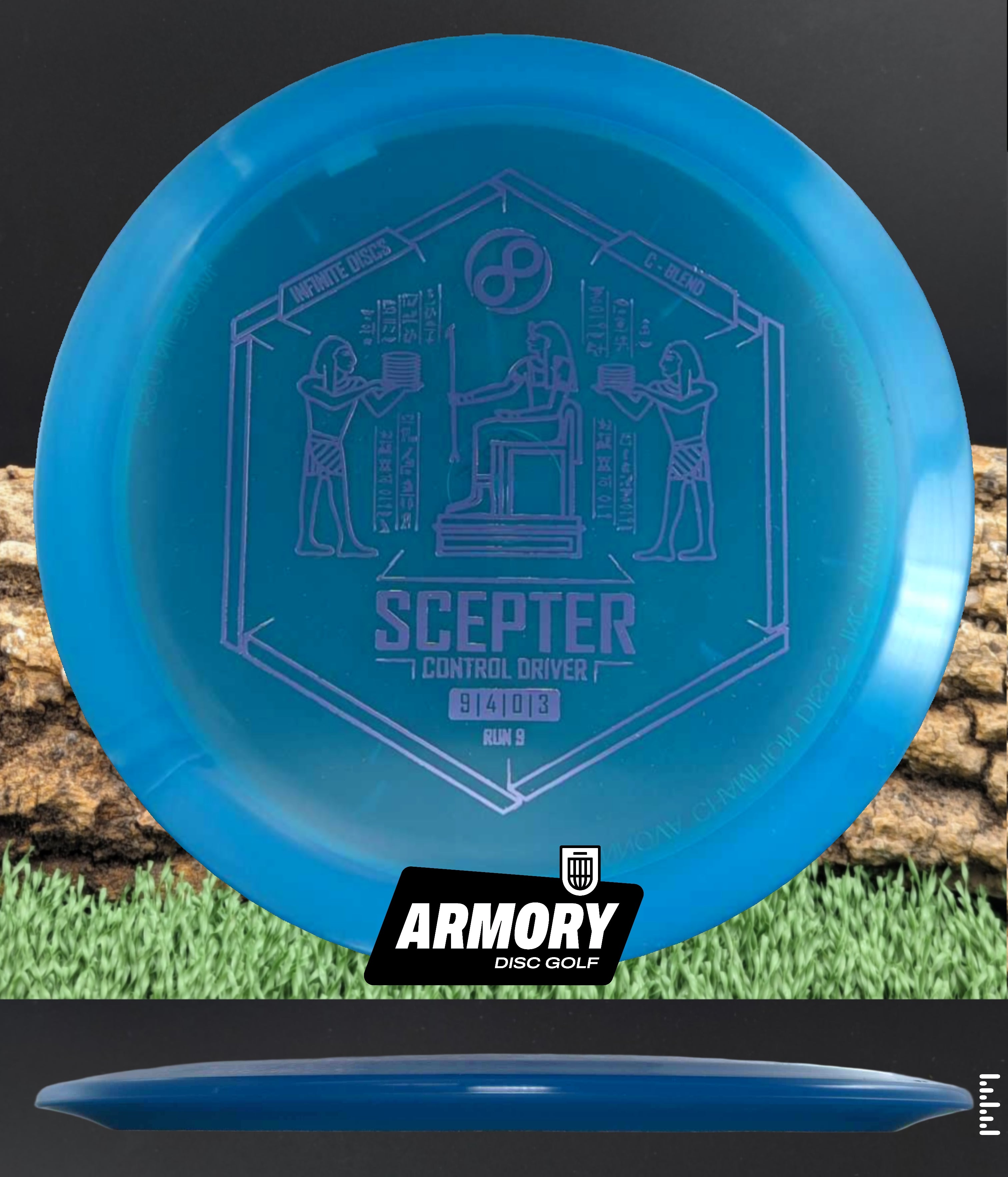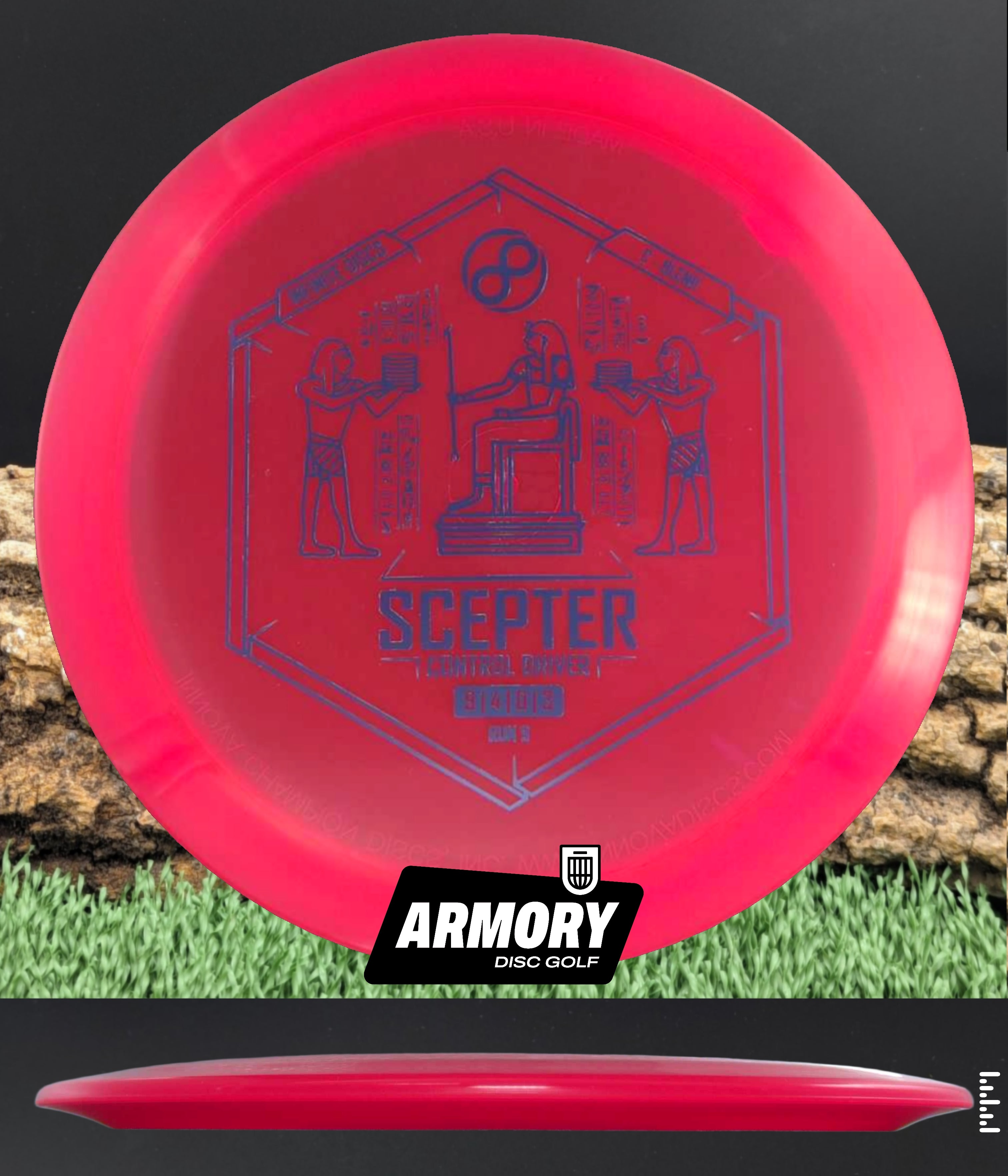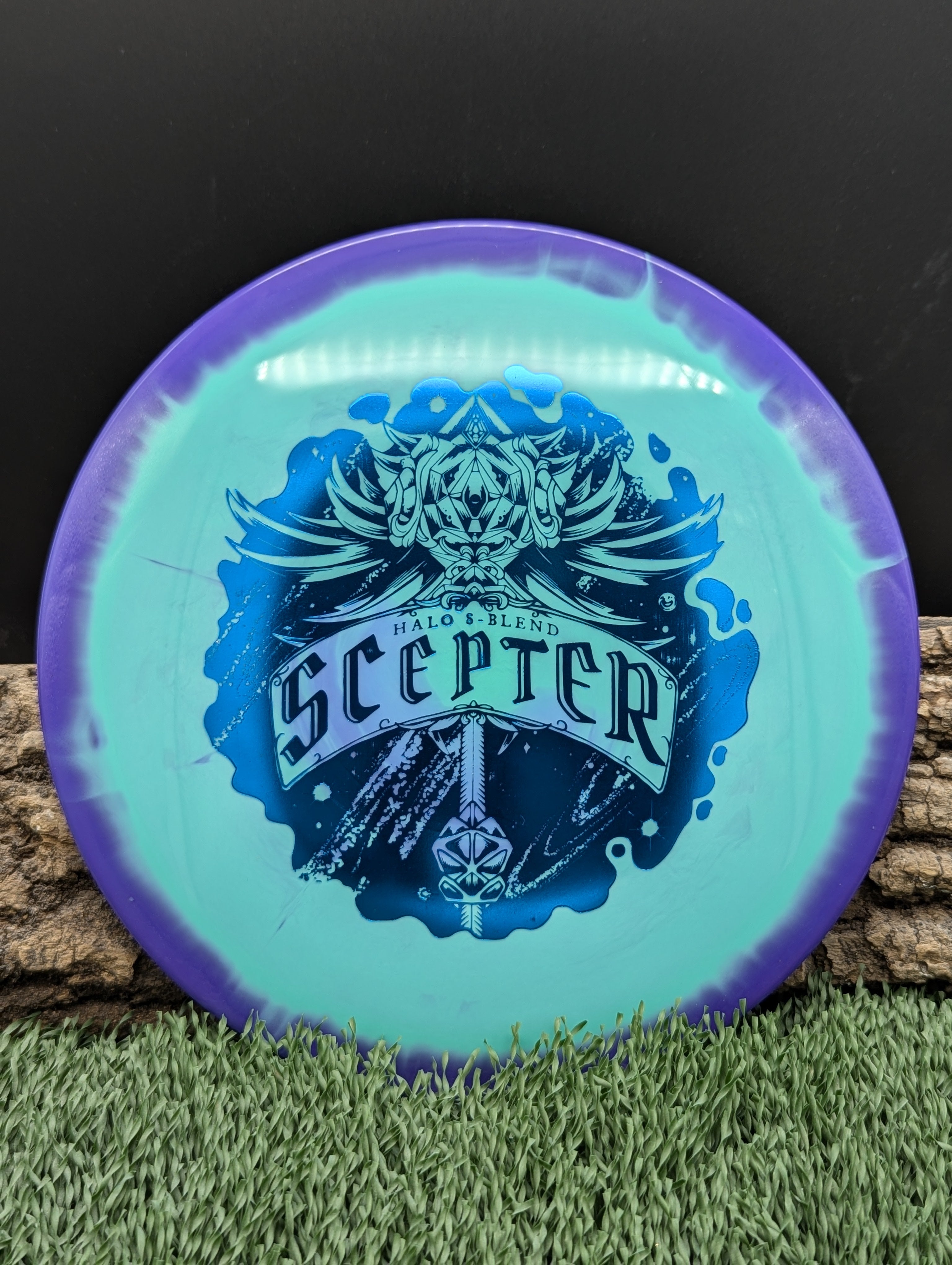 The Scepter is a flat-top, overstable fairway driver for power throwers or for utility use to get around obstacles on the disc golf course. It is very comfortable for forehand use and will always fight out of anhyzer releases. You can count on the Scepter to slice through headwinds and to make a dramatic end-of-flight fade.