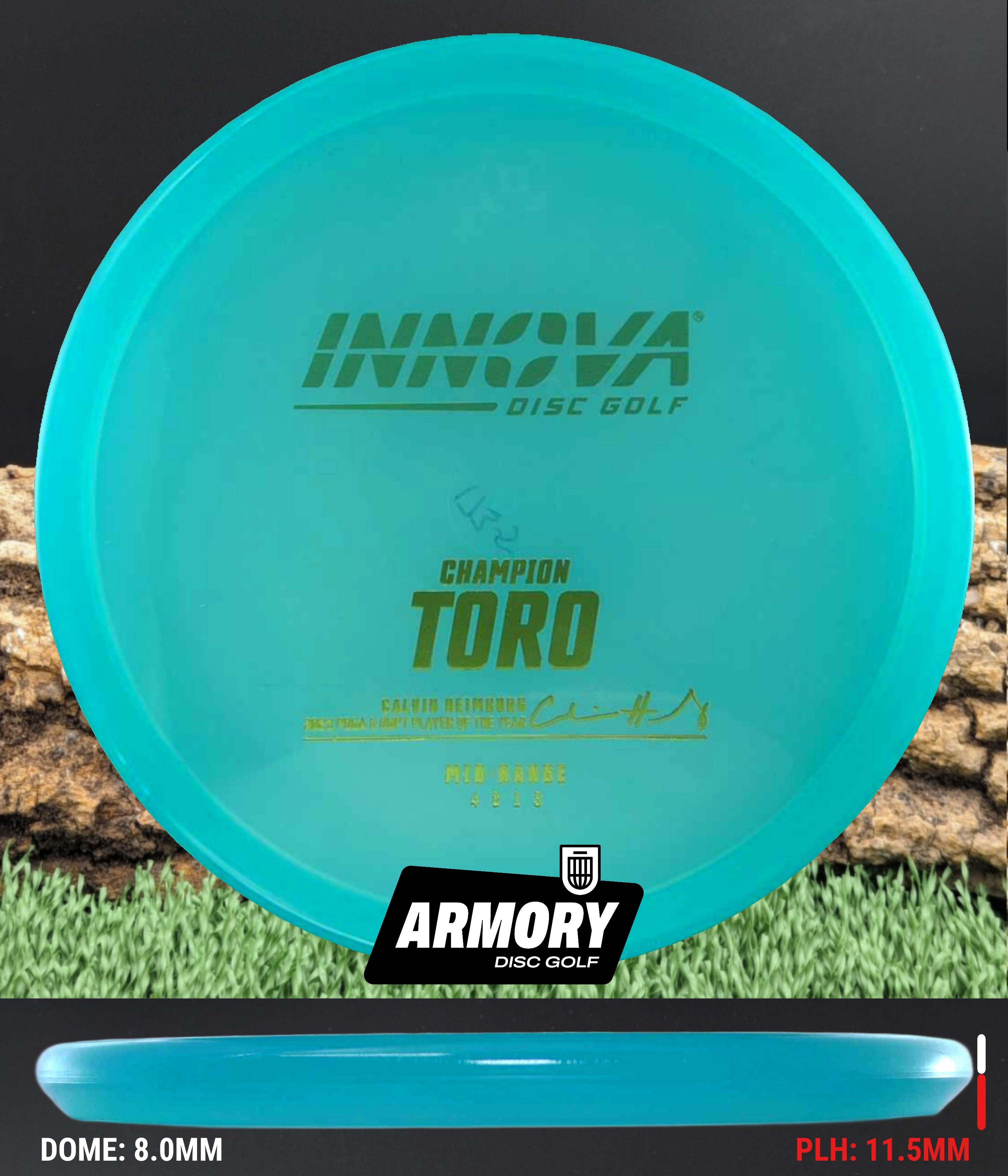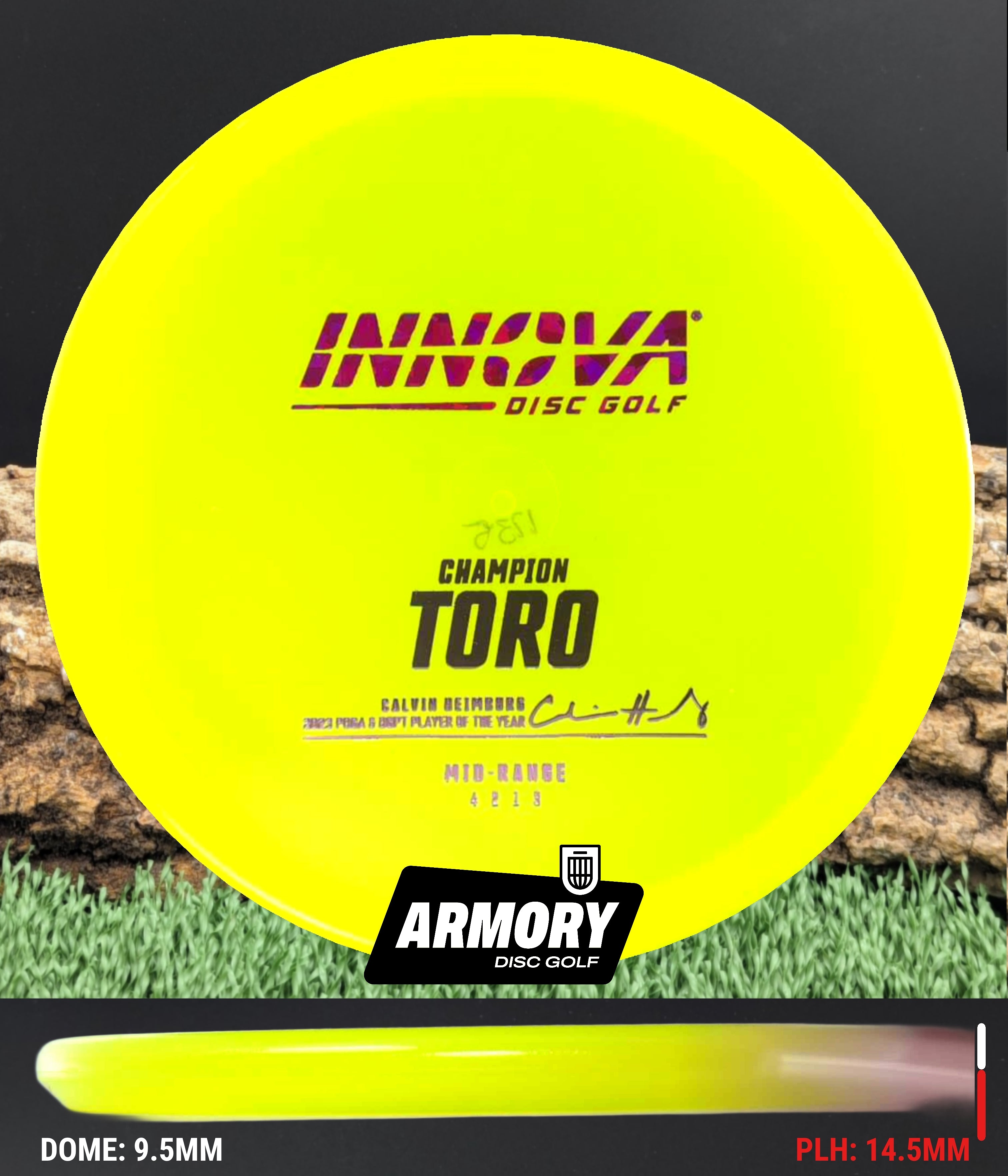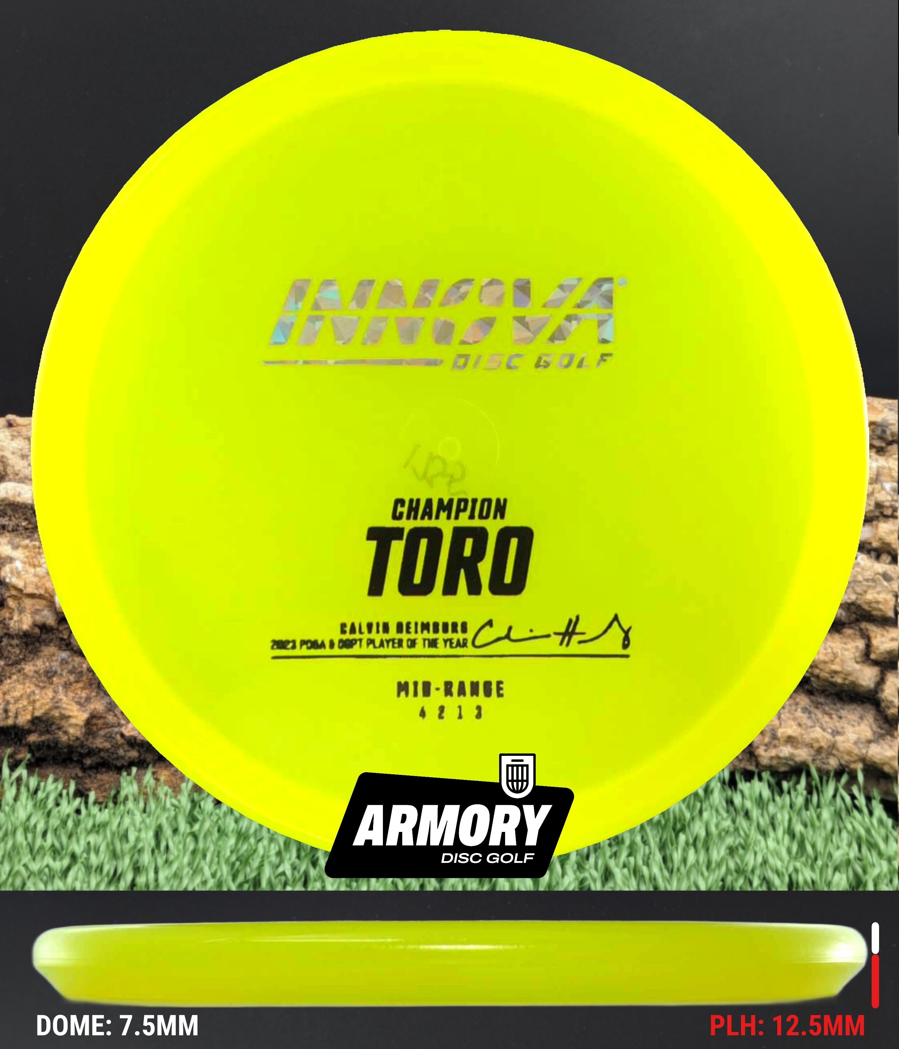 The Innova Champion Toro is a flat-top, beadless, overstable midrange co-developed with Calvin Heimburg to handle extreme torque and windy conditions. It’s built to hold the angles you put it on—especially for powerful sidearms—and finishes with a reliable fade that makes it a trustworthy approach tool and forehand workhorse.