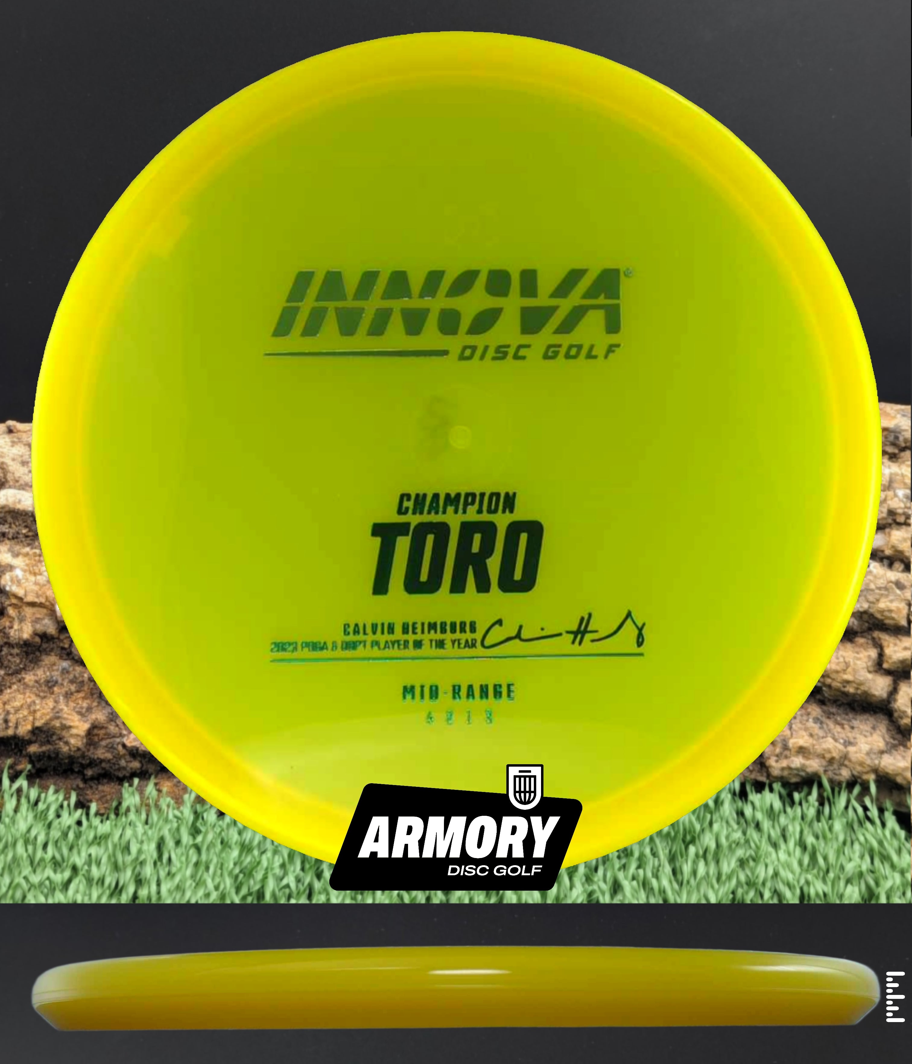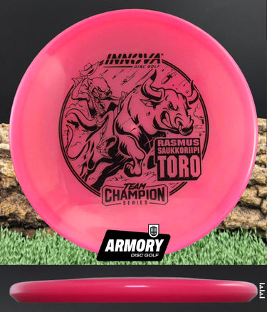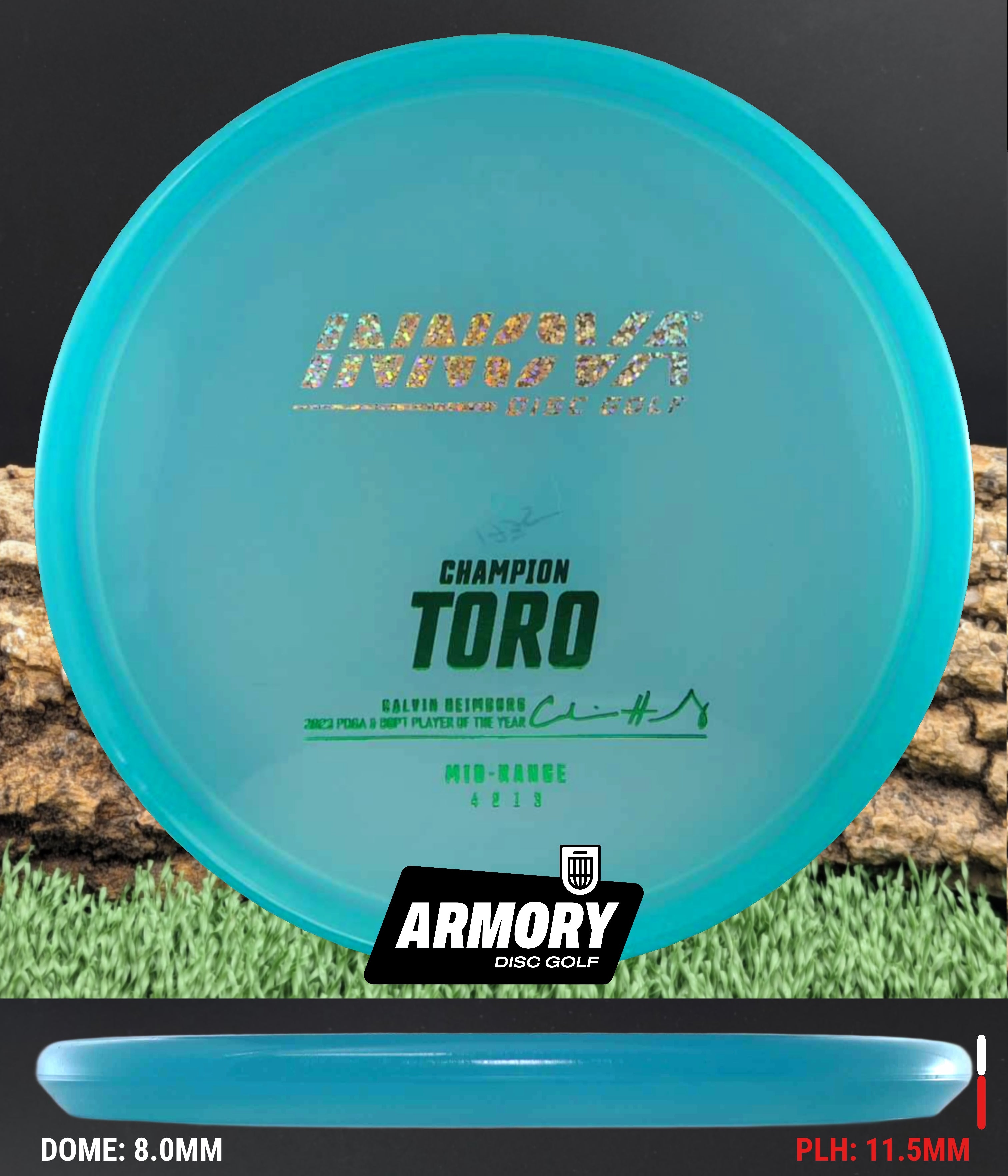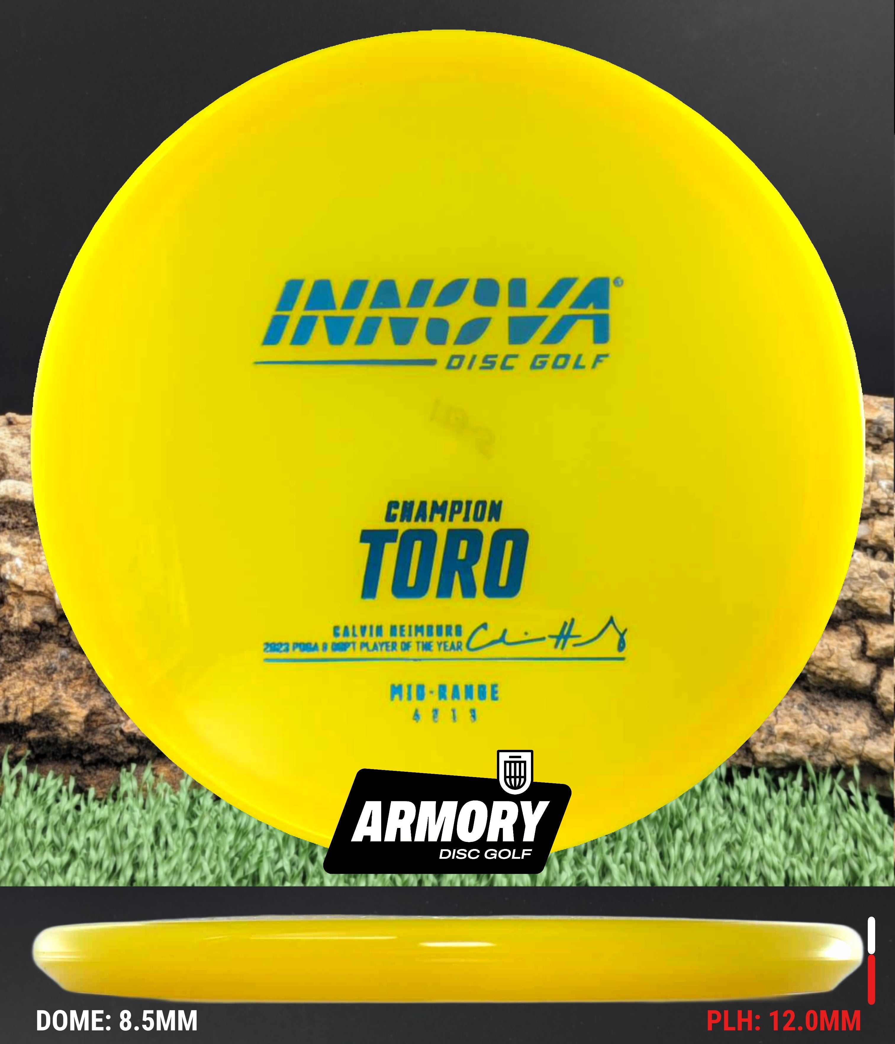 The Innova Champion Toro is a flat-top, beadless, overstable midrange co-developed with Calvin Heimburg to handle extreme torque and windy conditions. It’s built to hold the angles you put it on—especially for powerful sidearms—and finishes with a reliable fade that makes it a trustworthy approach tool and forehand workhorse.