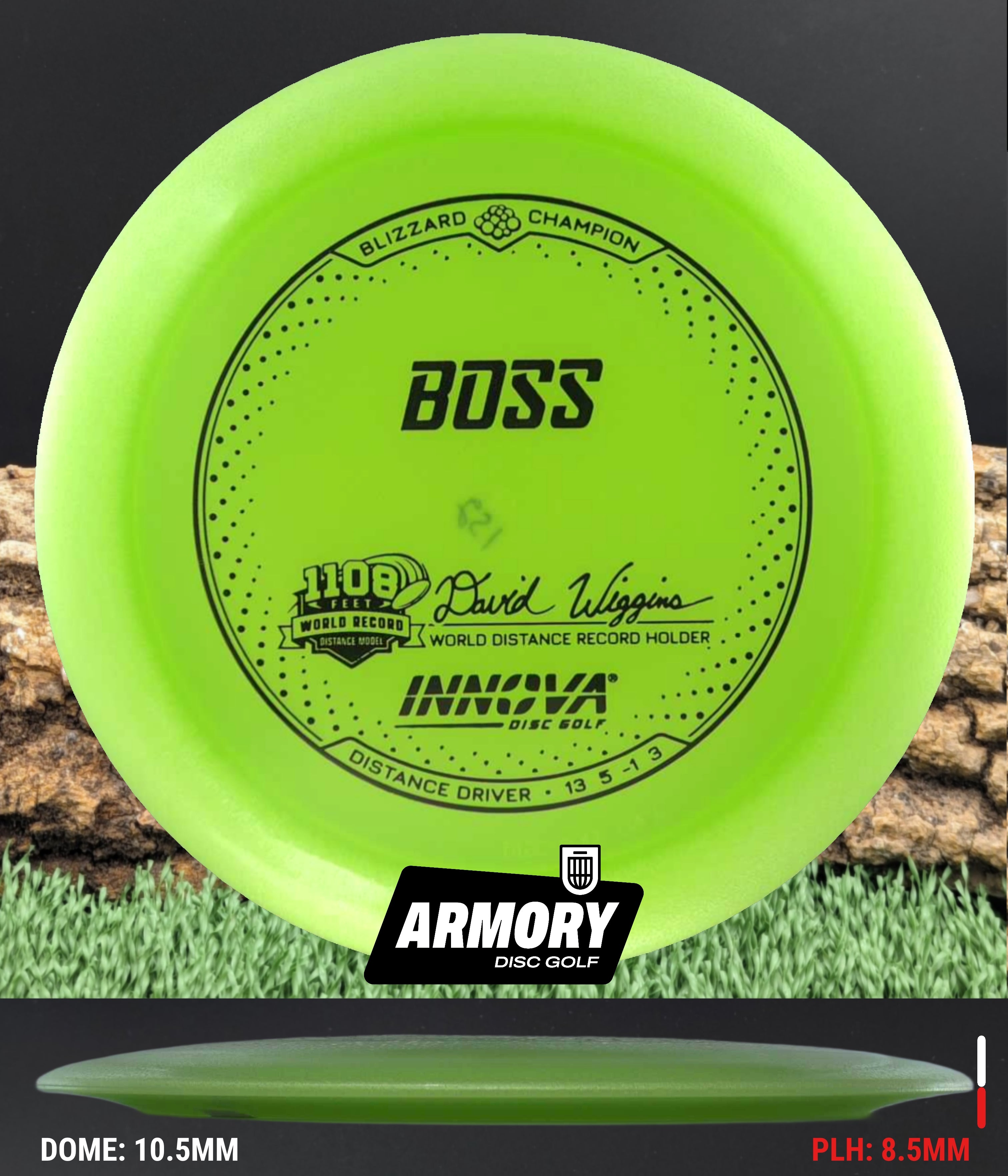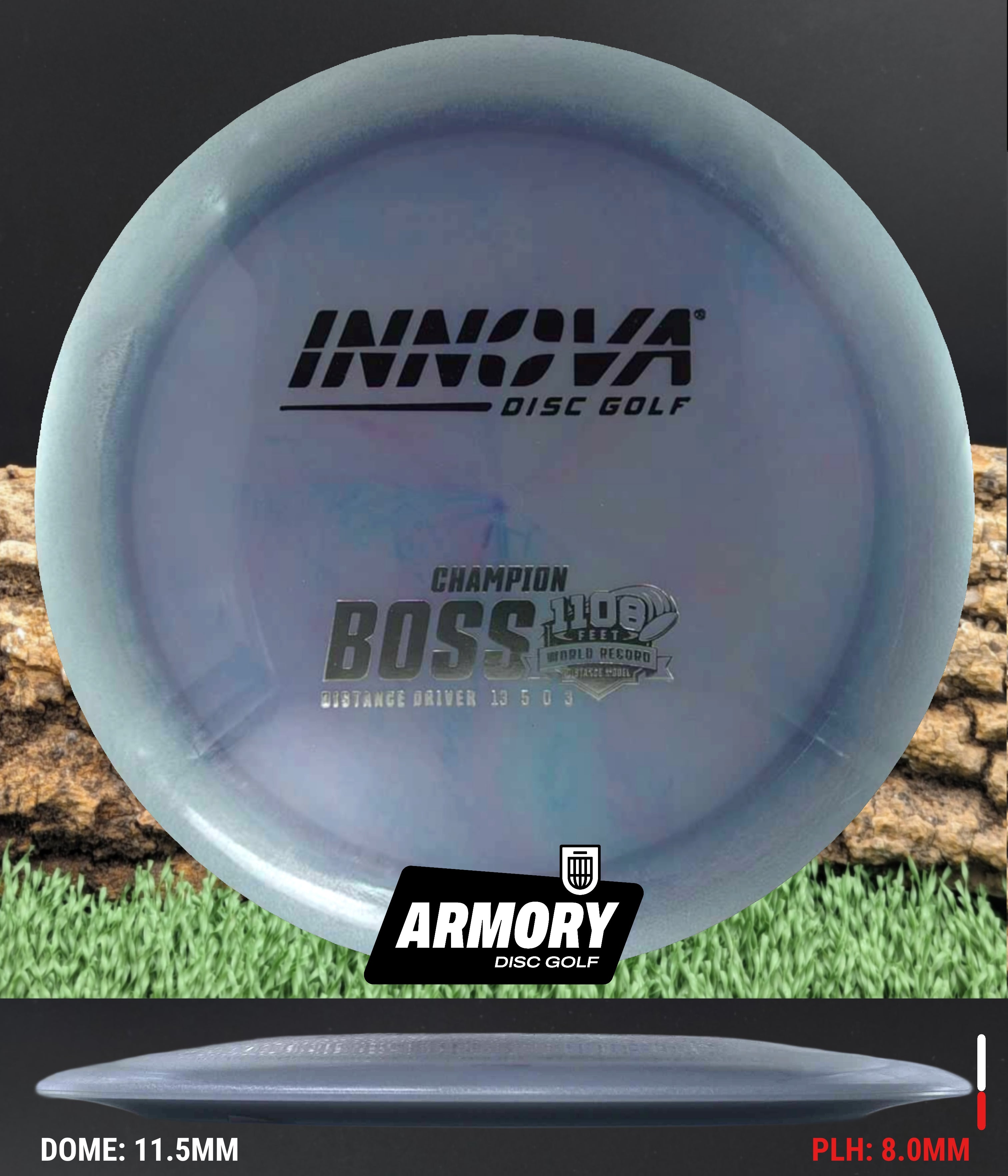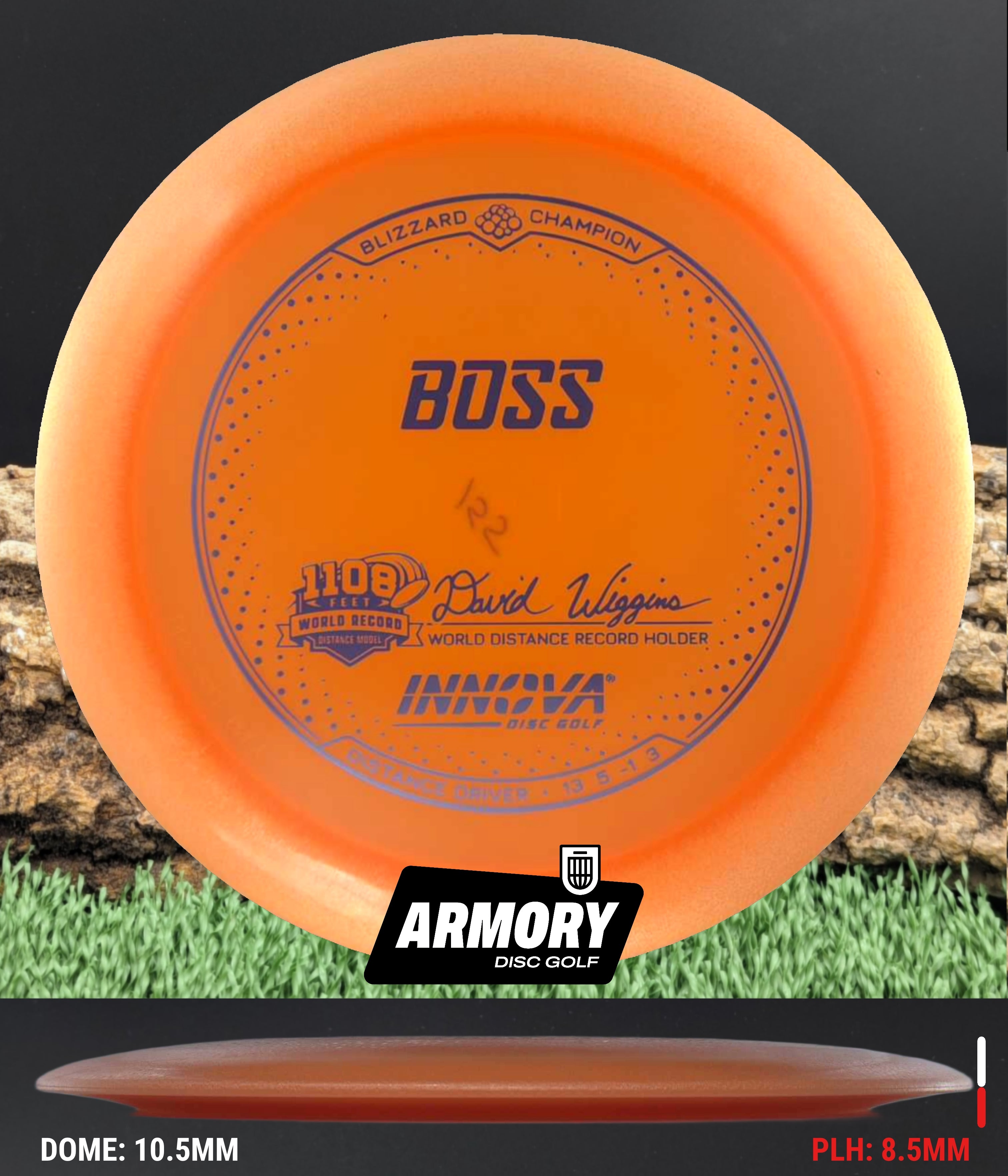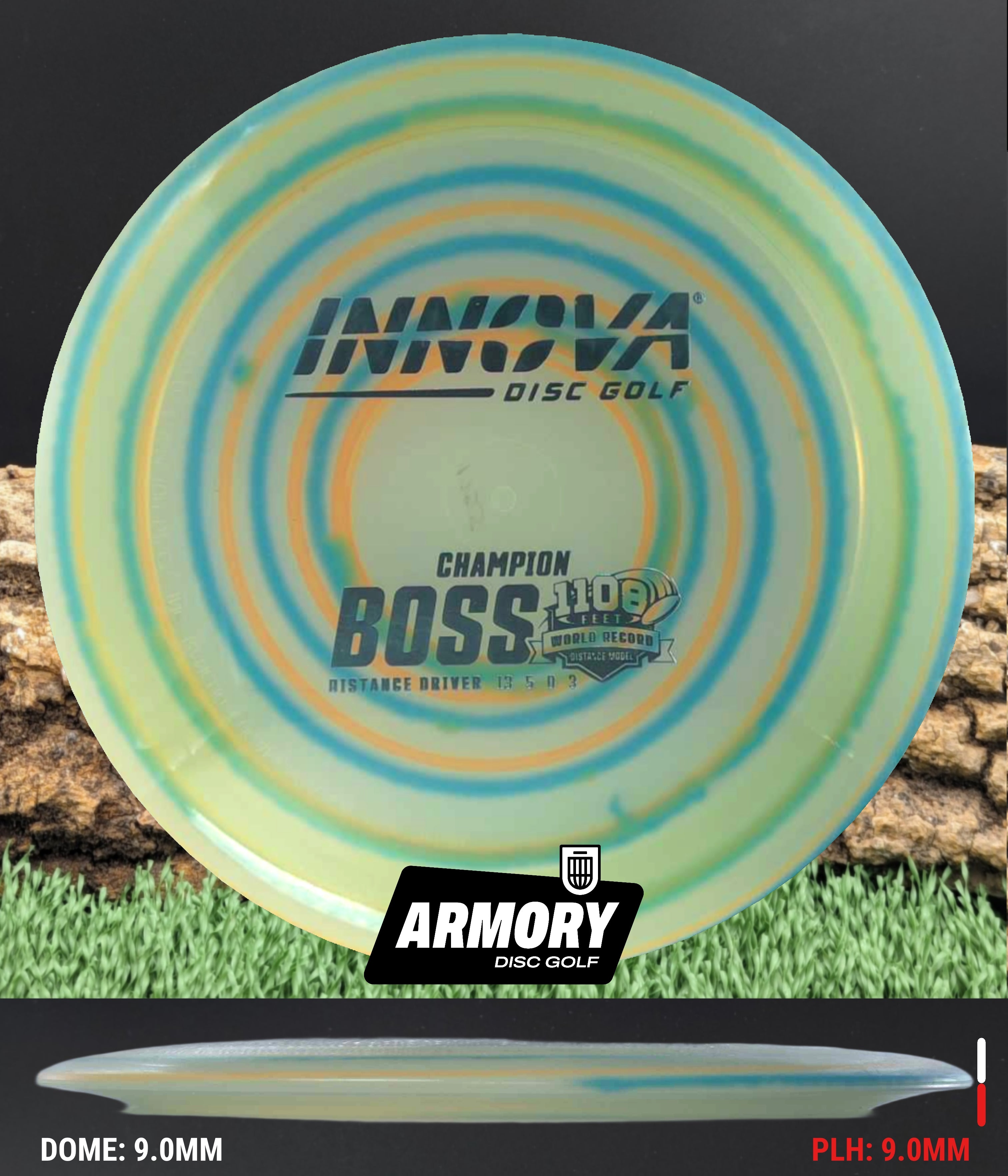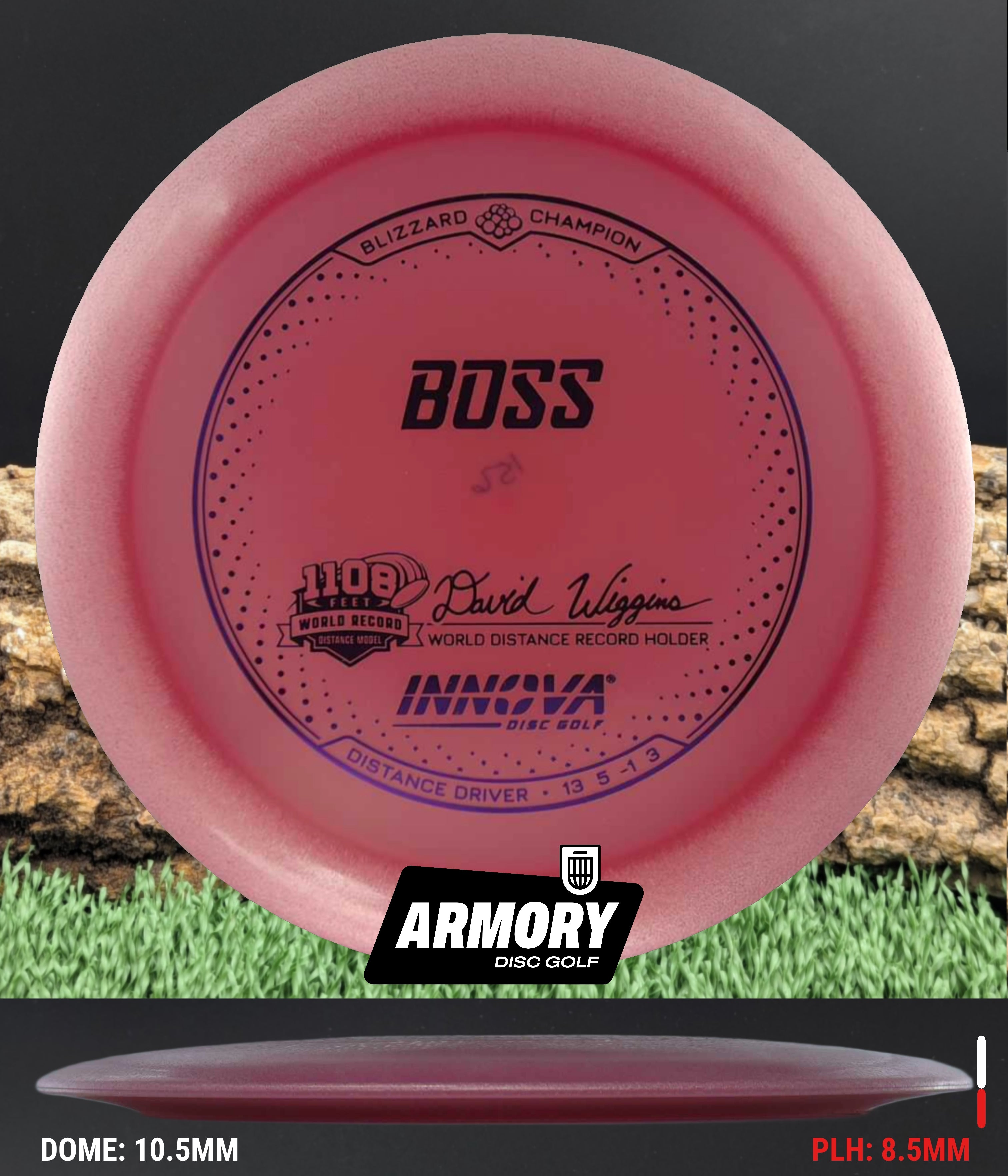 The Innova Boss is a fast stable driver that can handle full power throws and moderate headwinds, and advanced players and sidearm throwers will appreciate the dependable stability. The Boss has a slight high speed turn to help maximize distance with a predictable fade.