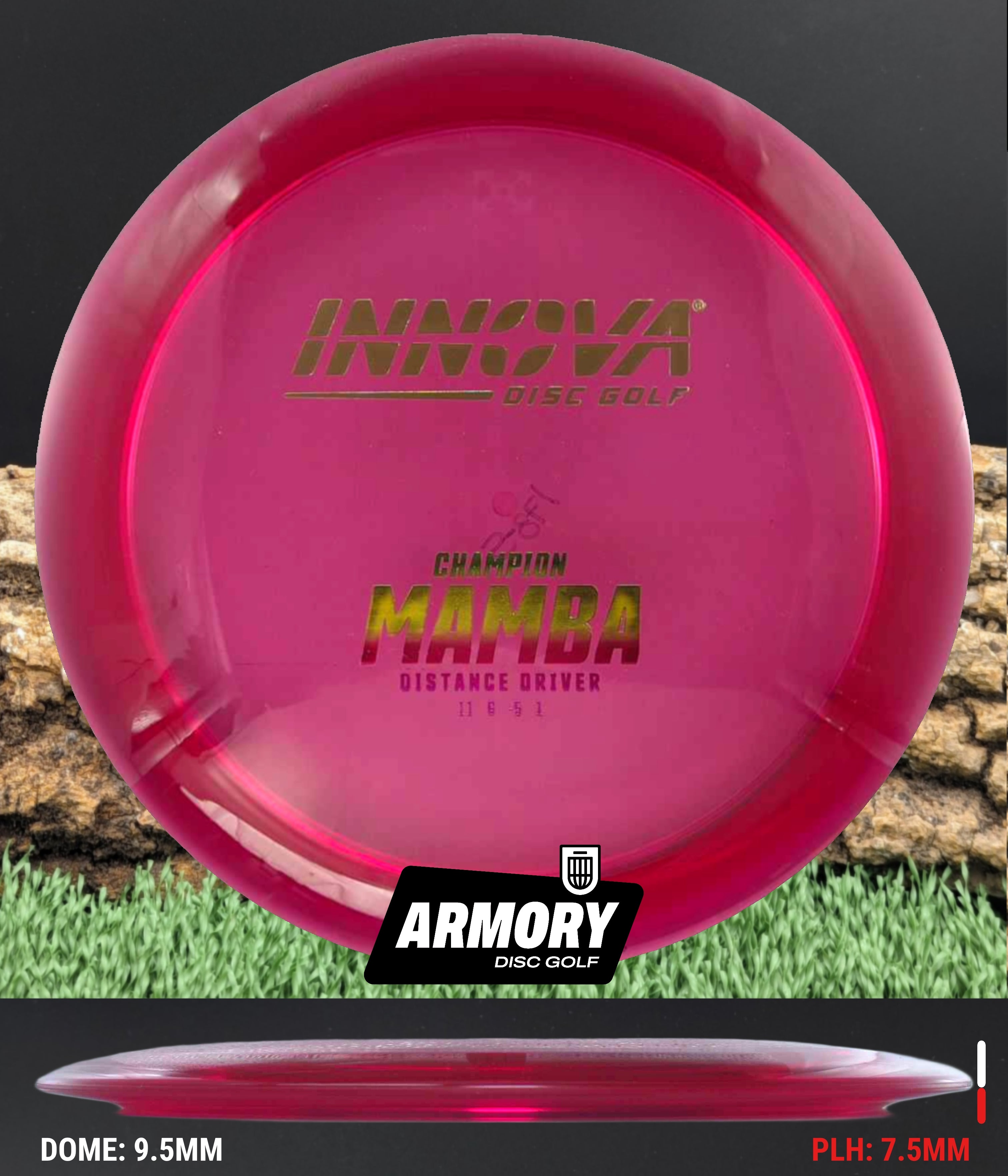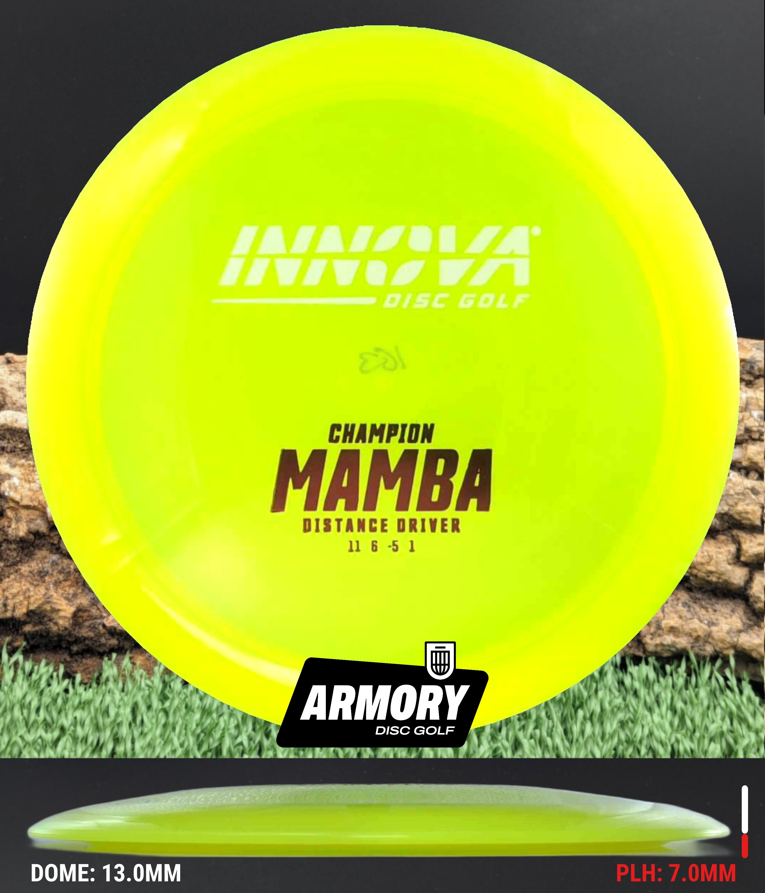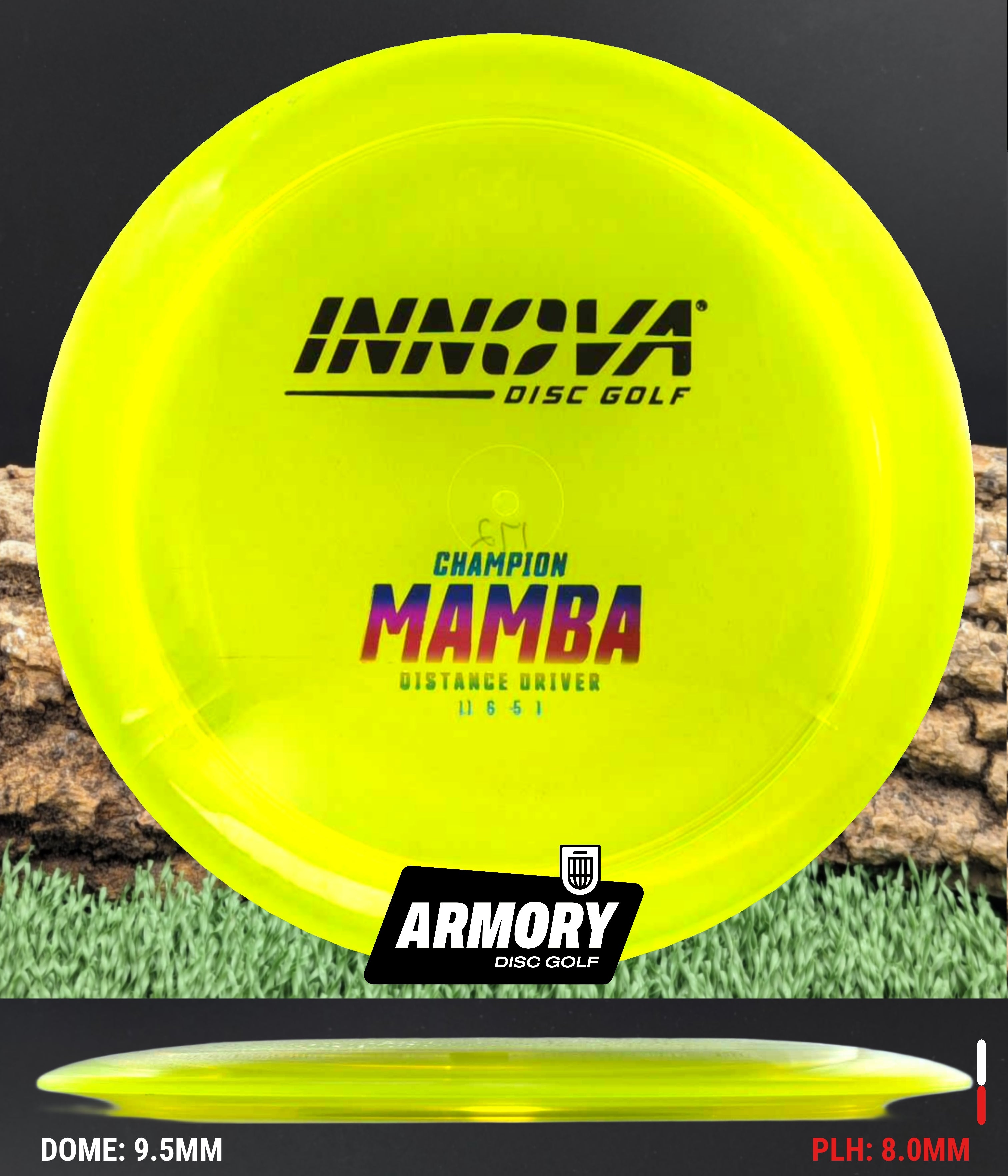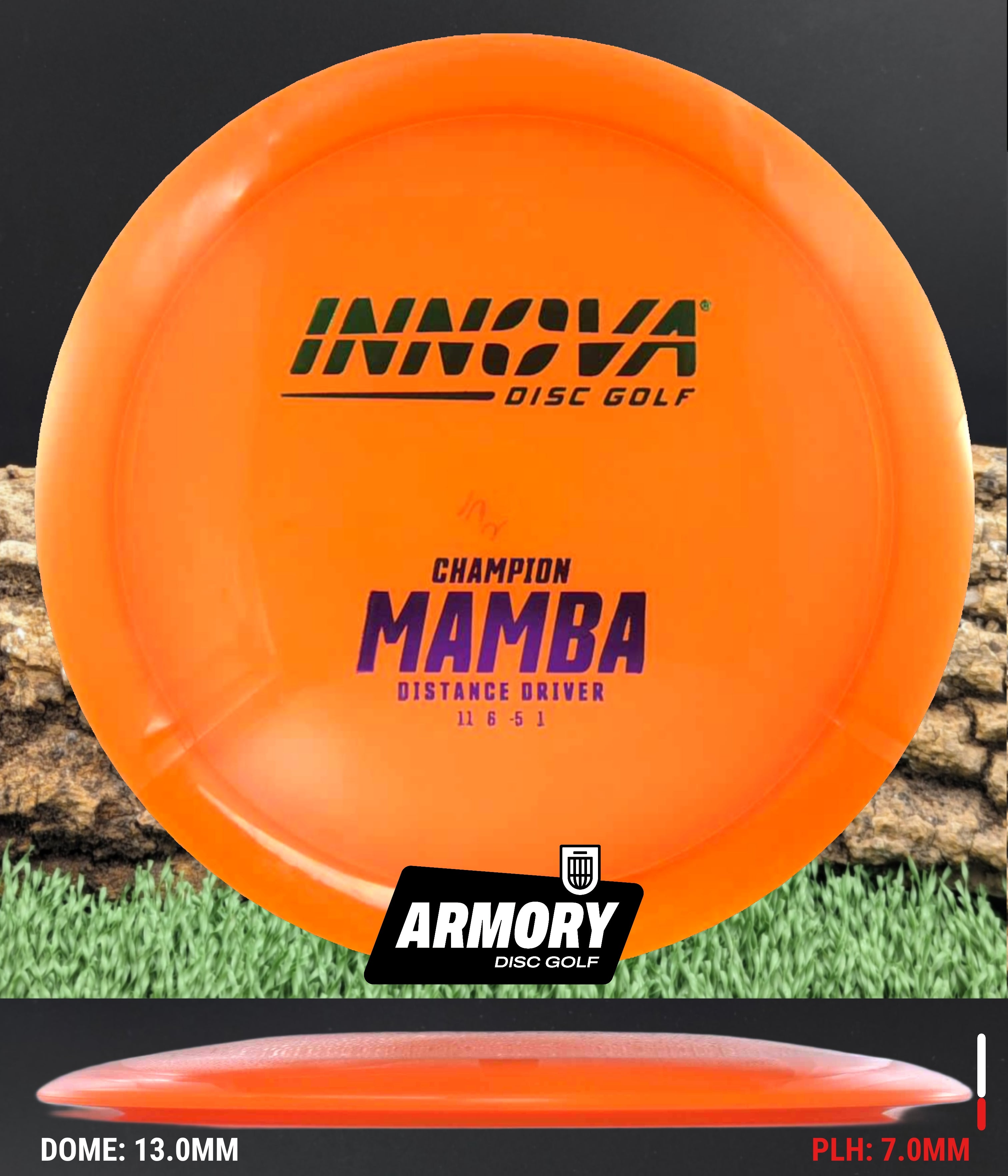 The Innova Champion Mamba is designed for effortless distance, long turnovers, and hyzer-flips. With flight numbers of 11 | 6 | -5 | 1, the Mamba is one of the most understable high-speed drivers in the Innova lineup—perfect for beginners learning distance or experienced players looking for rollers and massive turnovers.