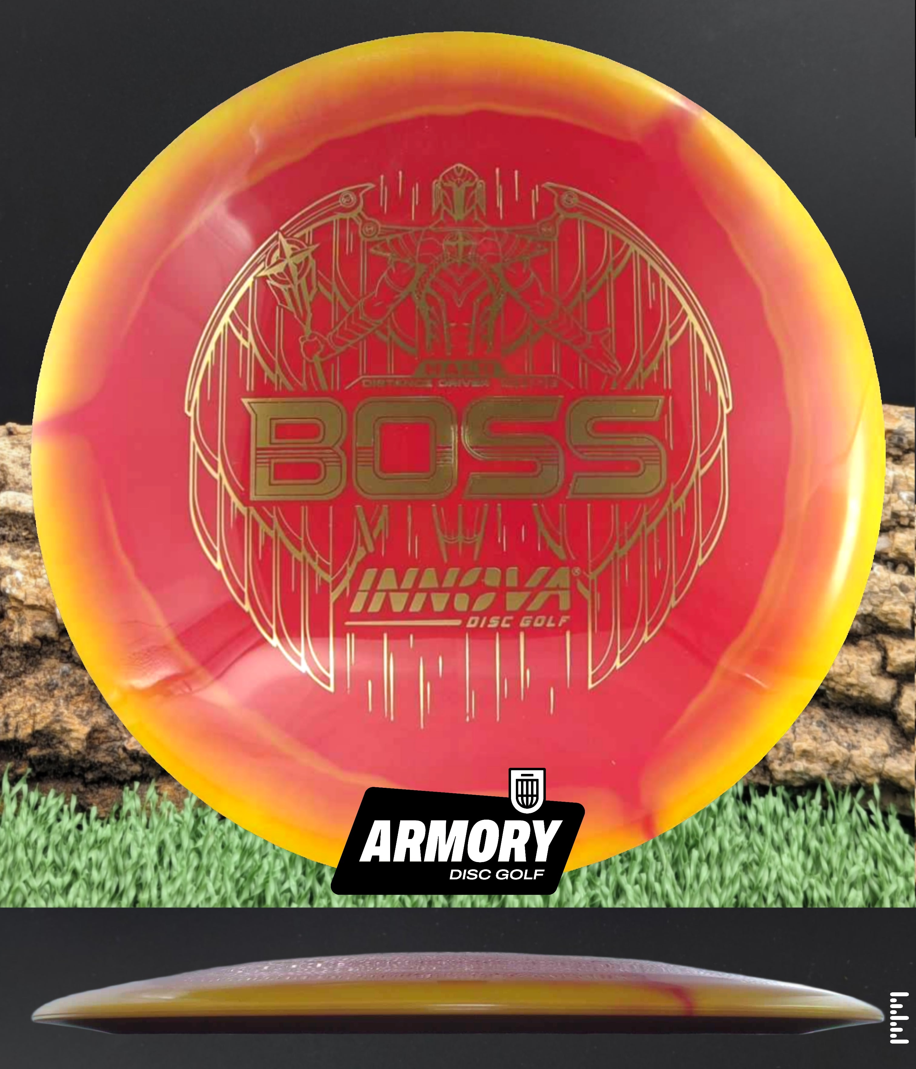 The Innova Boss is a fast stable driver that can handle full power throws and moderate headwinds, and advanced players and sidearm throwers will appreciate the dependable stability. The Boss has a slight high speed turn to help maximize distance with a predictable fade.