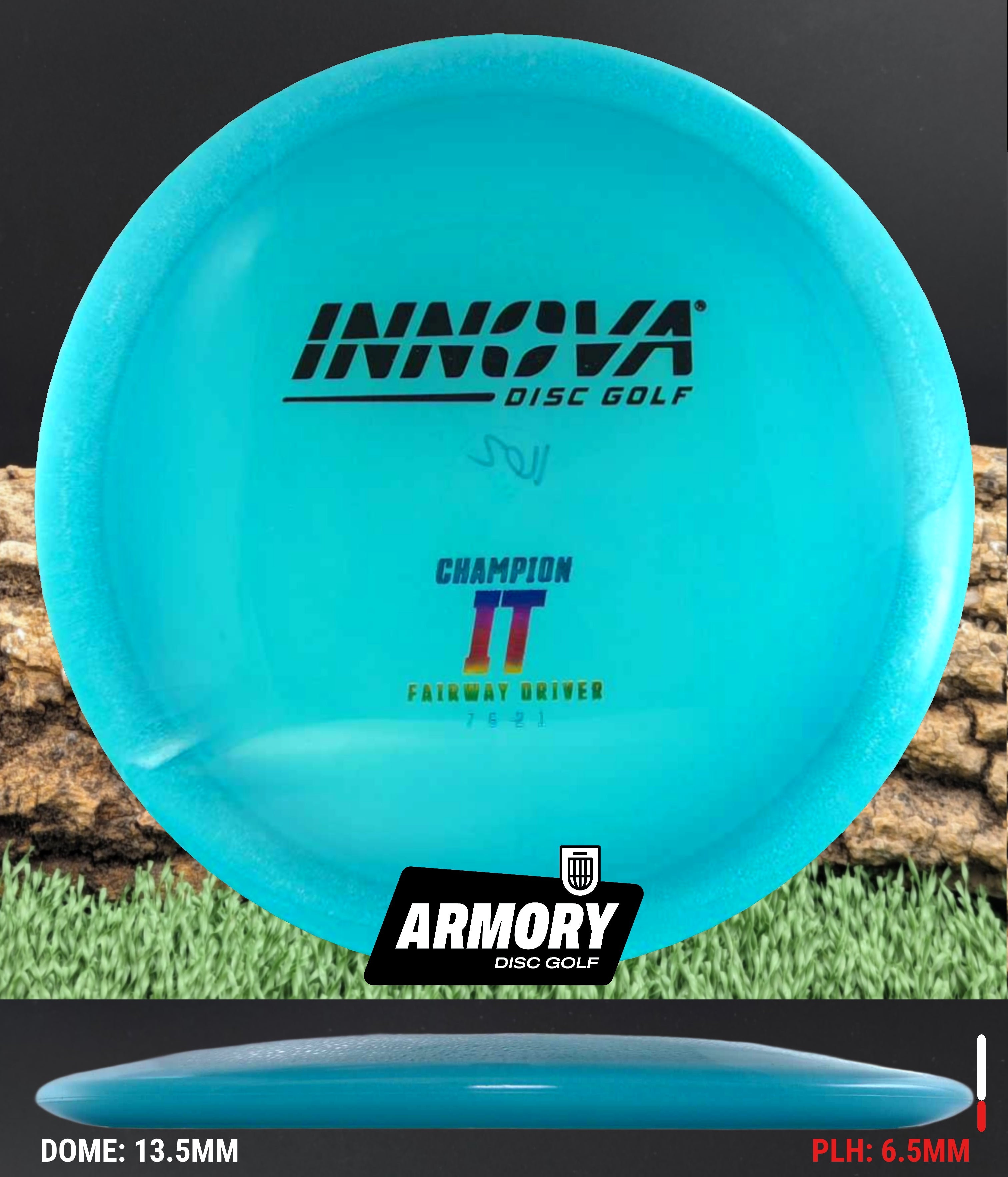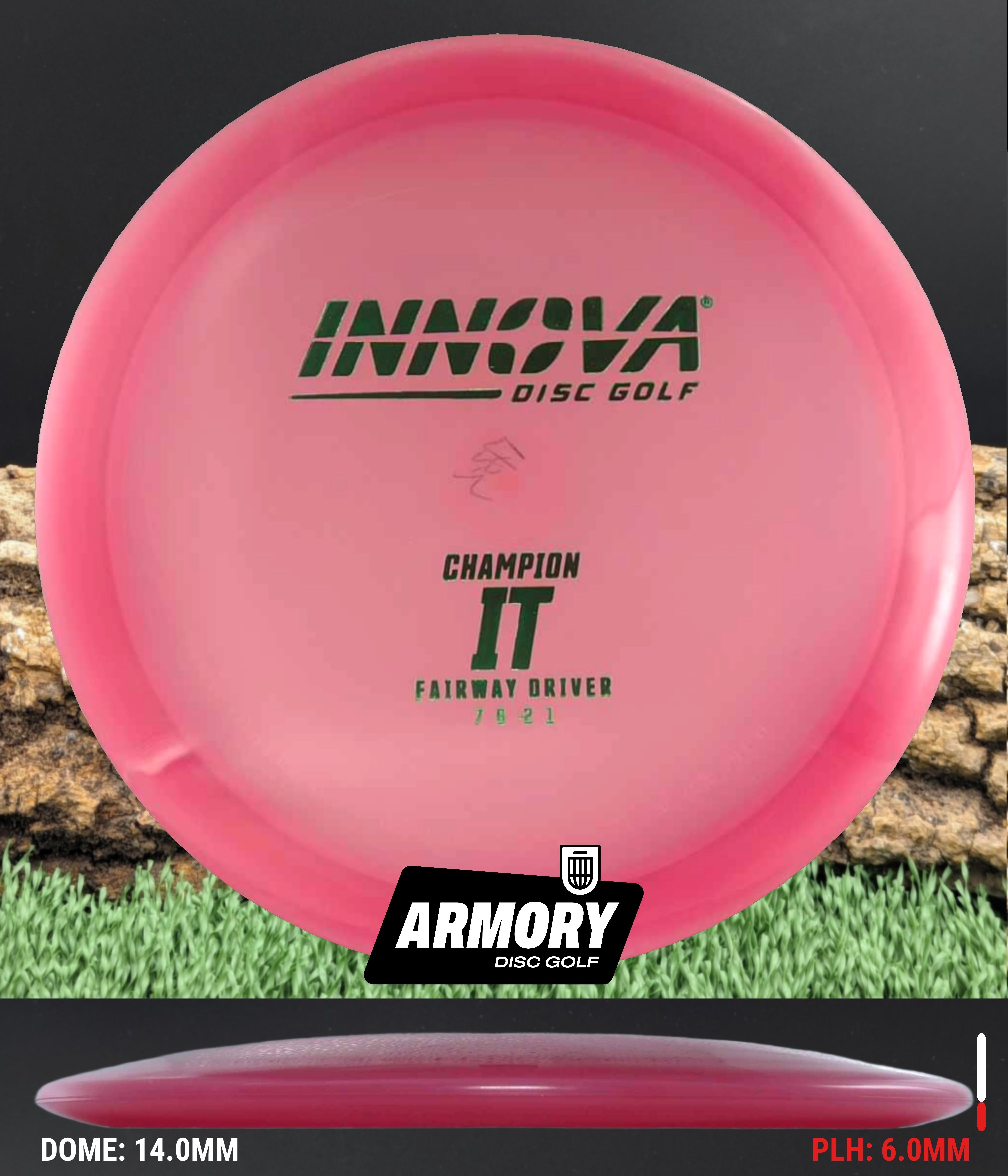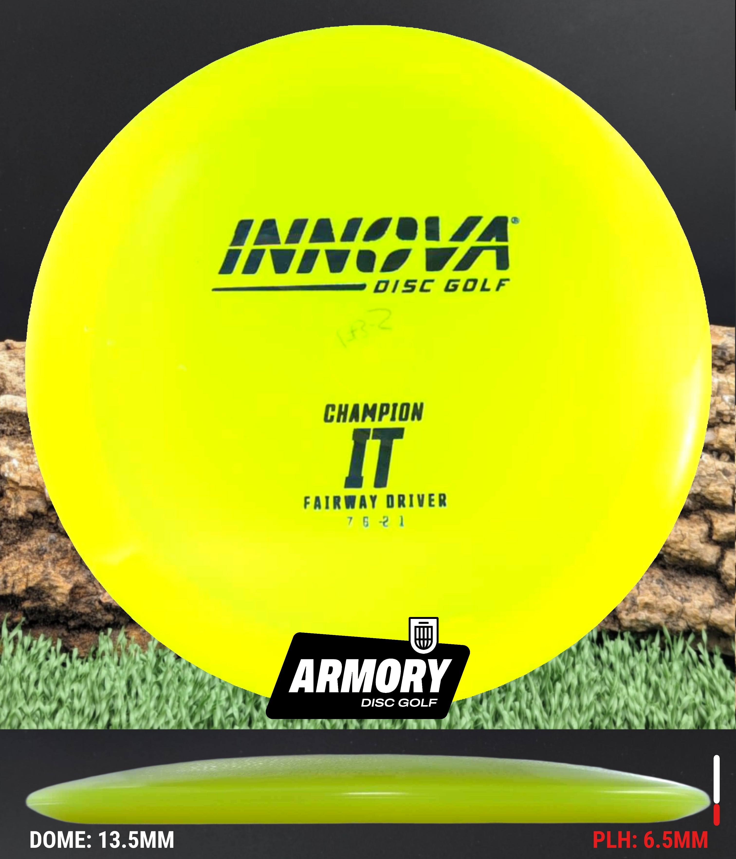The IT is a domey mold and has exceptional glide- these want to stay in the air and continue pushing forward when other discs would fade out and get to the ground. We recommend these for players with lower arm speeds or for those looking to add a turnover shot to their game.