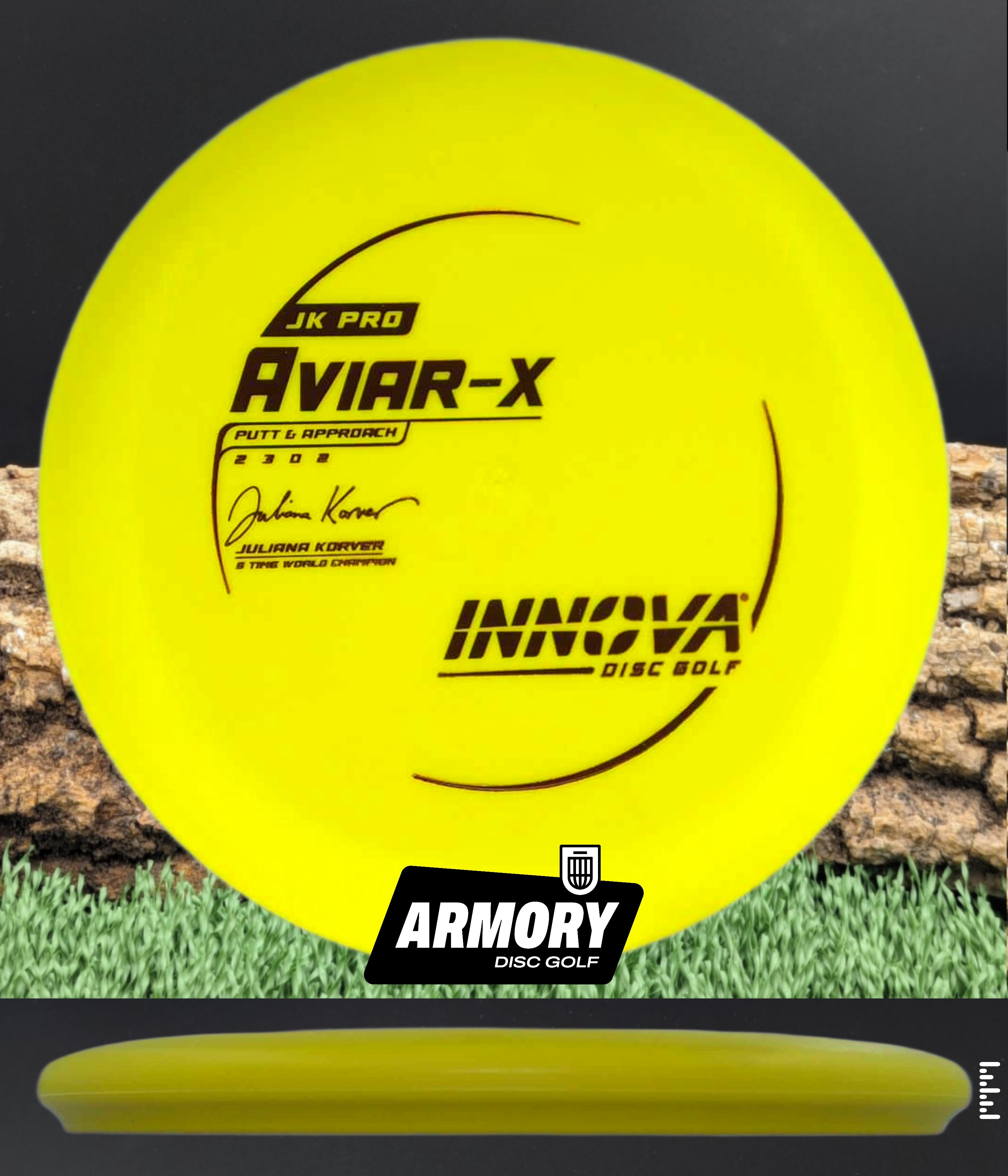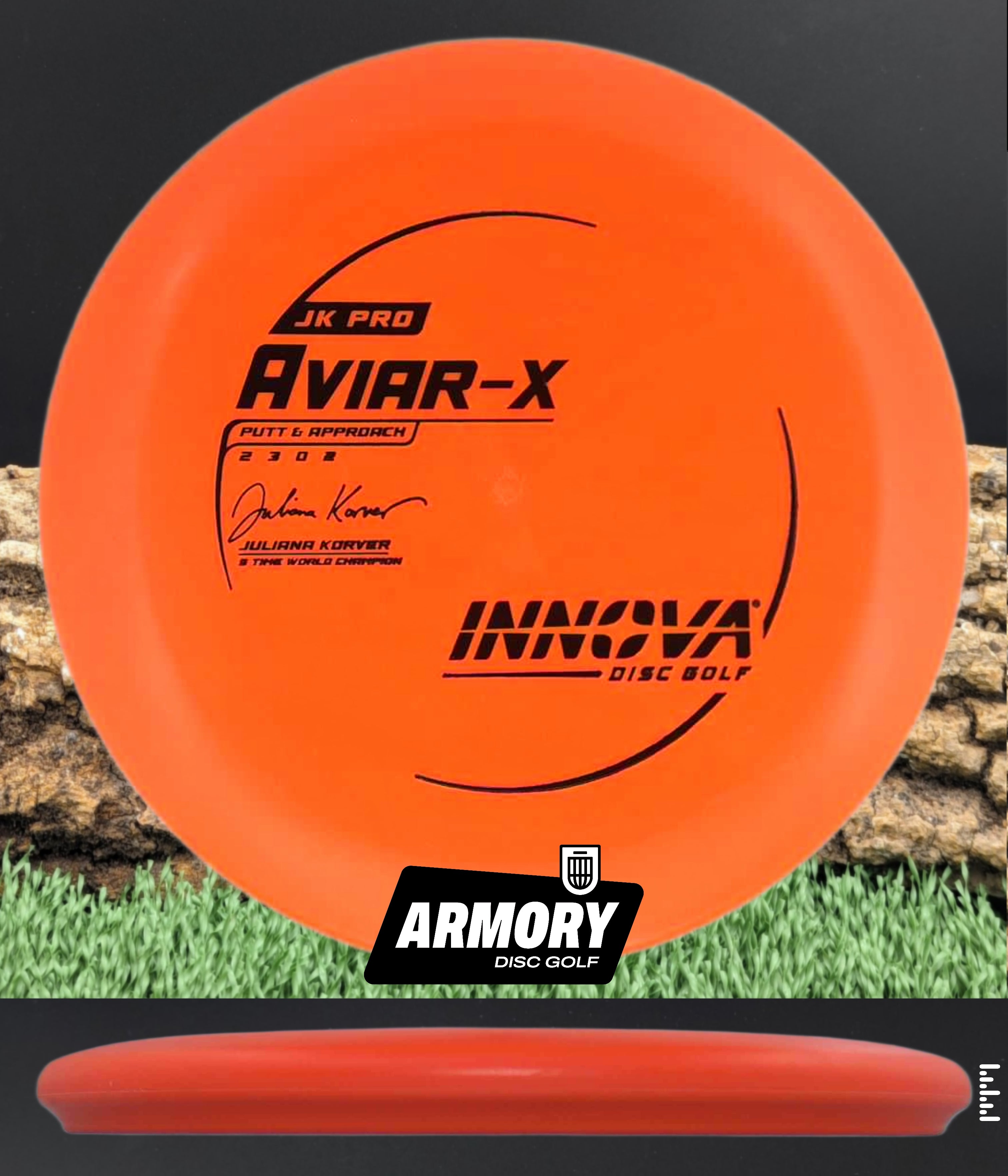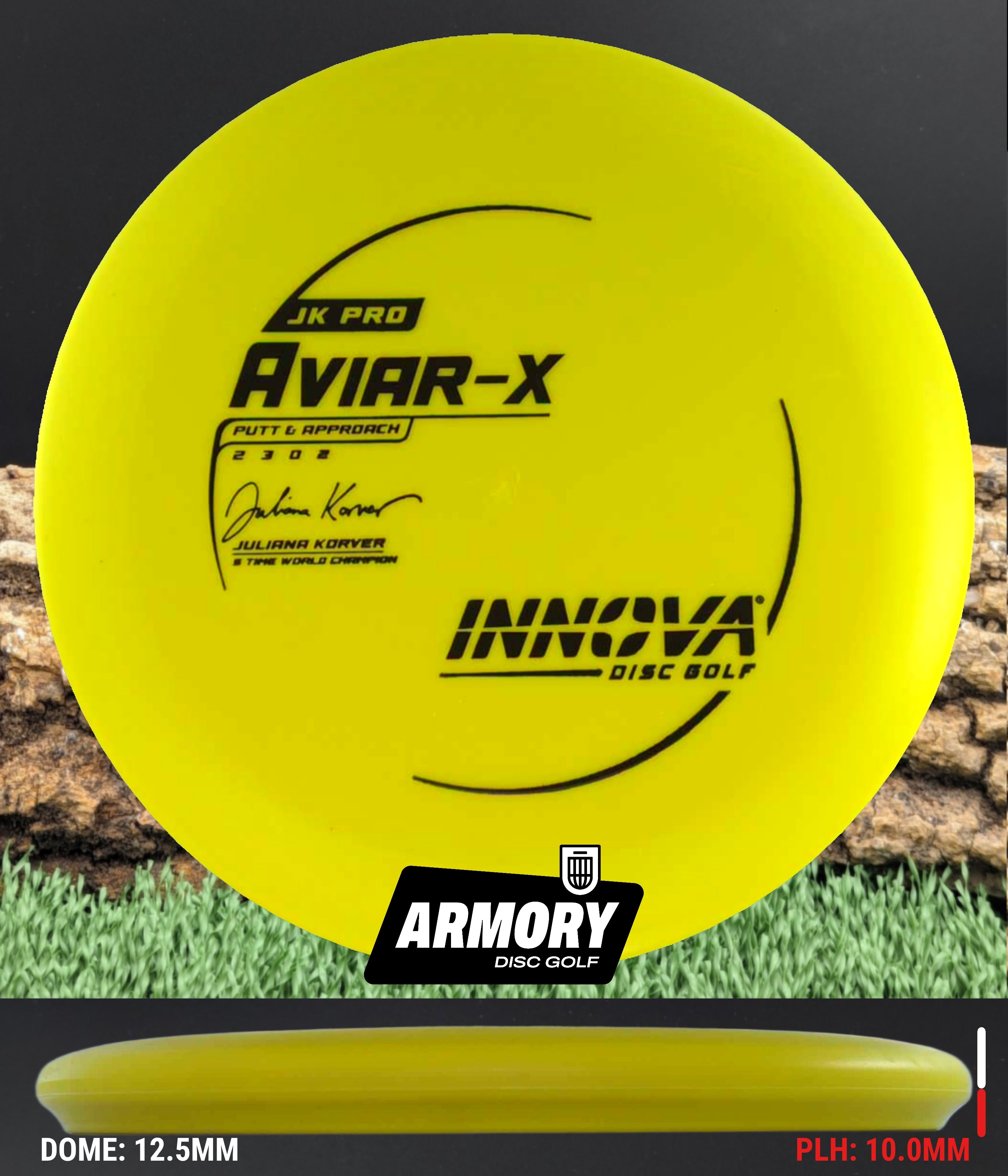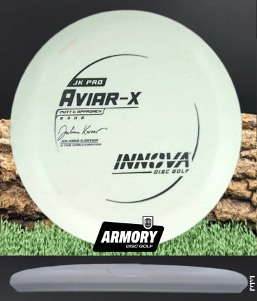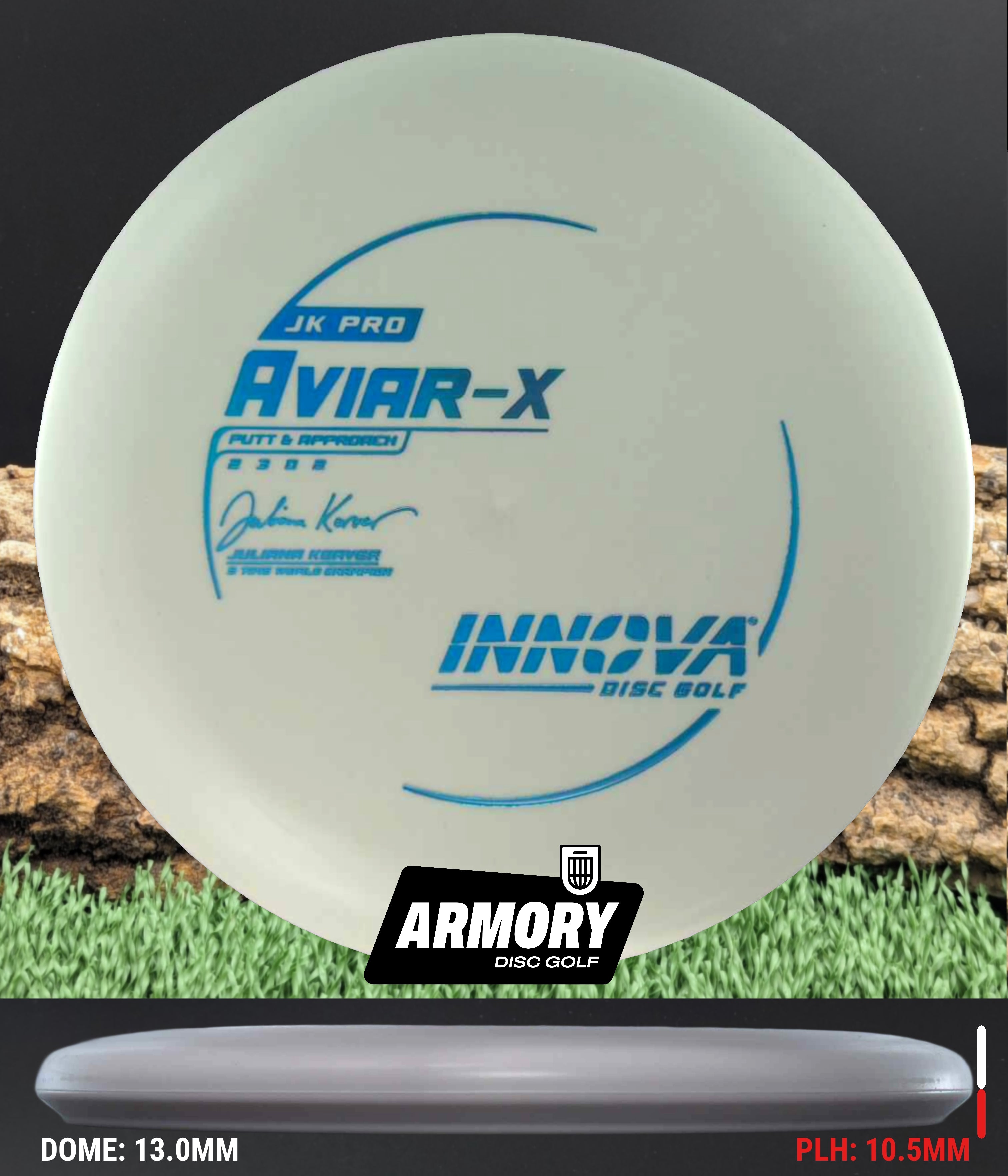 The JK (Juliana Korver) Aviar is made from the driver mold in a special blend of durable Pro-line Plastic that is more flexible and grippier than the other Aviar models. It has the same flight characteristics as the KC Aviar. Its softer plastic is better in colder climates and for those who have dry hands and require a tackier grip.