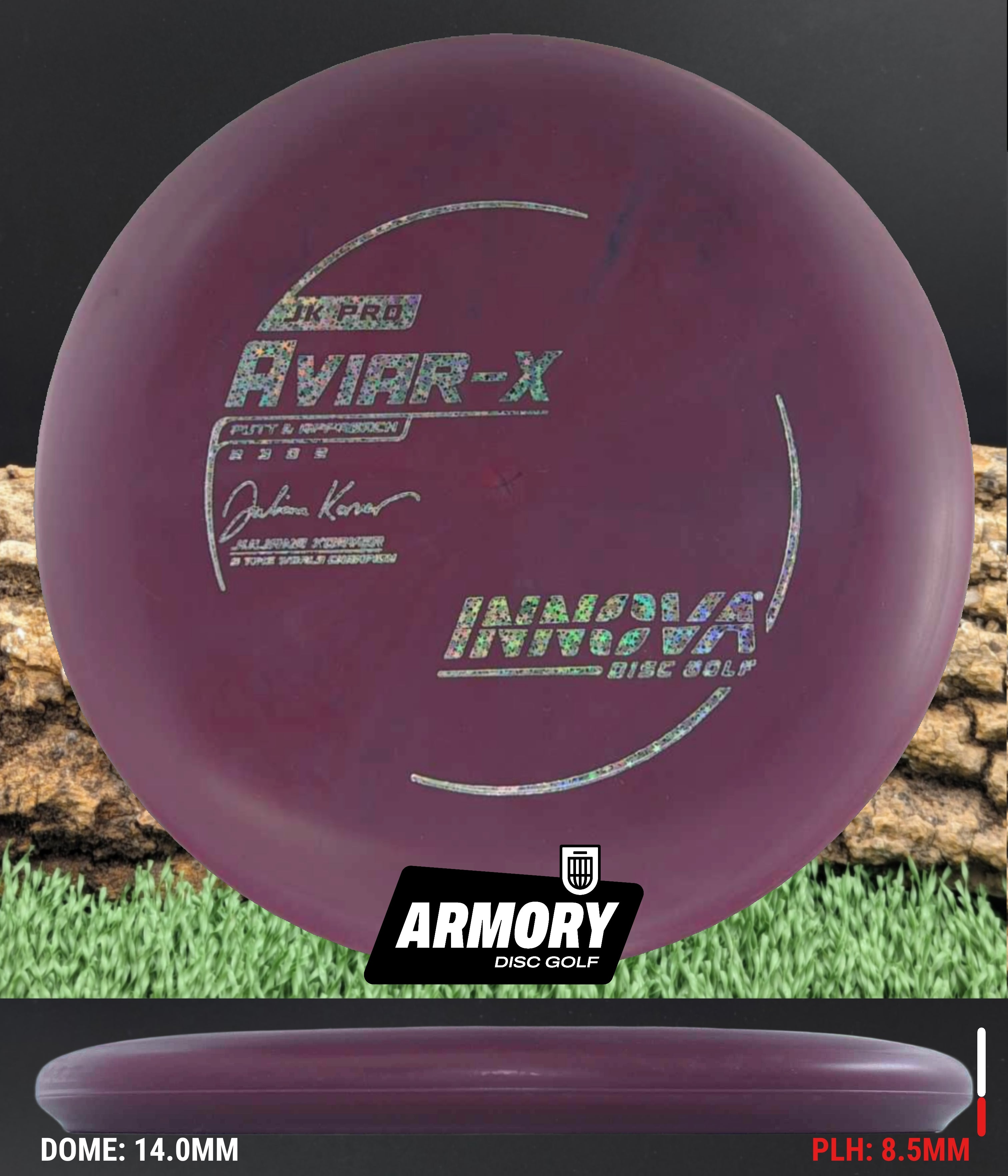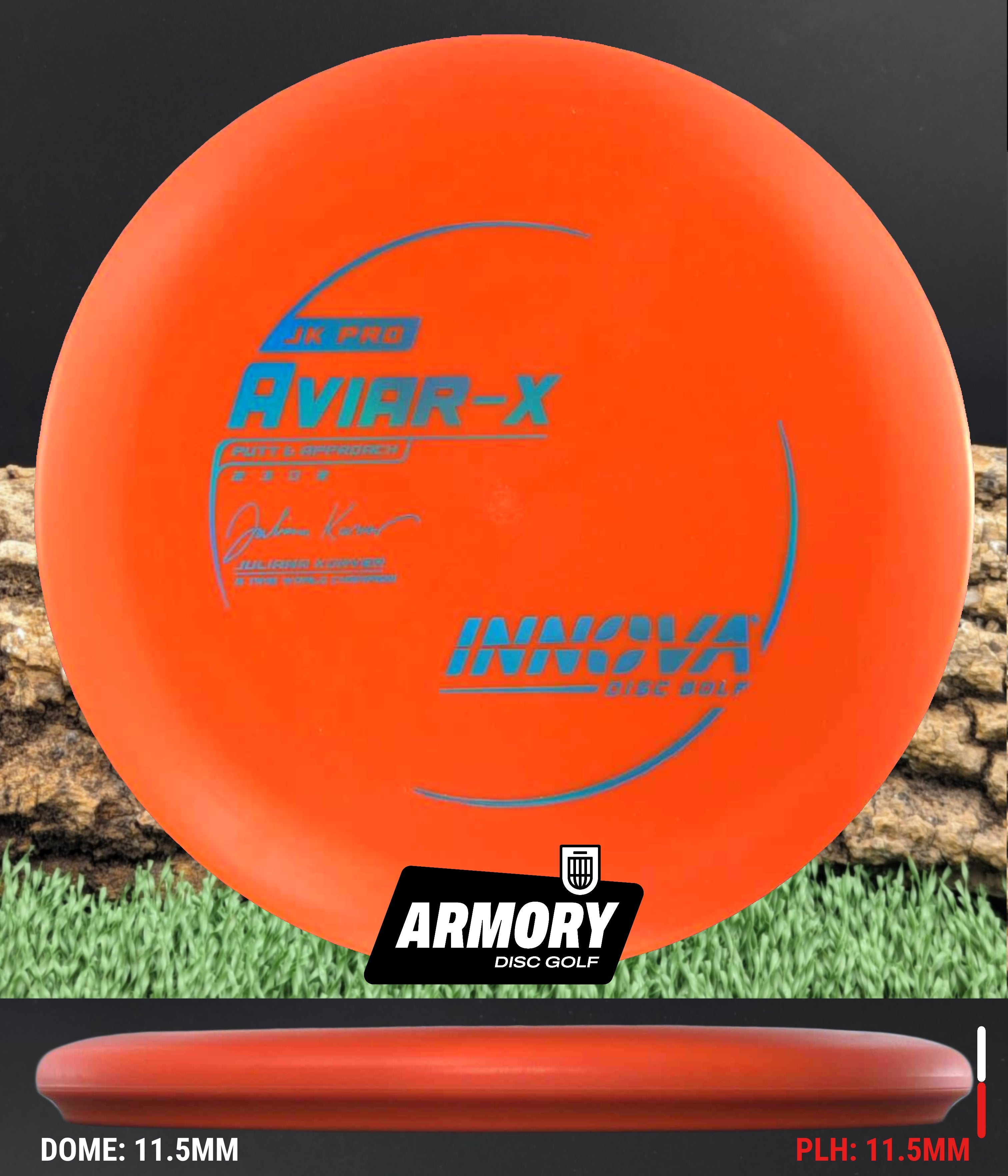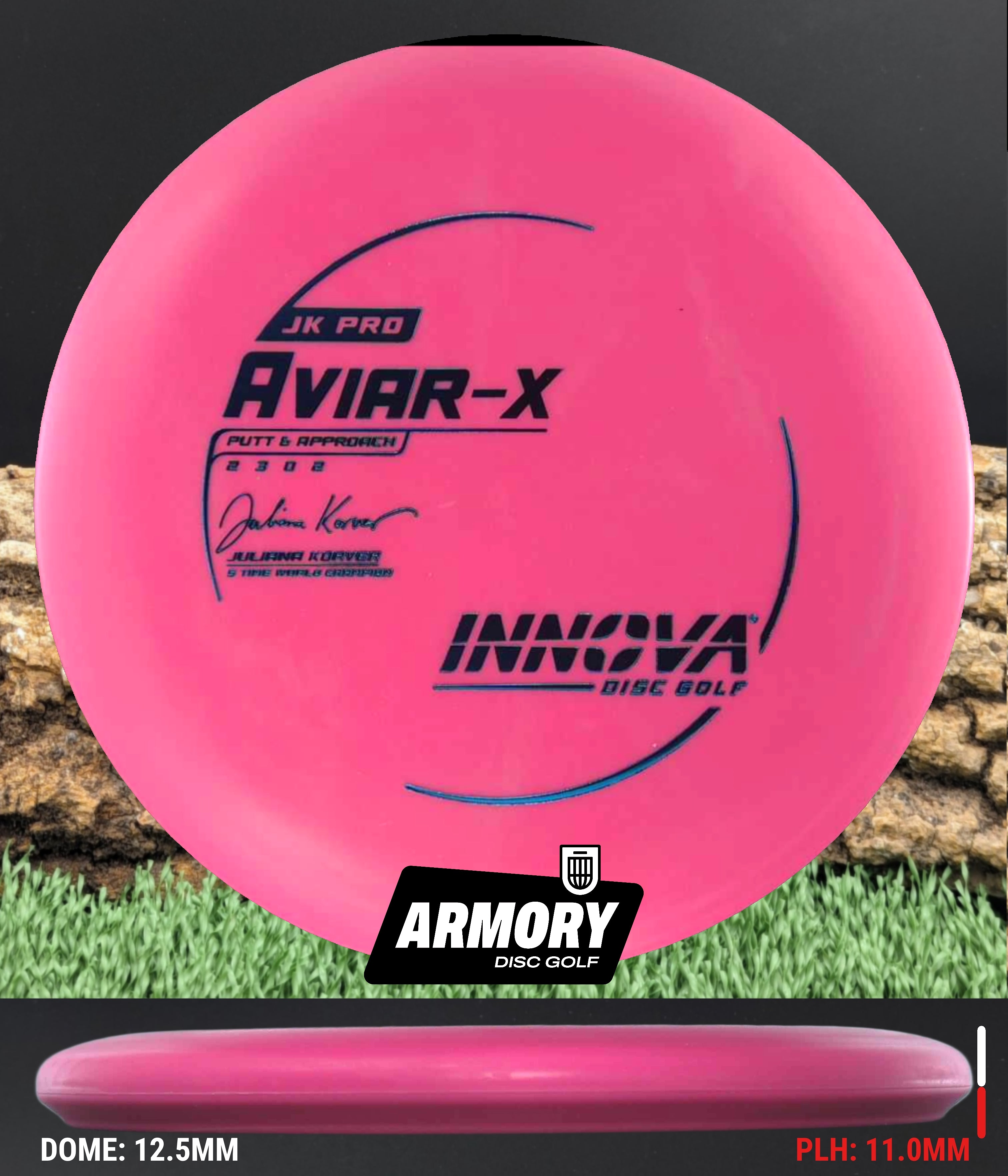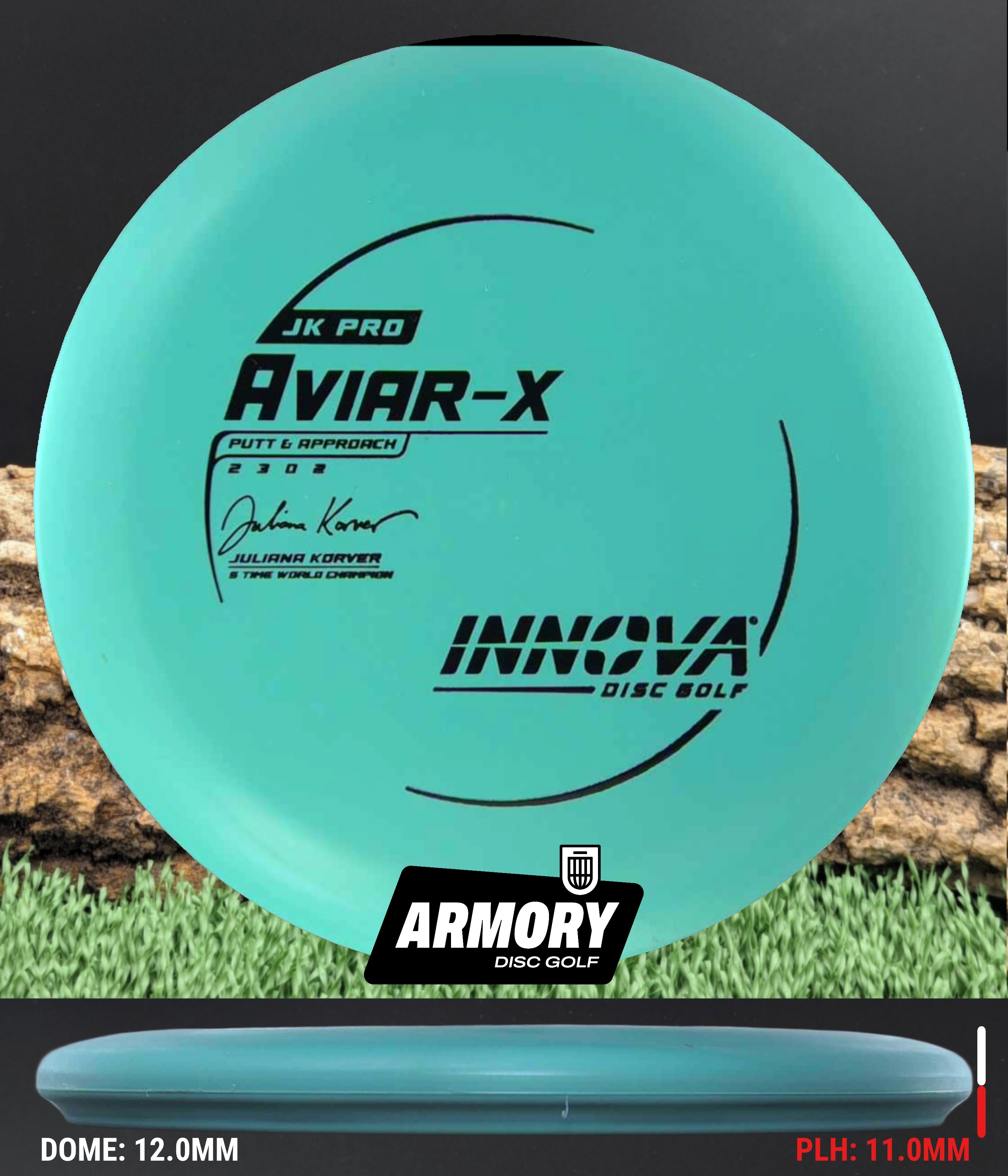 The JK (Juliana Korver) Aviar is made from the driver mold in a special blend of durable Pro-line Plastic that is more flexible and grippier than the other Aviar models. It has the same flight characteristics as the KC Aviar. Its softer plastic is better in colder climates and for those who have dry hands and require a tackier grip.