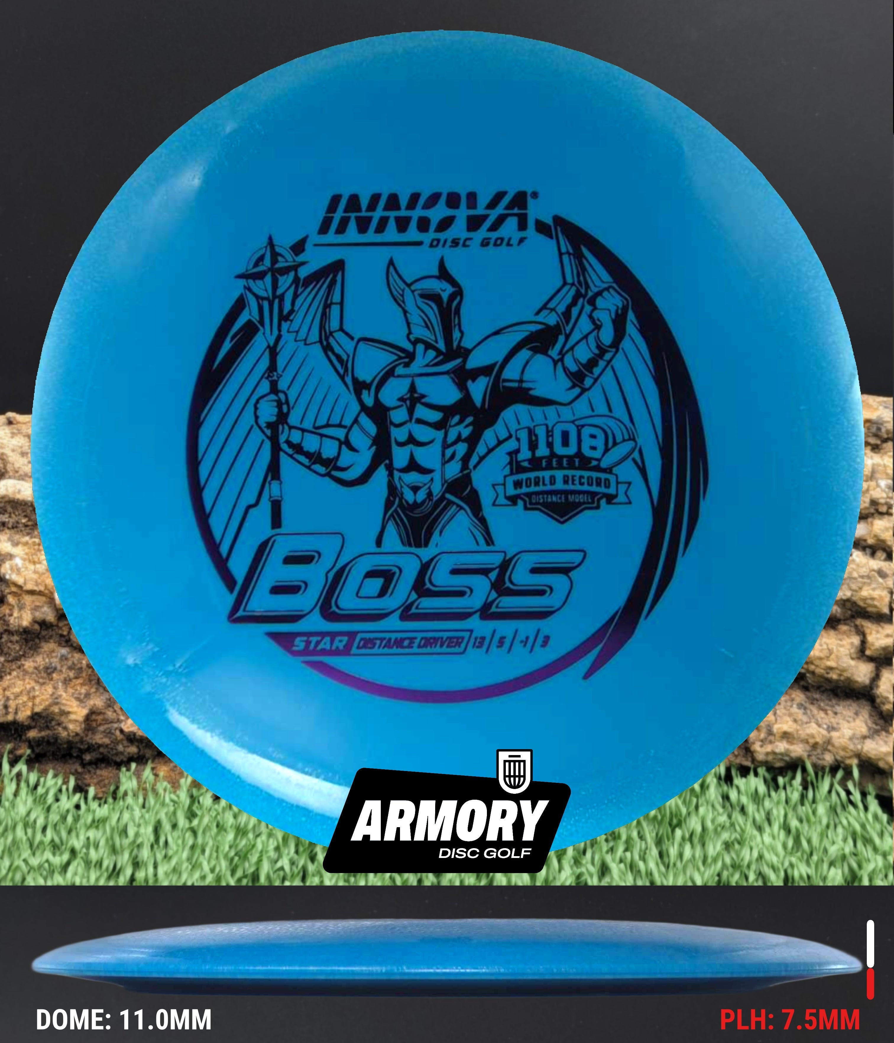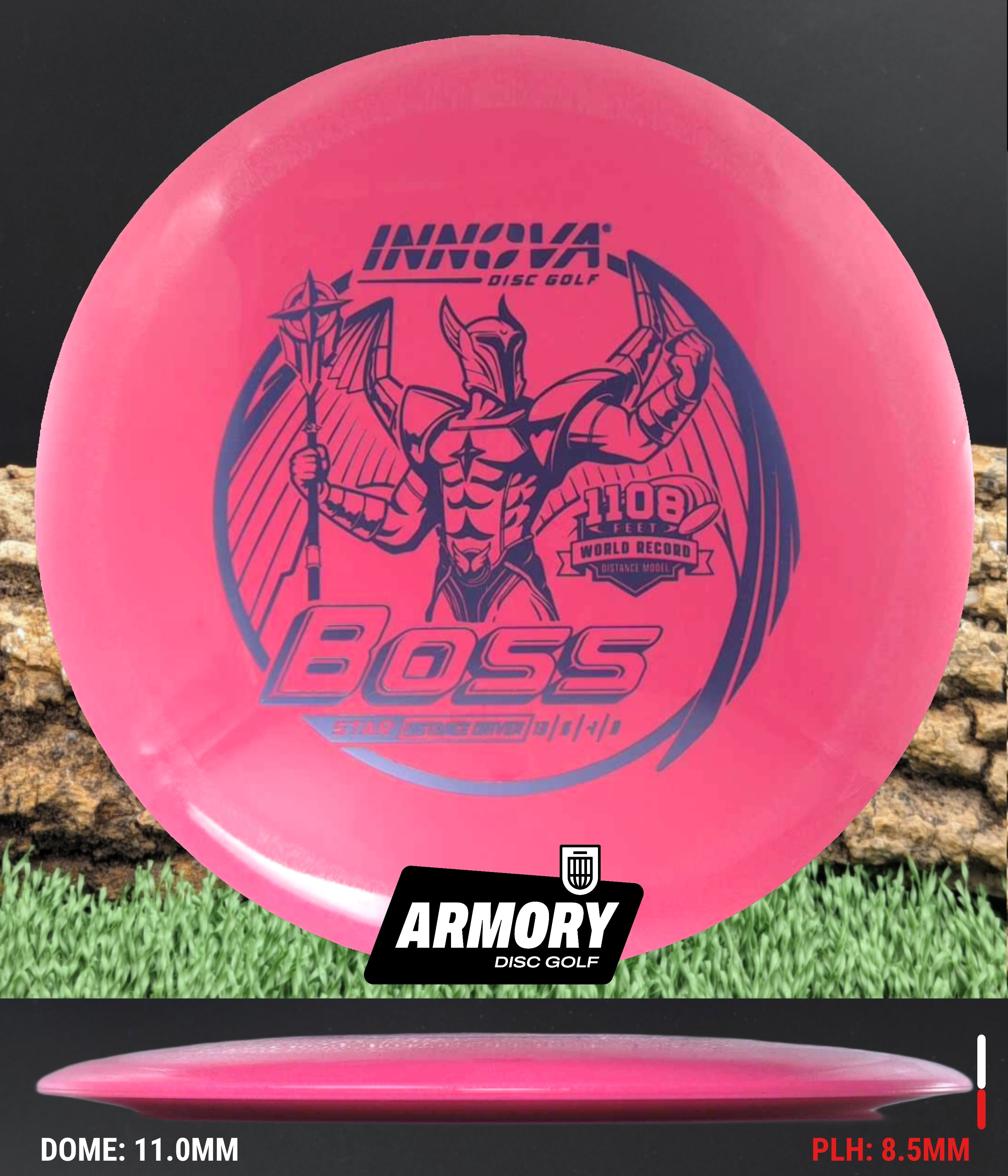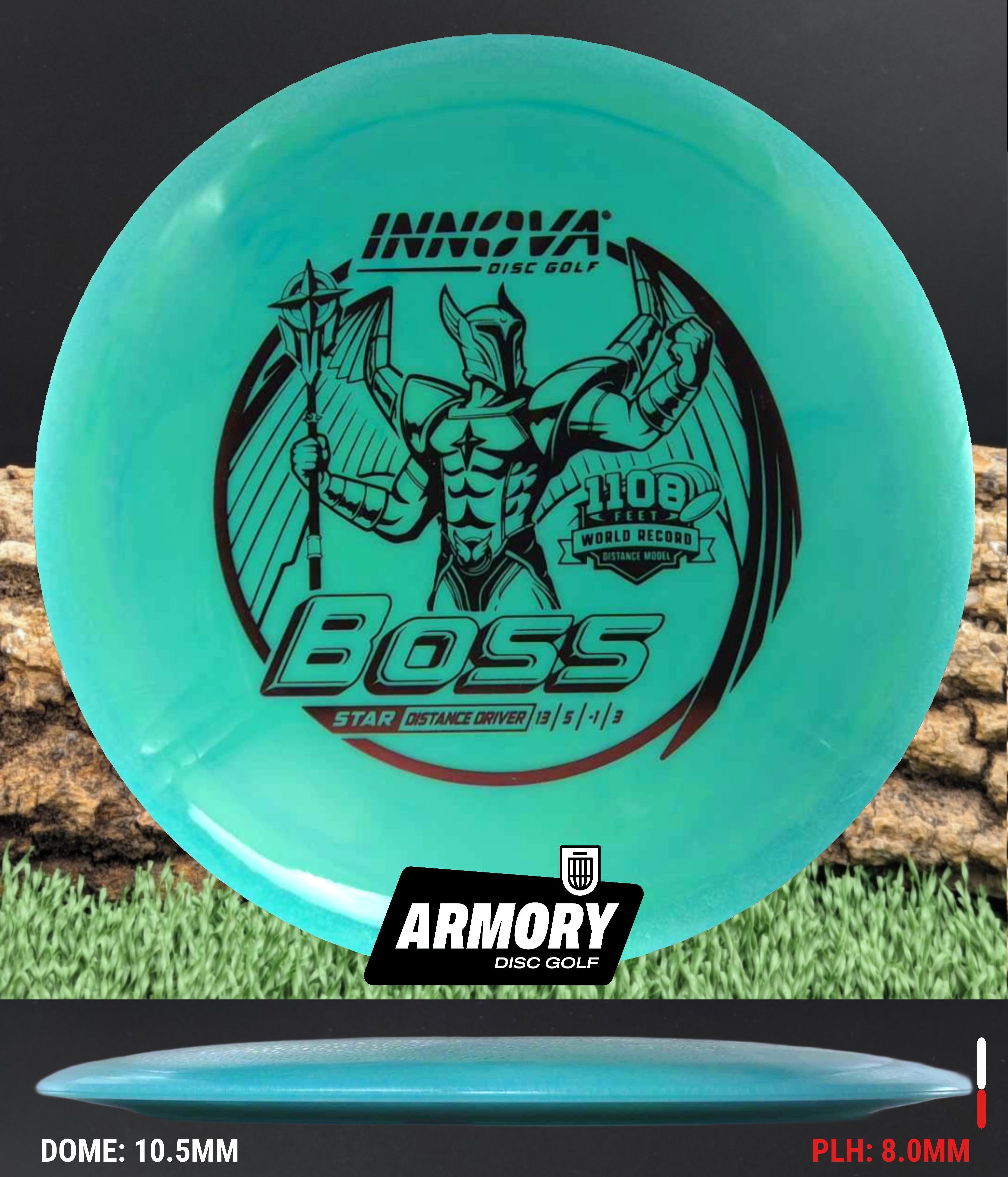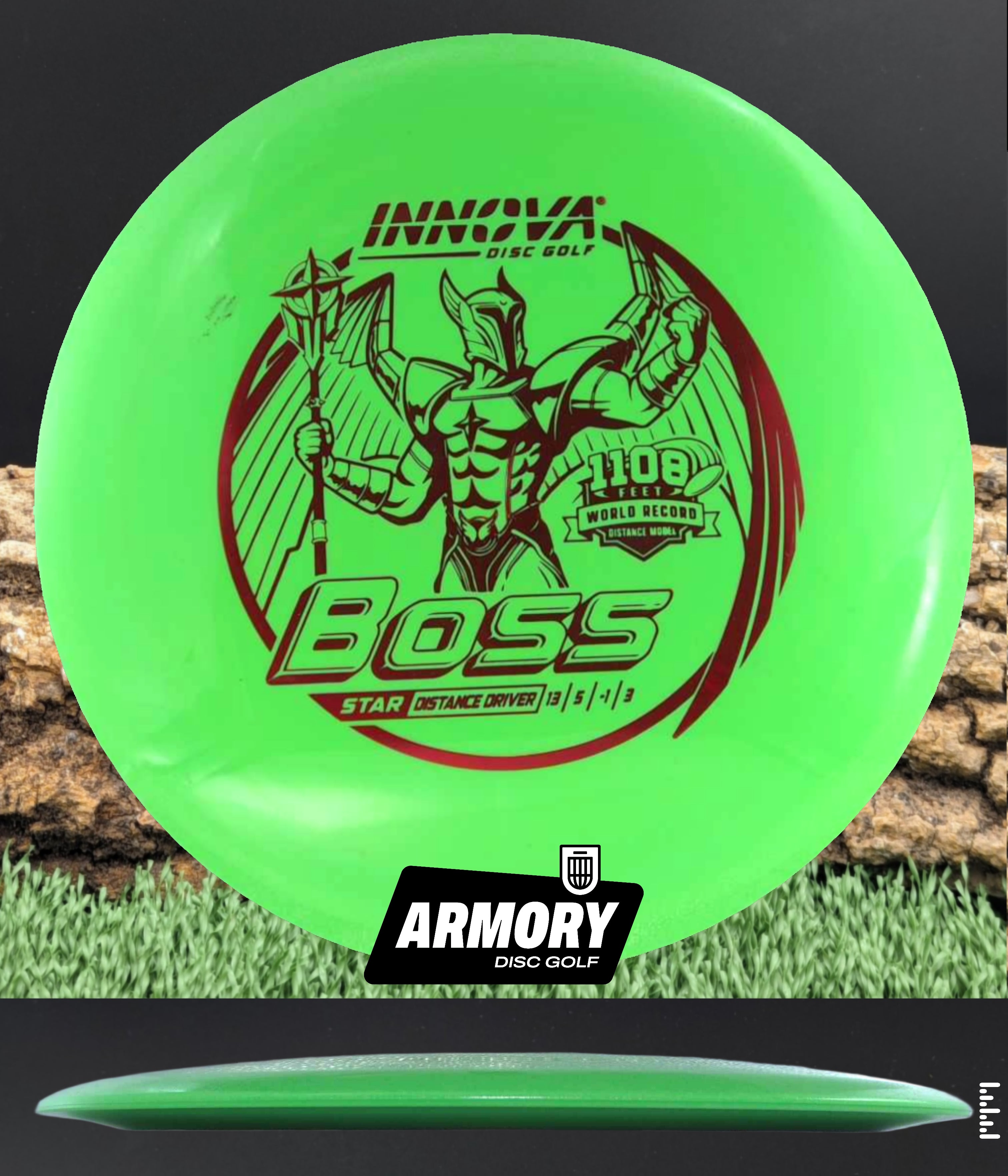 The Innova Boss is a fast stable driver that can handle full power throws and moderate headwinds, and advanced players and sidearm throwers will appreciate the dependable stability. The Boss has a slight high speed turn to help maximize distance with a predictable fade.