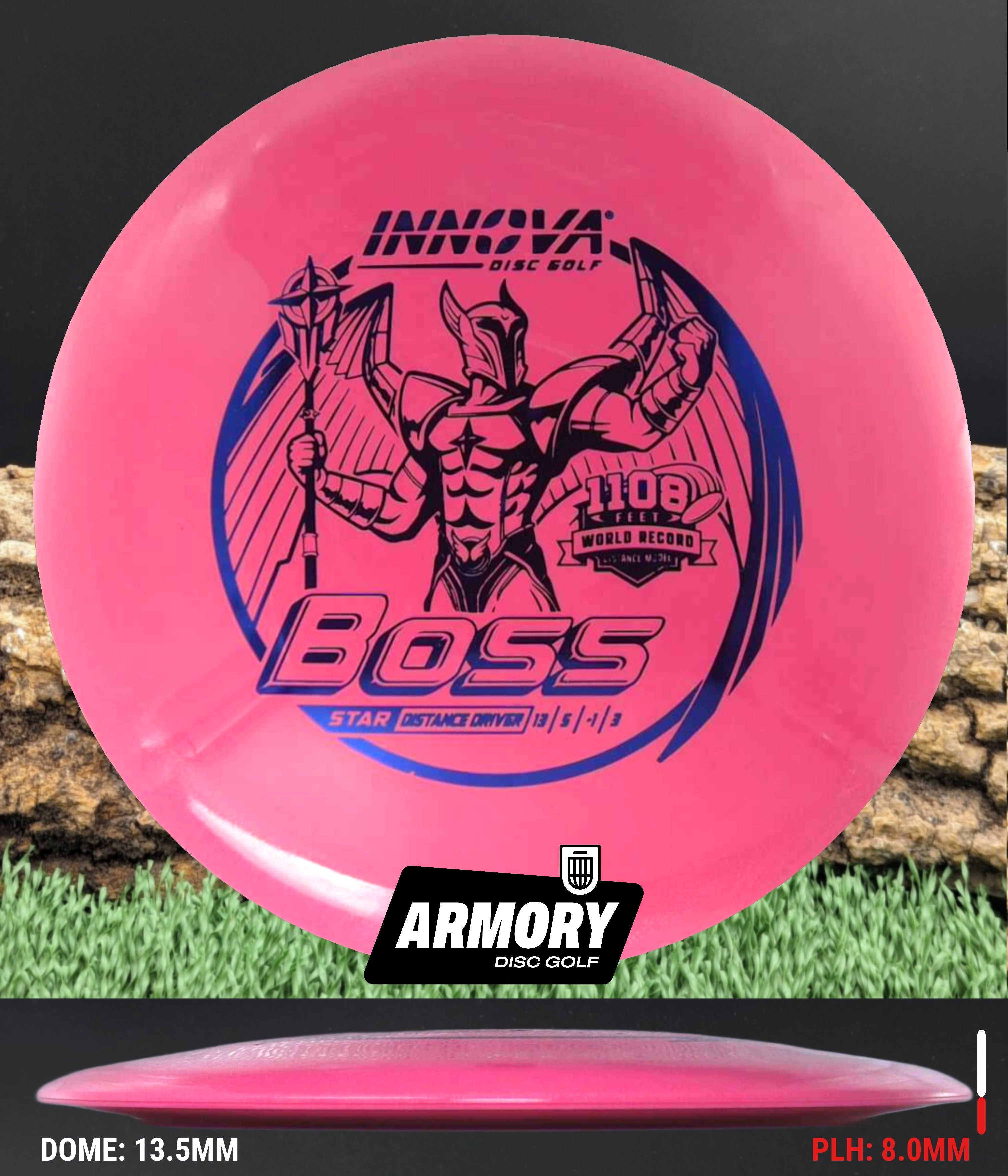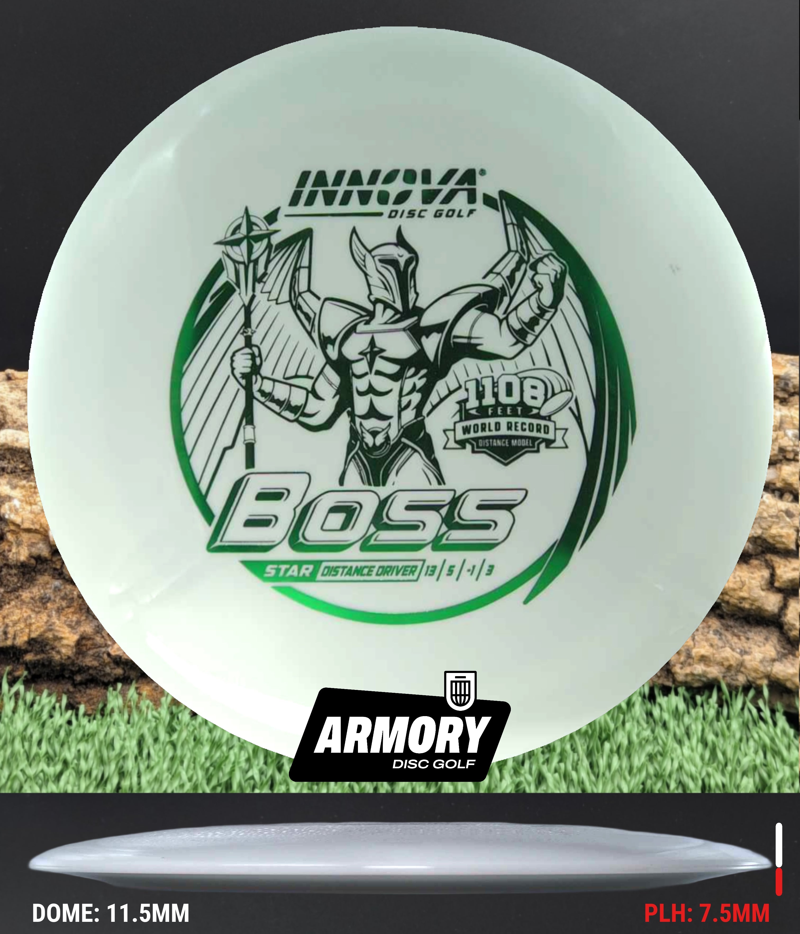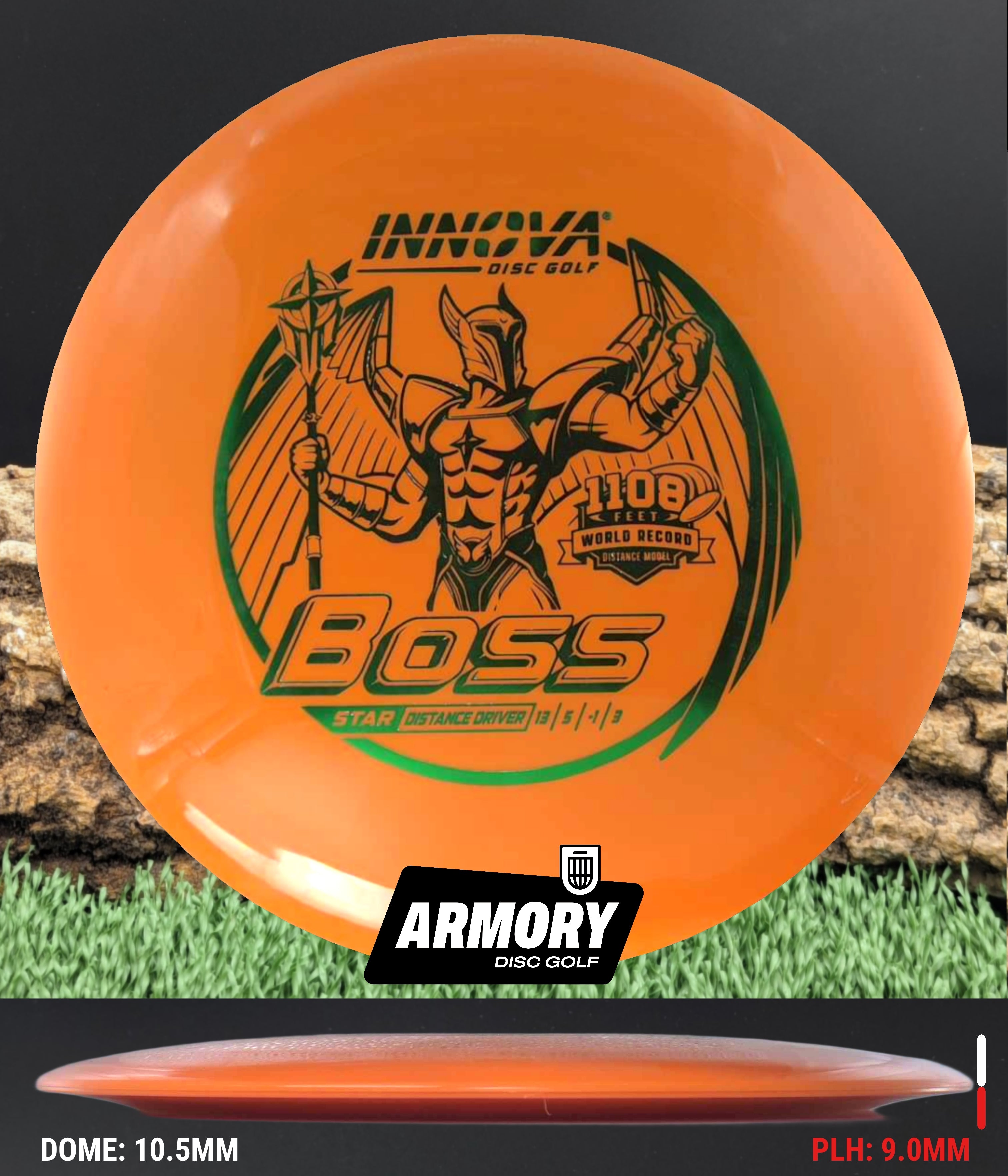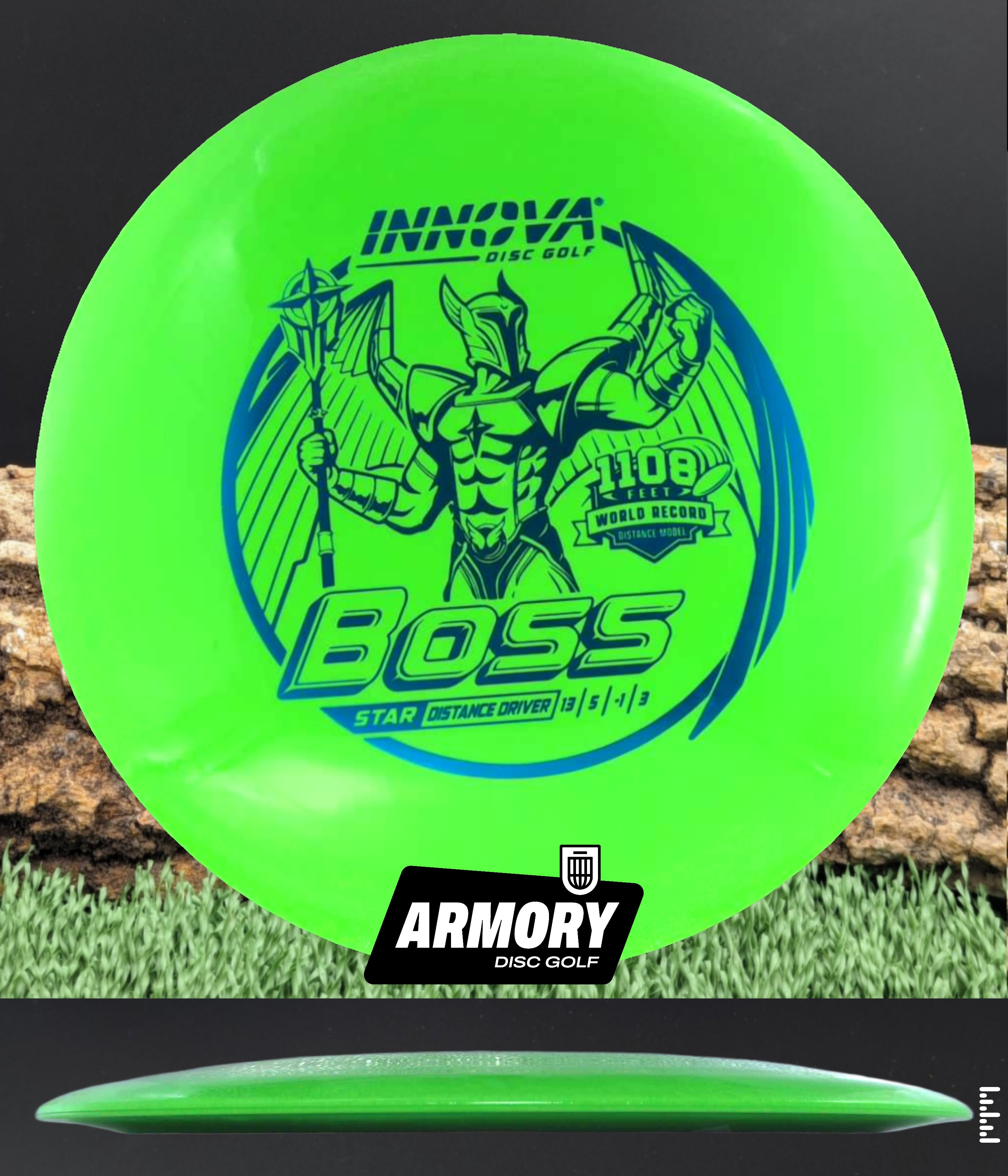 The Innova Boss is a fast stable driver that can handle full power throws and moderate headwinds, and advanced players and sidearm throwers will appreciate the dependable stability. The Boss has a slight high speed turn to help maximize distance with a predictable fade.