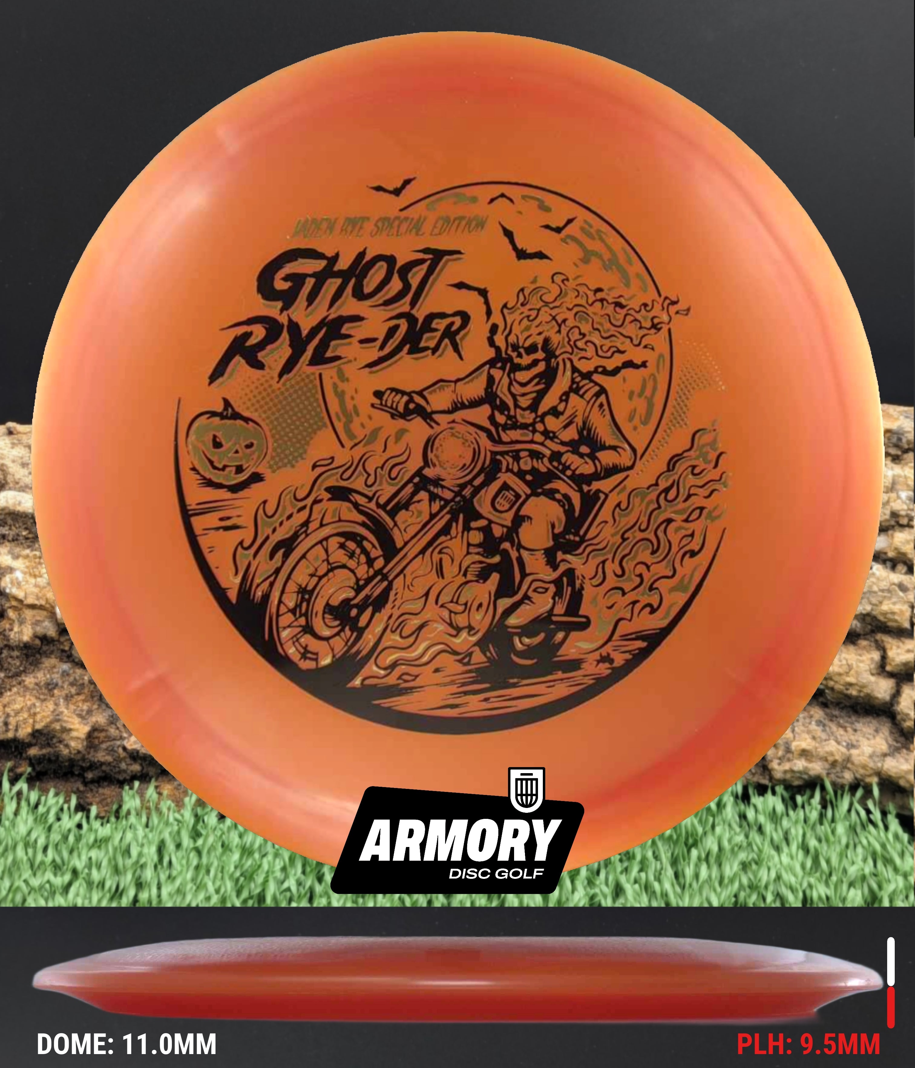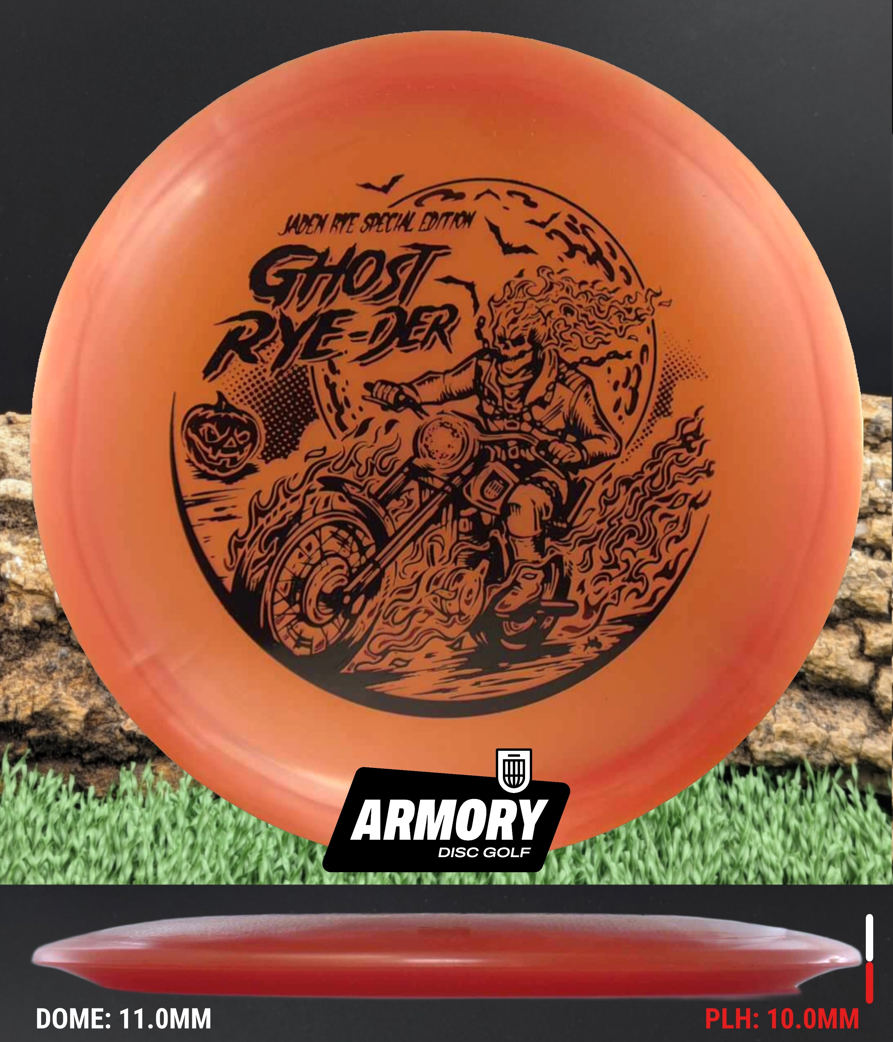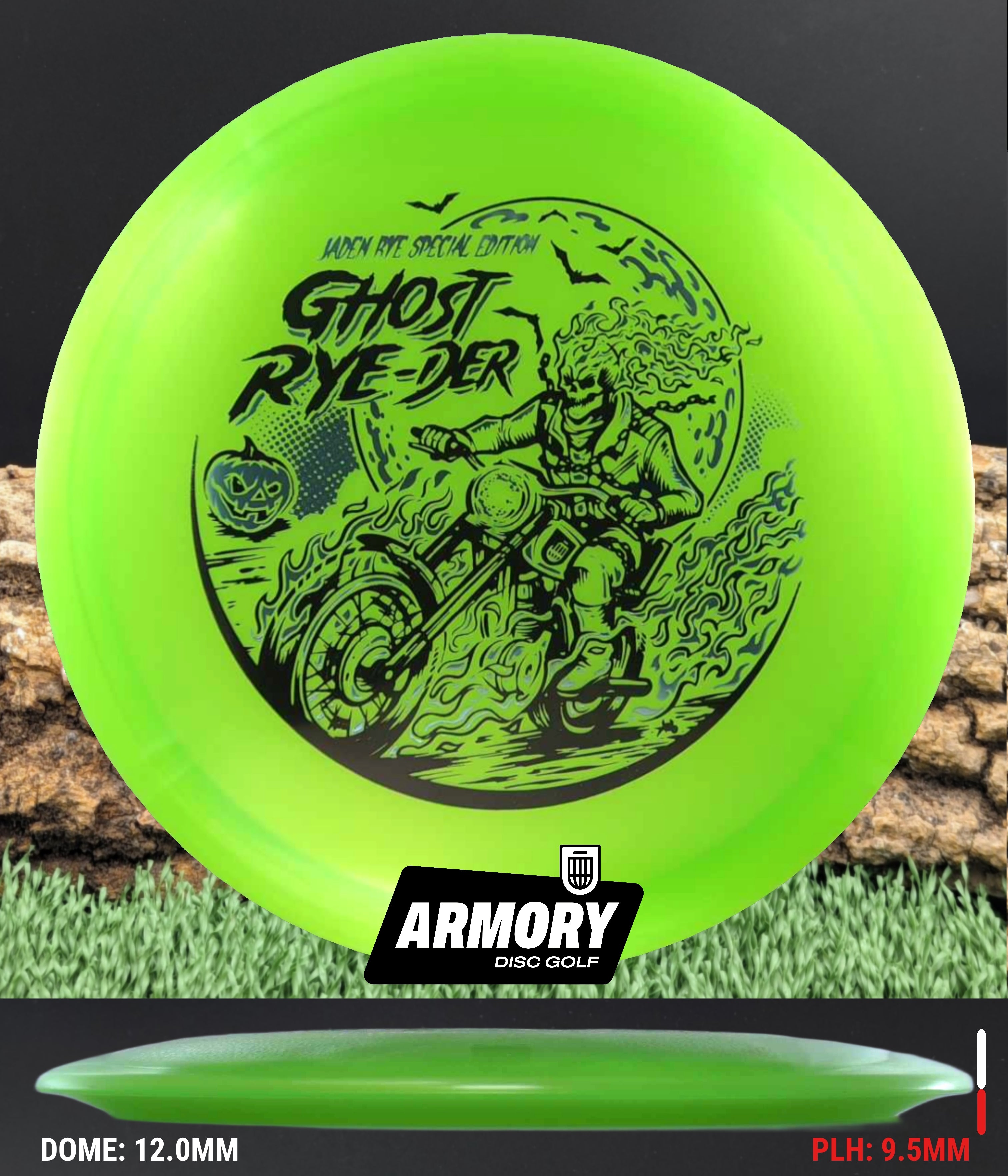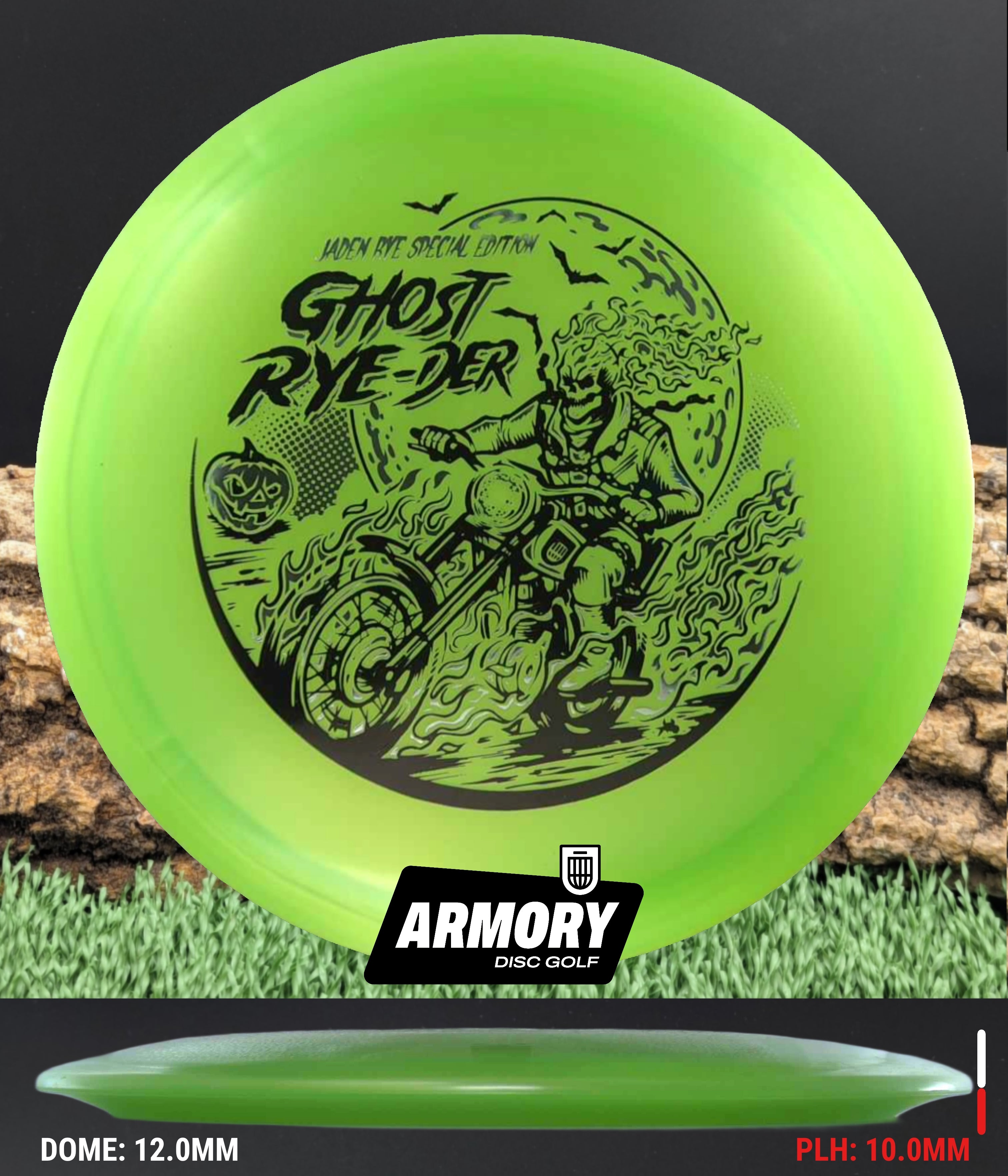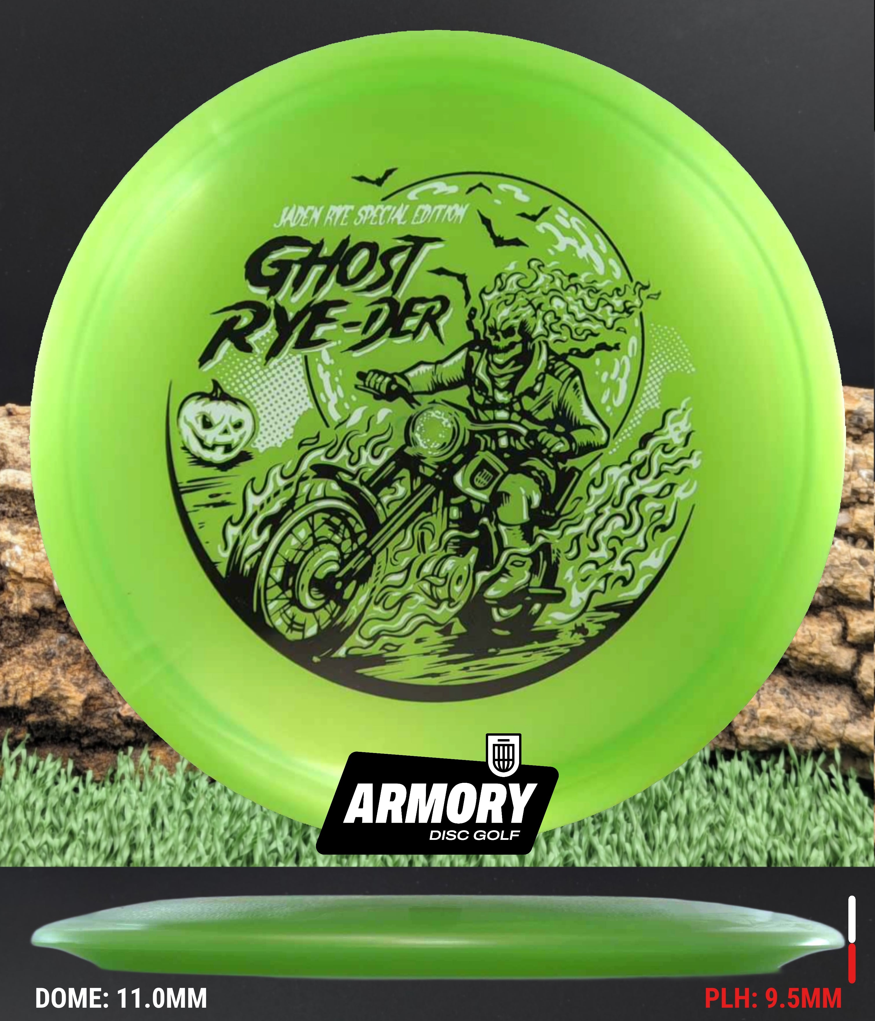 Speed meets accuracy. The Ghost Rye-der Teebird3 embodies Jaden Rye’s fearless precision — carving lines and attacking fairways. Kelly “KOB” Baber’s two-foil artwork of the flaming Ghost Rye-der mirrors that same relentless focus.