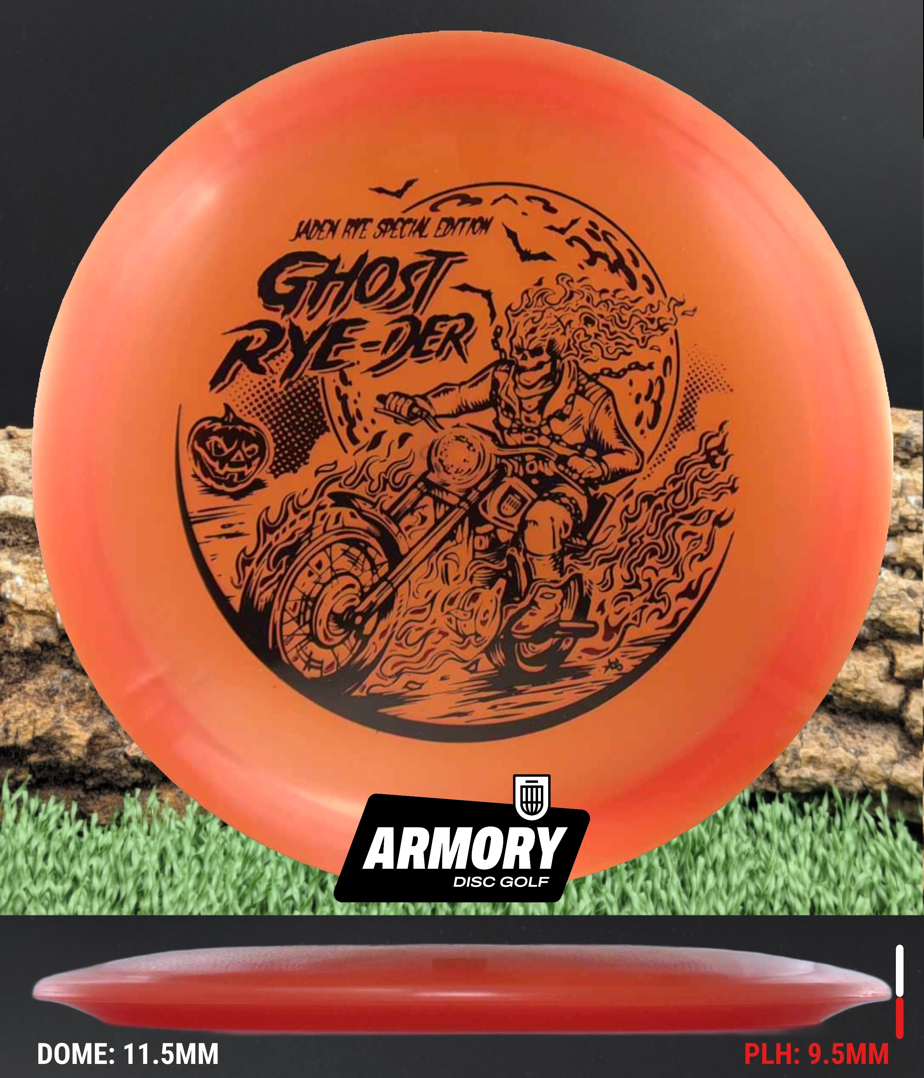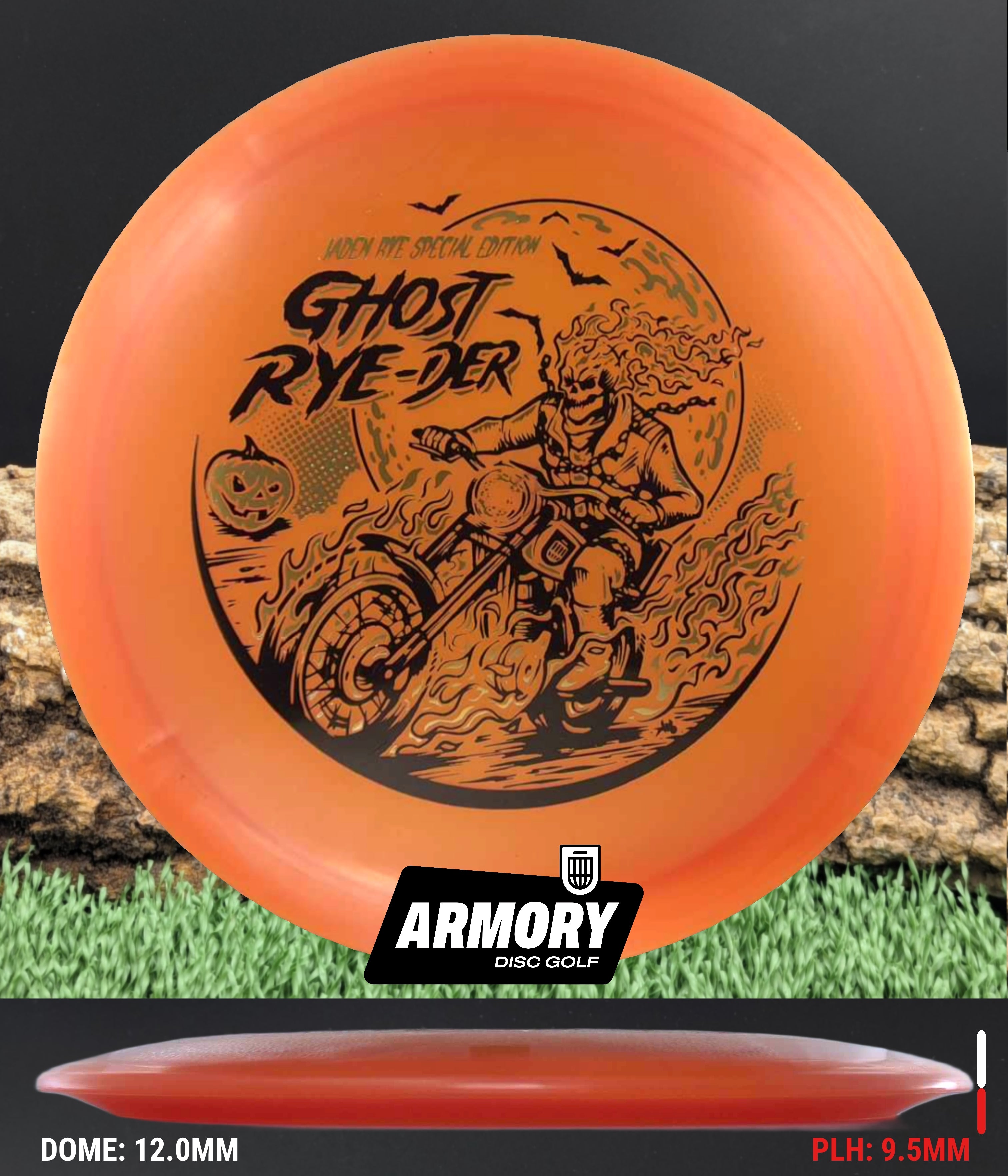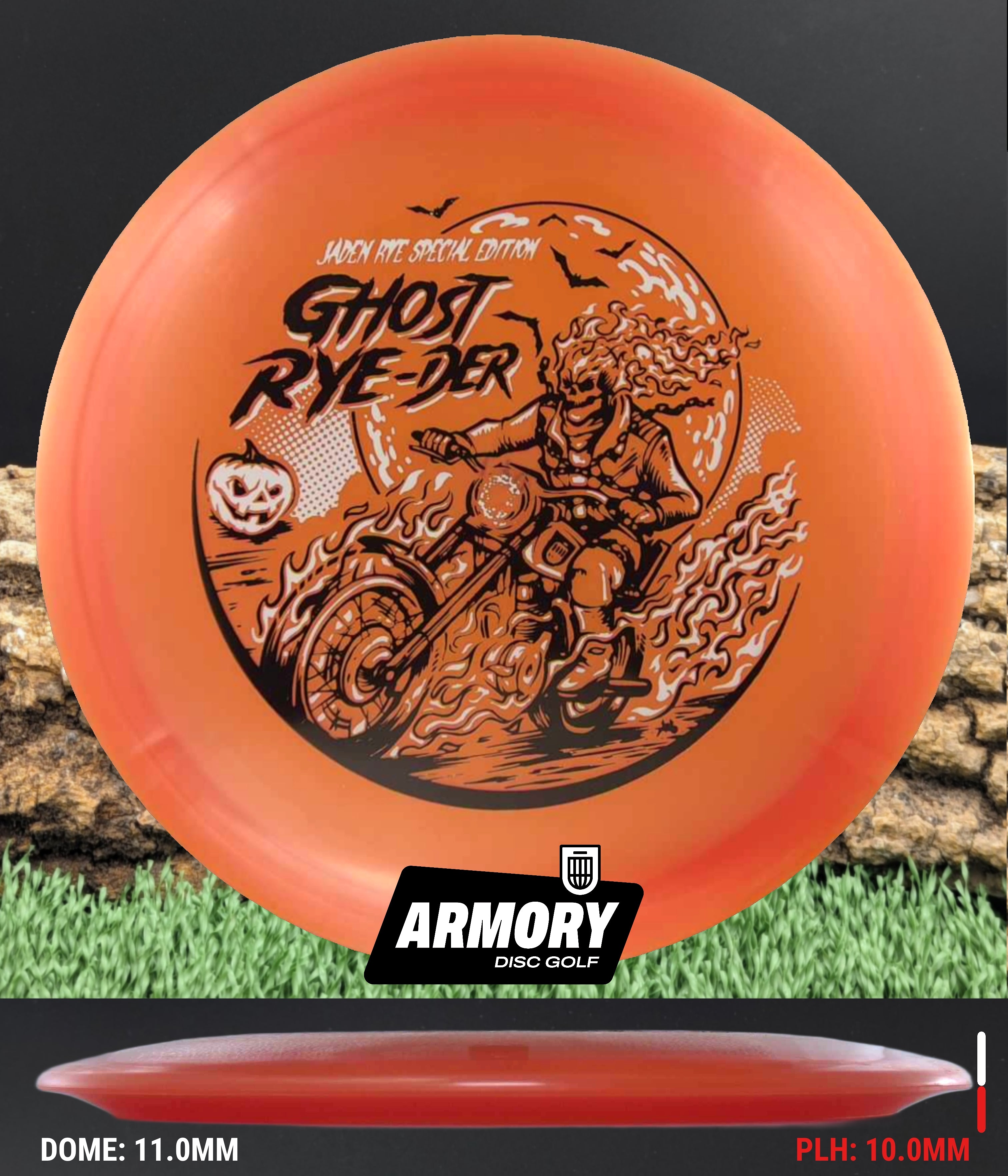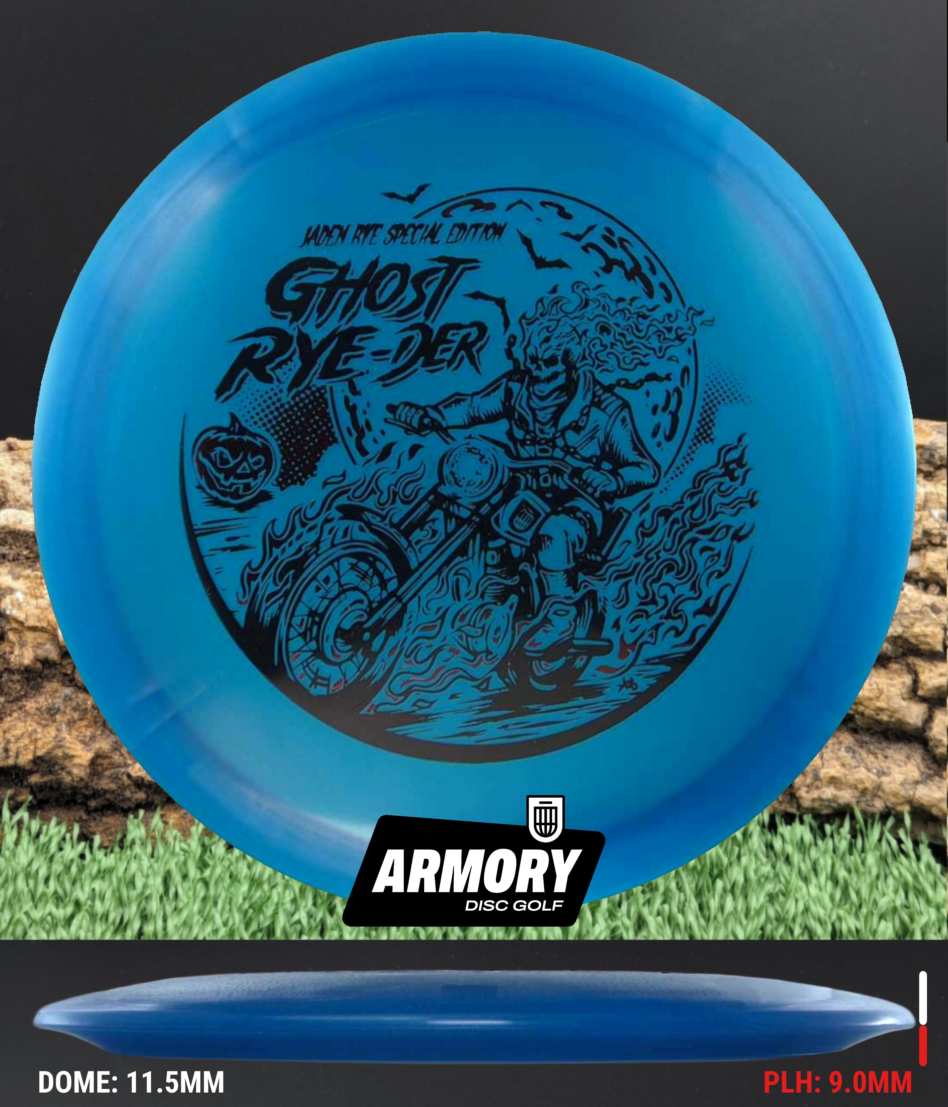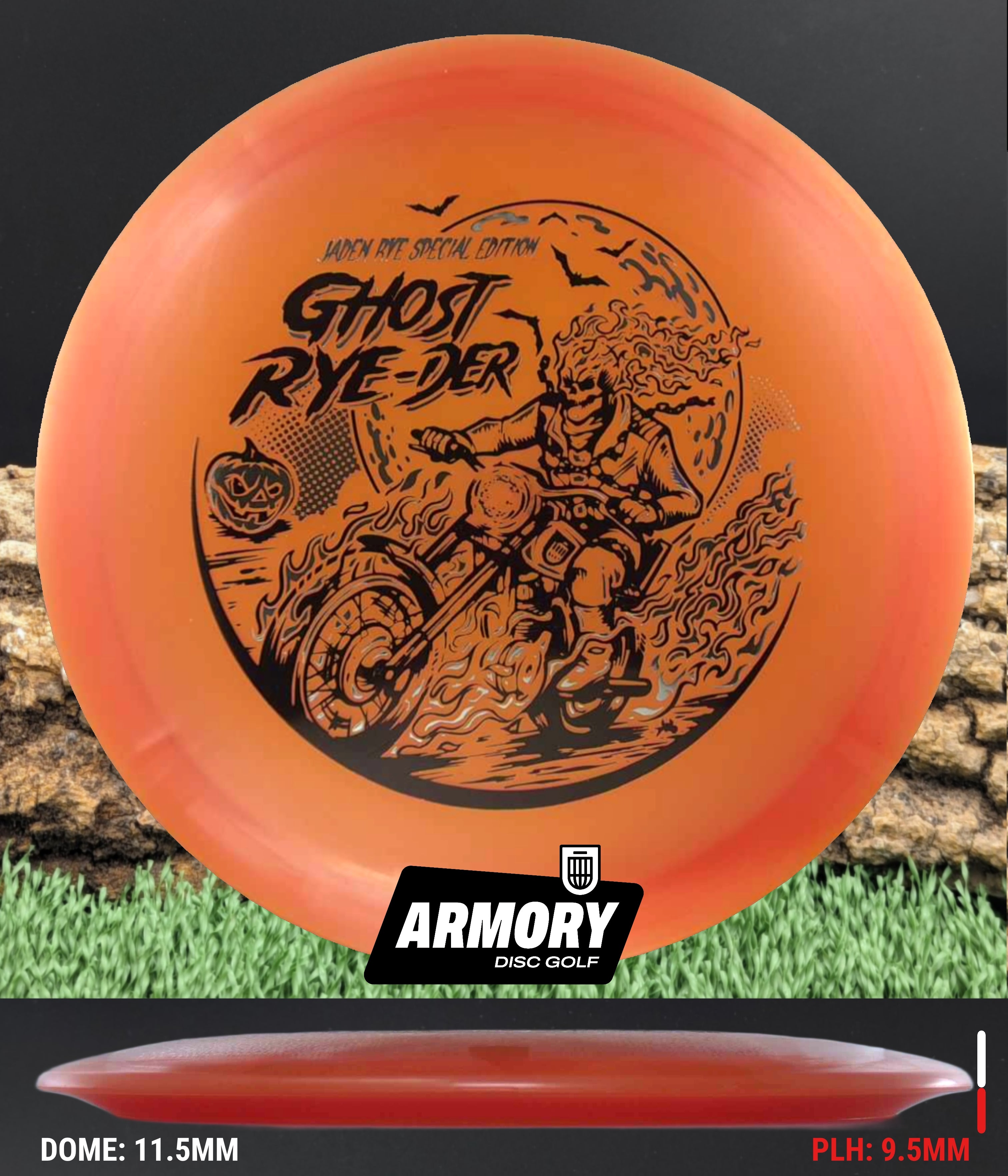 Speed meets accuracy. The Ghost Rye-der Teebird3 embodies Jaden Rye’s fearless precision — carving lines and attacking fairways. Kelly “KOB” Baber’s two-foil artwork of the flaming Ghost Rye-der mirrors that same relentless focus.