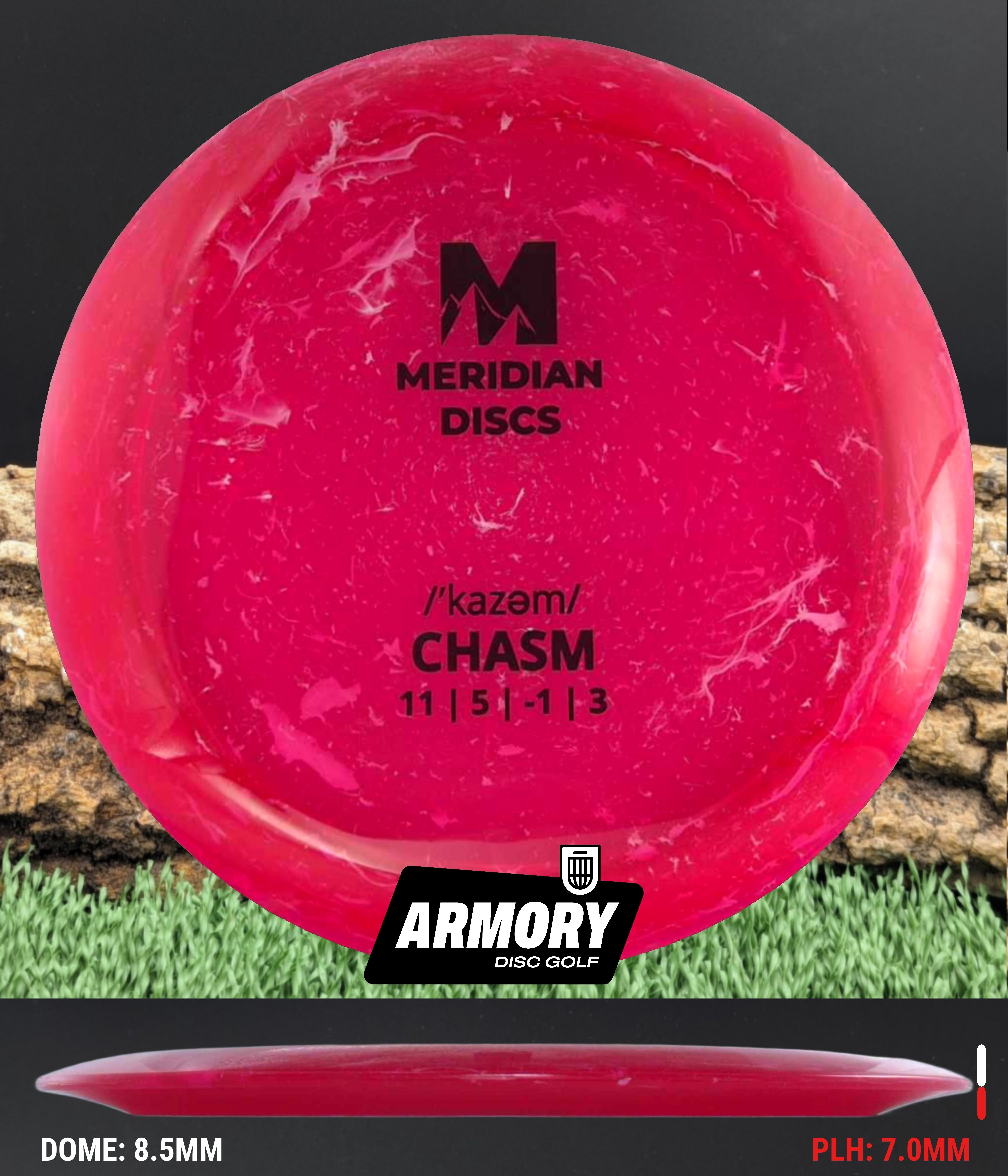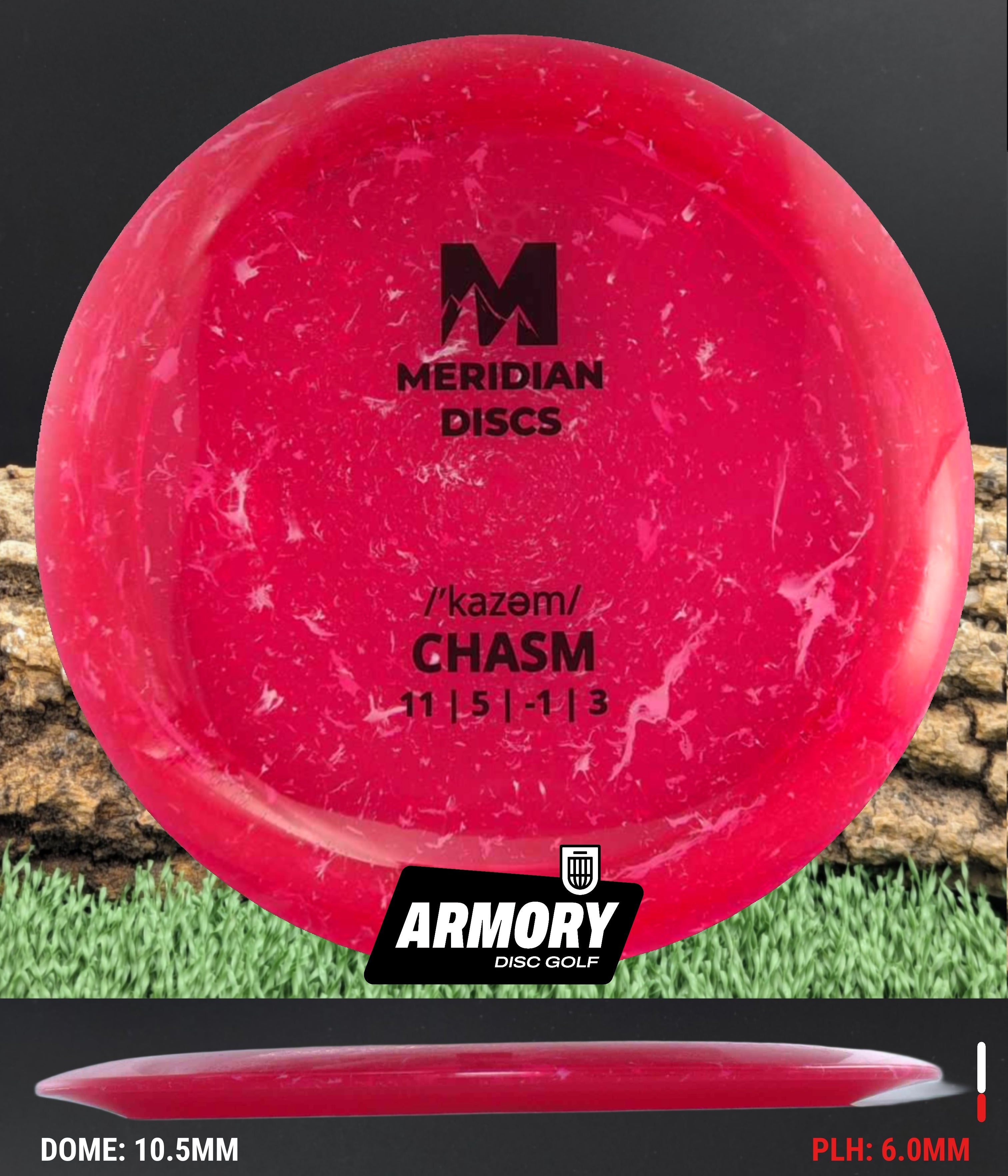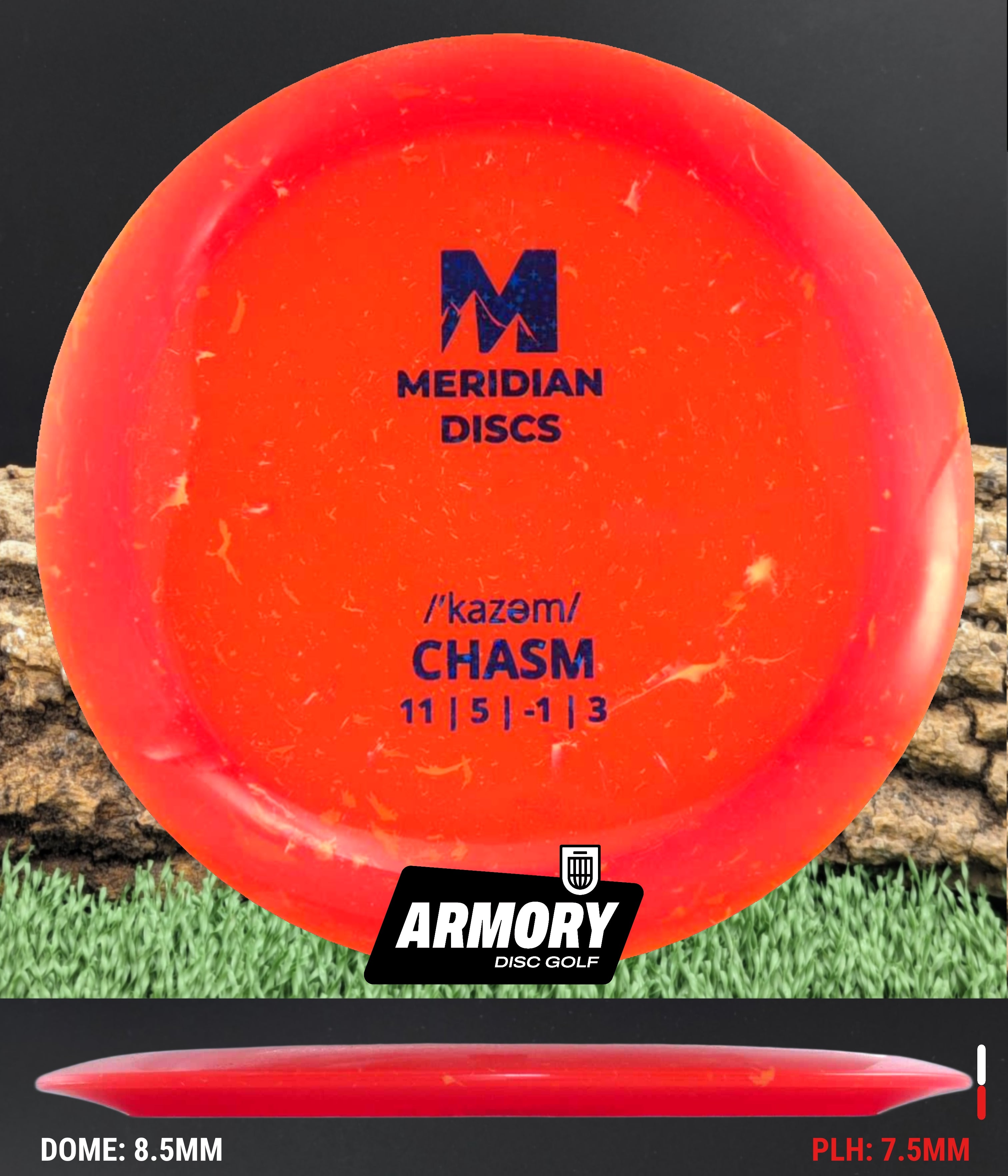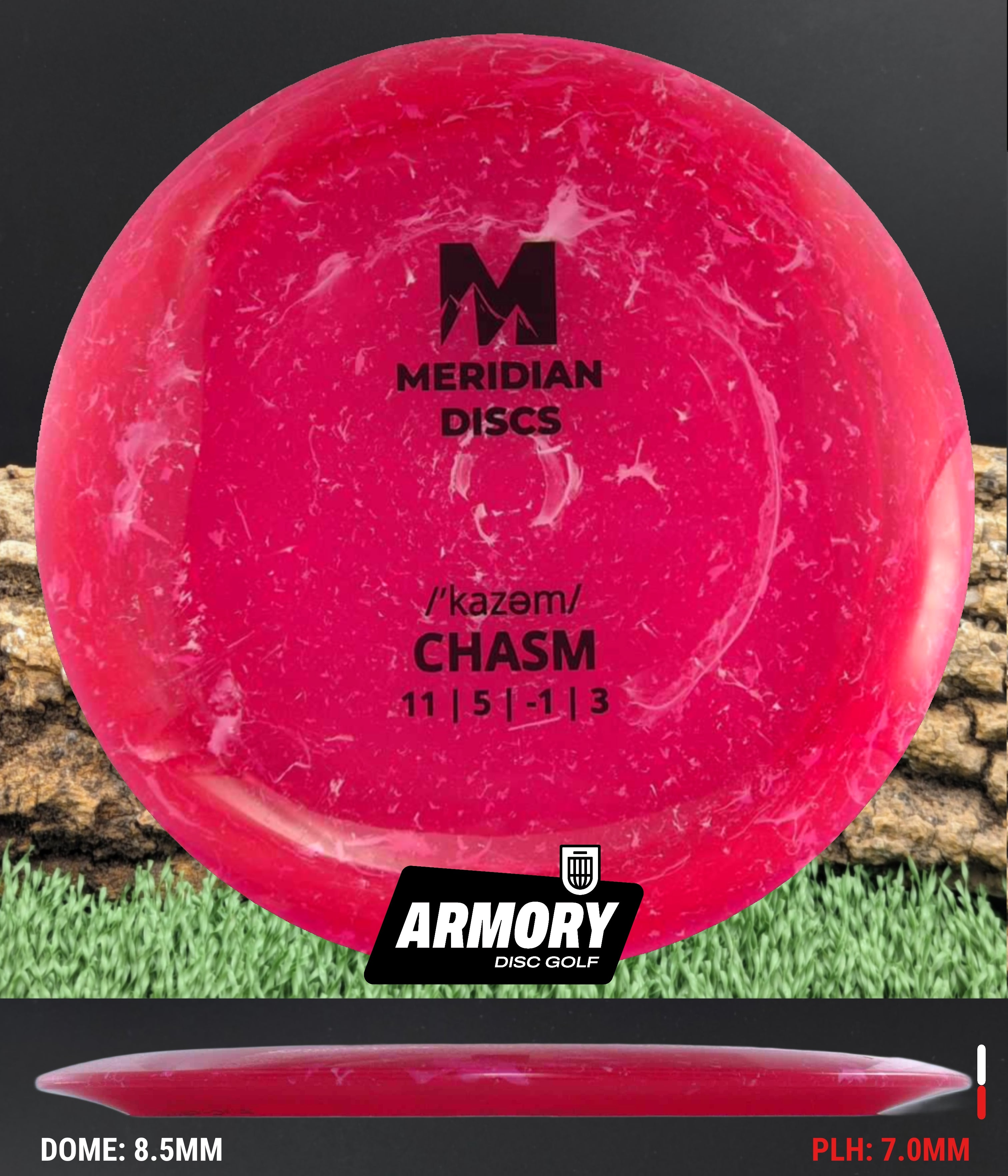 The Marbled Clarus Chasm pairs Meridian’s performance-driven Chasm mold with a striking Marbled Clarus plastic run—each disc a one-of-a-kind visual statement. Built for players who want distance with dependable control and a premium collectible look, the Chasm excels at long, controlled shots while staying confidently in the hand.