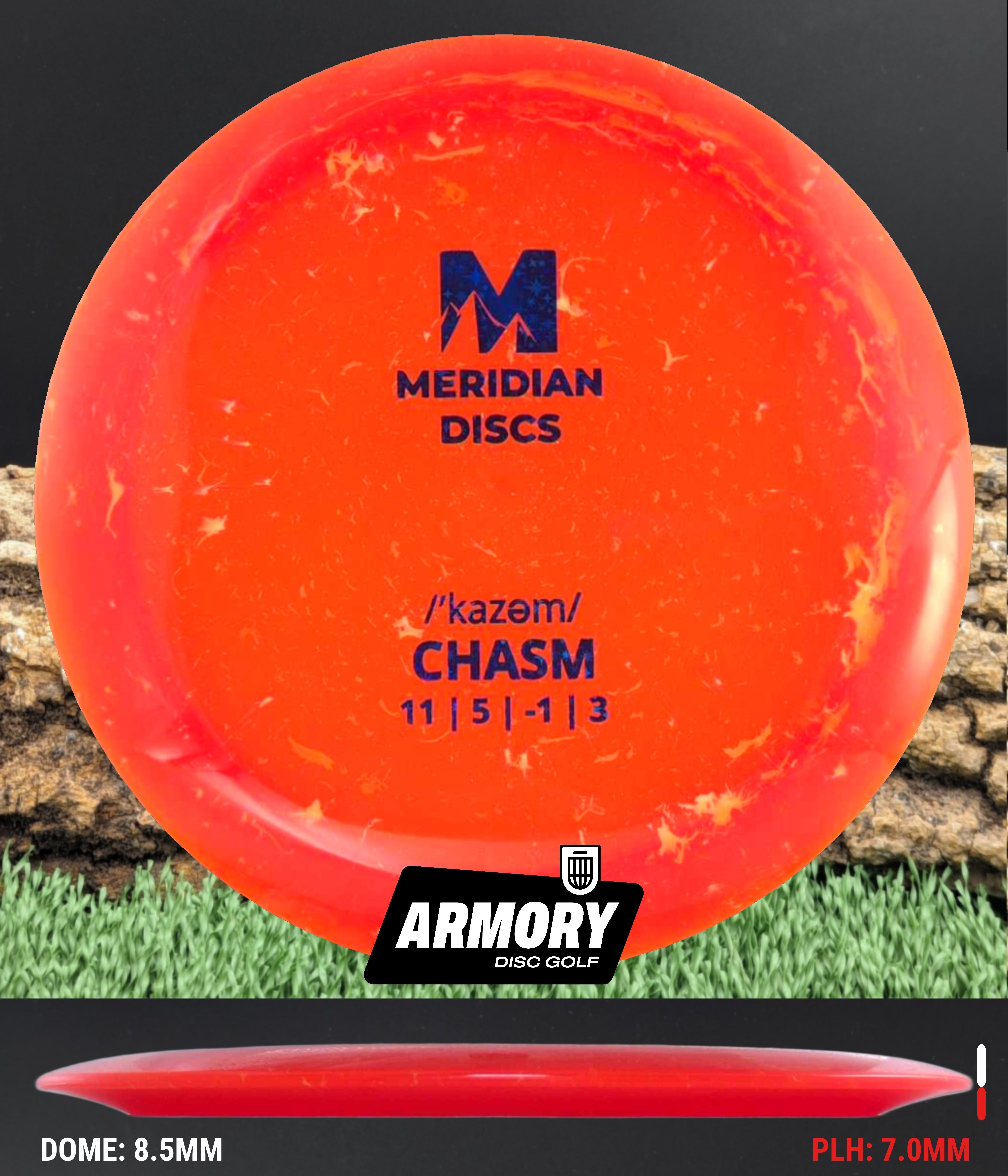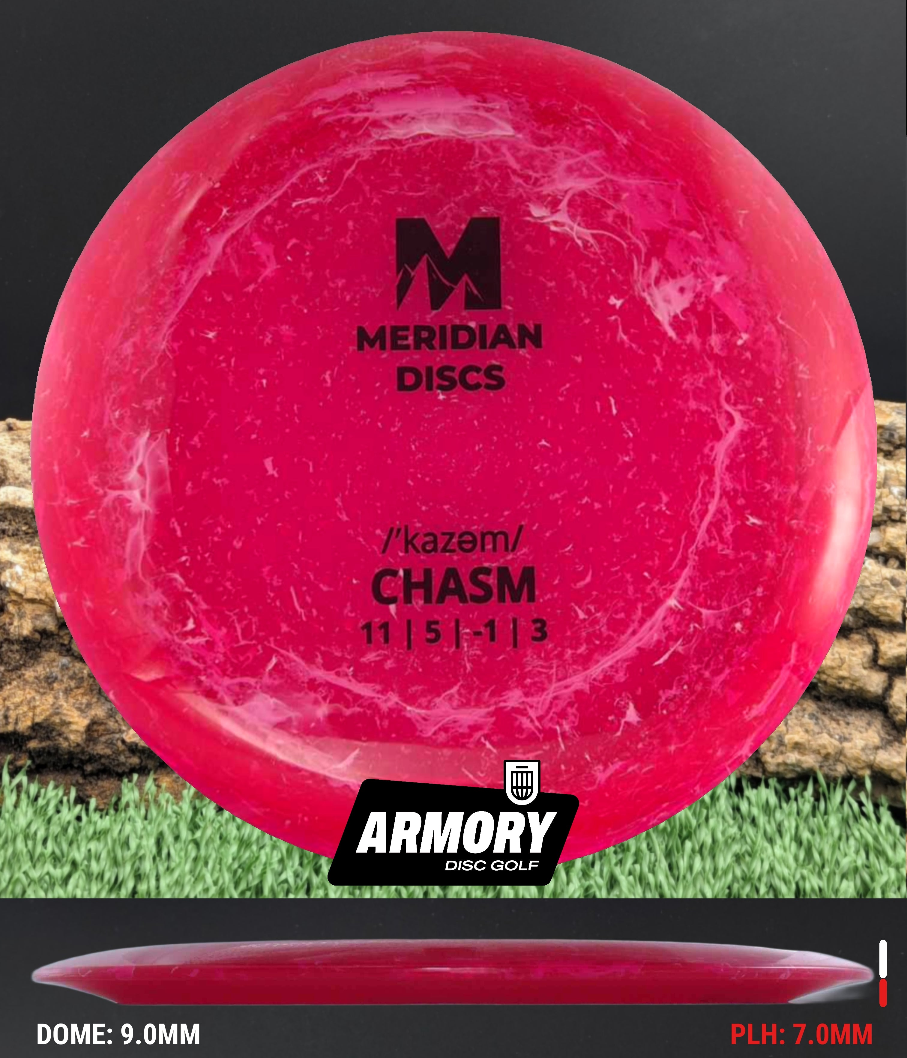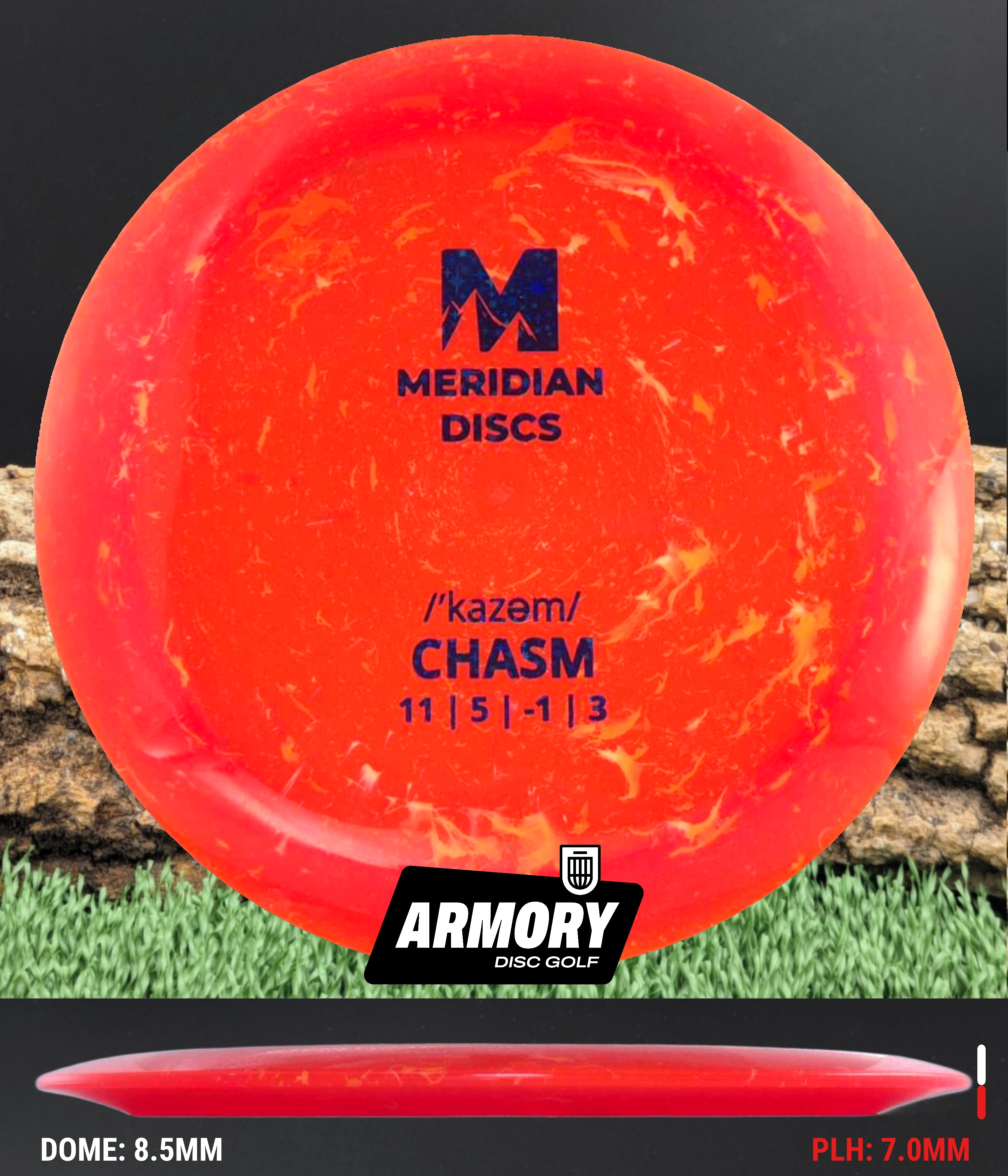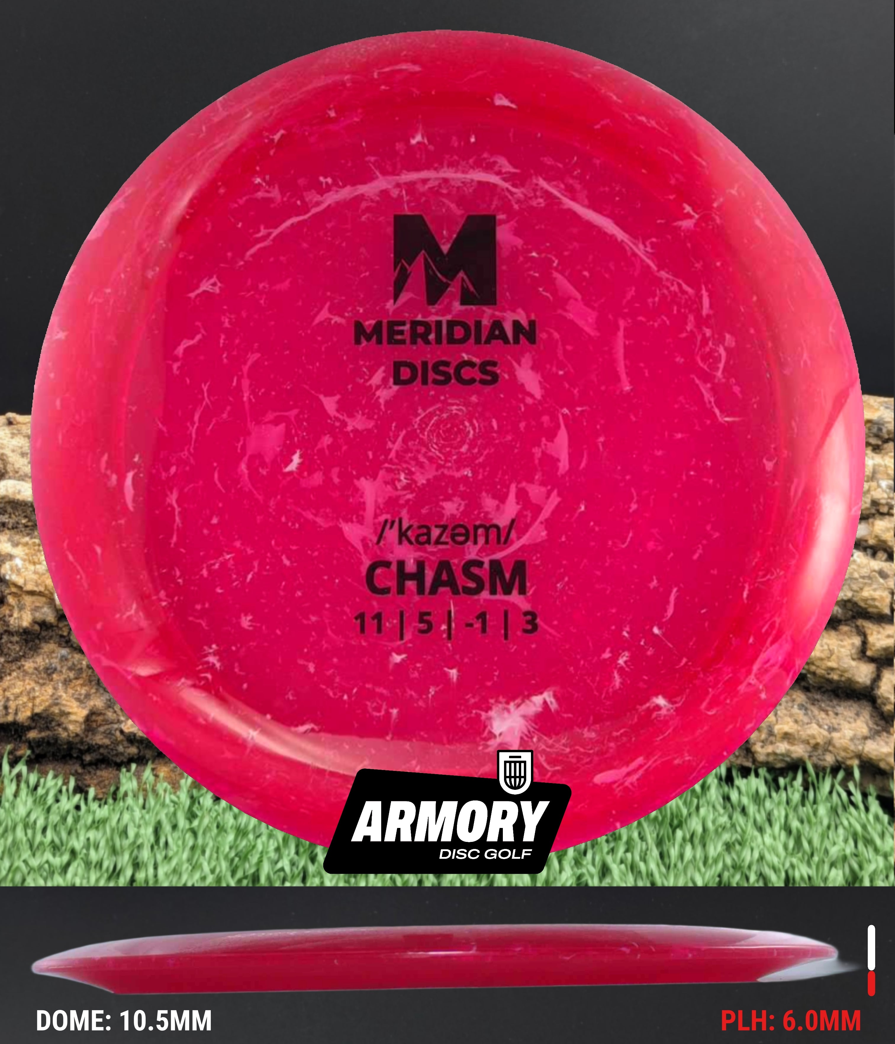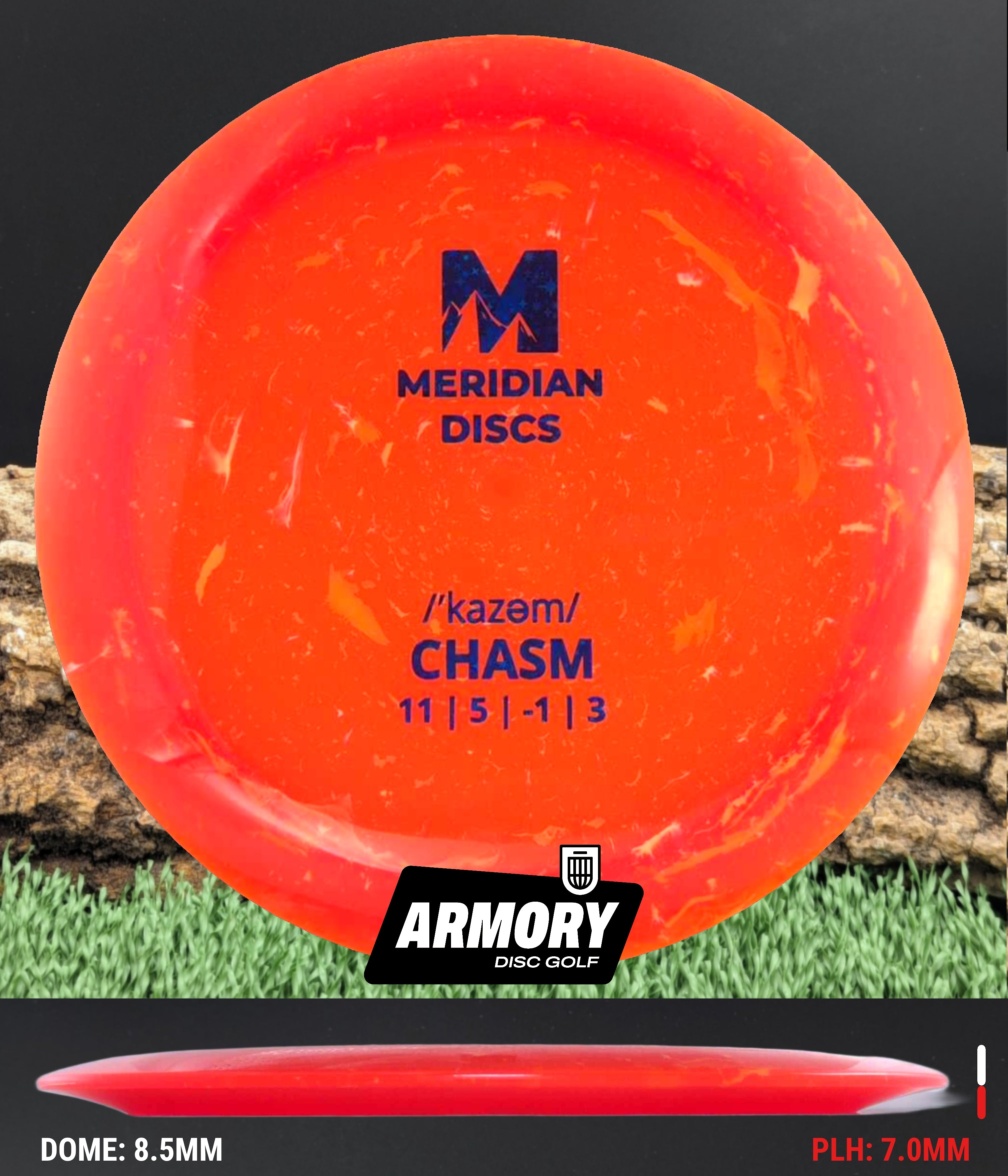 The Marbled Clarus Chasm pairs Meridian’s performance-driven Chasm mold with a striking Marbled Clarus plastic run—each disc a one-of-a-kind visual statement. Built for players who want distance with dependable control and a premium collectible look, the Chasm excels at long, controlled shots while staying confidently in the hand.