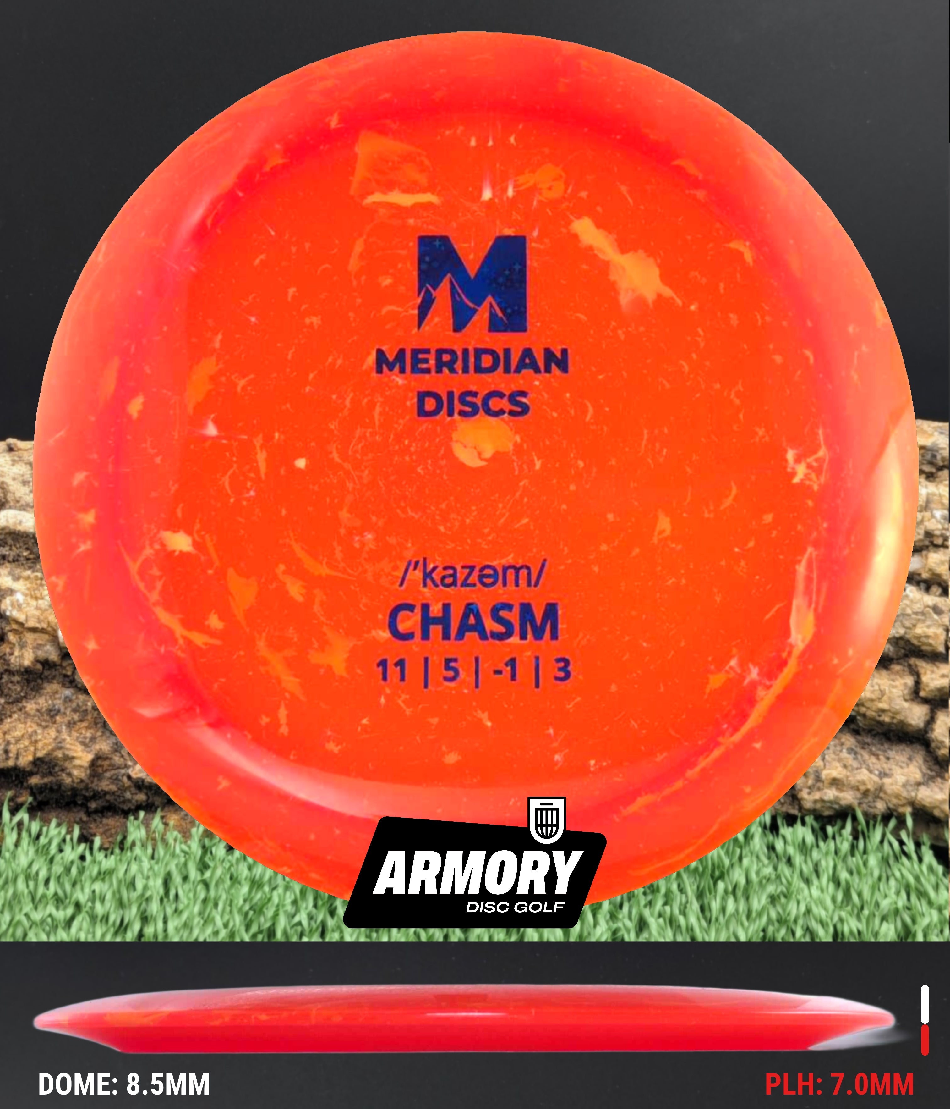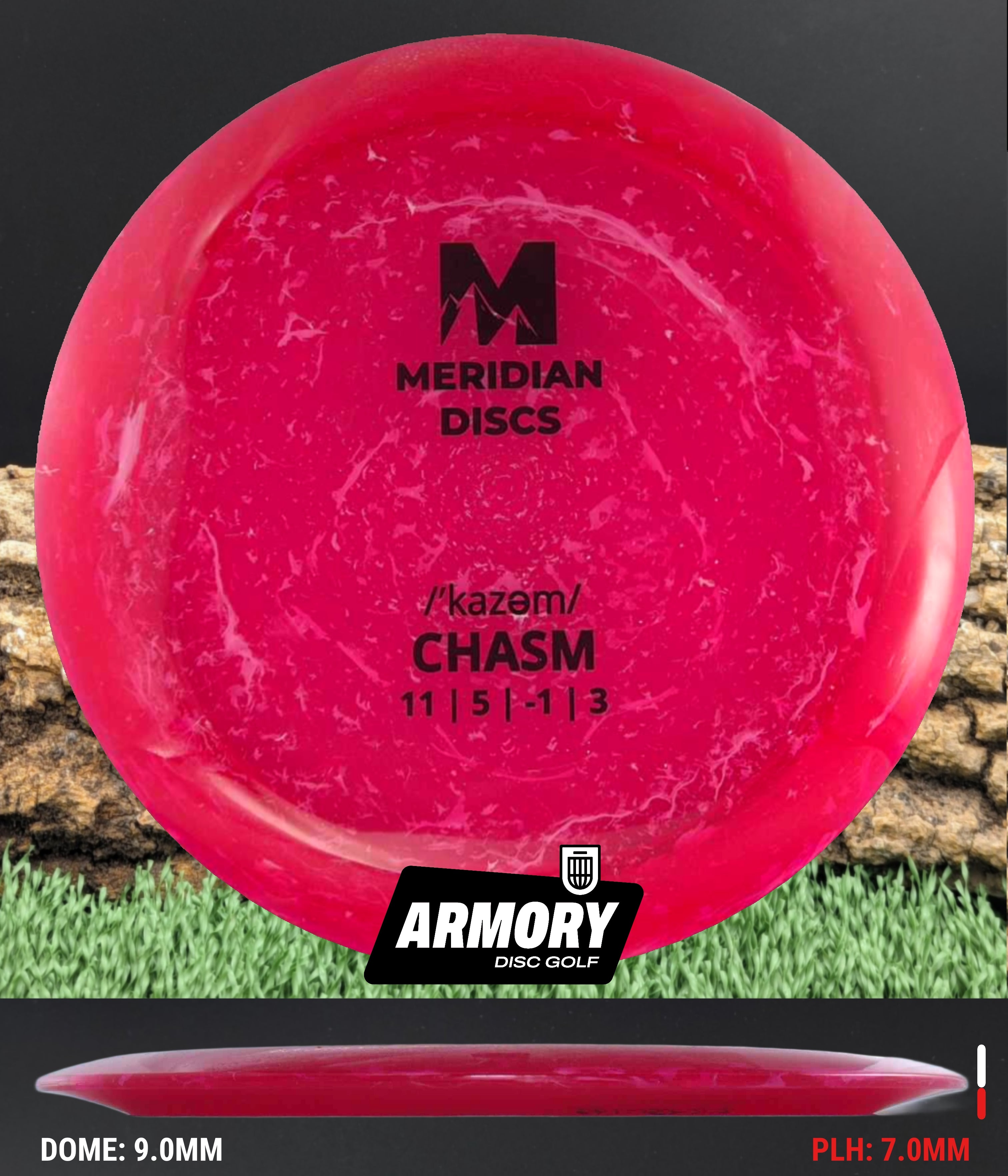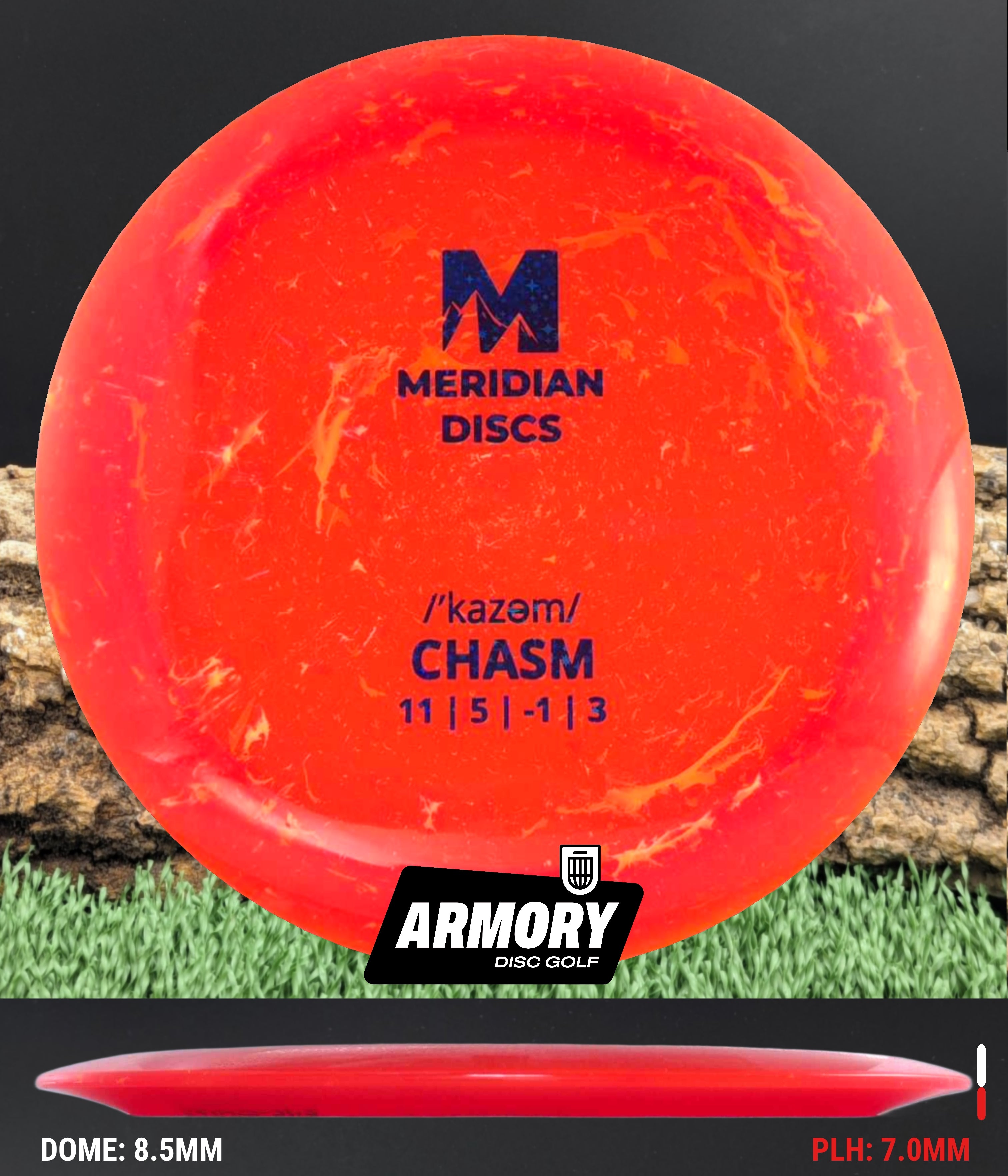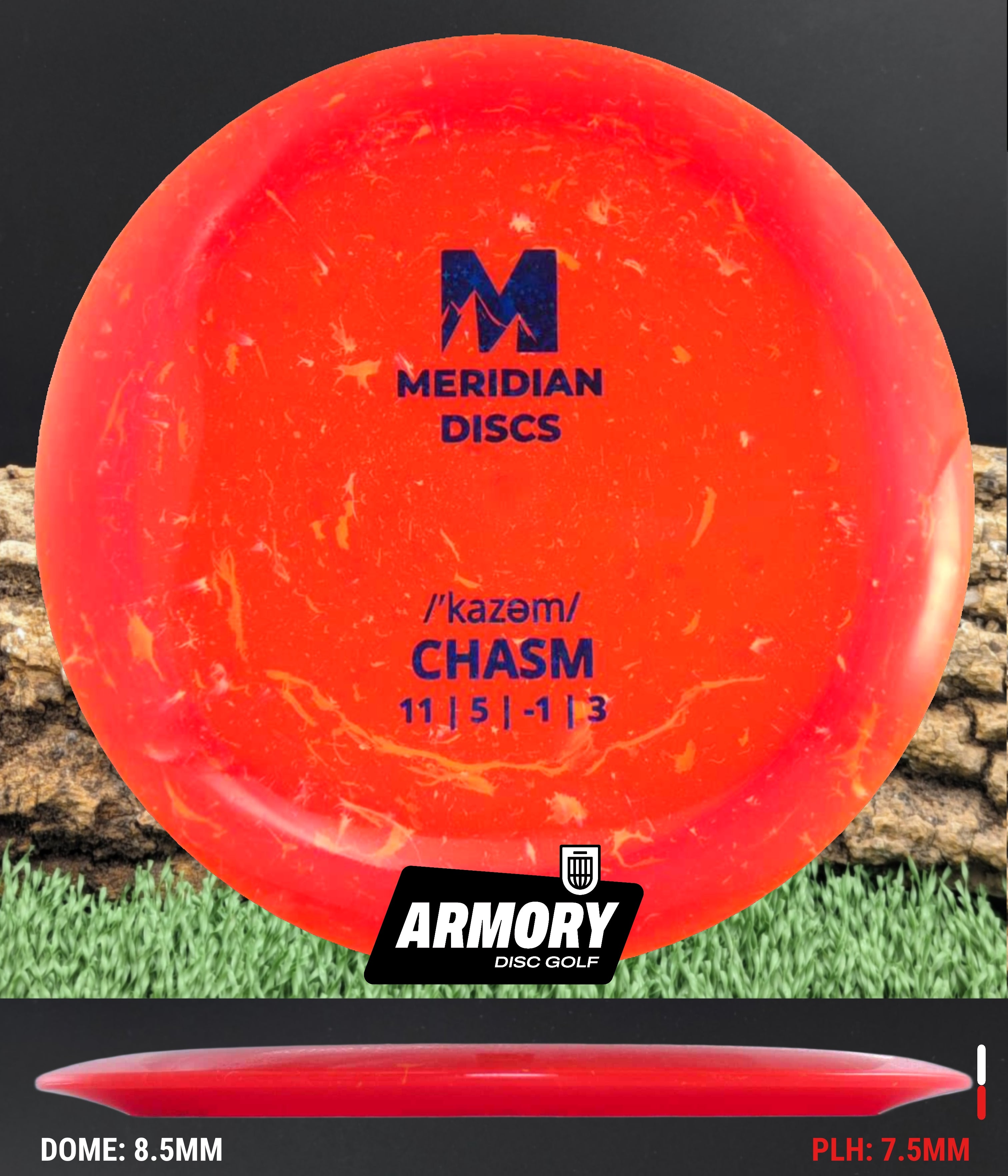 The Marbled Clarus Chasm pairs Meridian’s performance-driven Chasm mold with a striking Marbled Clarus plastic run—each disc a one-of-a-kind visual statement. Built for players who want distance with dependable control and a premium collectible look, the Chasm excels at long, controlled shots while staying confidently in the hand.