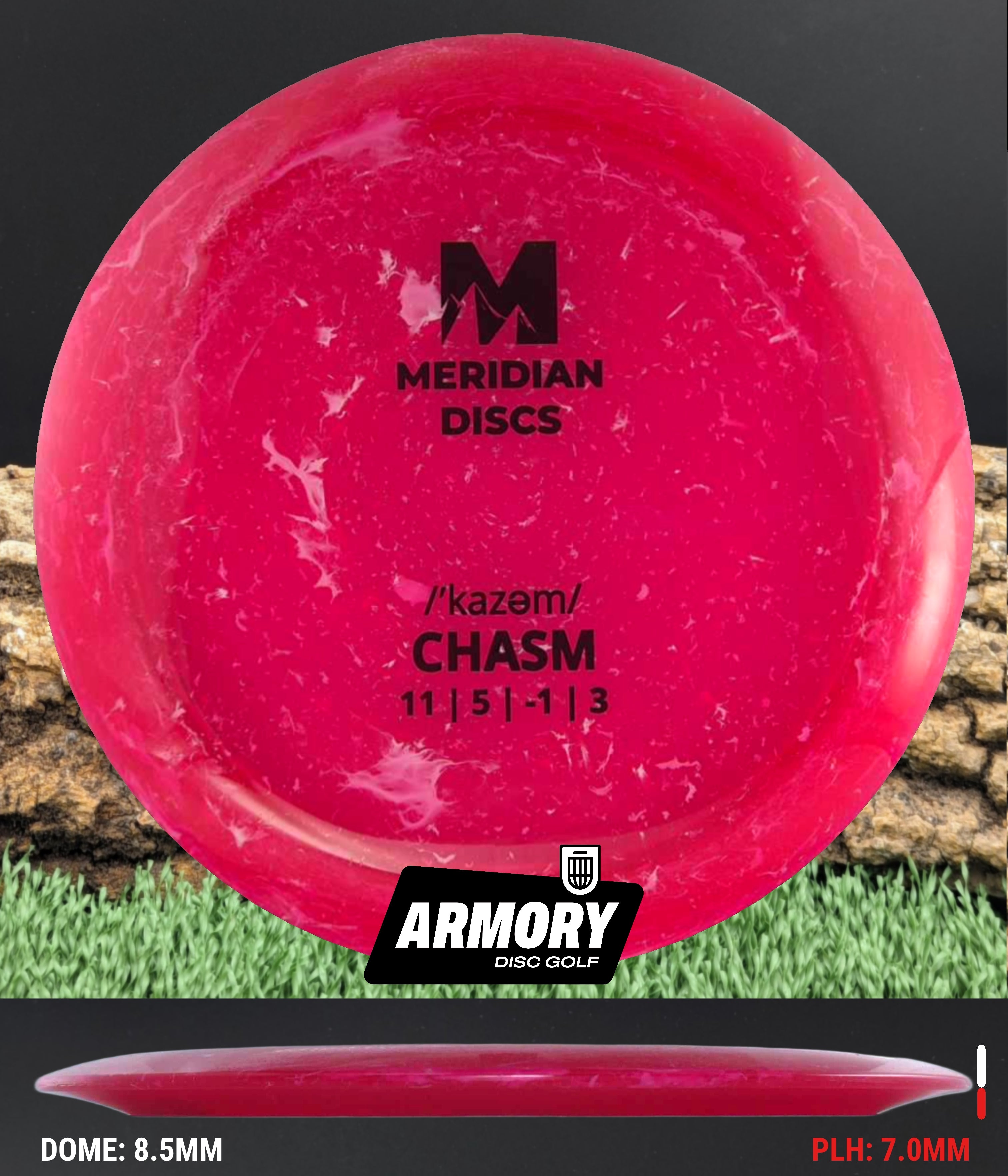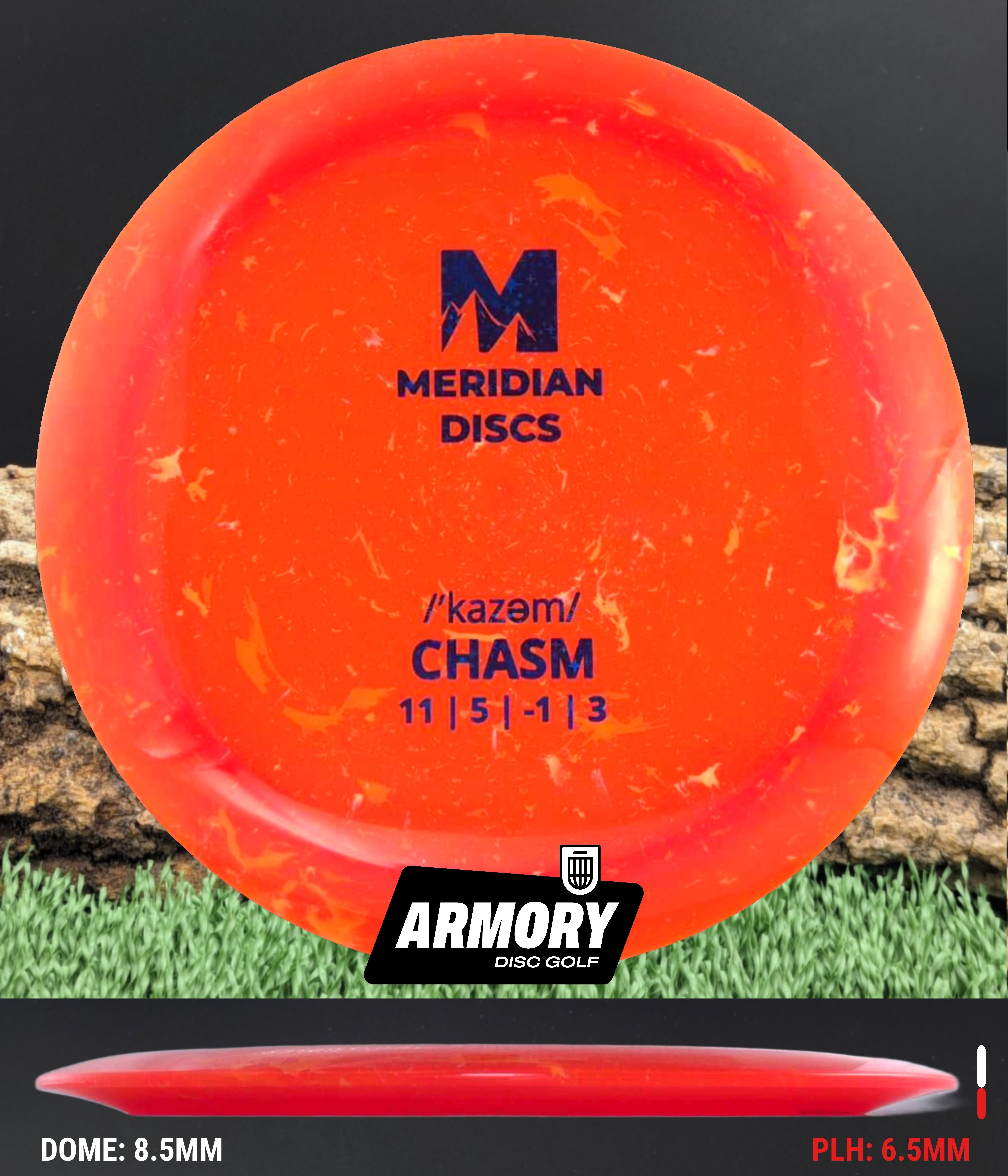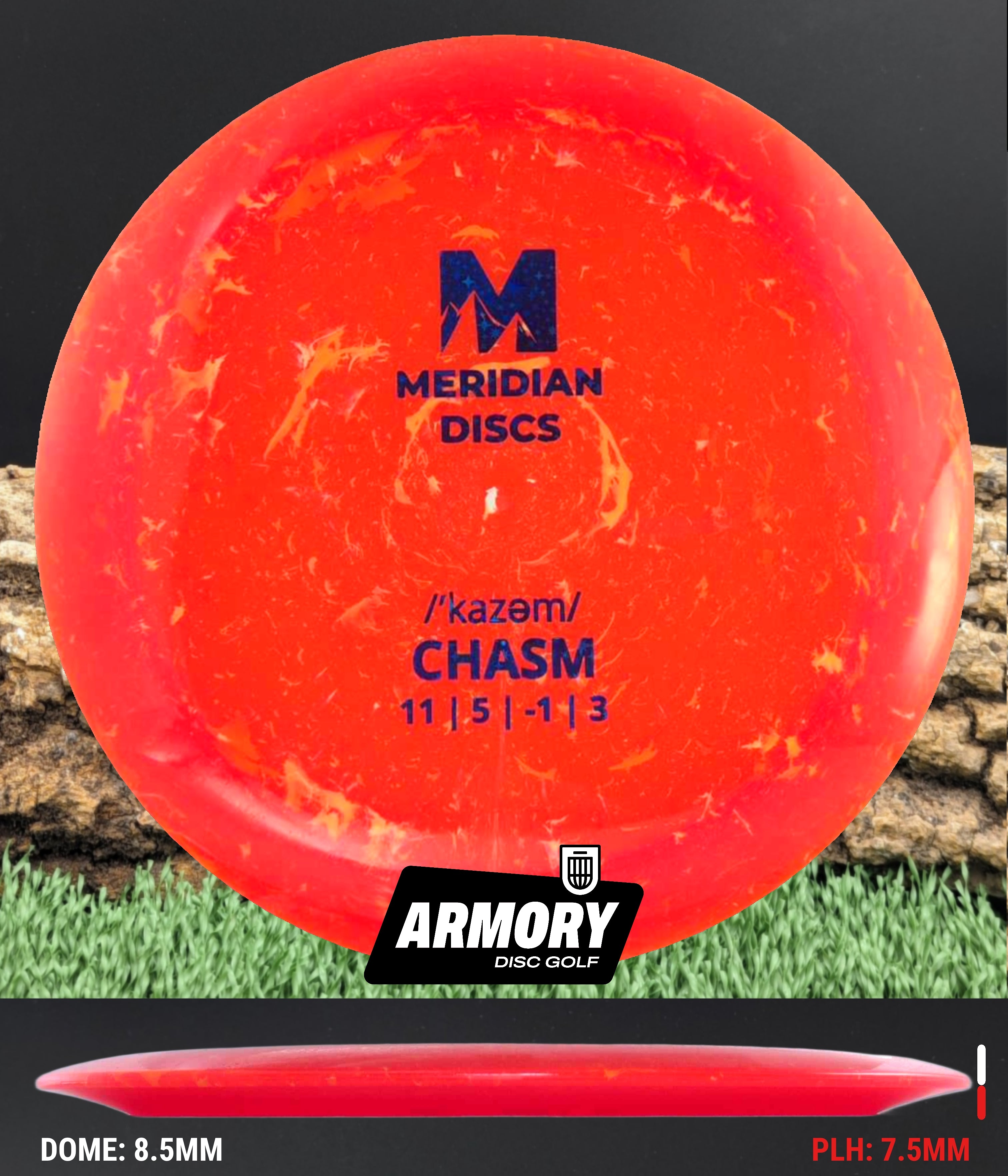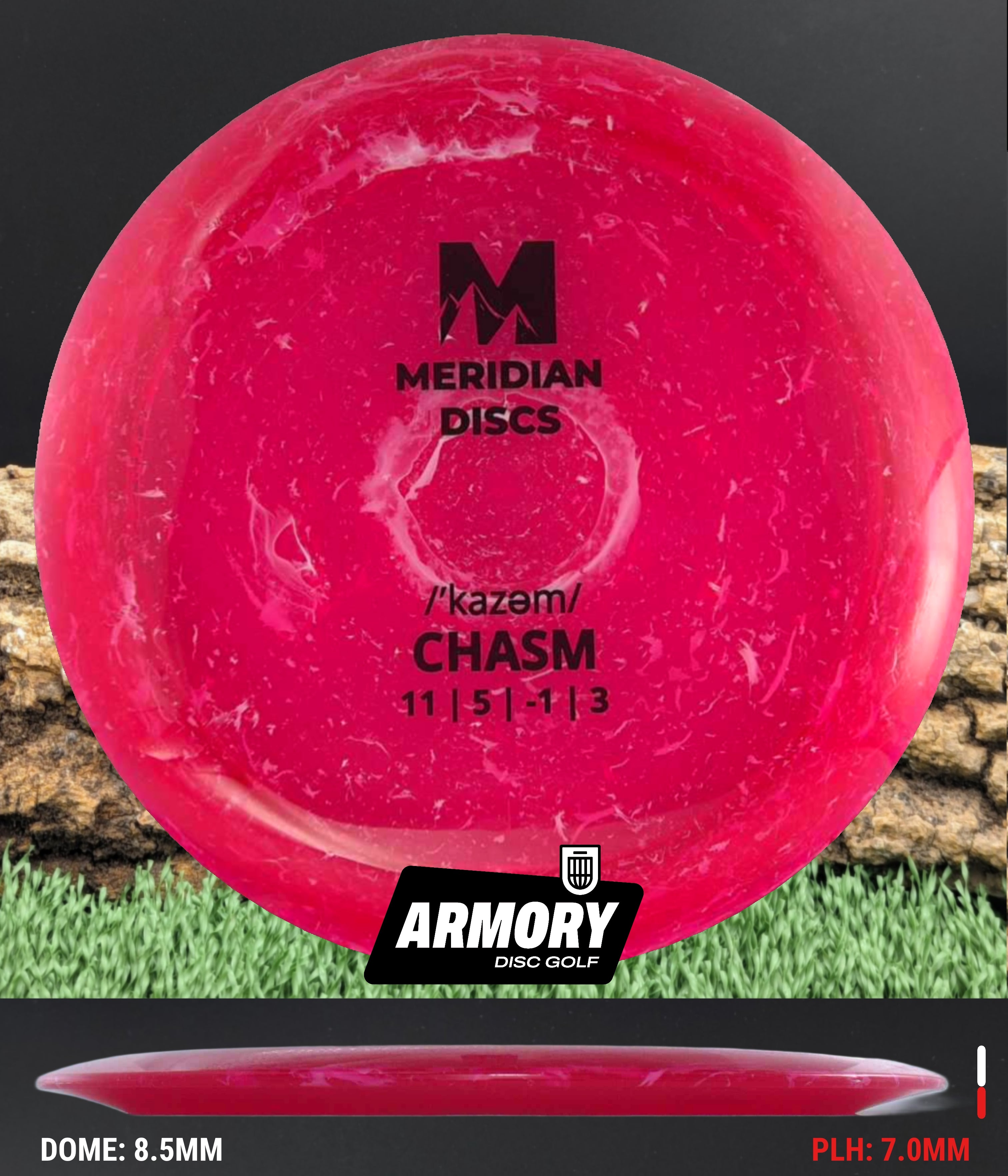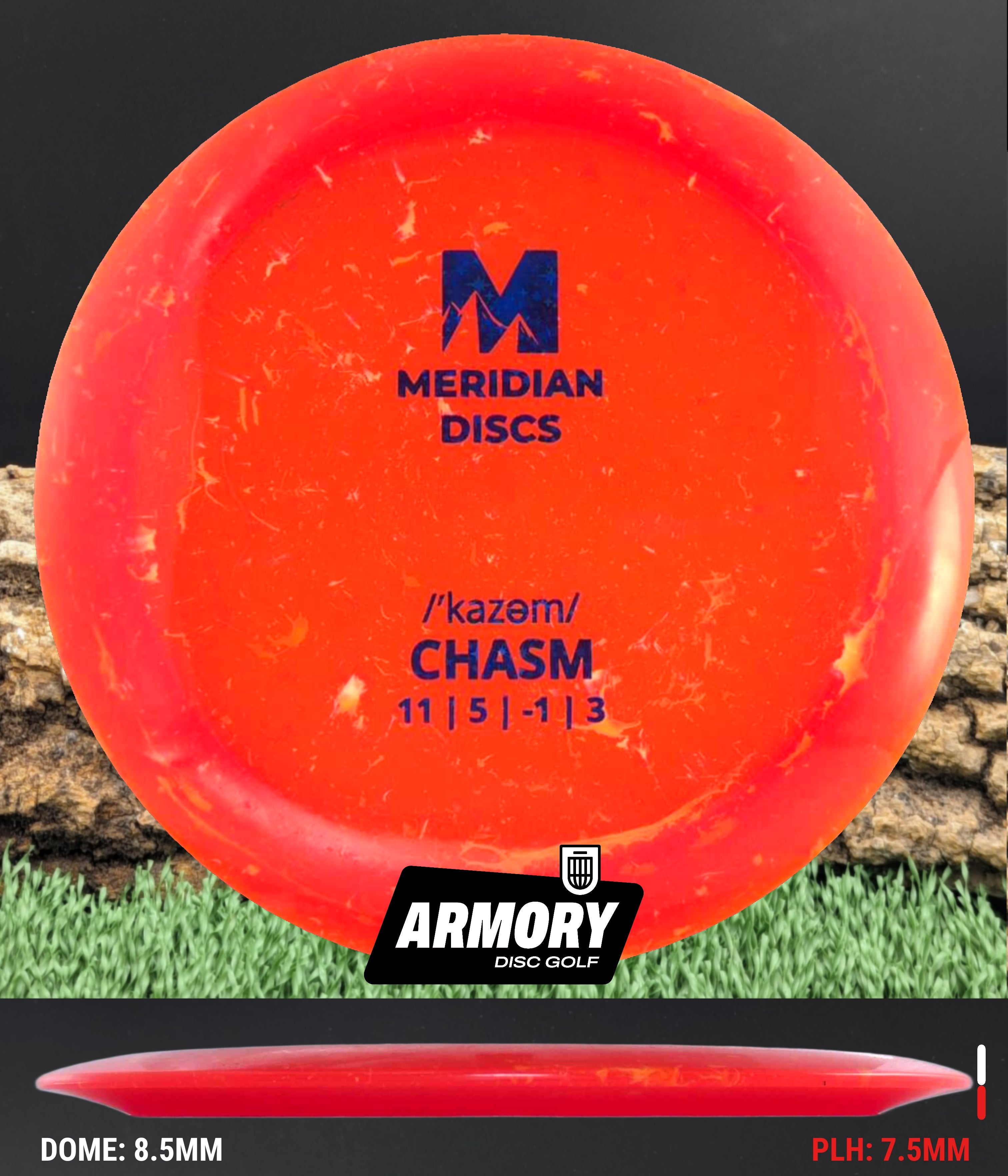 The Marbled Clarus Chasm pairs Meridian’s performance-driven Chasm mold with a striking Marbled Clarus plastic run—each disc a one-of-a-kind visual statement. Built for players who want distance with dependable control and a premium collectible look, the Chasm excels at long, controlled shots while staying confidently in the hand.