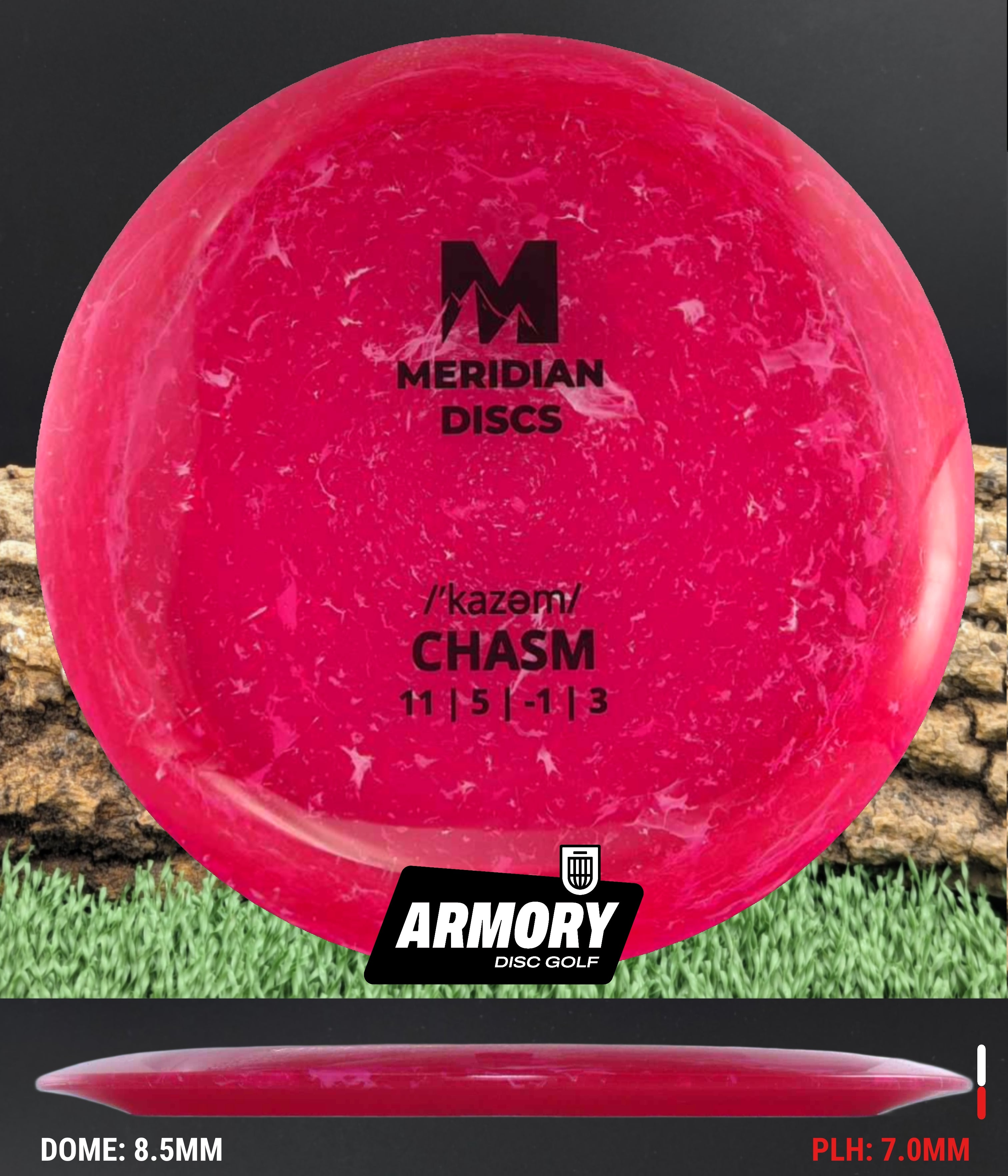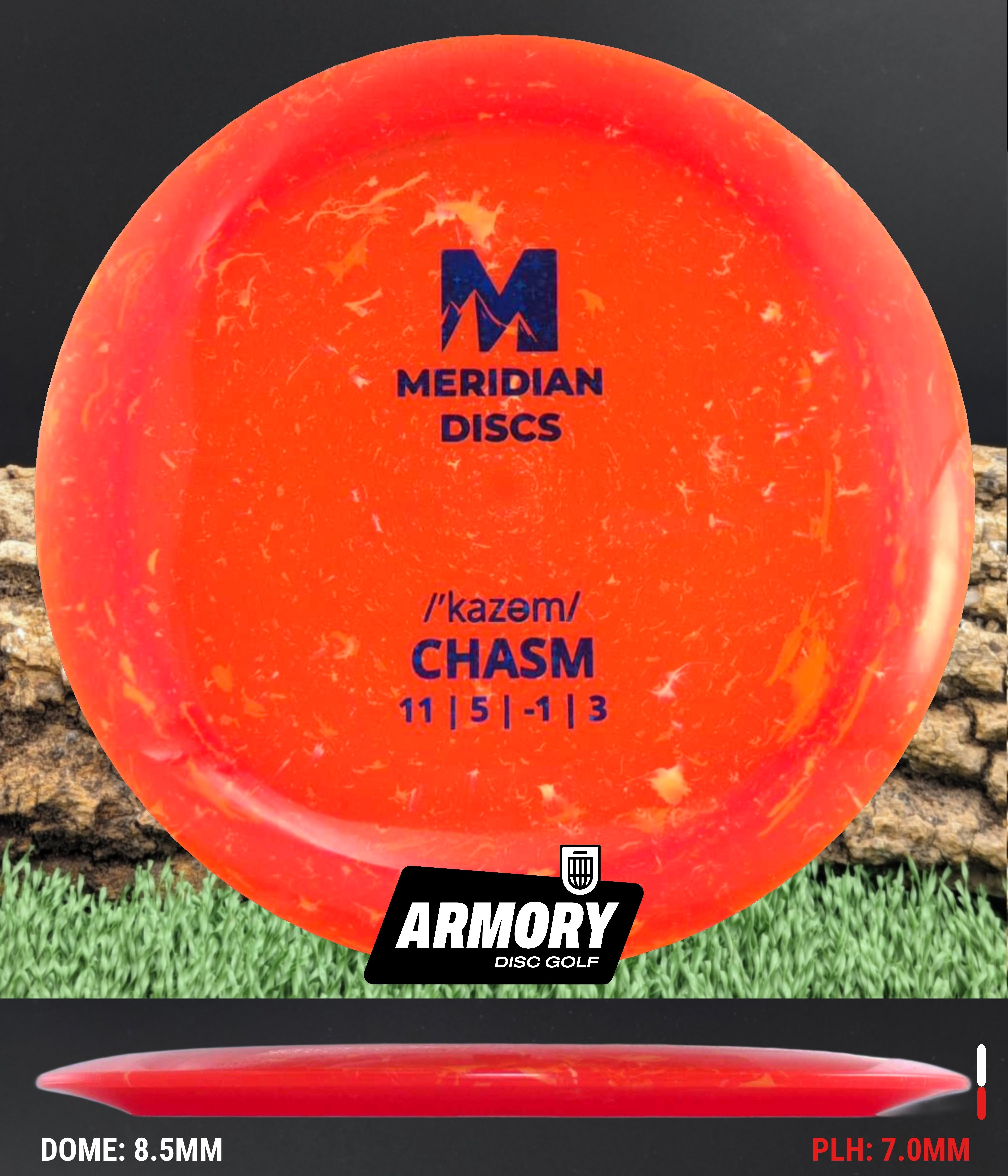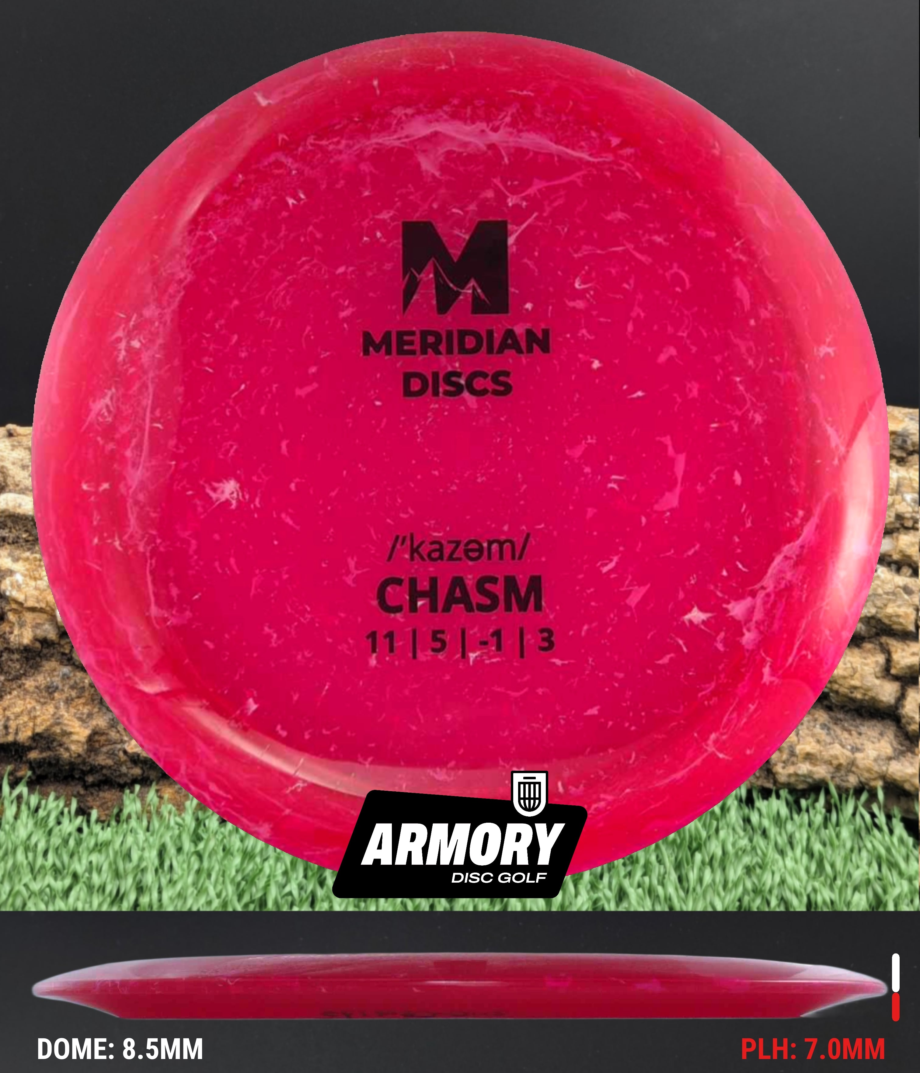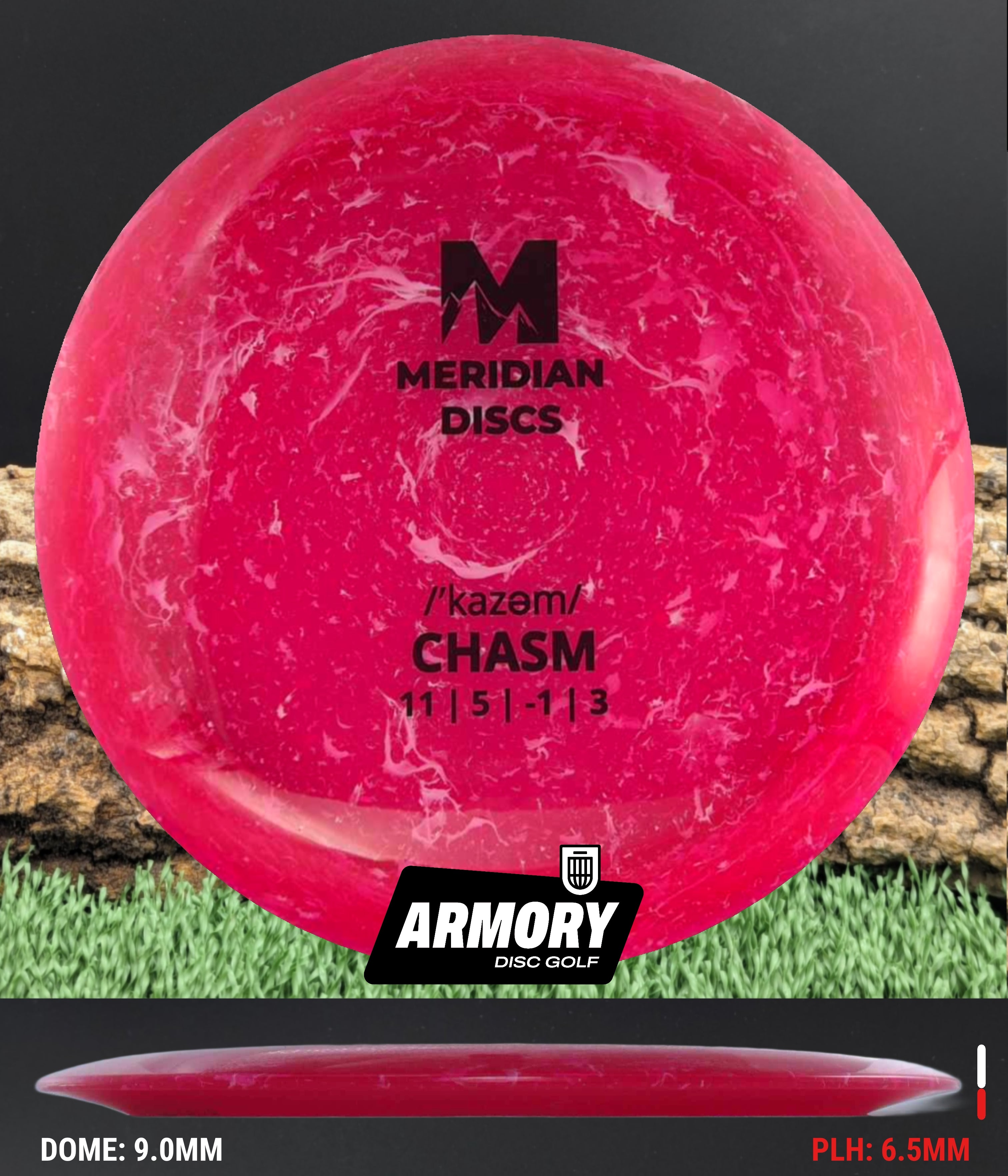 The Marbled Clarus Chasm pairs Meridian’s performance-driven Chasm mold with a striking Marbled Clarus plastic run—each disc a one-of-a-kind visual statement. Built for players who want distance with dependable control and a premium collectible look, the Chasm excels at long, controlled shots while staying confidently in the hand.