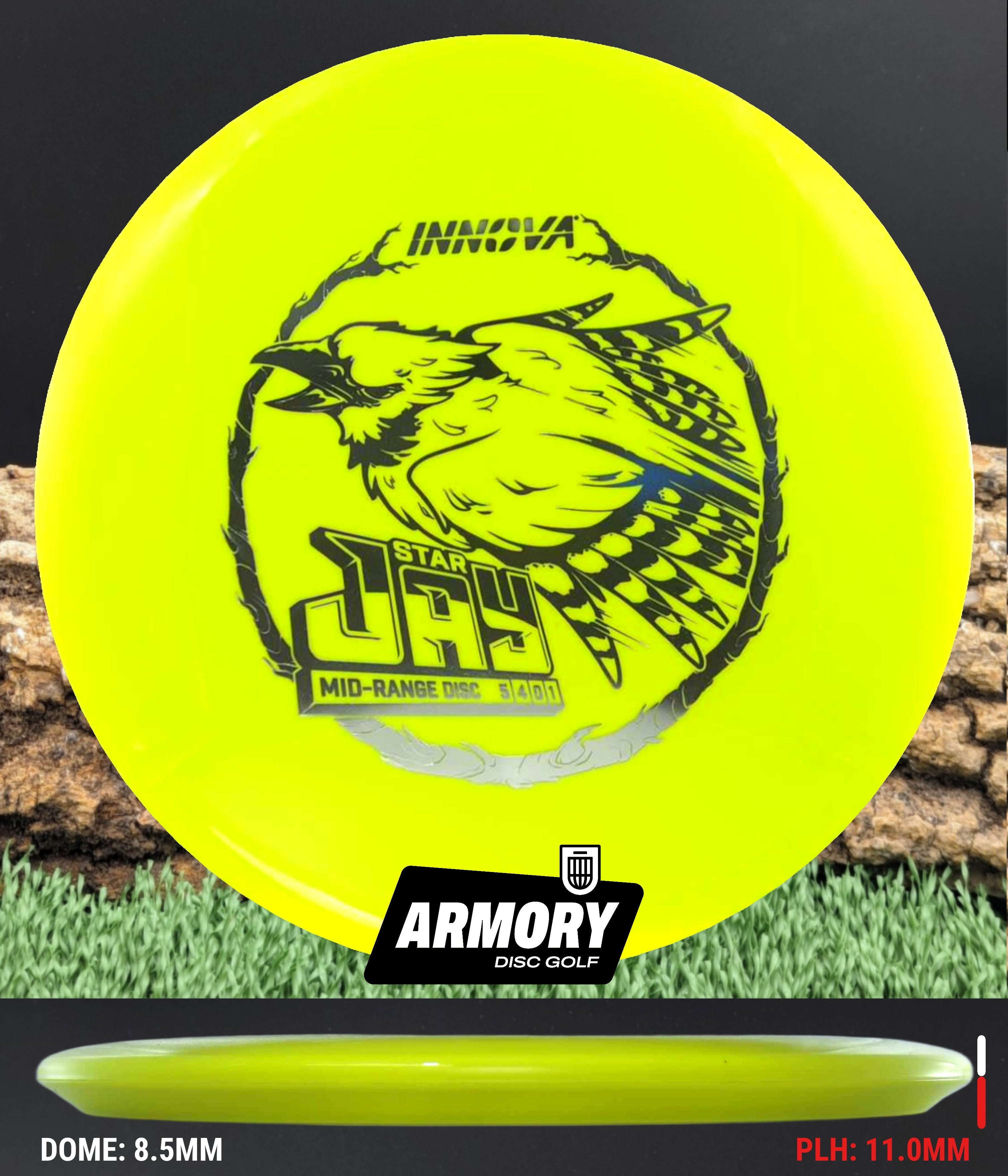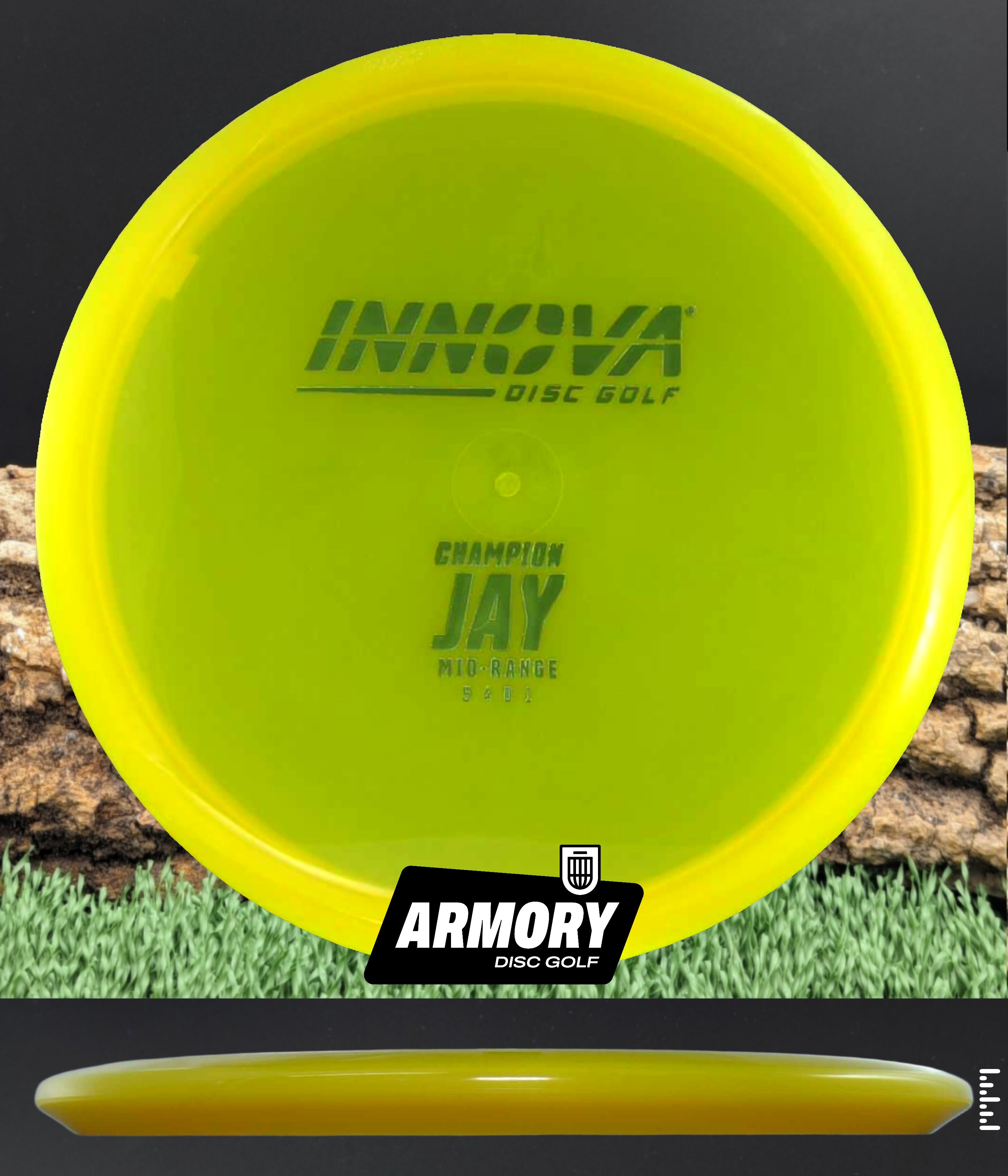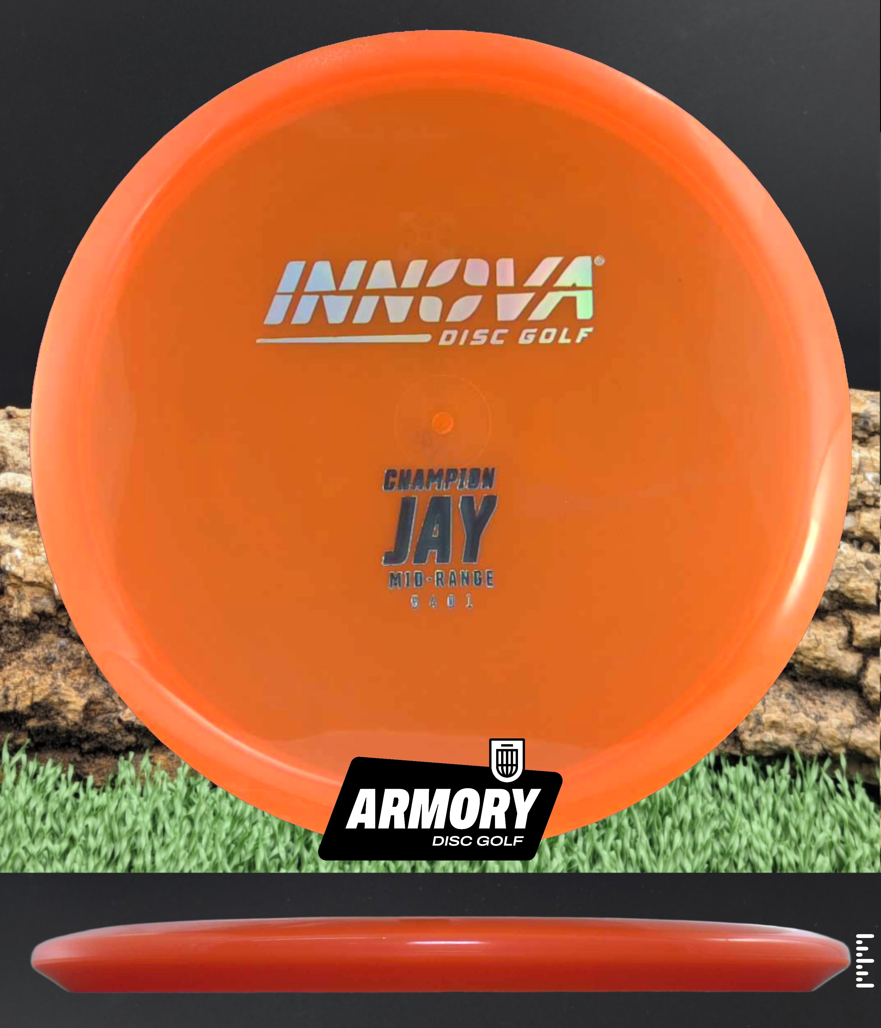 A micro-beaded Mid-Range with a true-to-release flight, the Innova Jay will be a staple in bags everywhere. This all-purpose disc can handle power or be finessed. It has better torque-resistance than most Mid-Ranges, but still finishes straight. It is one of our most point-and-shoot discs on the market. The Jay’s low-profile design fits comfortably in your hand for a clean release every throw. Get yours in Champion and Star plastics today.
