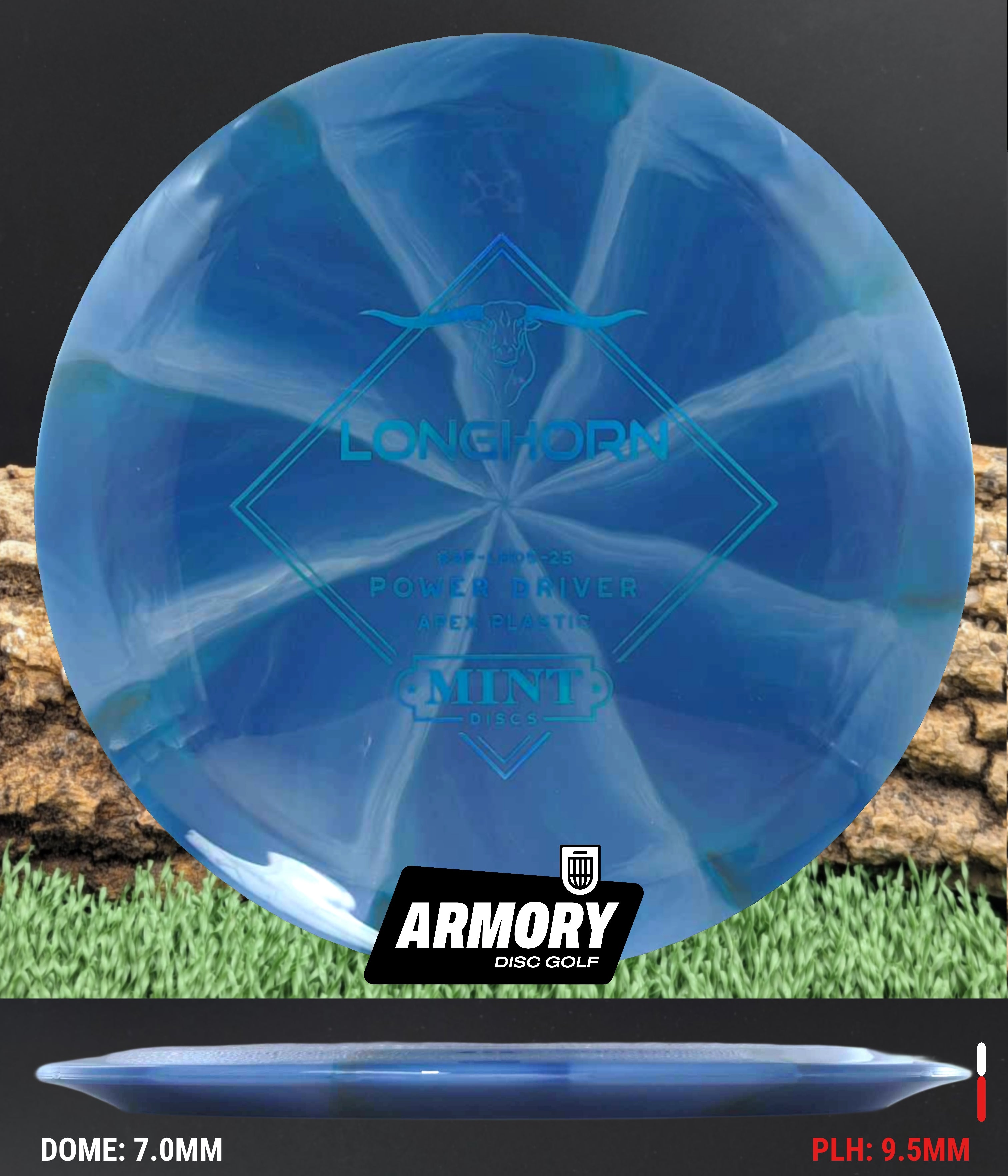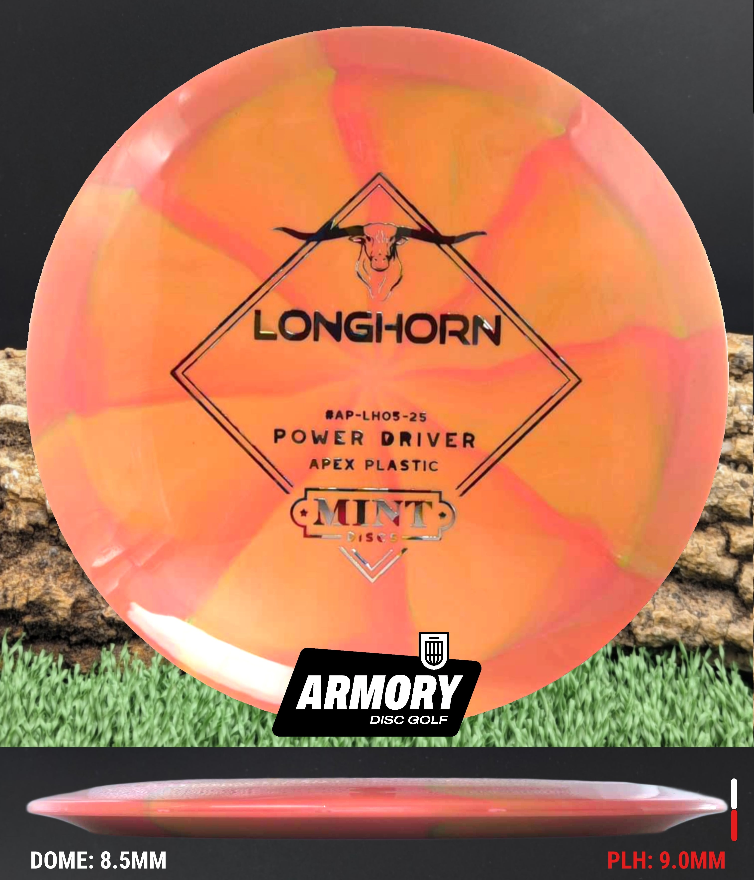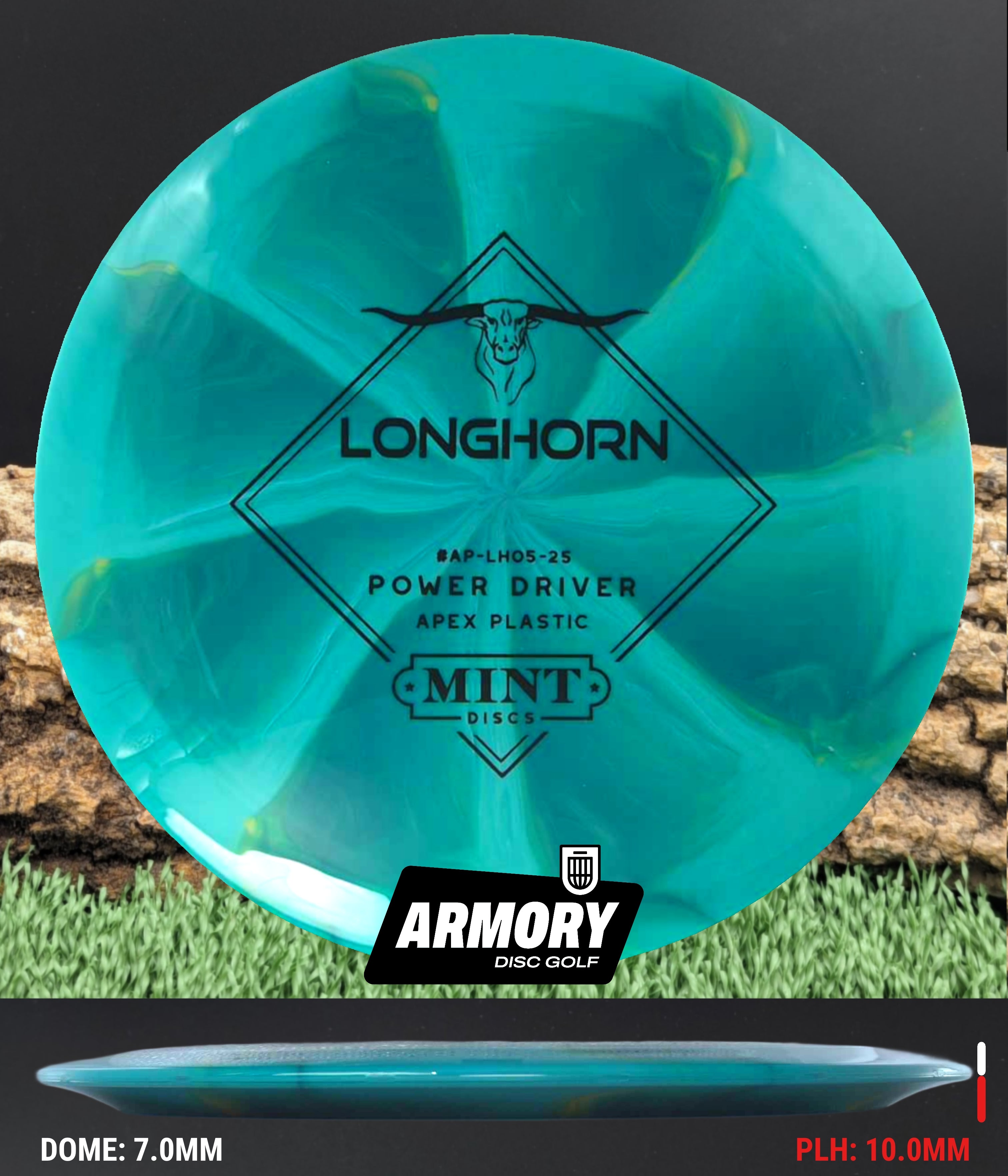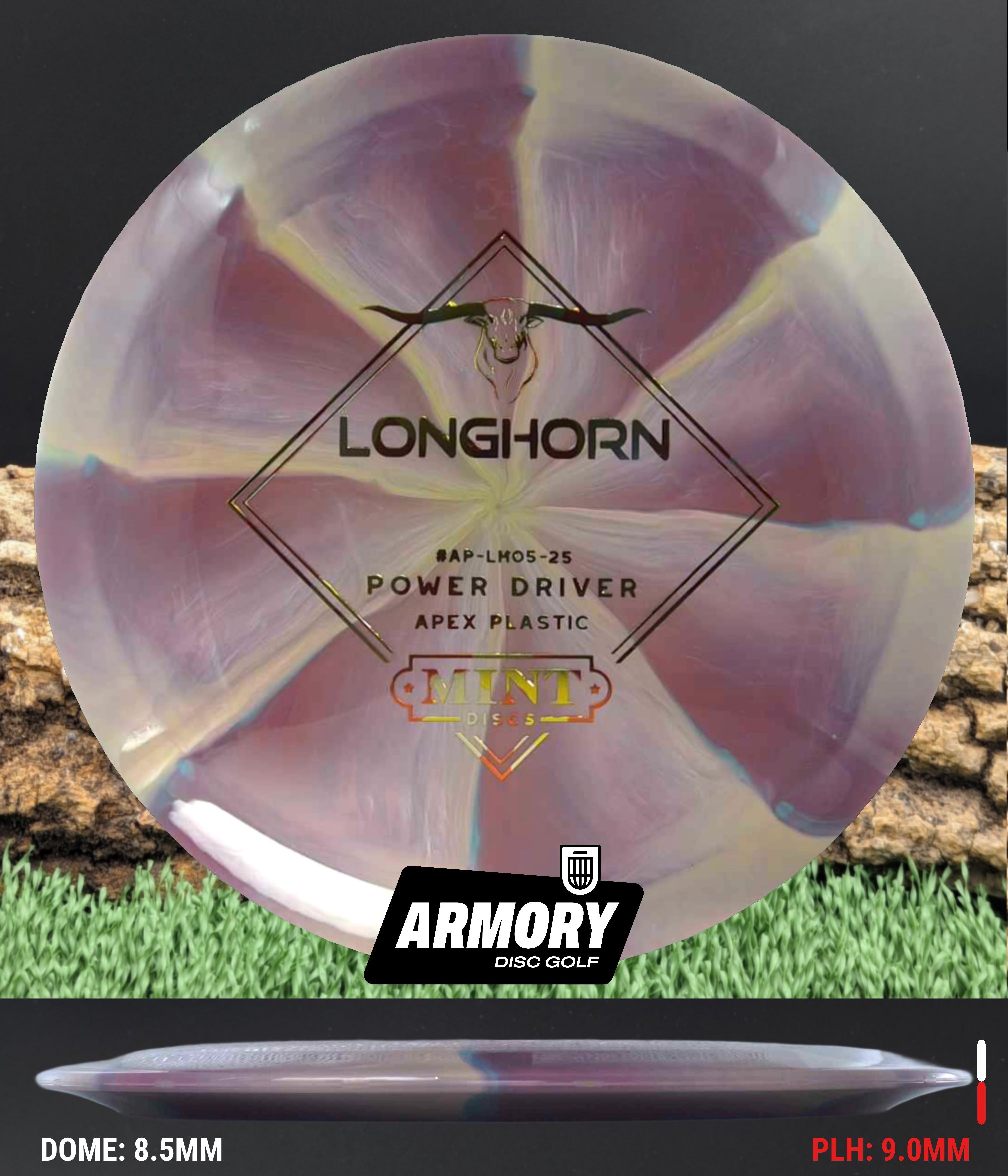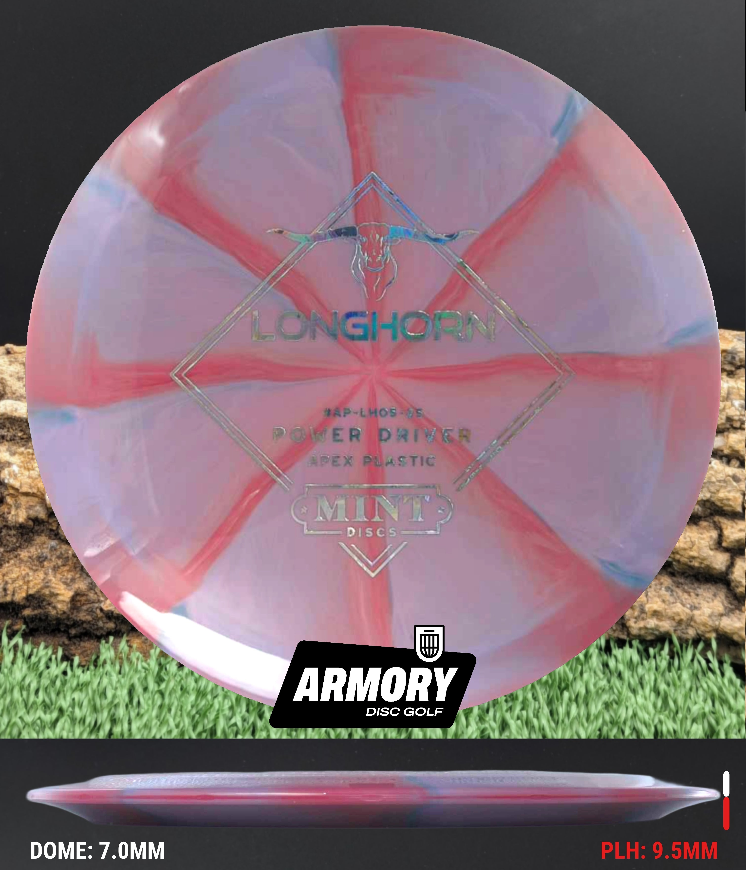 The Longhorn sits squarely in the lineup as Mint’s second distance driver: a fast, controllable option that gives developing and powerful throwers the ability to controlled hyzers while still keeping enough stability to handle tricky wind and torque. Produced by MVP and tuned for consistent performance, the Longhorn’s profile is crafted to deliver usable distance without demanding elite arm speed.