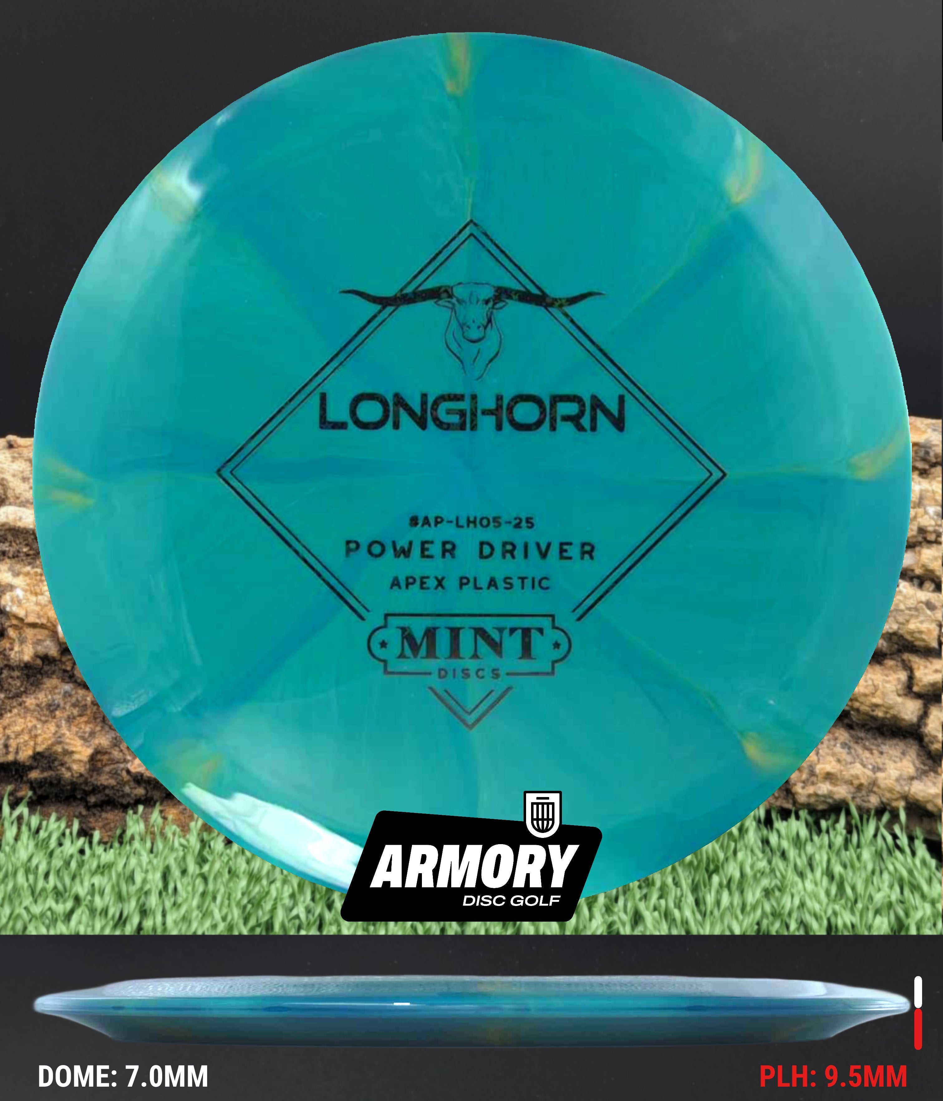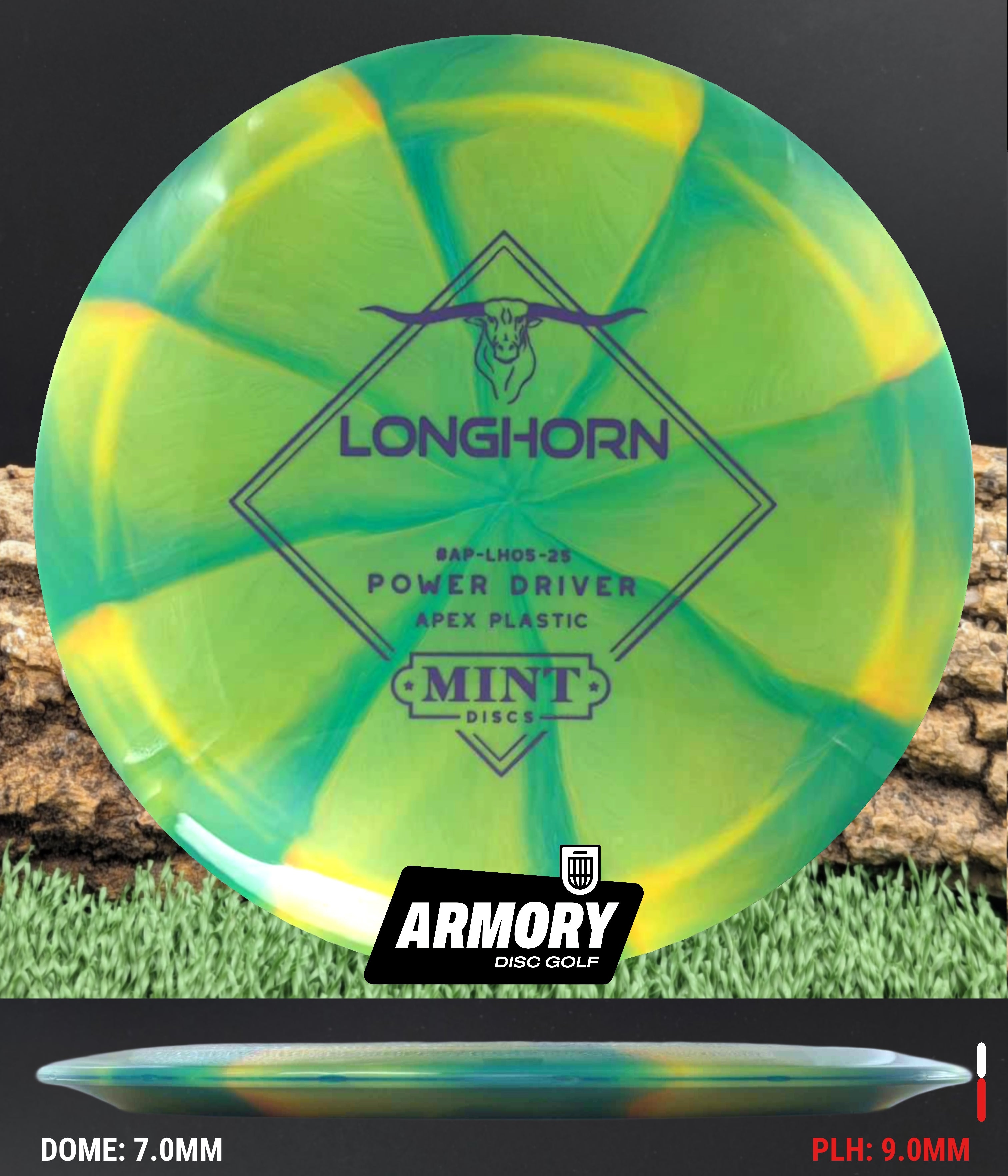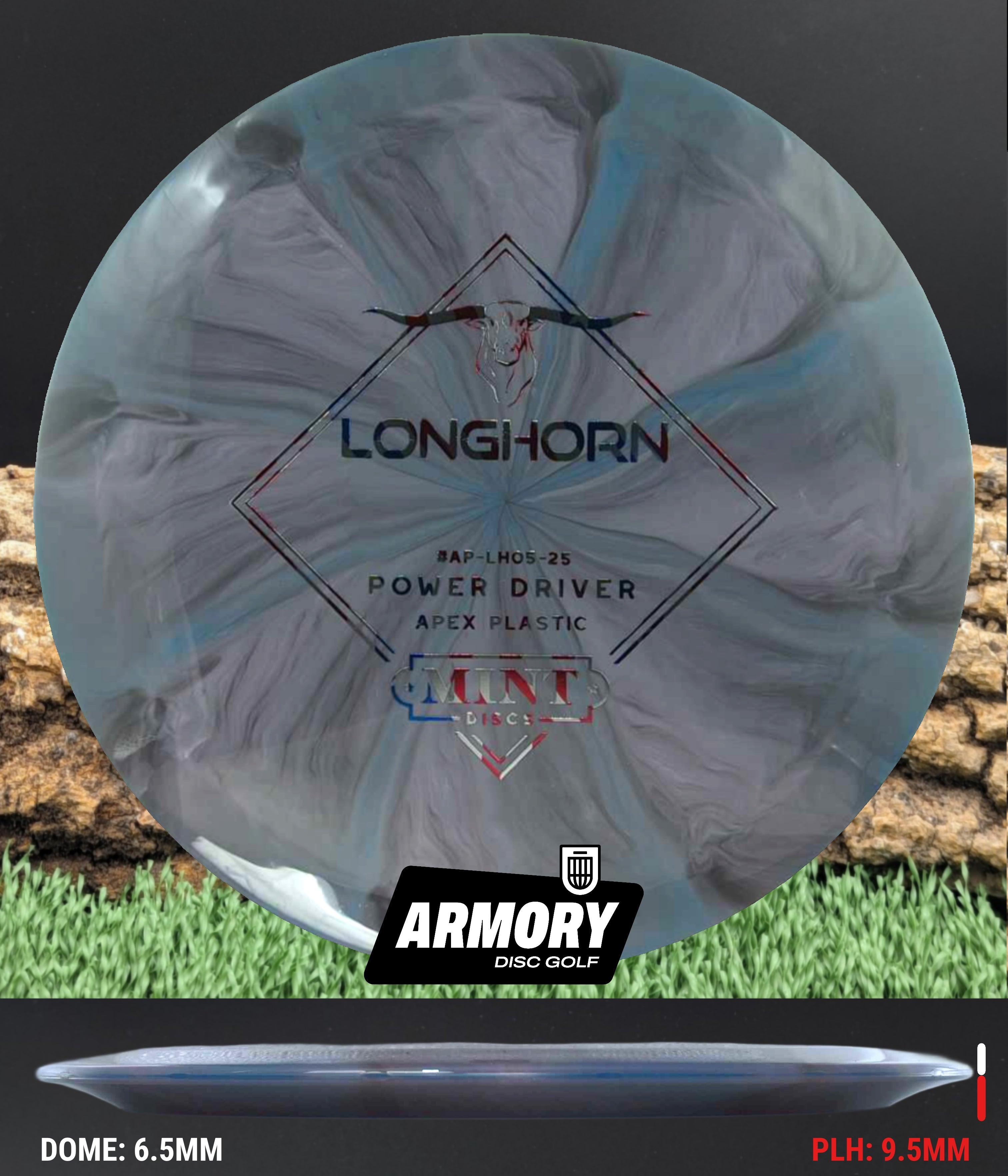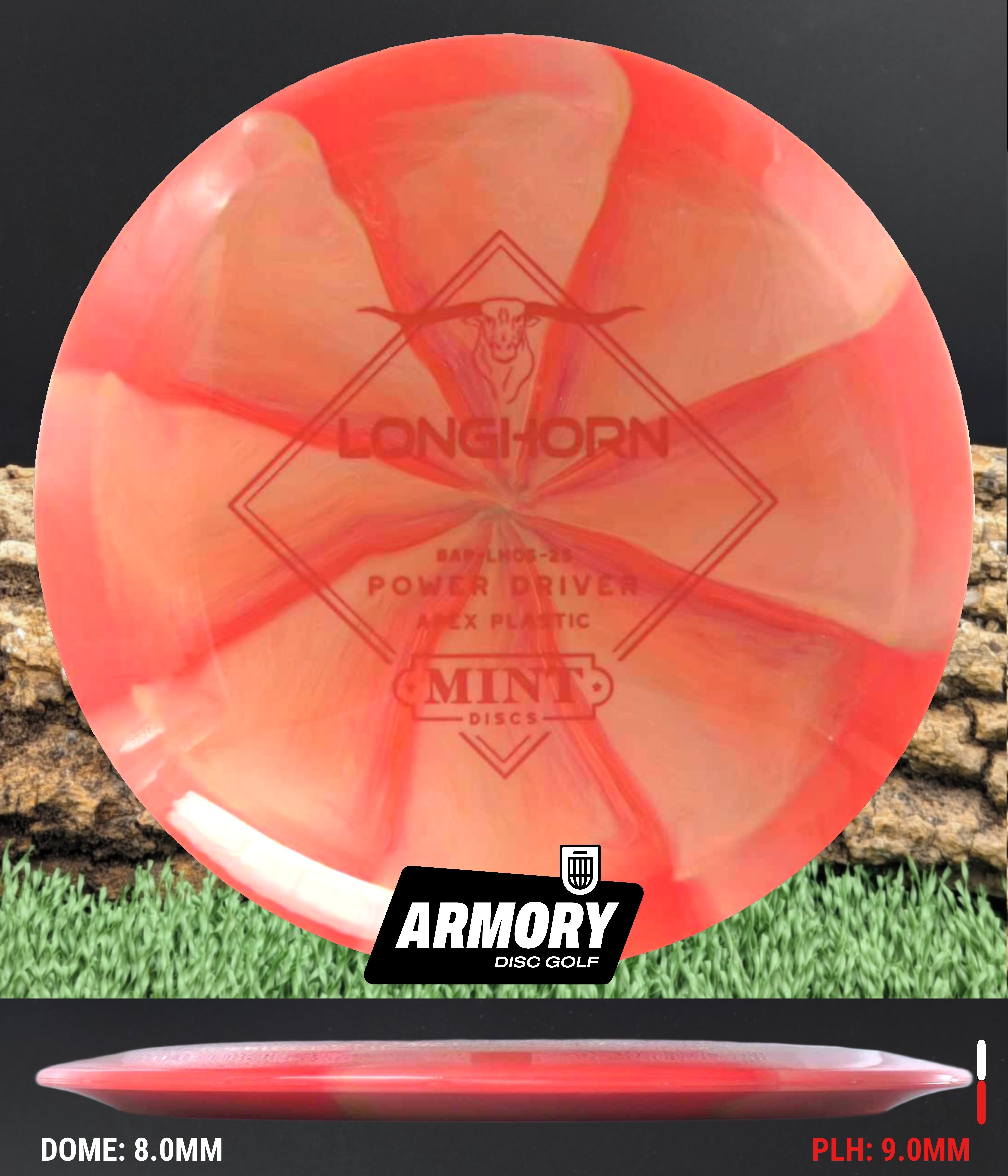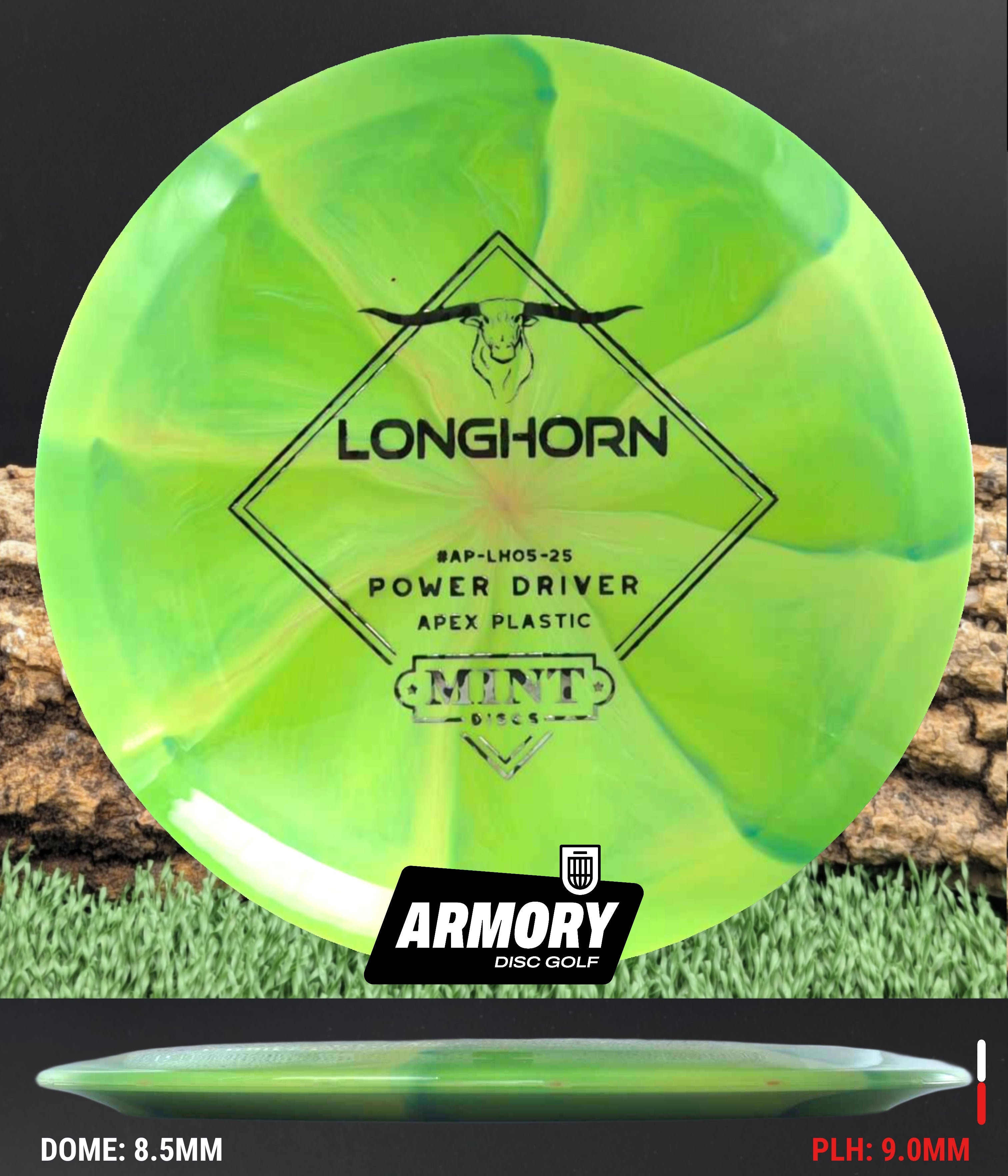 The Longhorn sits squarely in the lineup as Mint’s second distance driver: a fast, controllable option that gives developing and powerful throwers the ability to controlled hyzers while still keeping enough stability to handle tricky wind and torque. Produced by MVP and tuned for consistent performance, the Longhorn’s profile is crafted to deliver usable distance without demanding elite arm speed.