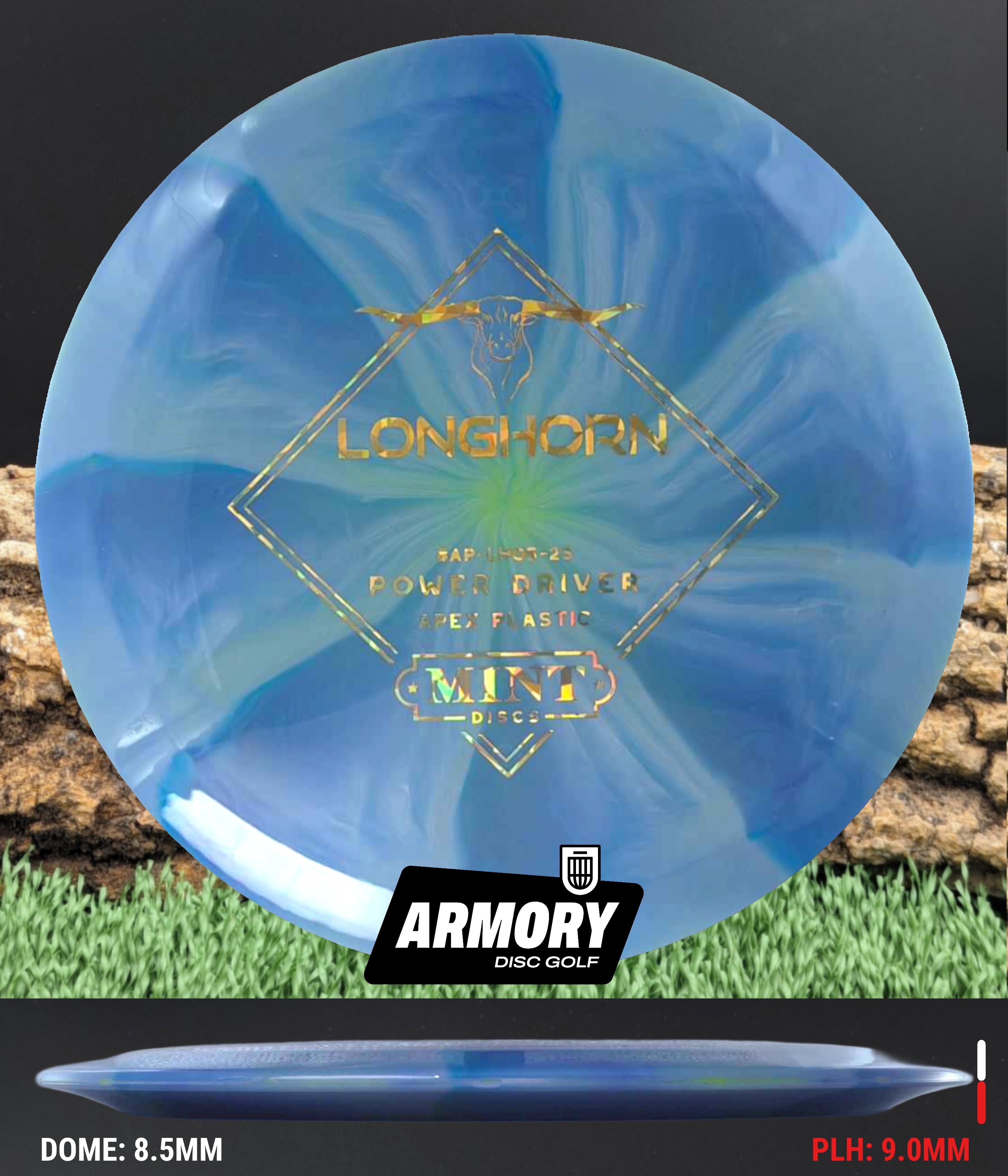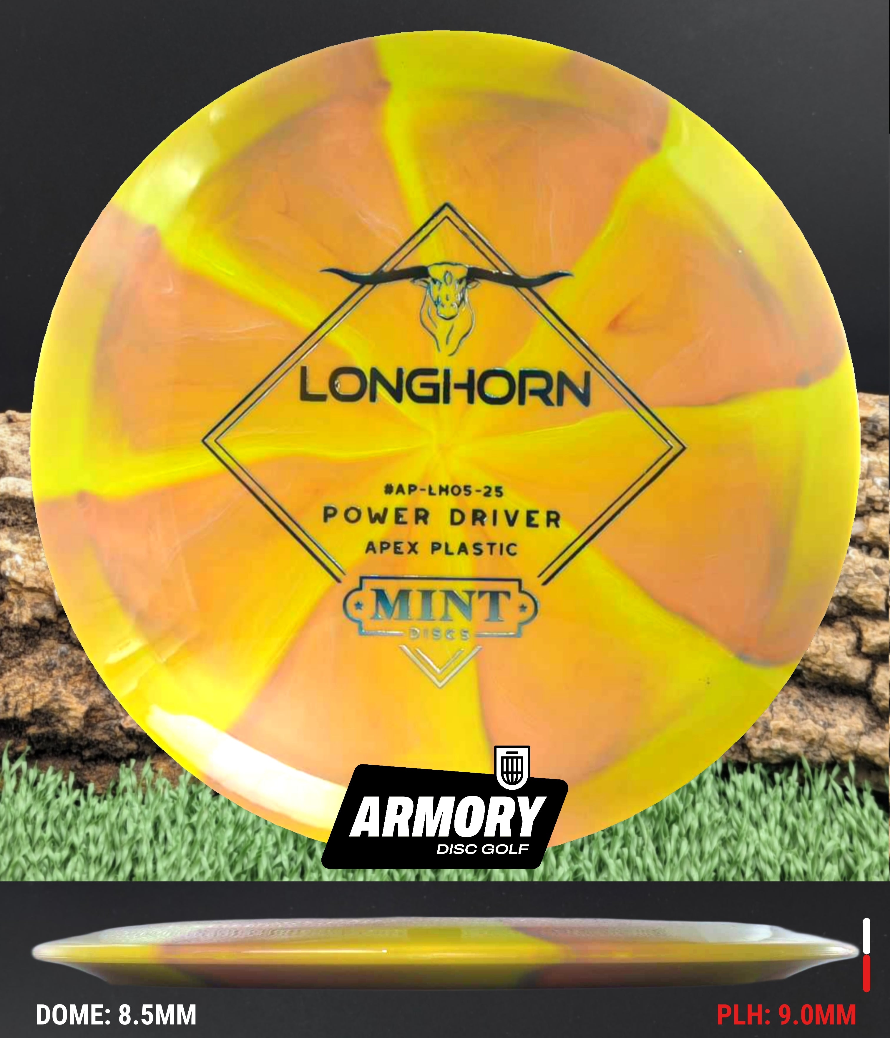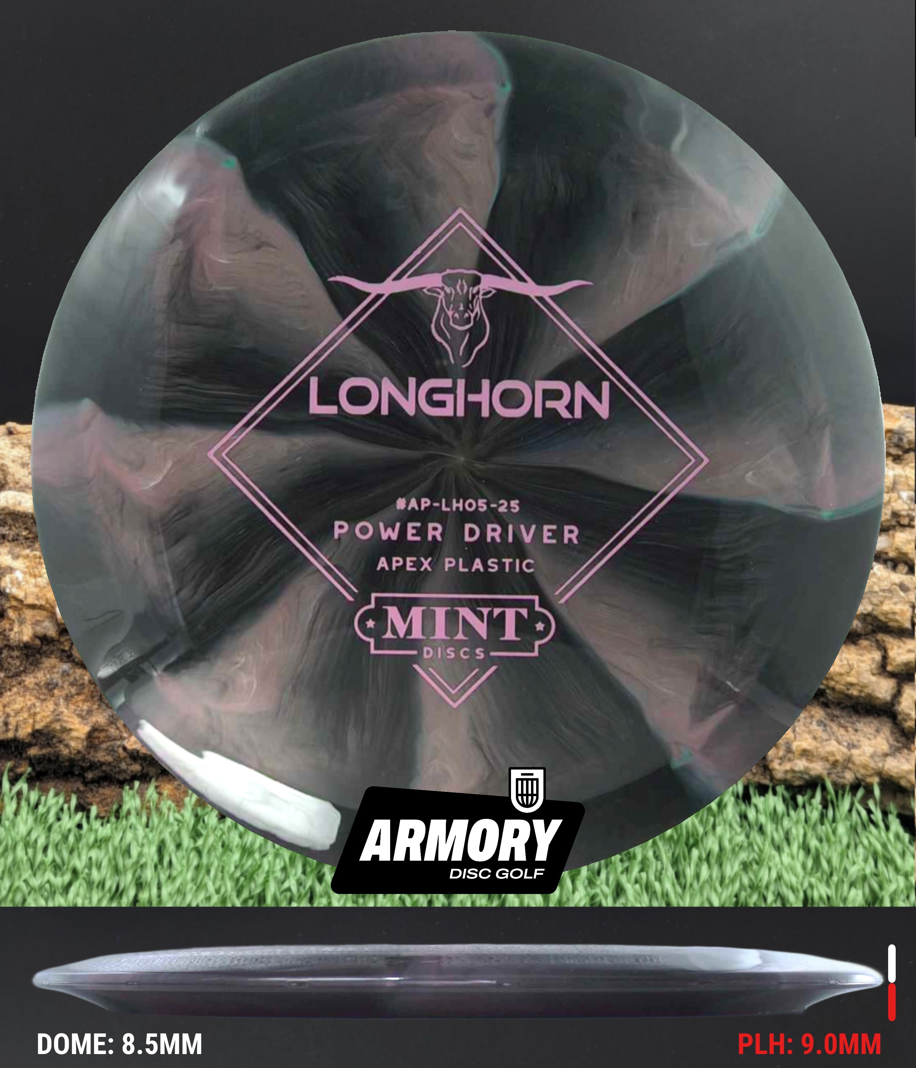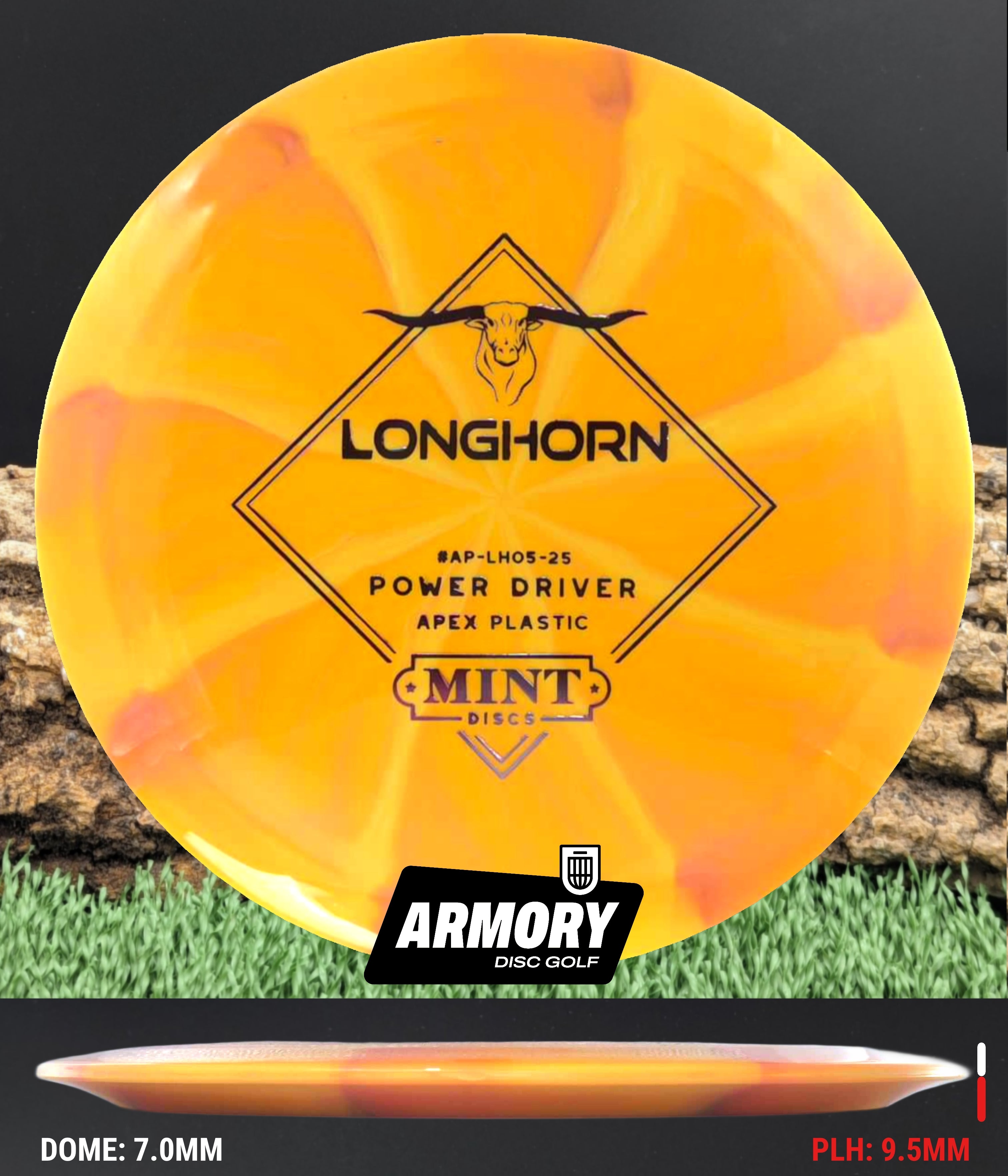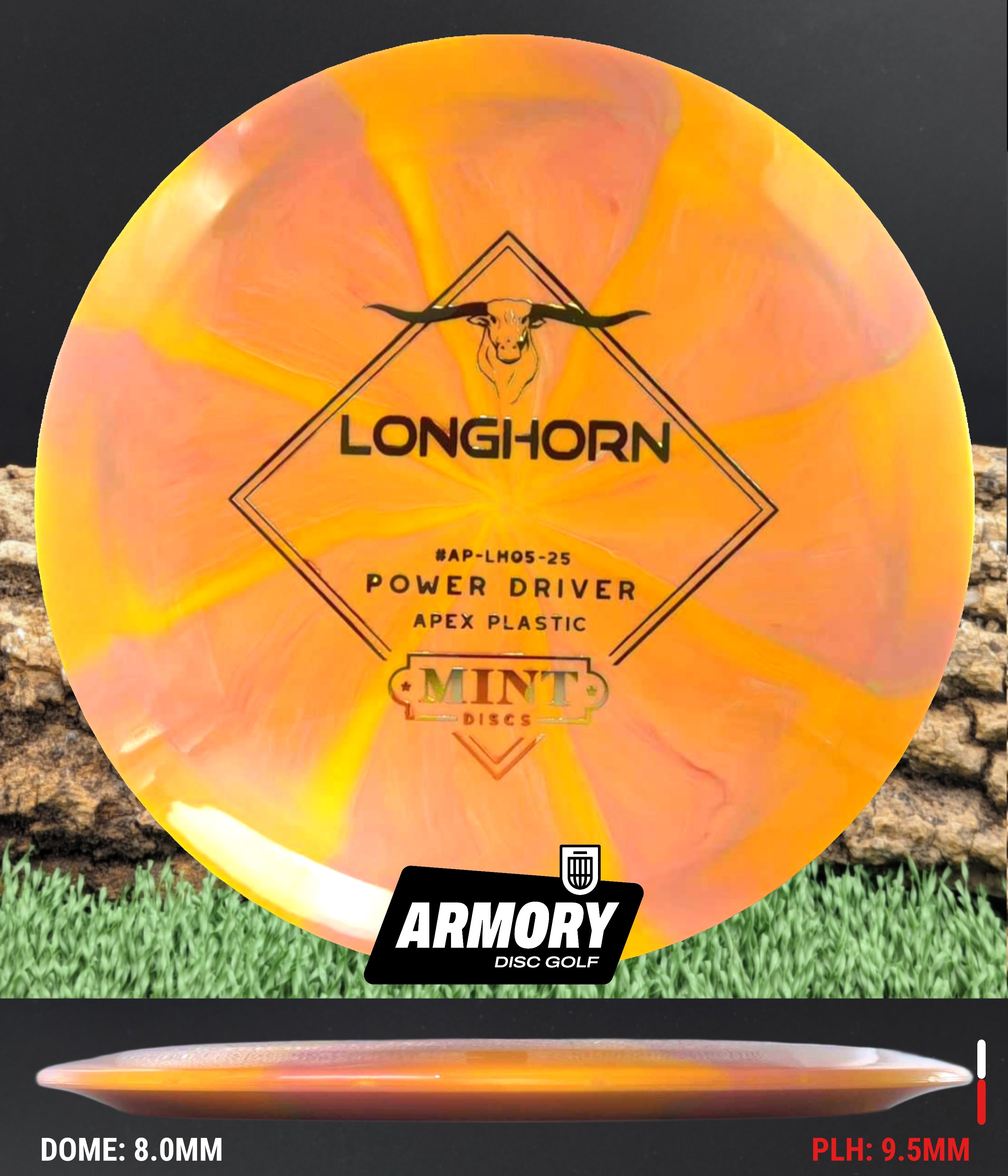 The Longhorn sits squarely in the lineup as Mint’s second distance driver: a fast, controllable option that gives developing and powerful throwers the ability to controlled hyzers while still keeping enough stability to handle tricky wind and torque. Produced by MVP and tuned for consistent performance, the Longhorn’s profile is crafted to deliver usable distance without demanding elite arm speed.