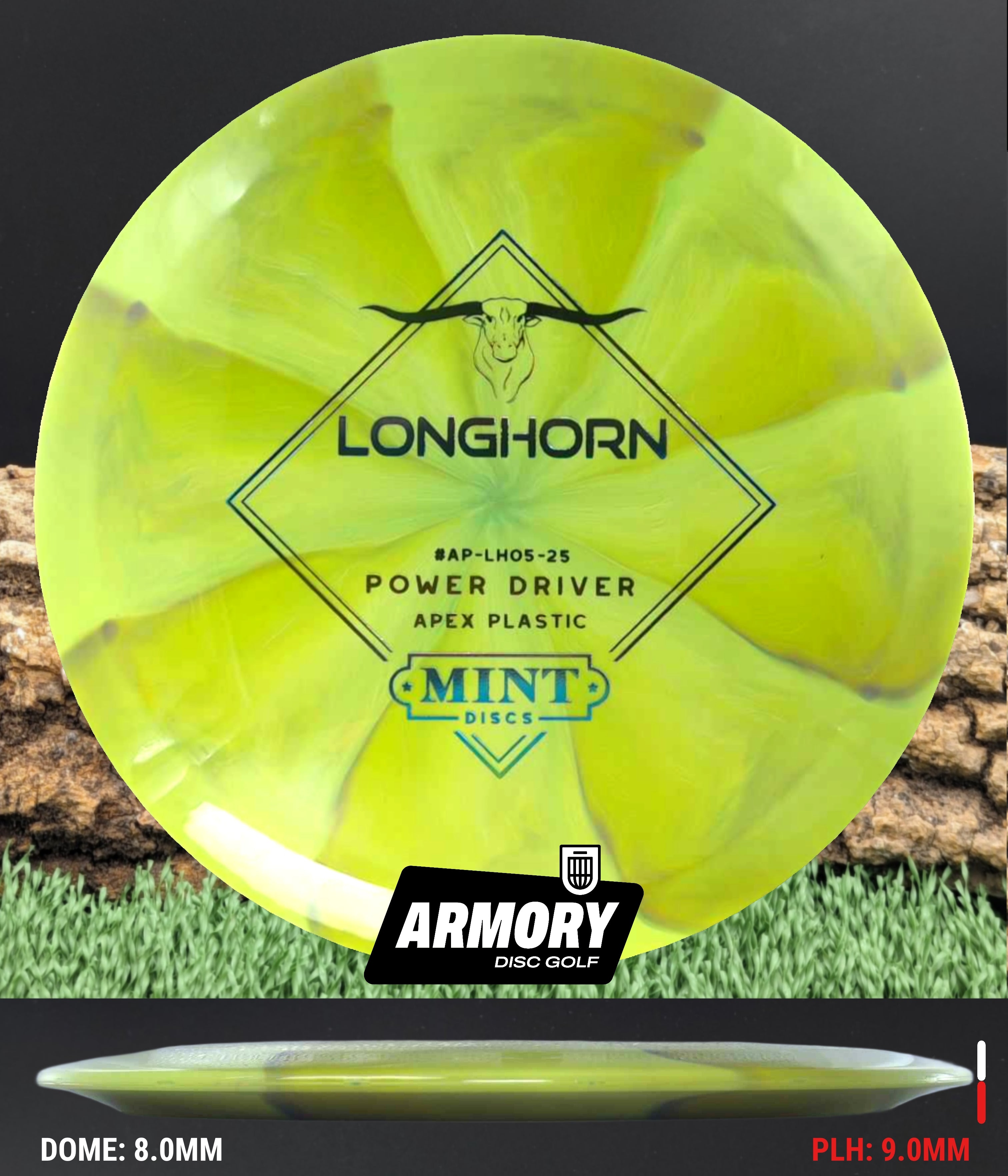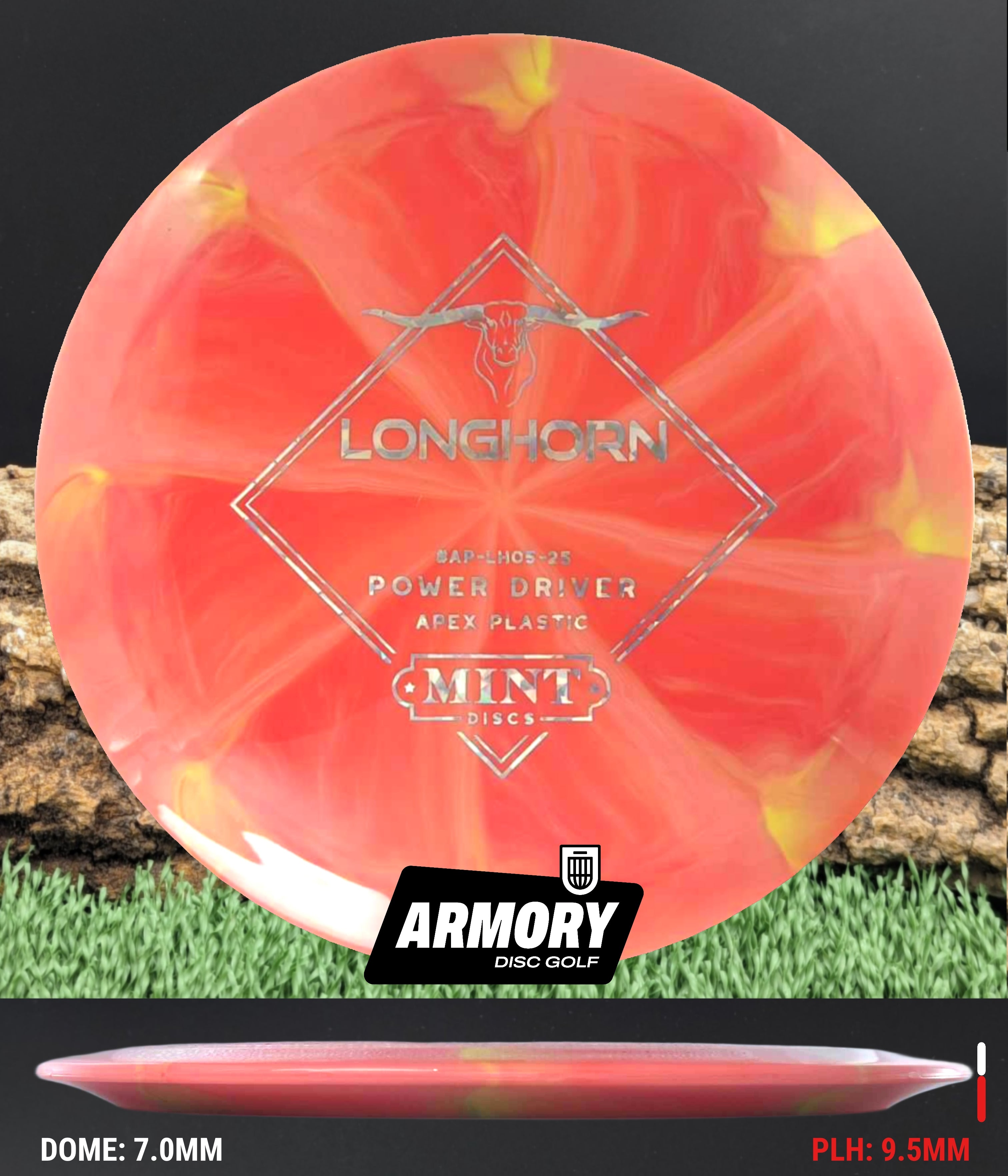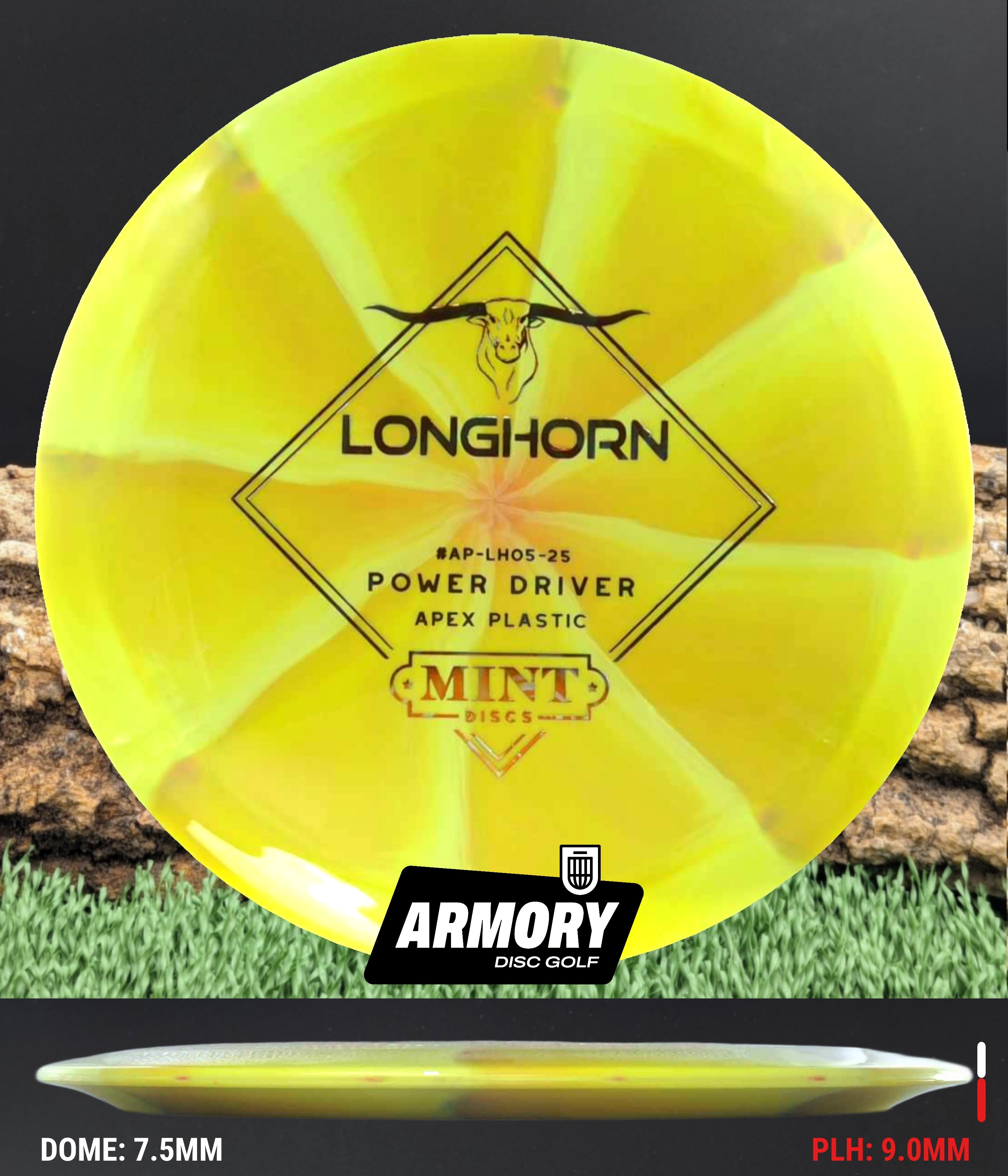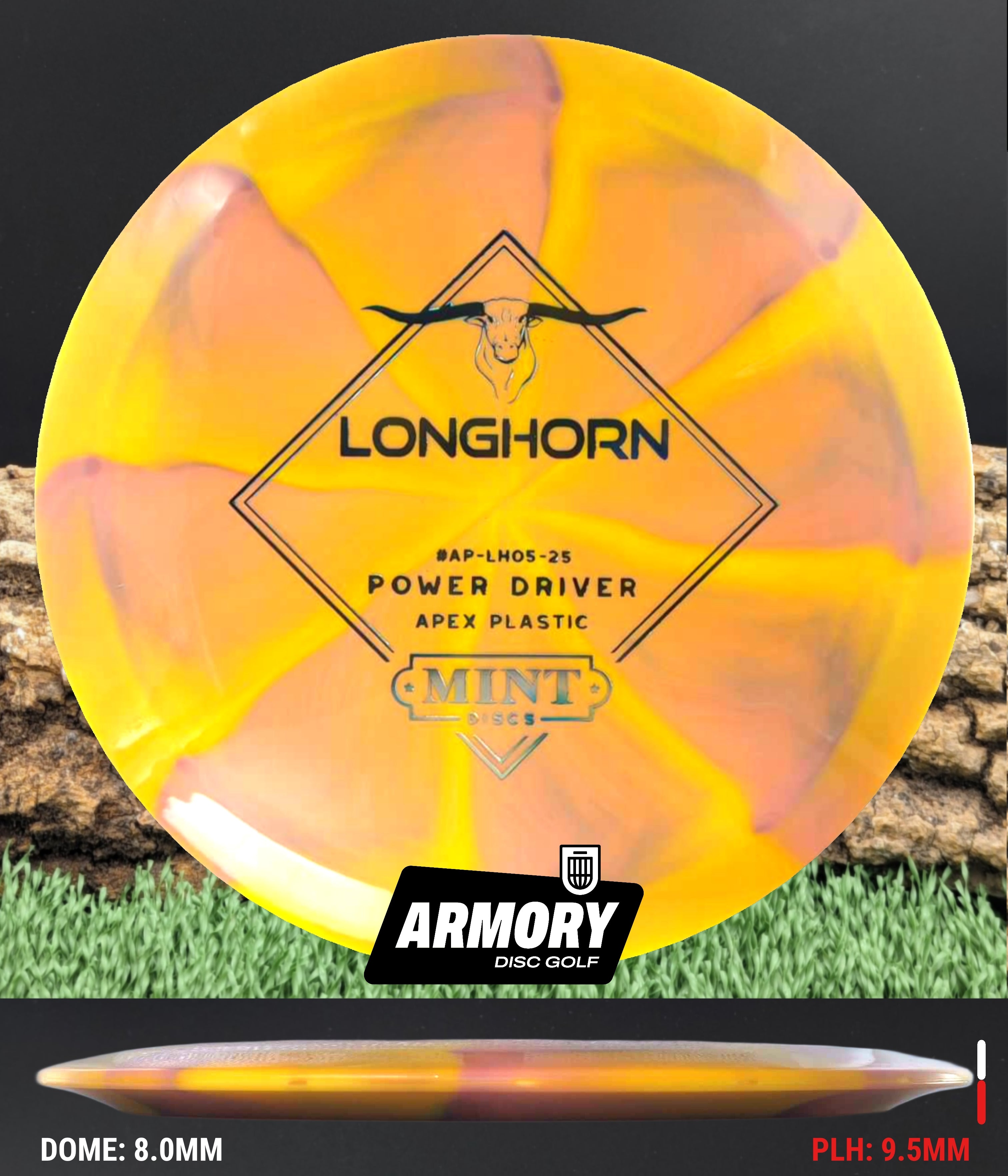 The Longhorn sits squarely in the lineup as Mint’s second distance driver: a fast, controllable option that gives developing and powerful throwers the ability to controlled hyzers while still keeping enough stability to handle tricky wind and torque. Produced by MVP and tuned for consistent performance, the Longhorn’s profile is crafted to deliver usable distance without demanding elite arm speed.