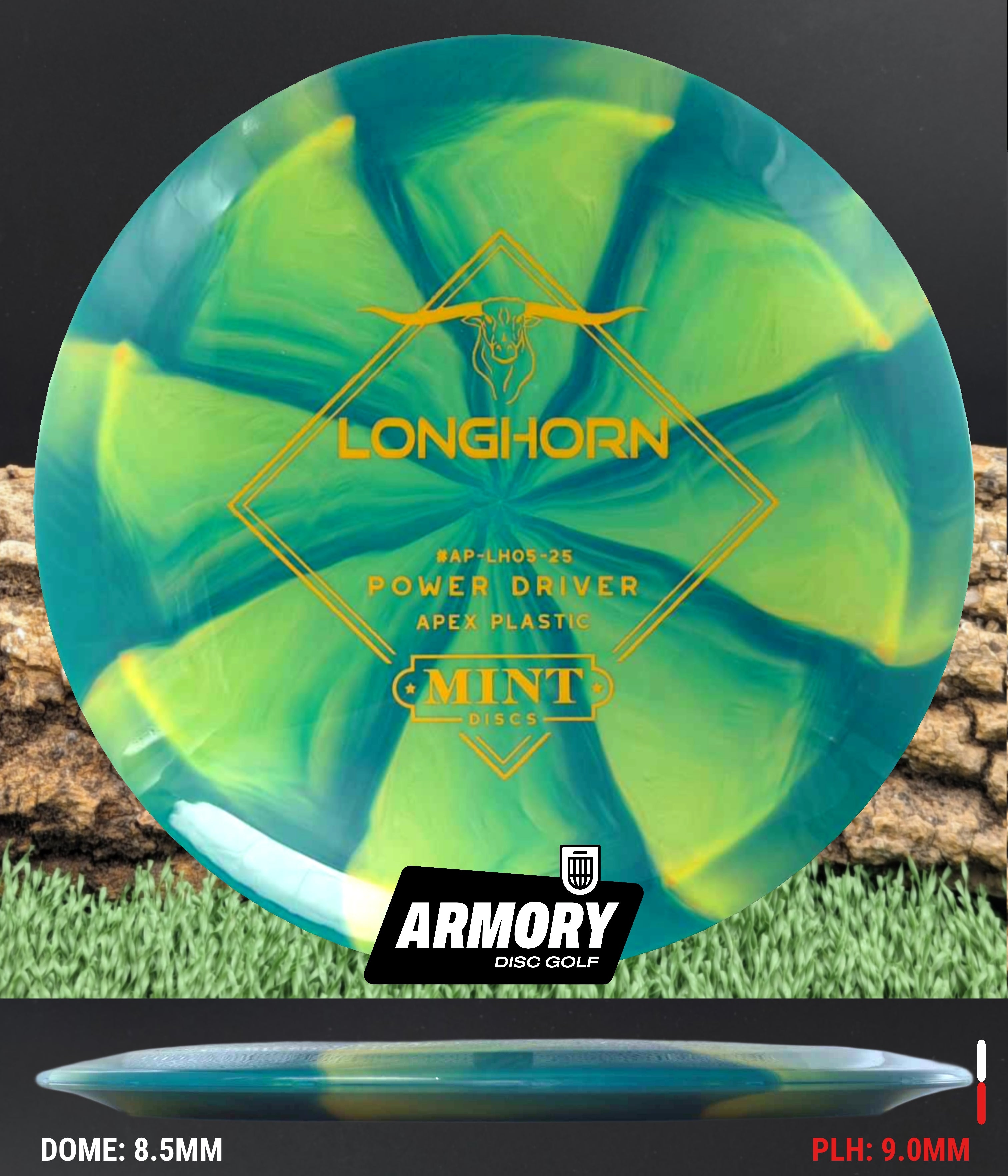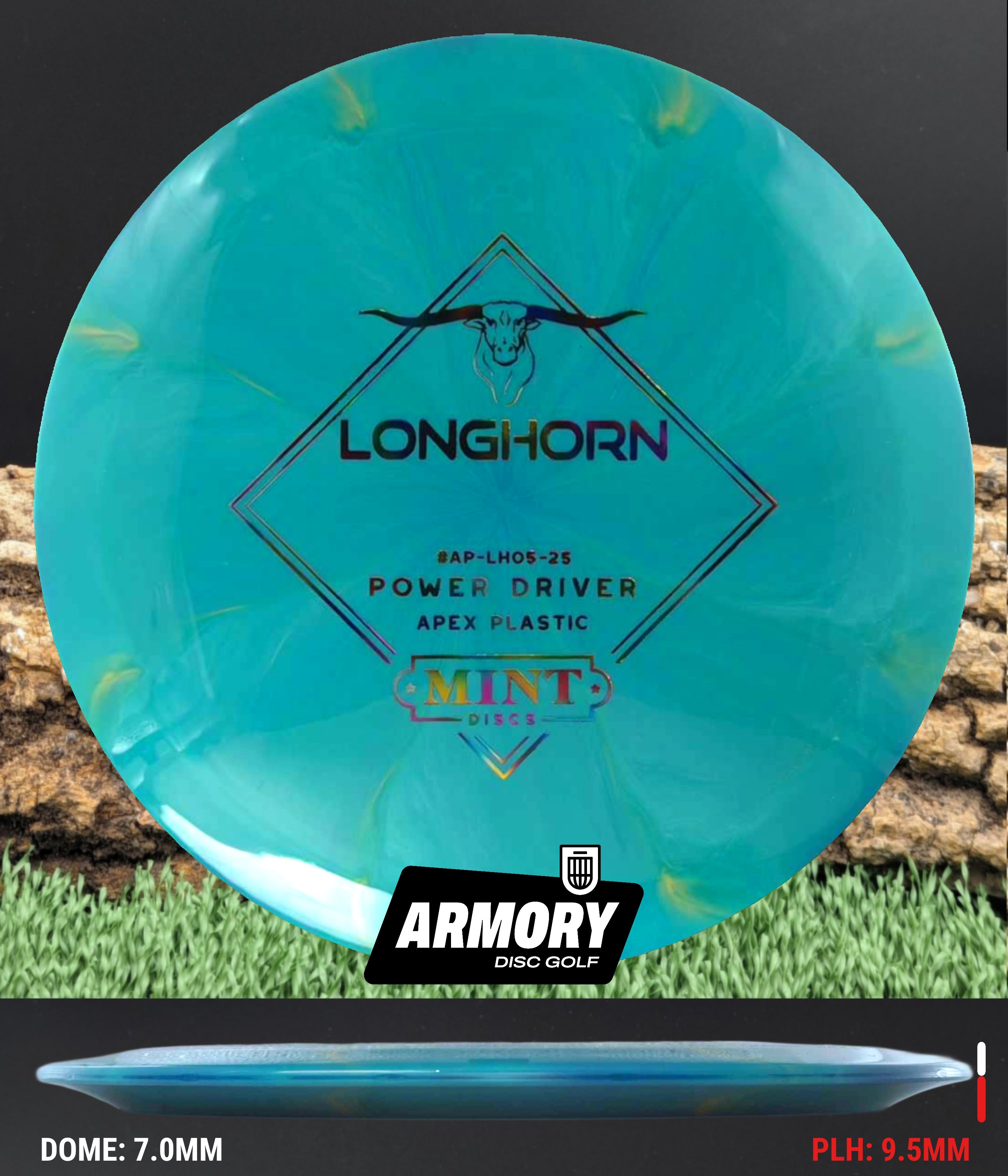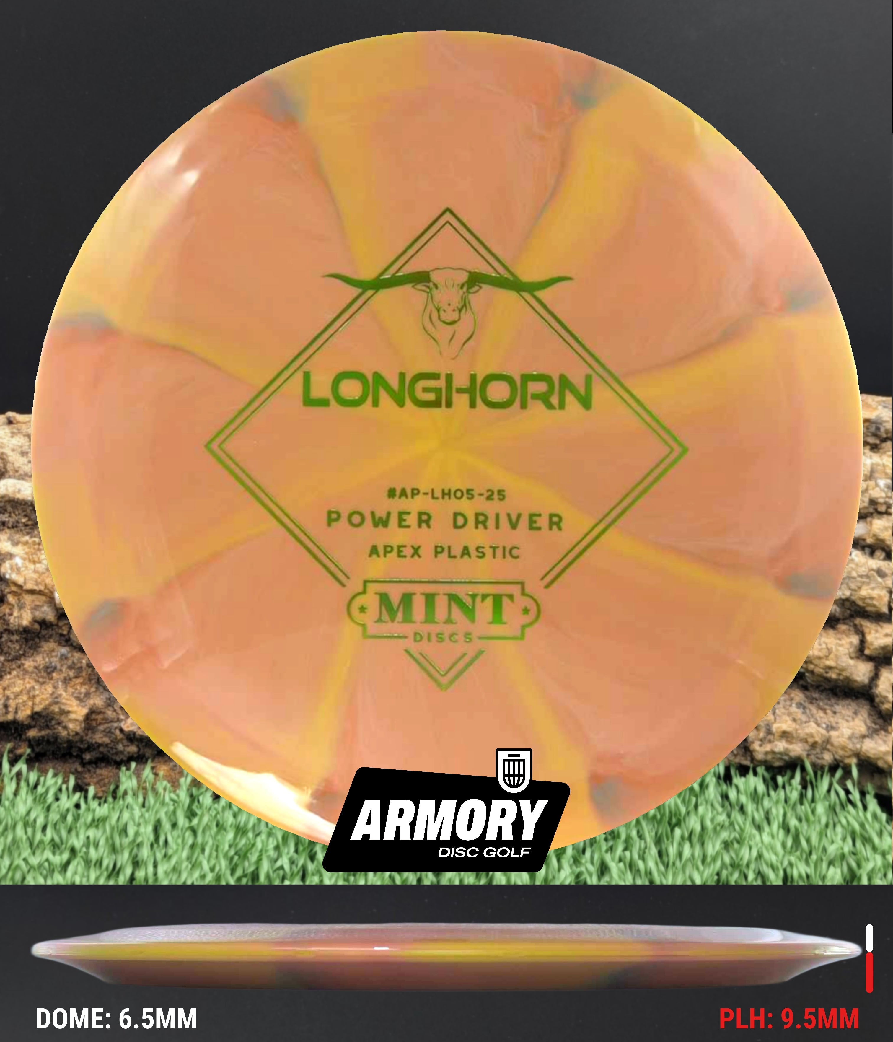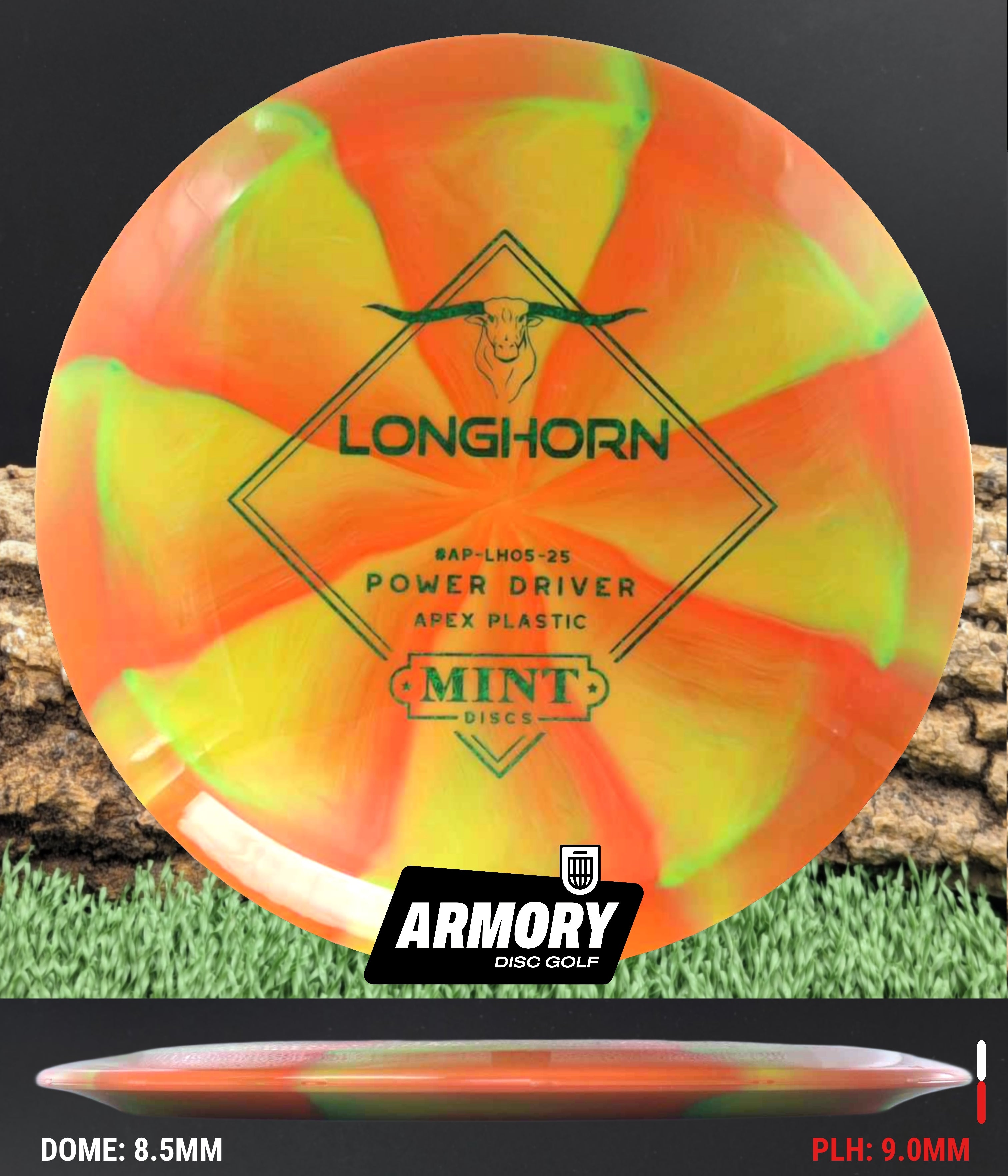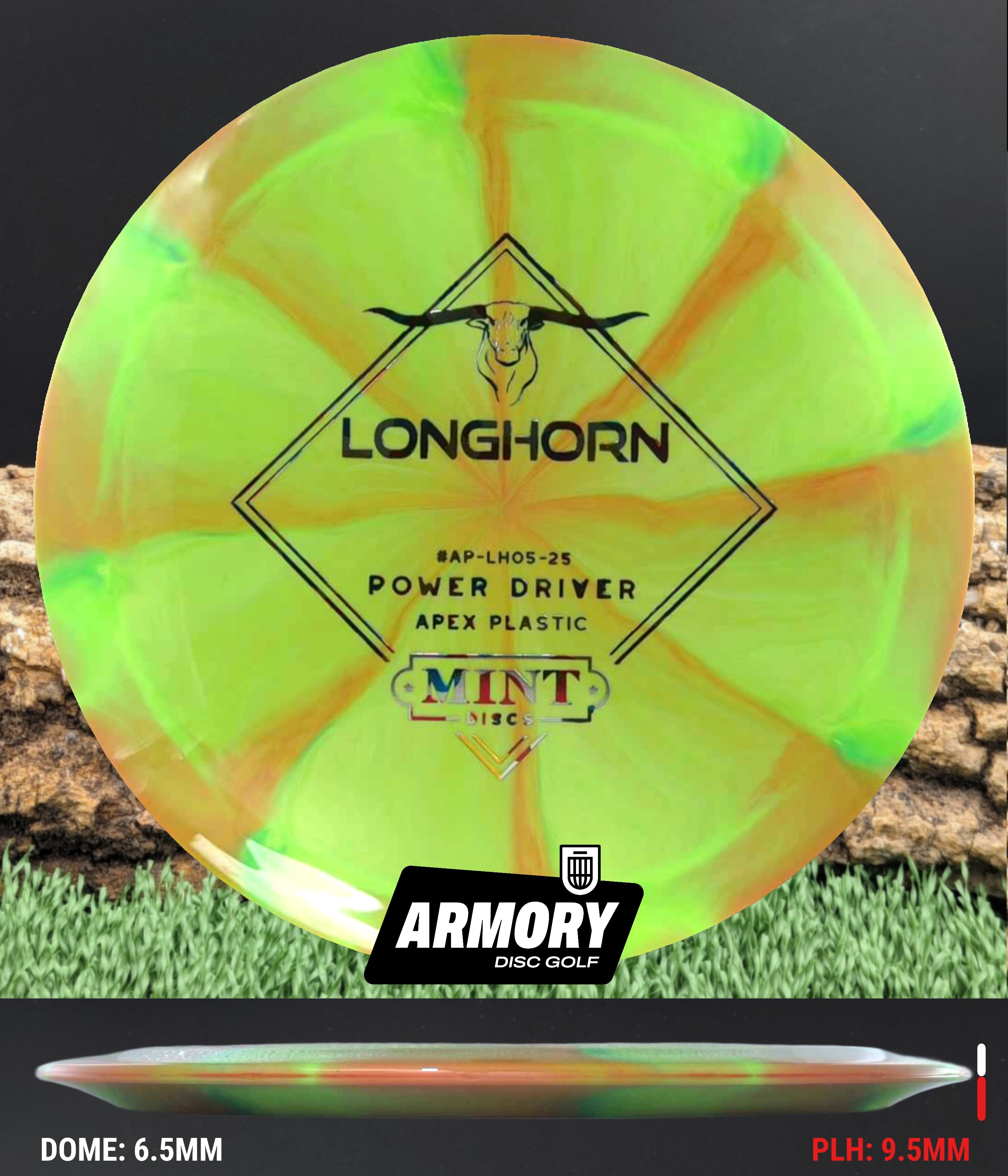 The Longhorn sits squarely in the lineup as Mint’s second distance driver: a fast, controllable option that gives developing and powerful throwers the ability to controlled hyzers while still keeping enough stability to handle tricky wind and torque. Produced by MVP and tuned for consistent performance, the Longhorn’s profile is crafted to deliver usable distance without demanding elite arm speed.