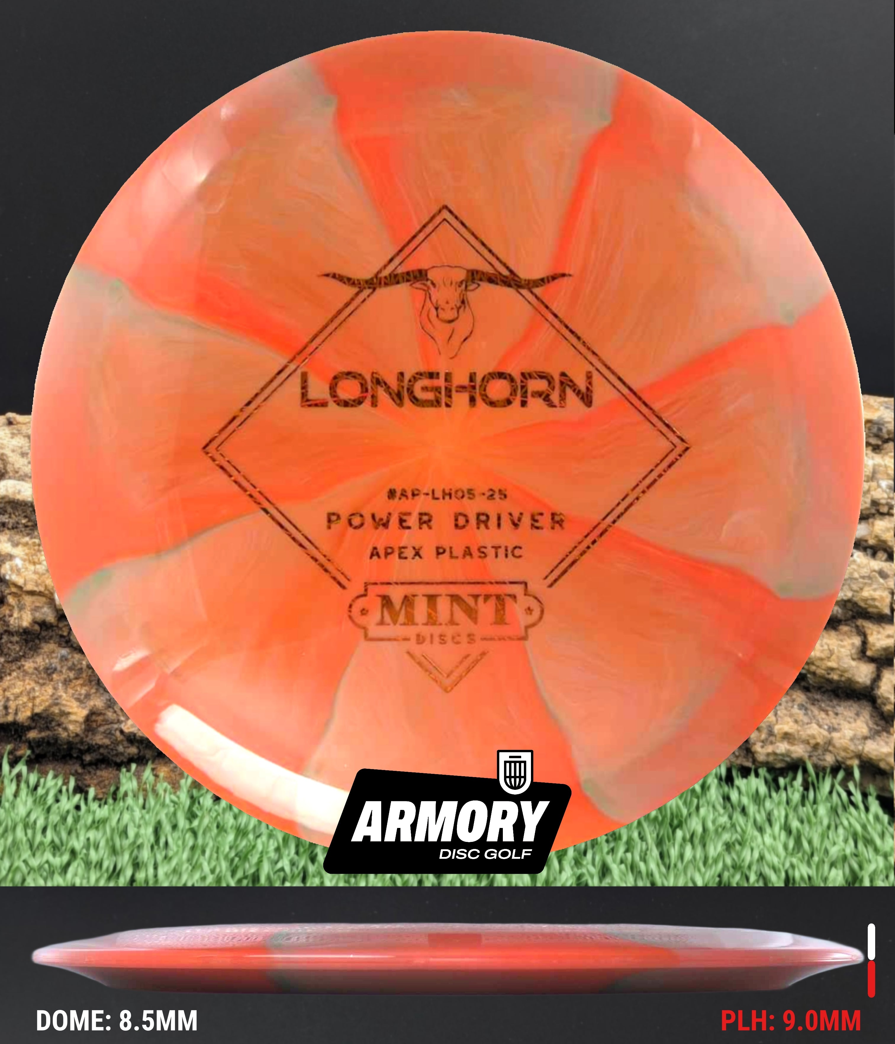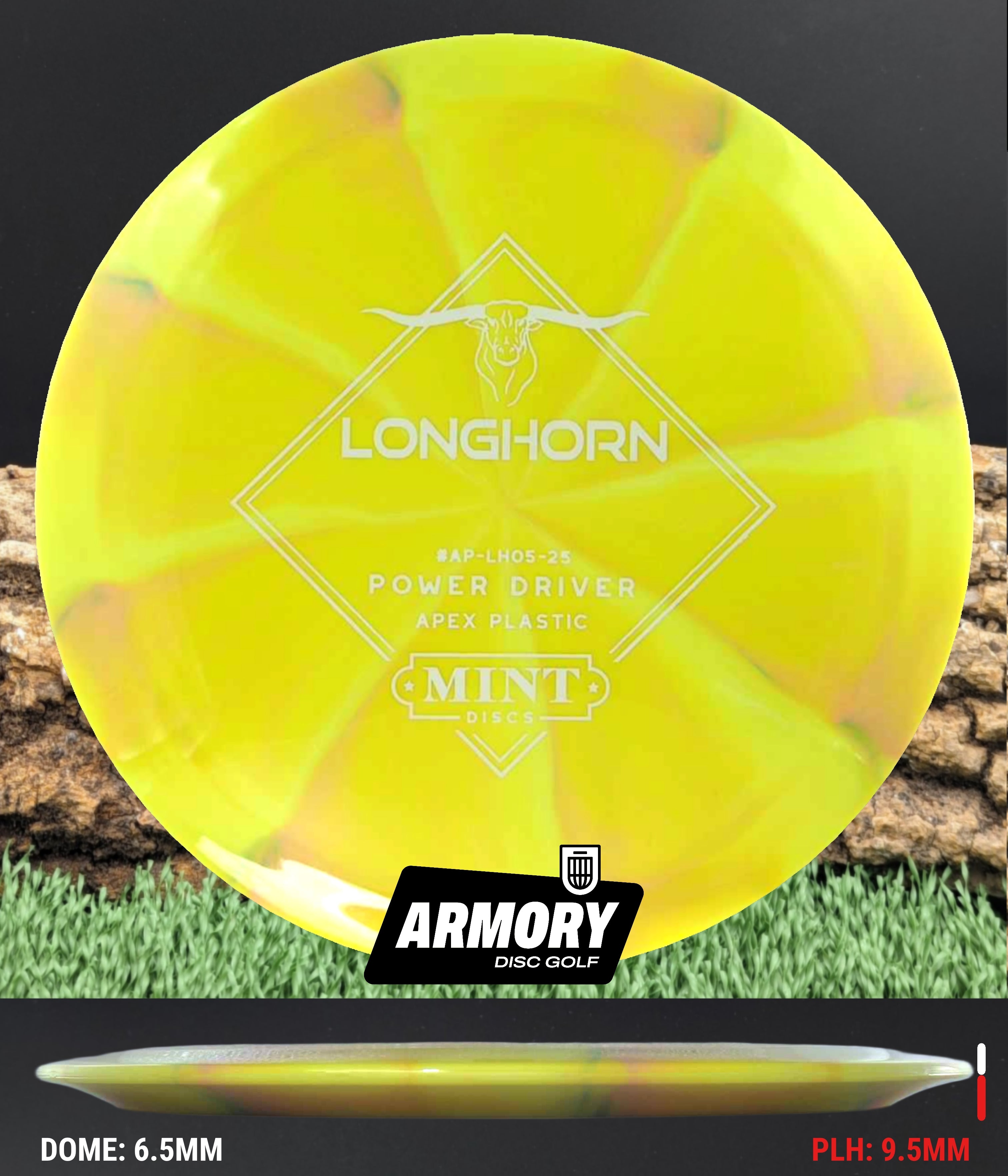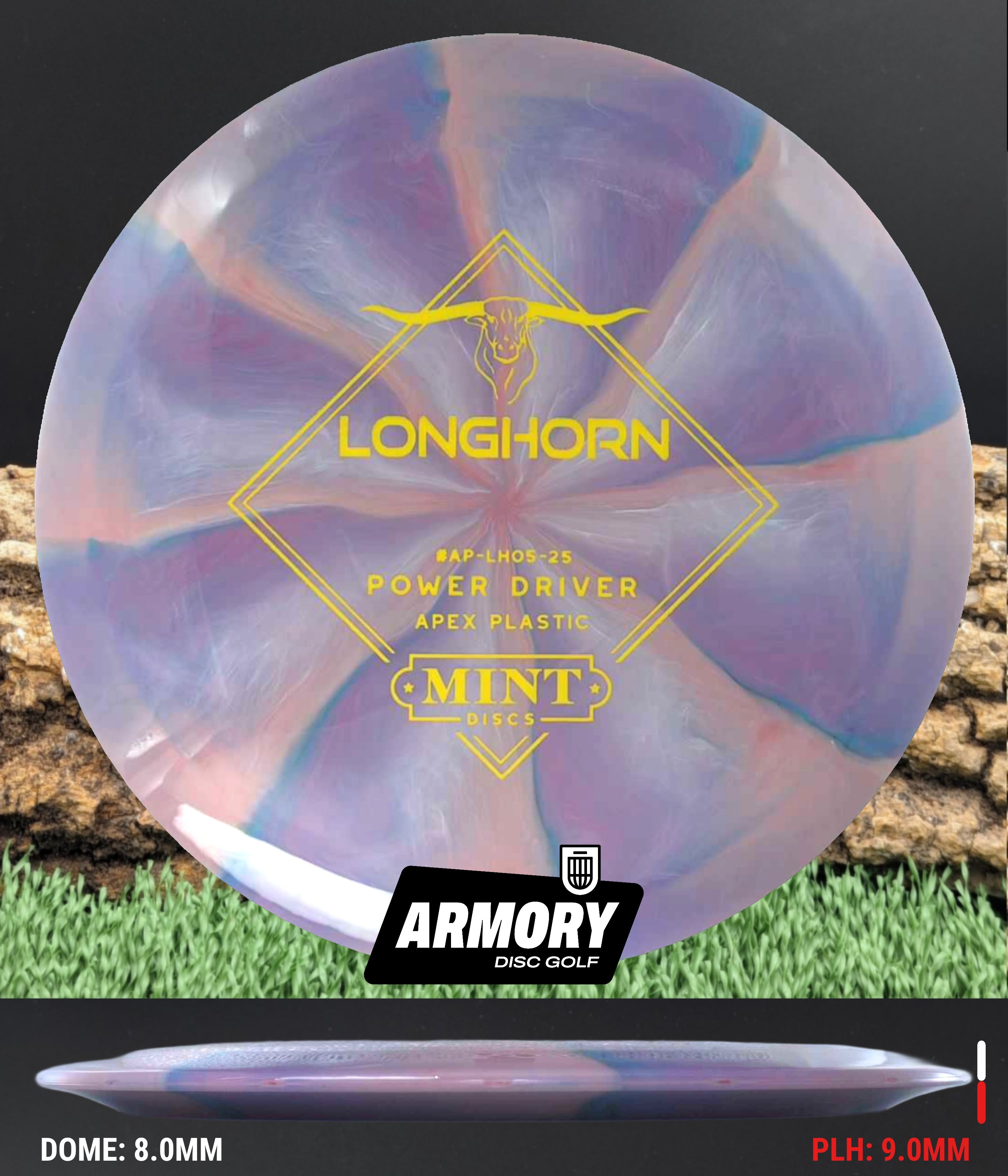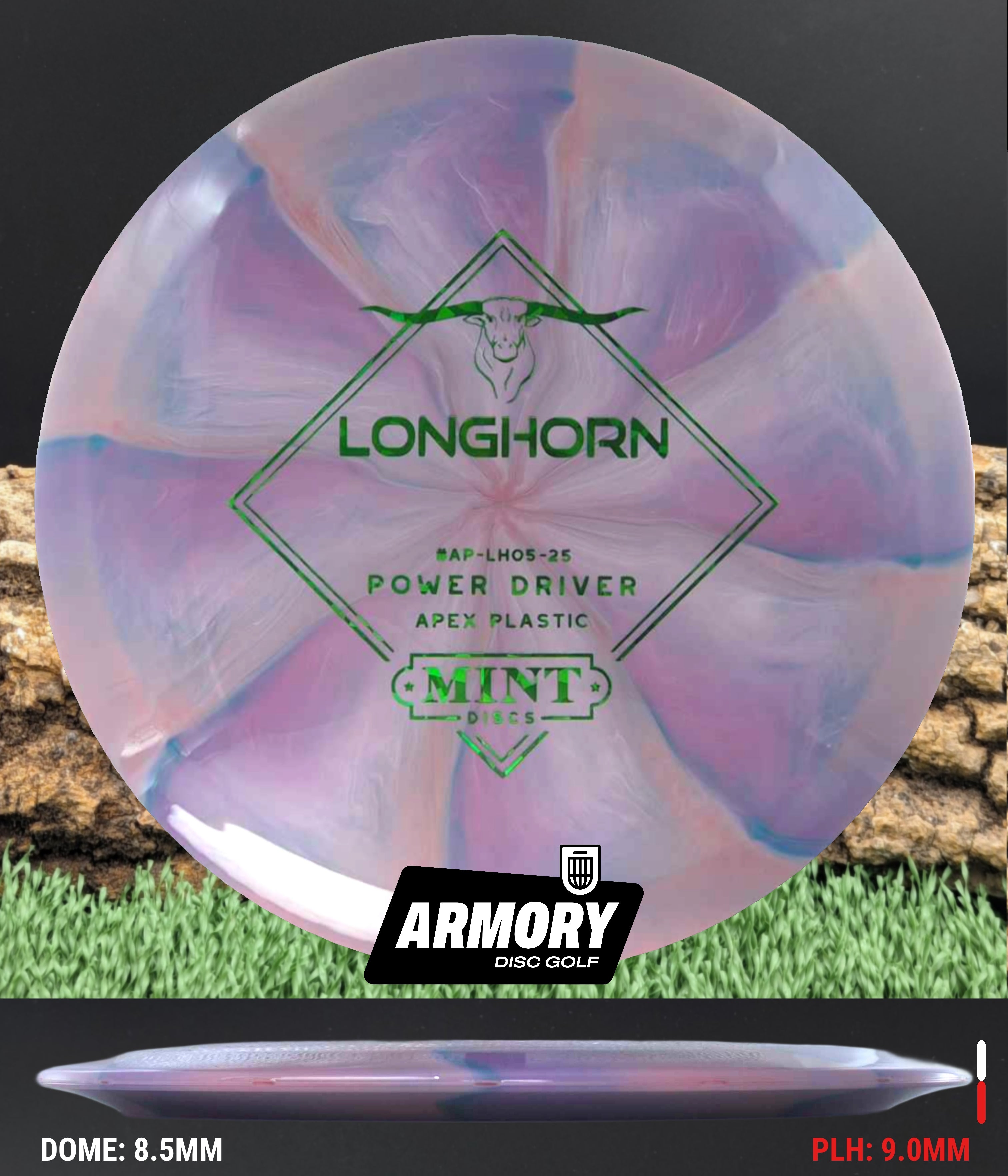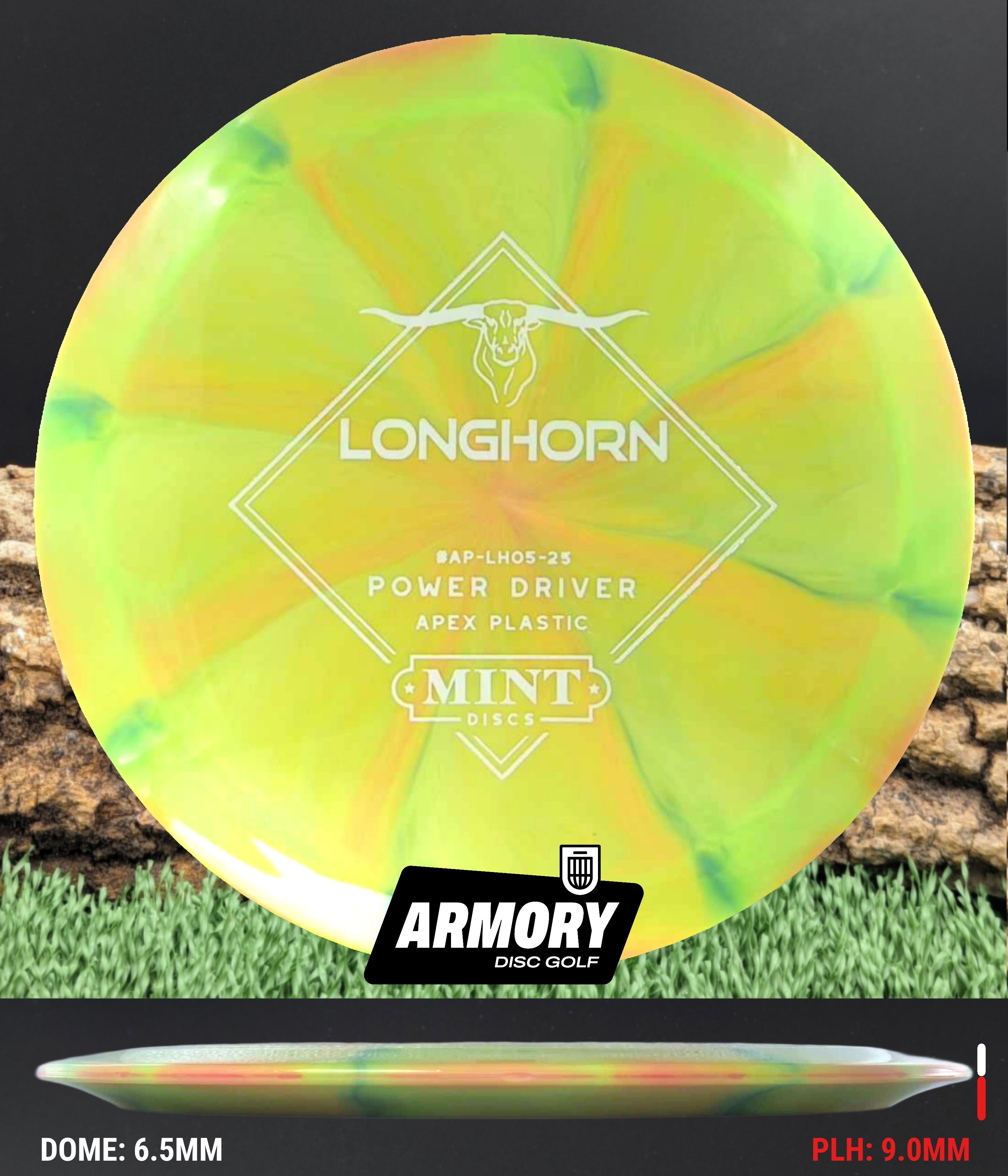 The Longhorn sits squarely in the lineup as Mint’s second distance driver: a fast, controllable option that gives developing and powerful throwers the ability to controlled hyzers while still keeping enough stability to handle tricky wind and torque. Produced by MVP and tuned for consistent performance, the Longhorn’s profile is crafted to deliver usable distance without demanding elite arm speed.