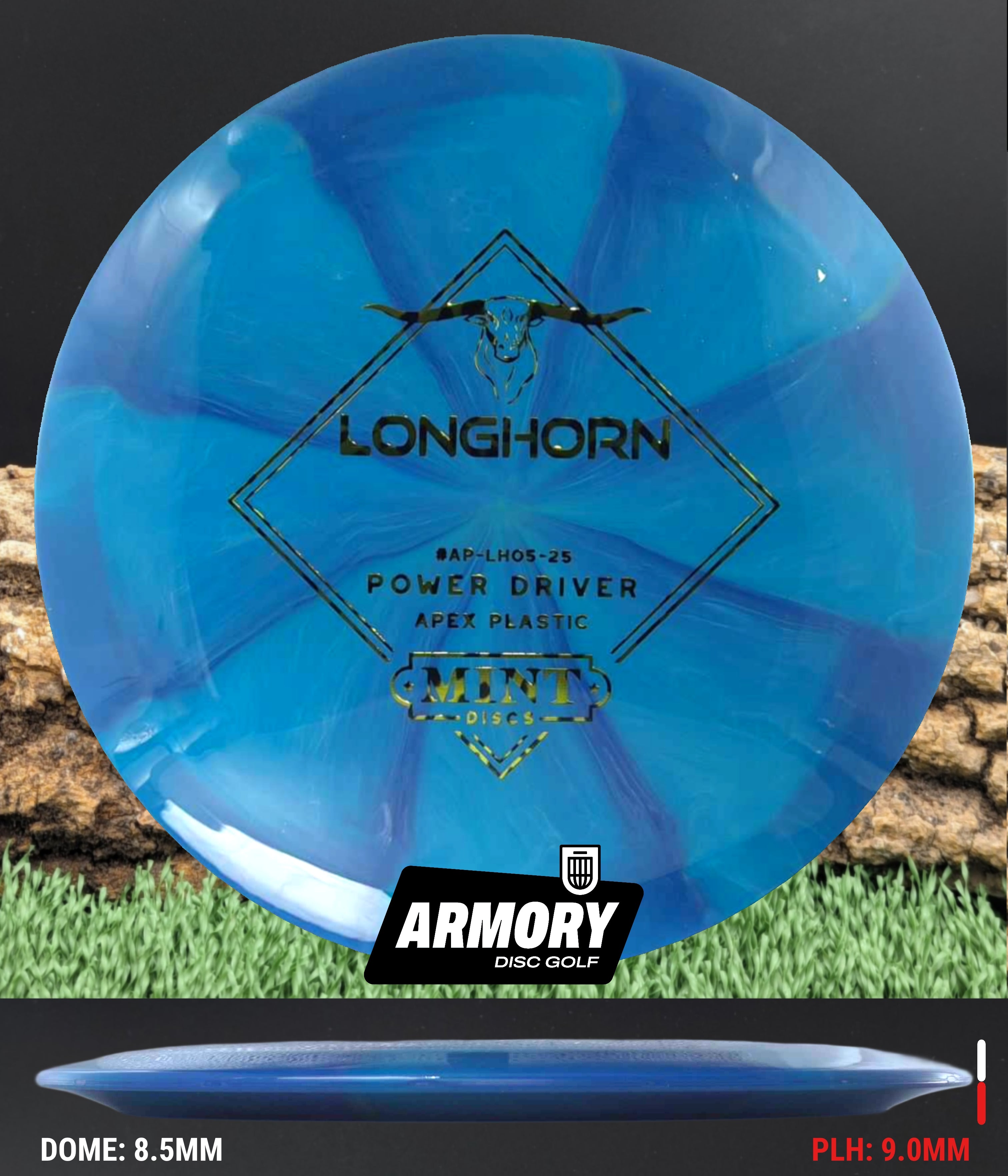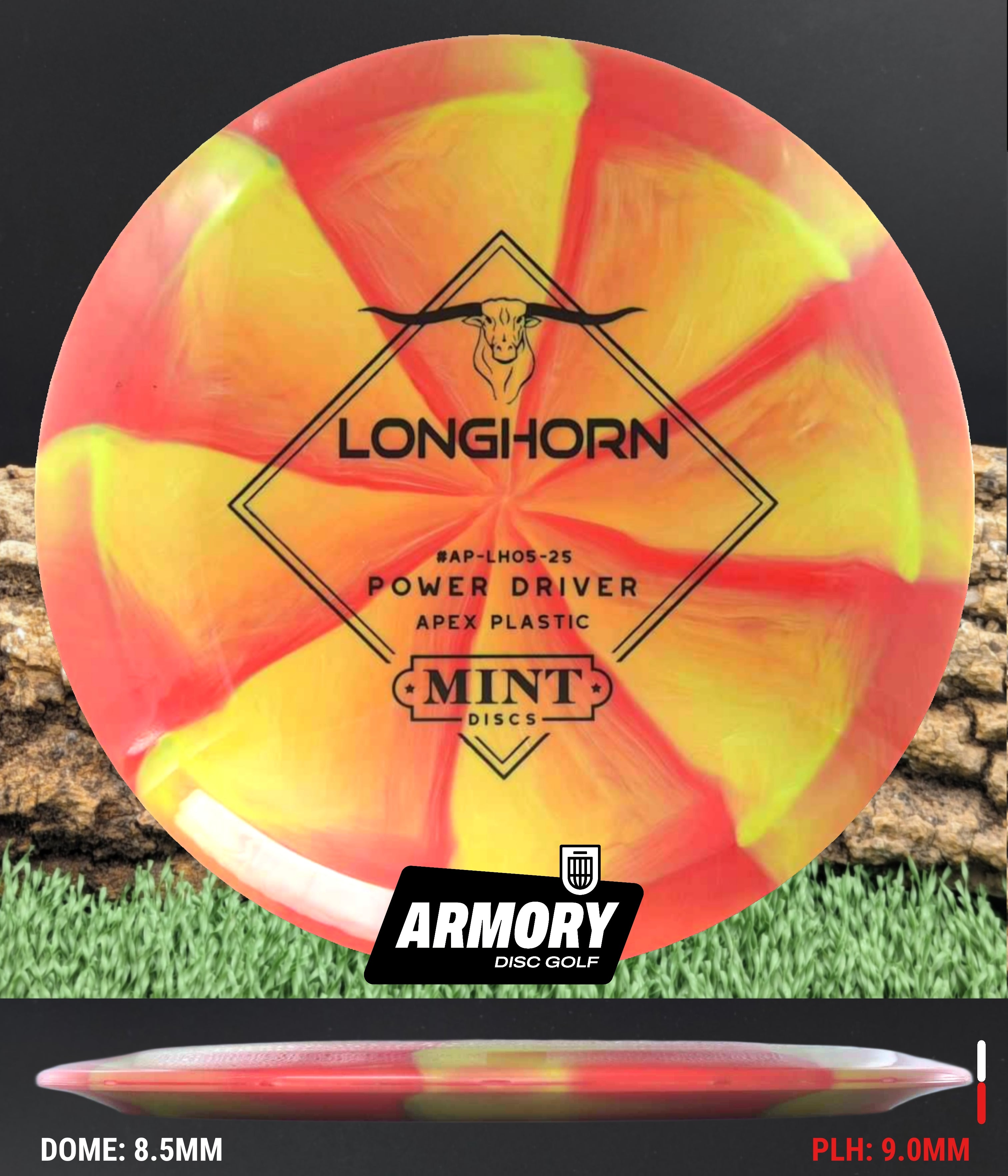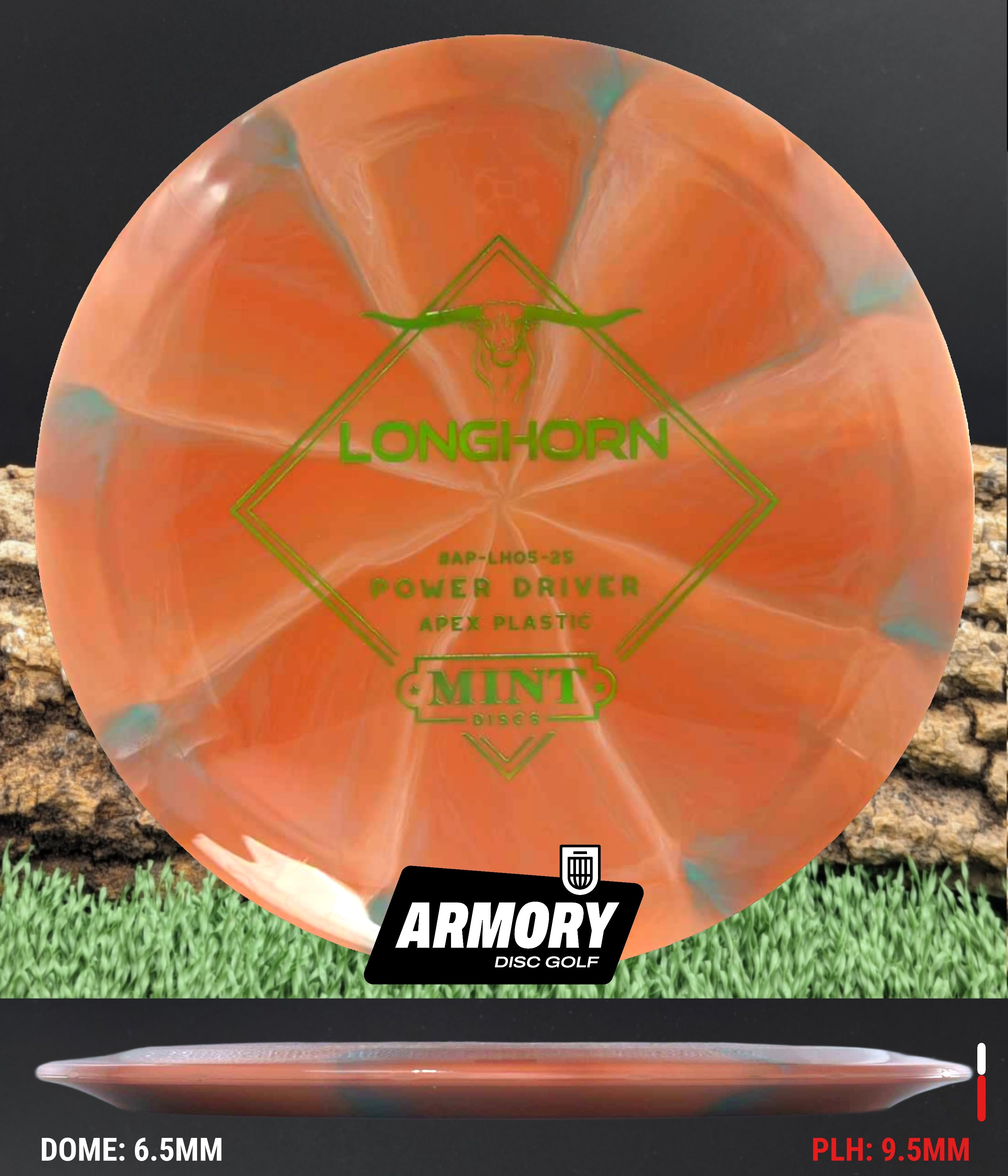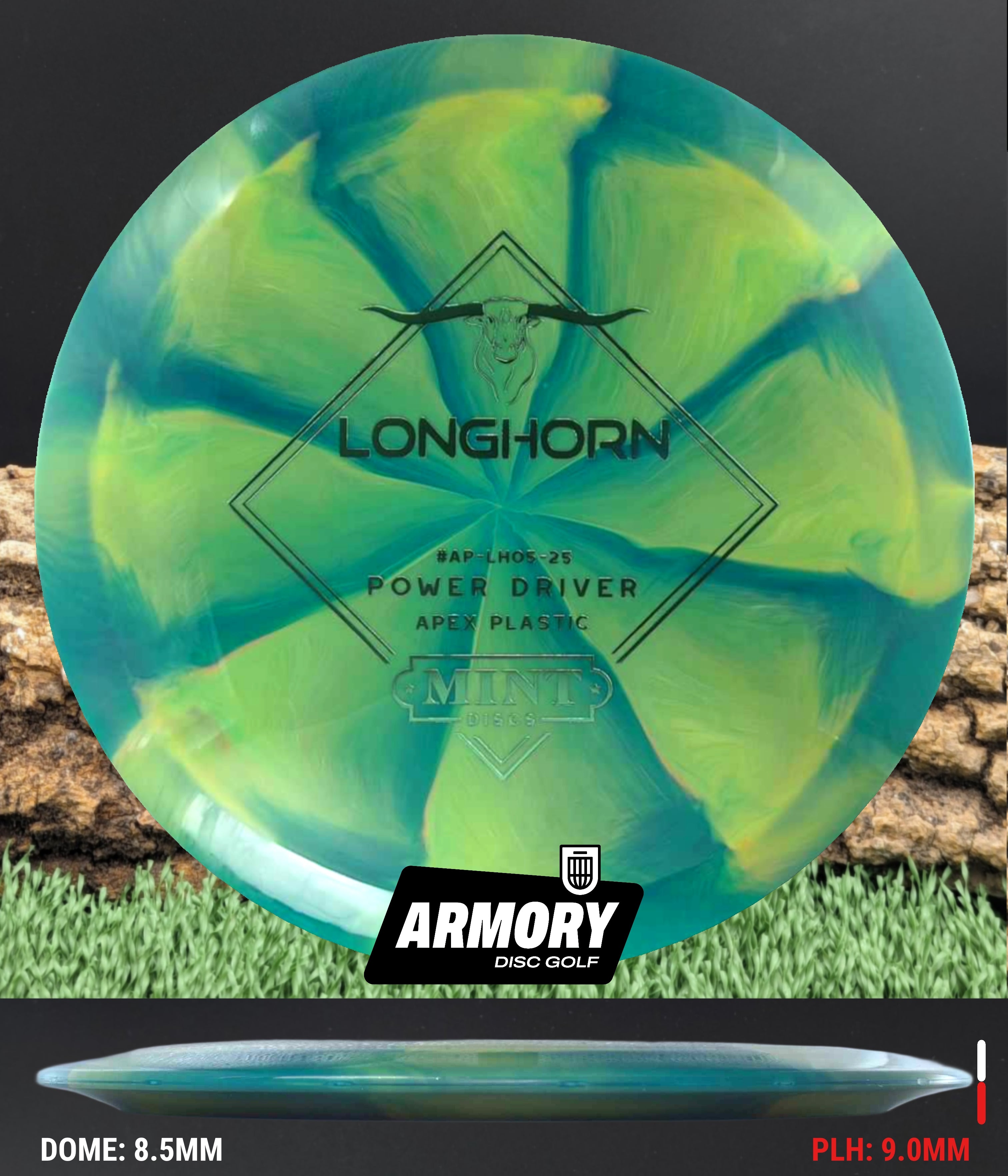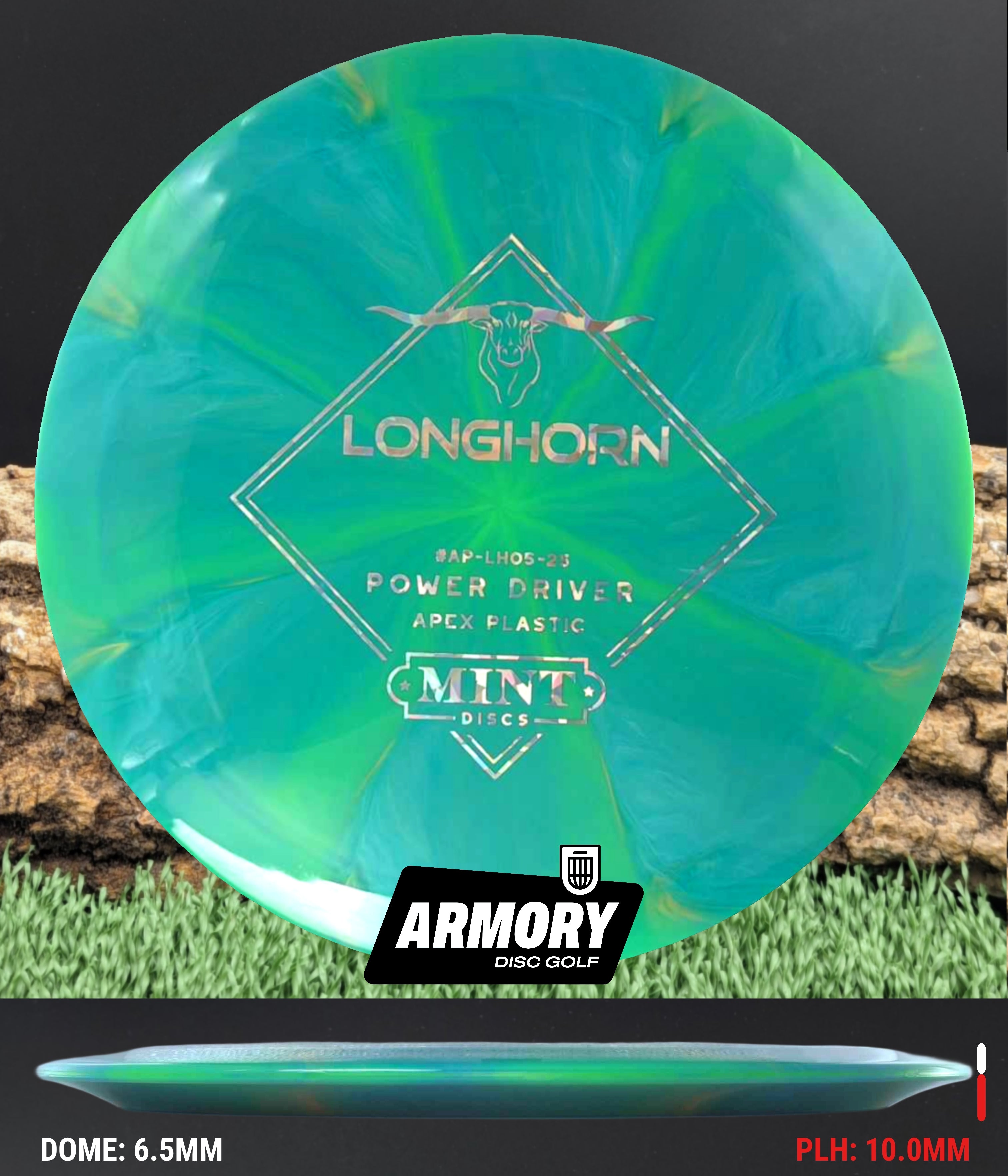 The Longhorn sits squarely in the lineup as Mint’s second distance driver: a fast, controllable option that gives developing and powerful throwers the ability to controlled hyzers while still keeping enough stability to handle tricky wind and torque. Produced by MVP and tuned for consistent performance, the Longhorn’s profile is crafted to deliver usable distance without demanding elite arm speed.