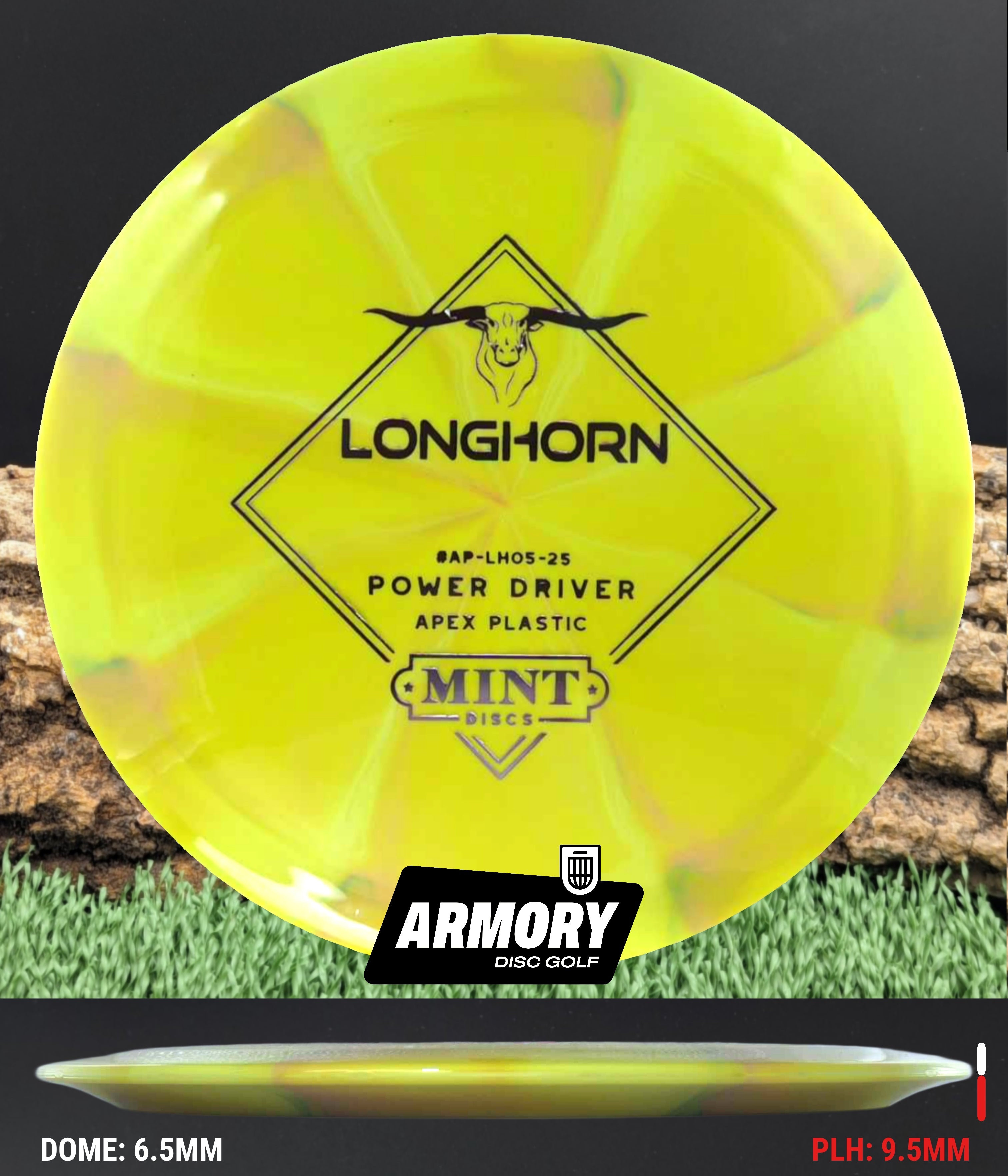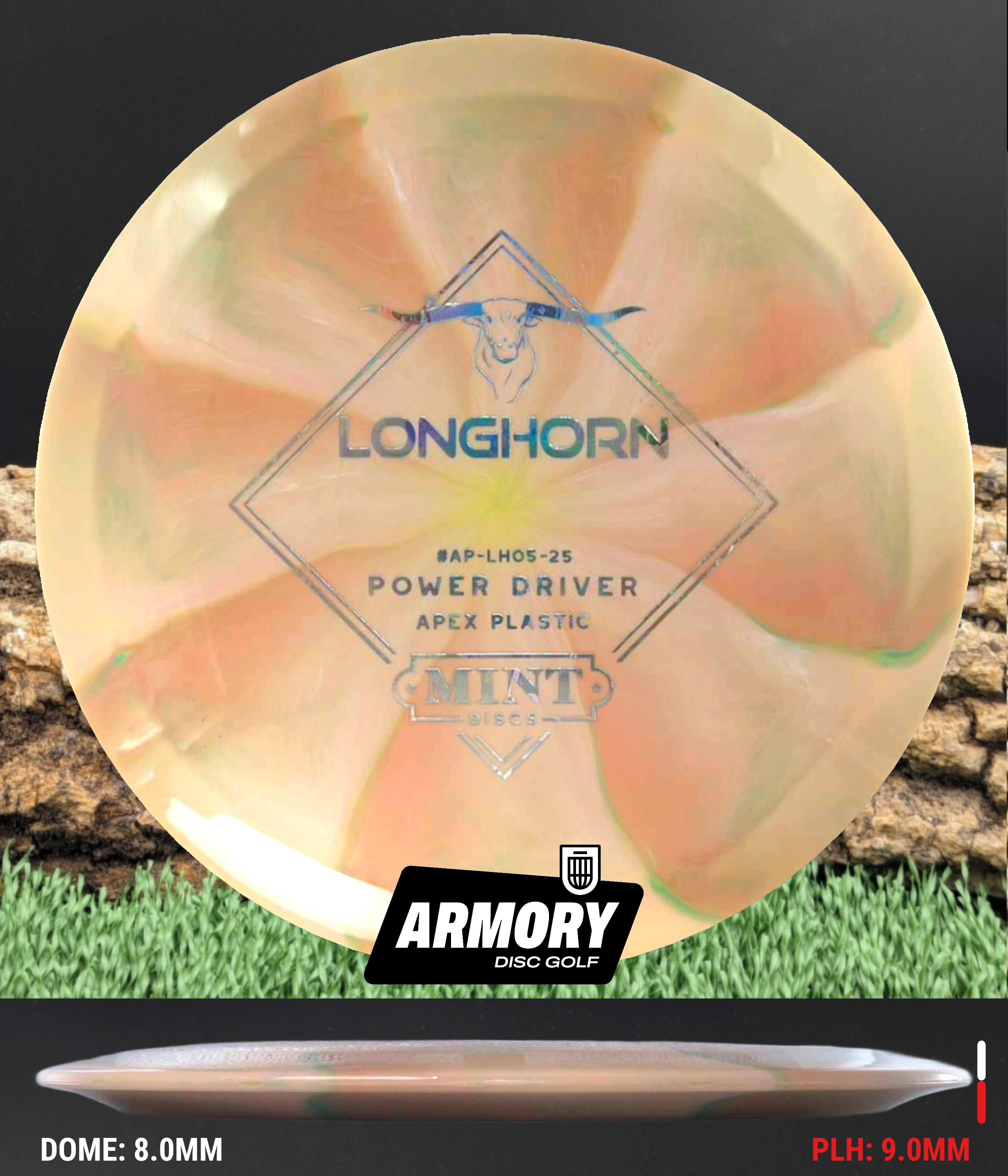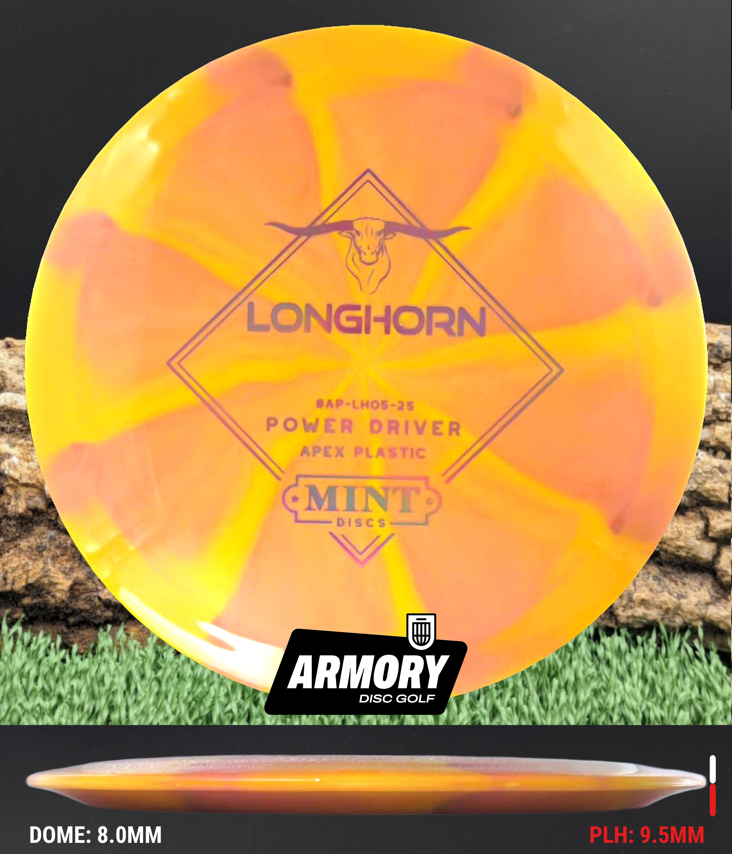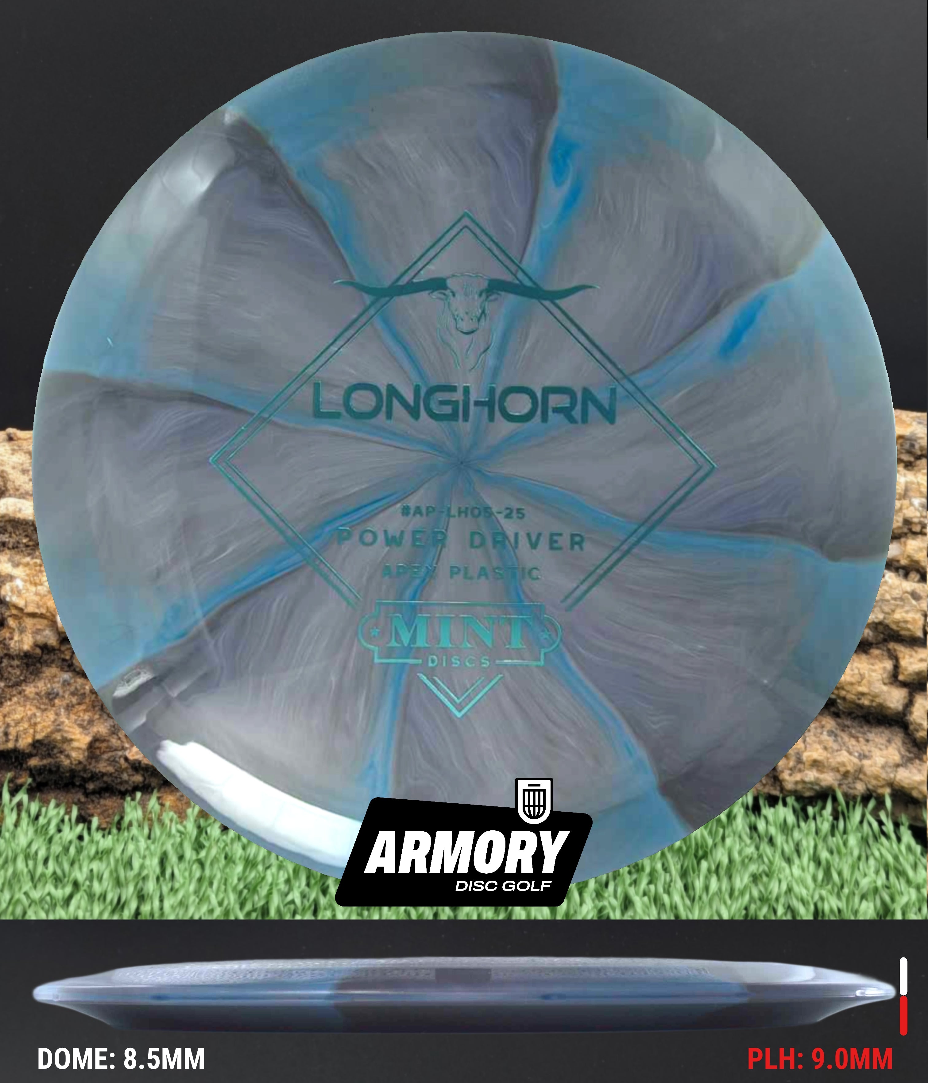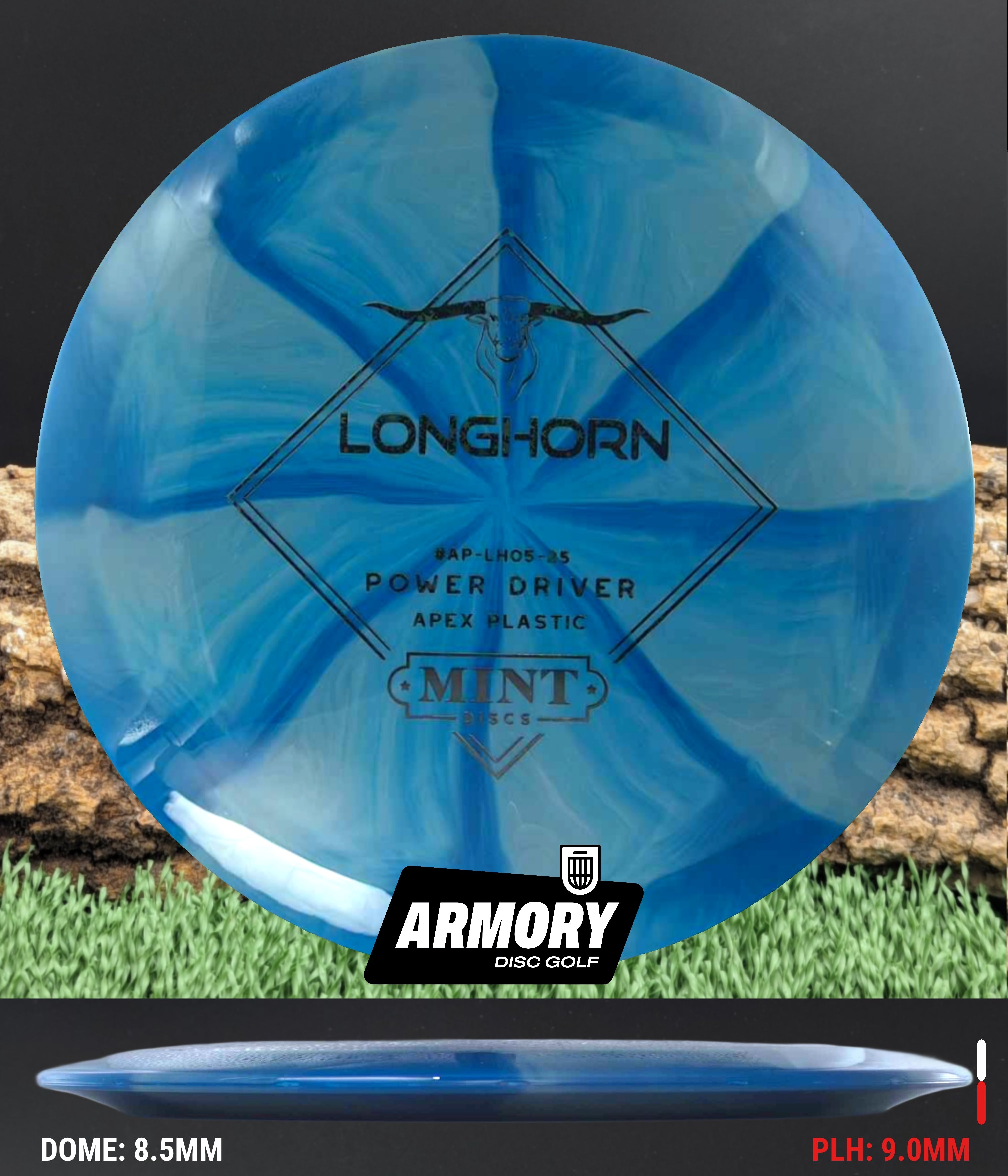 This Apex Swirl release pairs the Longhorn’s accessible flight with striking swirled cosmetics—each disc is visually unique while offering the slightly firmer, opaque feel associated with Apex-style blends. The result is a distance driver that flies true and confidently at speed, but finishes where you expect it to.
