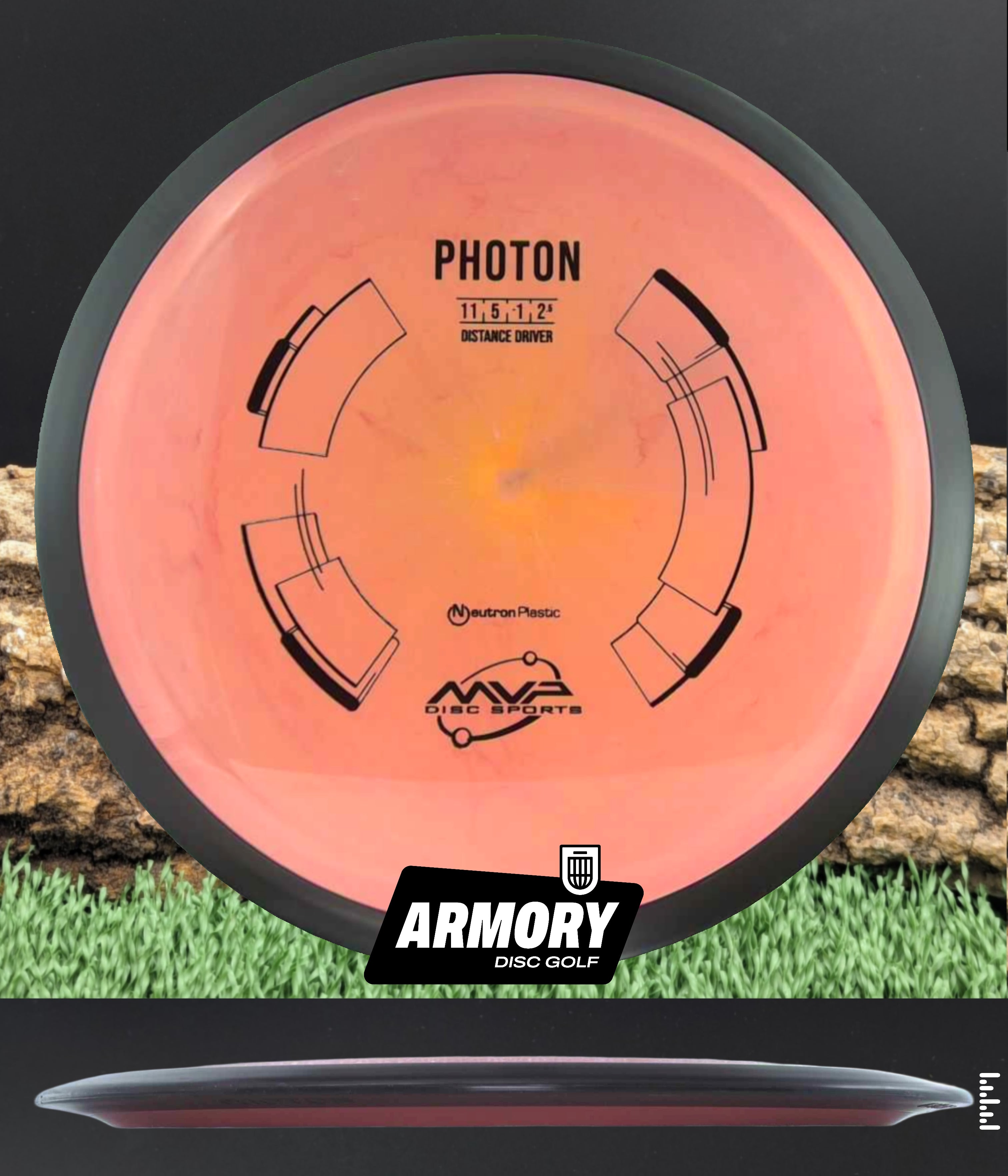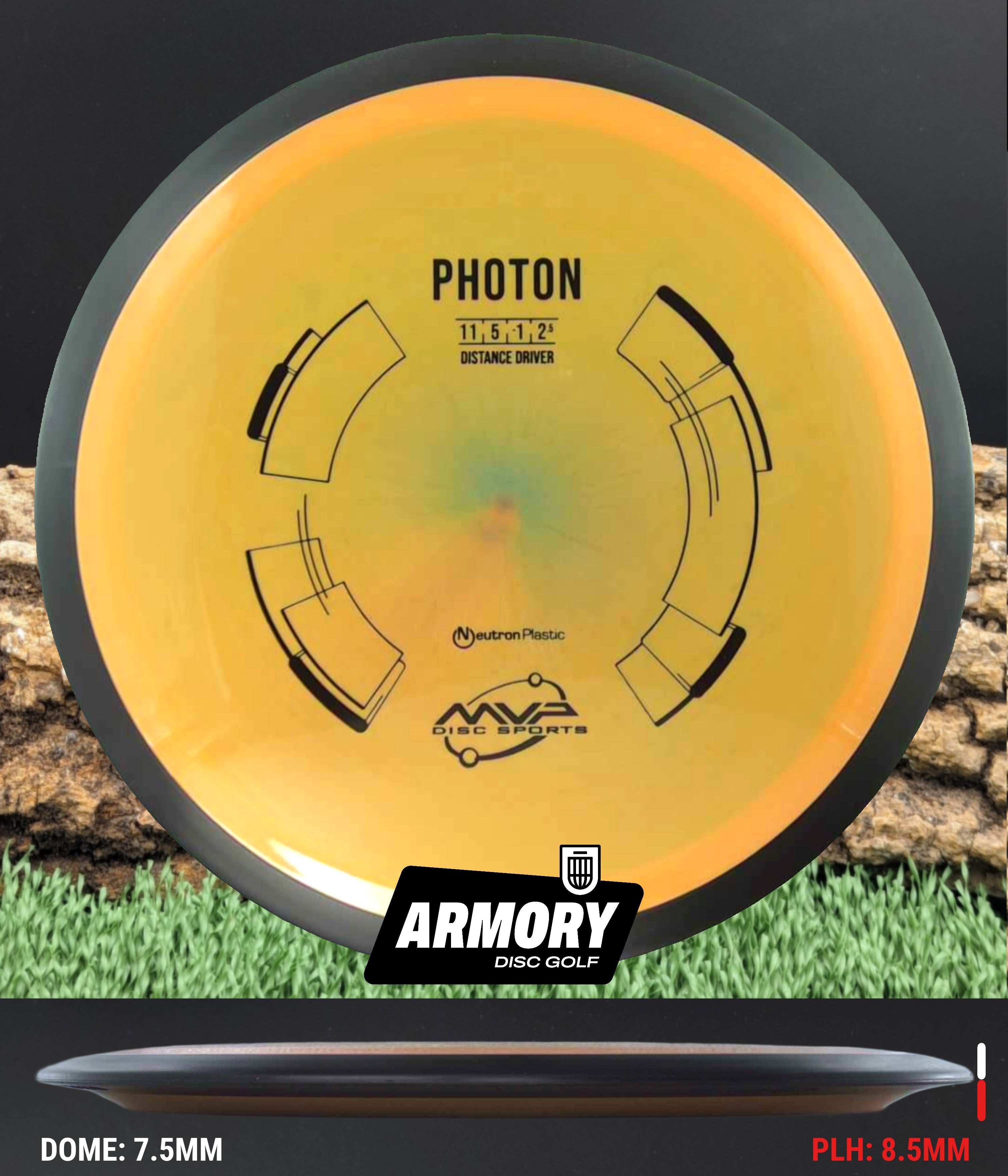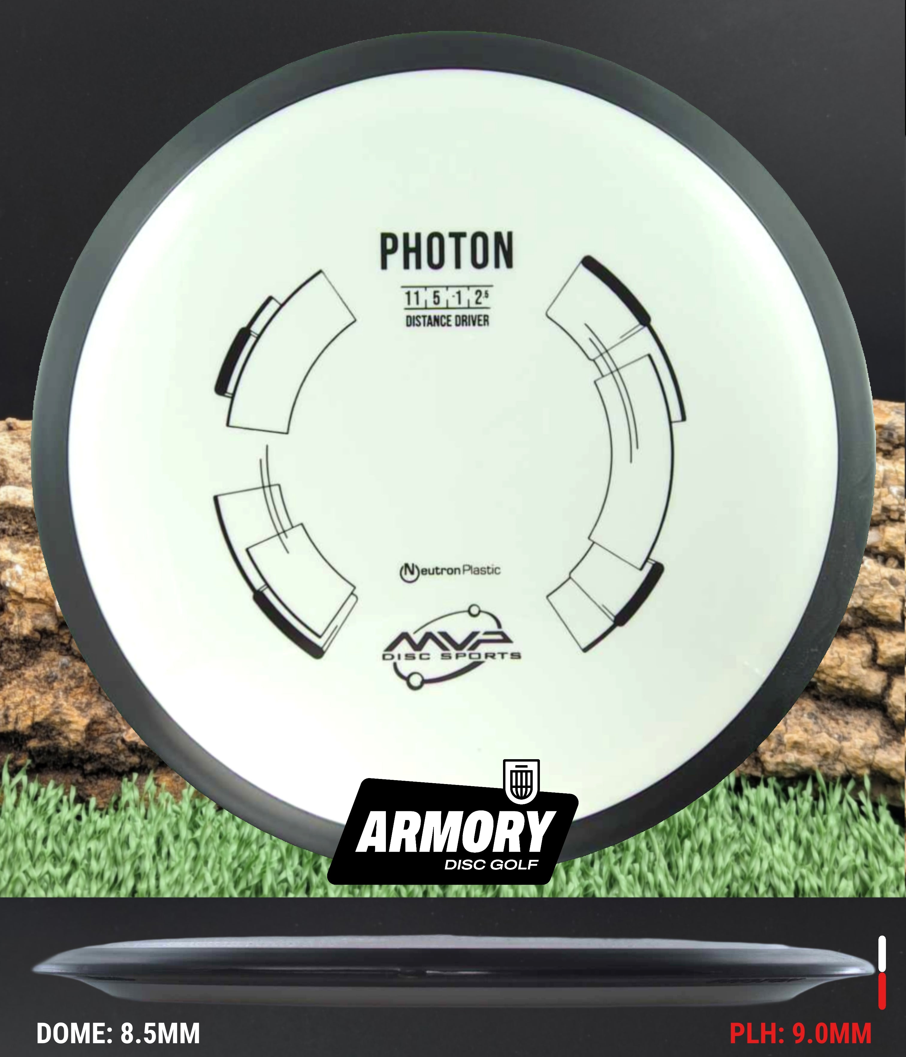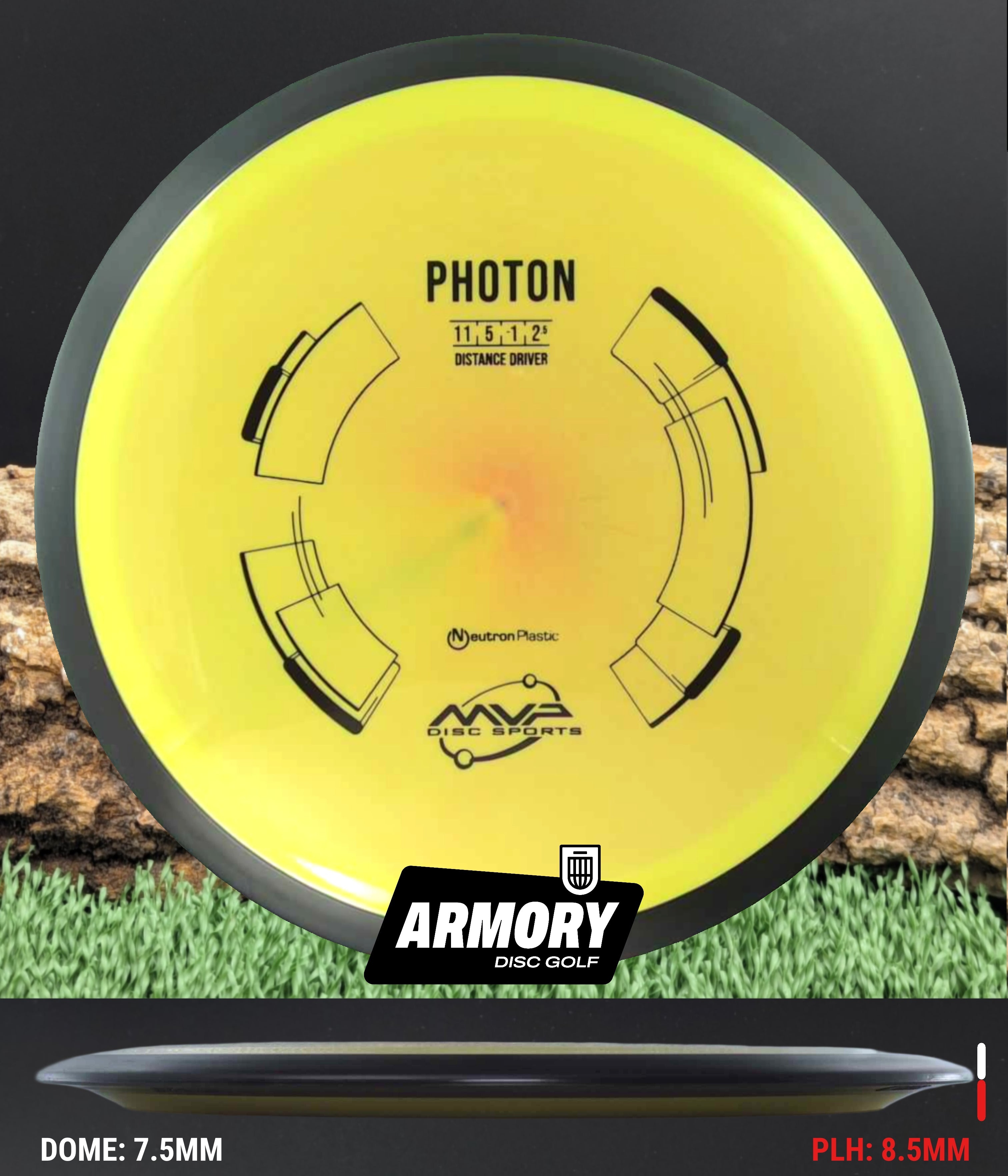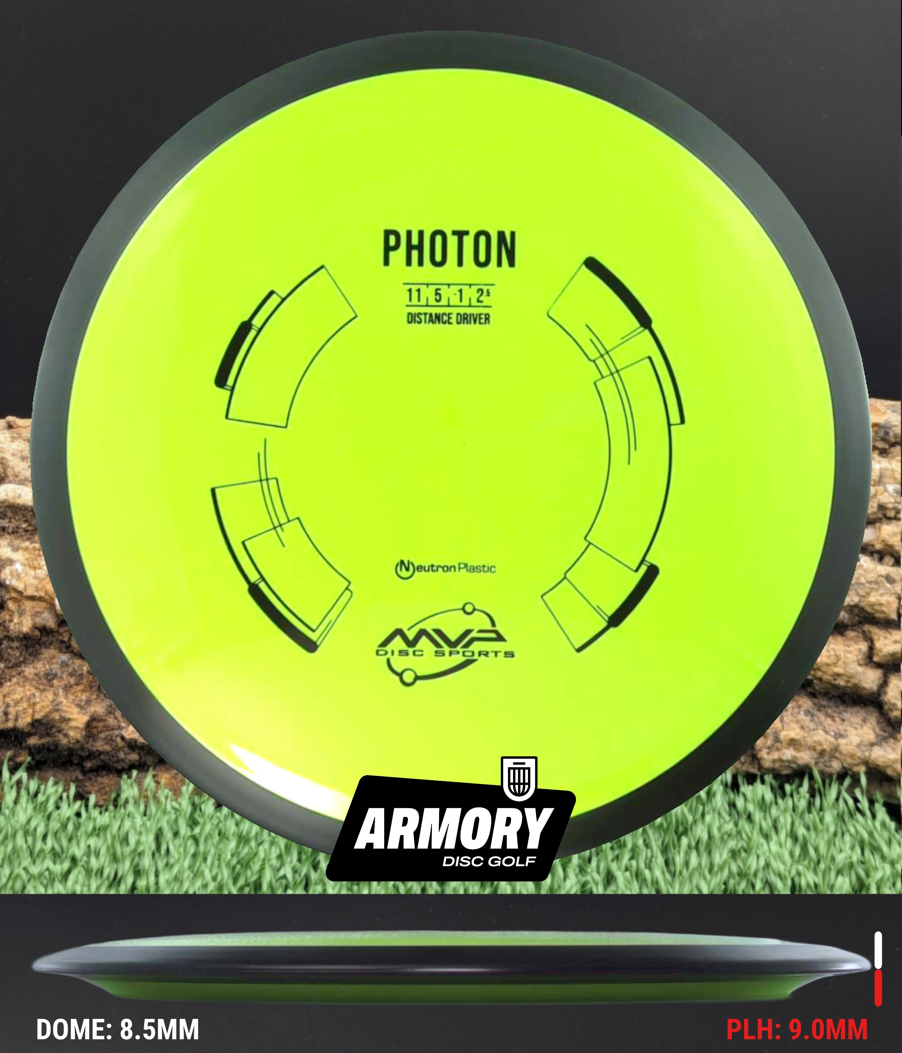 The Neutron Photon is a stable-to-overstable distance driver from MVP designed to deliver reliable, high-speed performance for power throwers. With flight numbers of 11 | 5 | –1 | 2.5, the Photon offers a touch of high-speed turn followed by a dependable fade, allowing for confident flex lines, straight bombs, and hard-fading finishes.