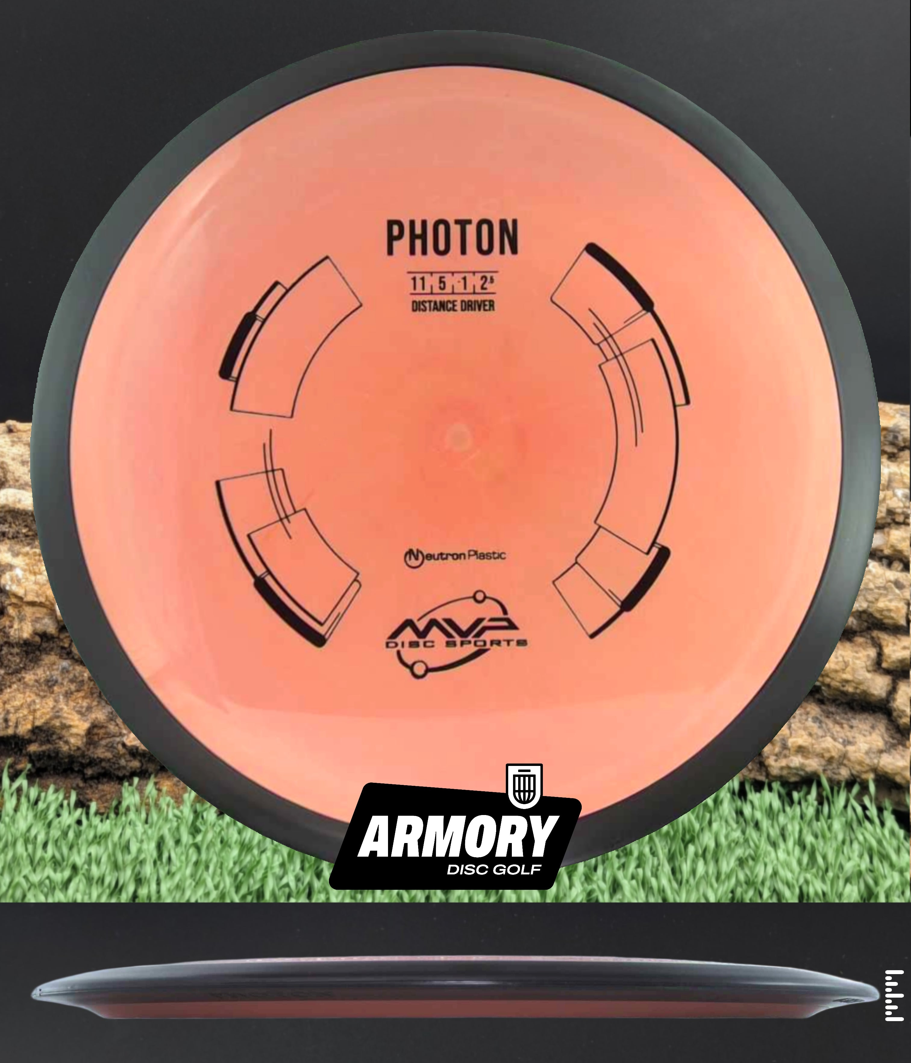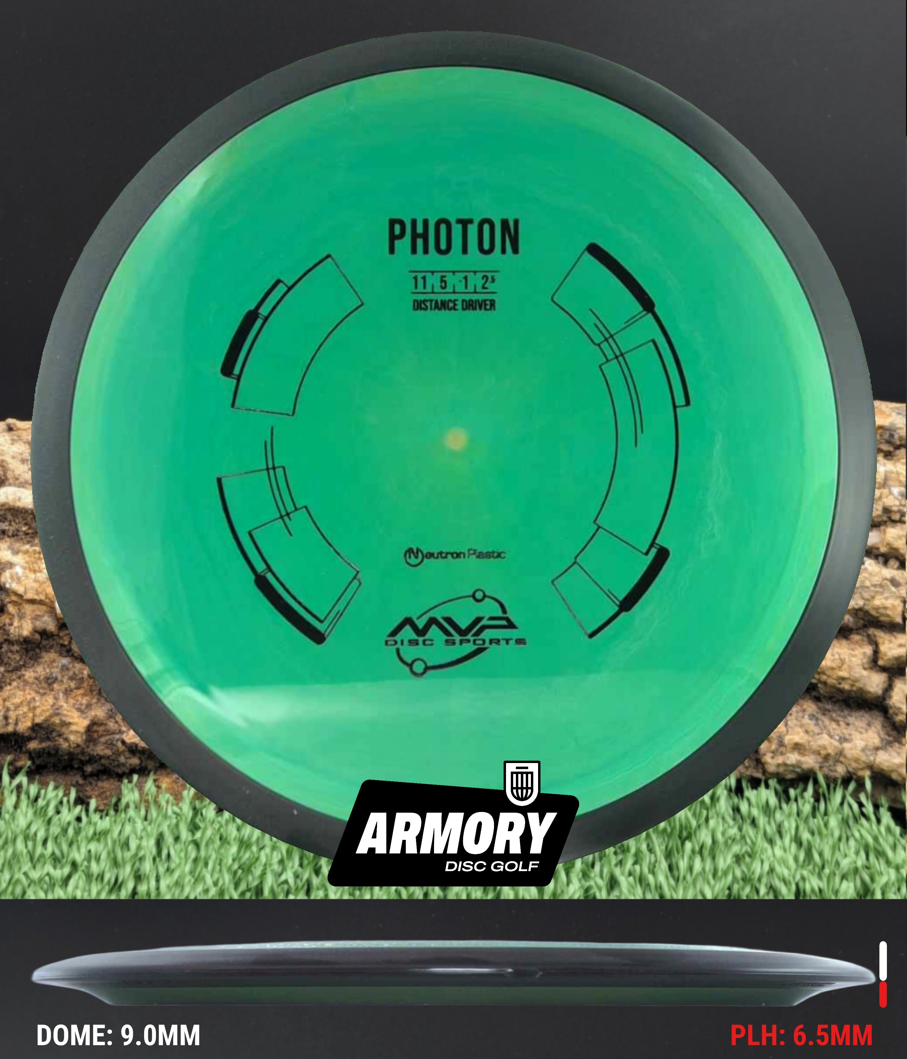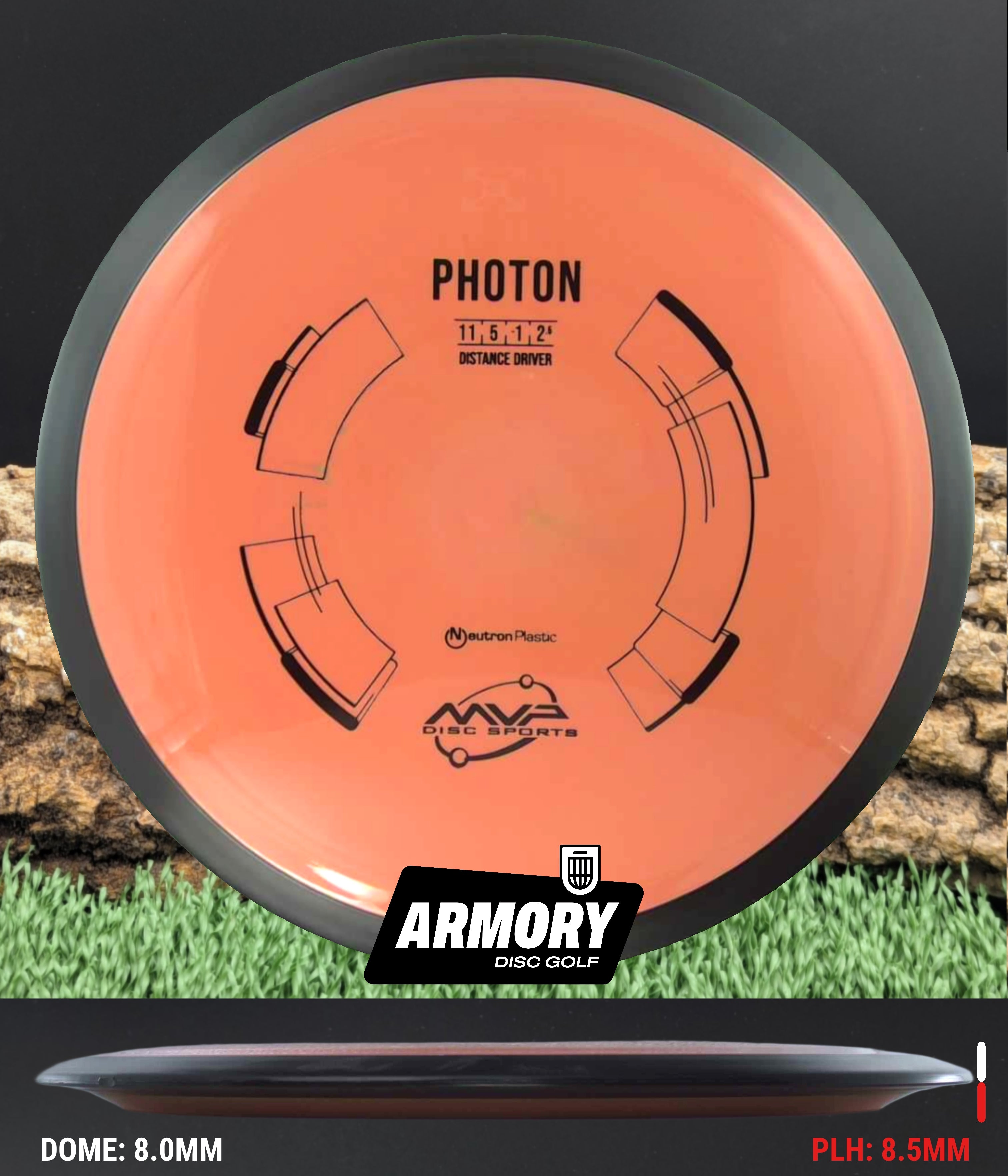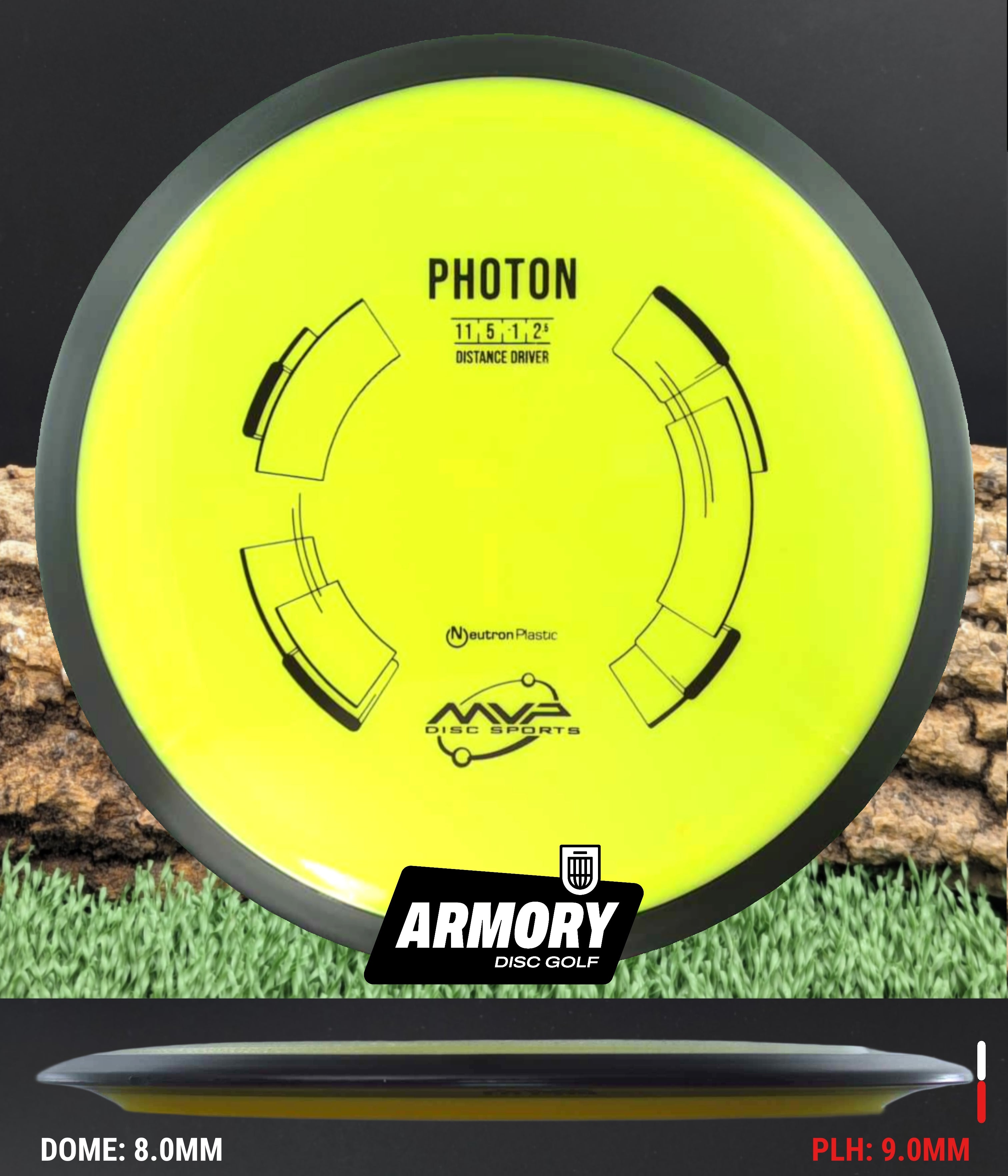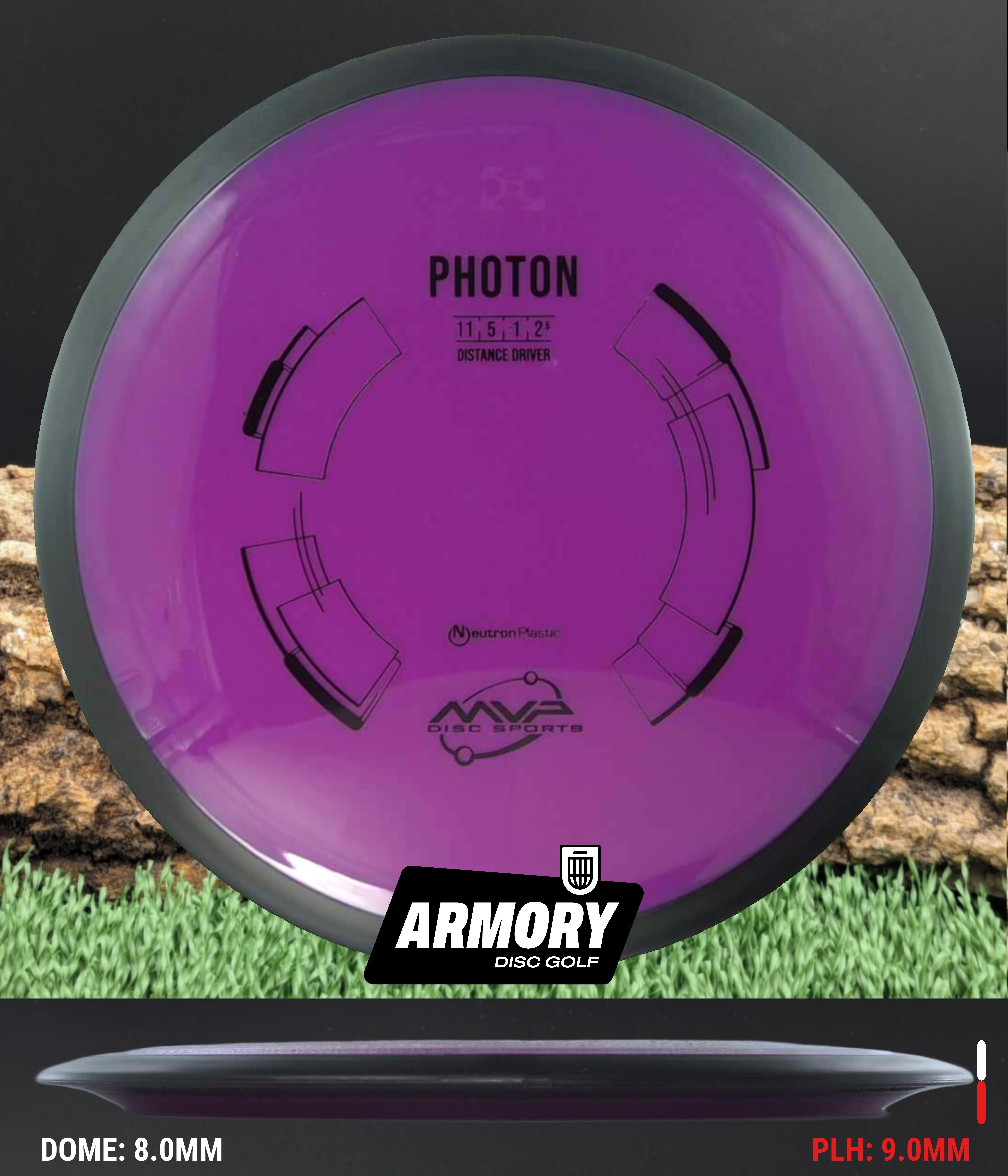 The Neutron Photon is a stable-to-overstable distance driver from MVP designed to deliver reliable, high-speed performance for power throwers. With flight numbers of 11 | 5 | –1 | 2.5, the Photon offers a touch of high-speed turn followed by a dependable fade, allowing for confident flex lines, straight bombs, and hard-fading finishes.