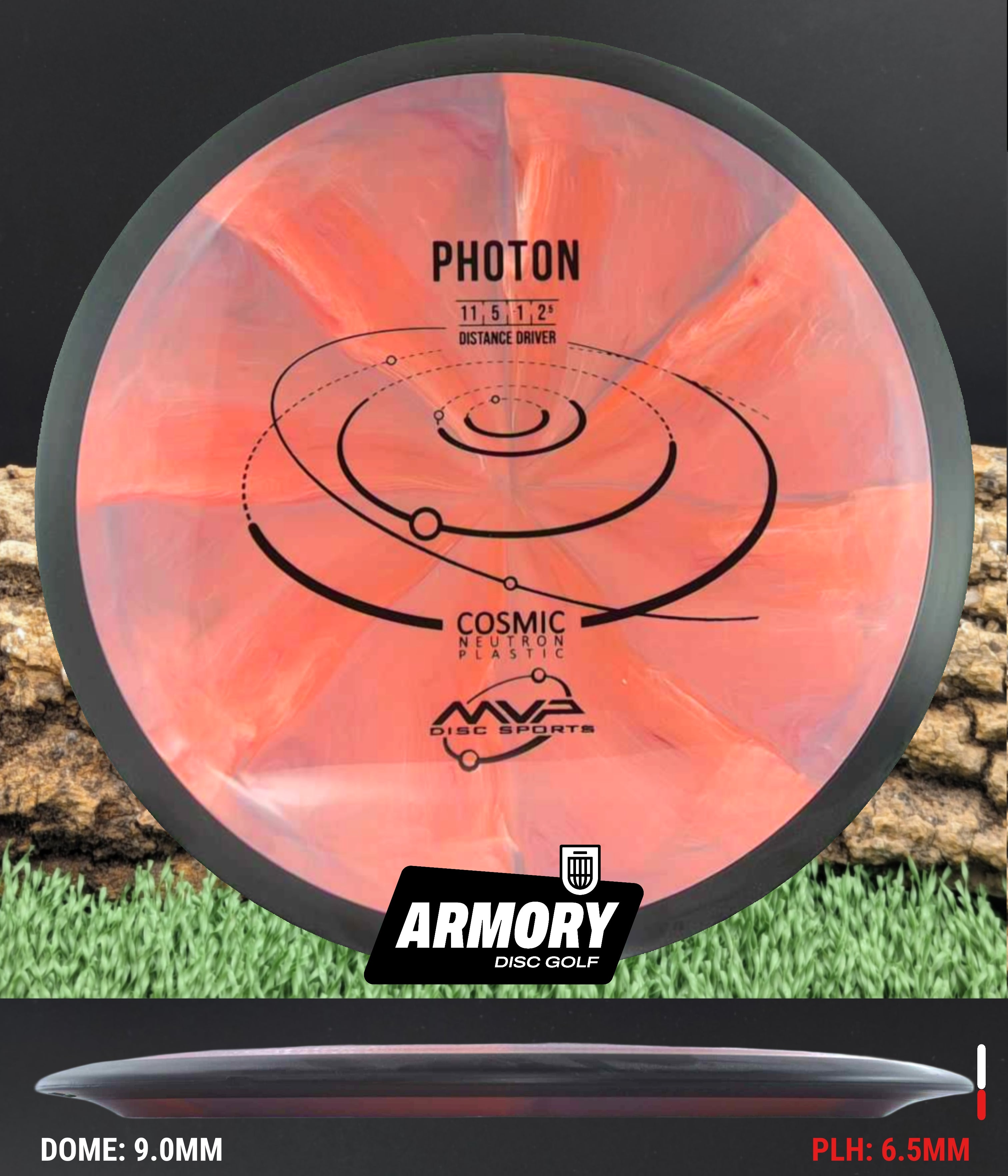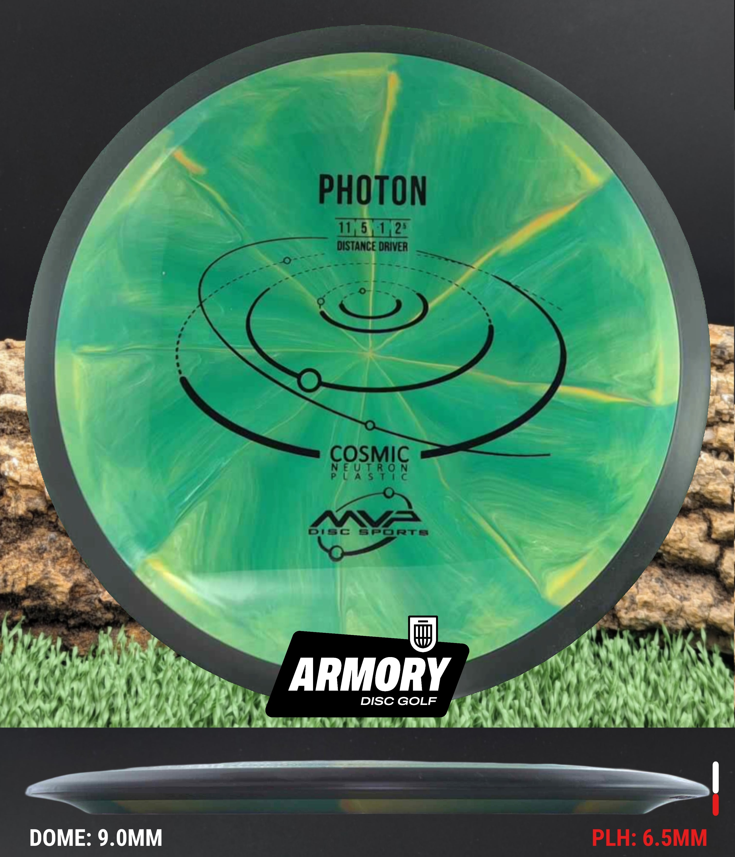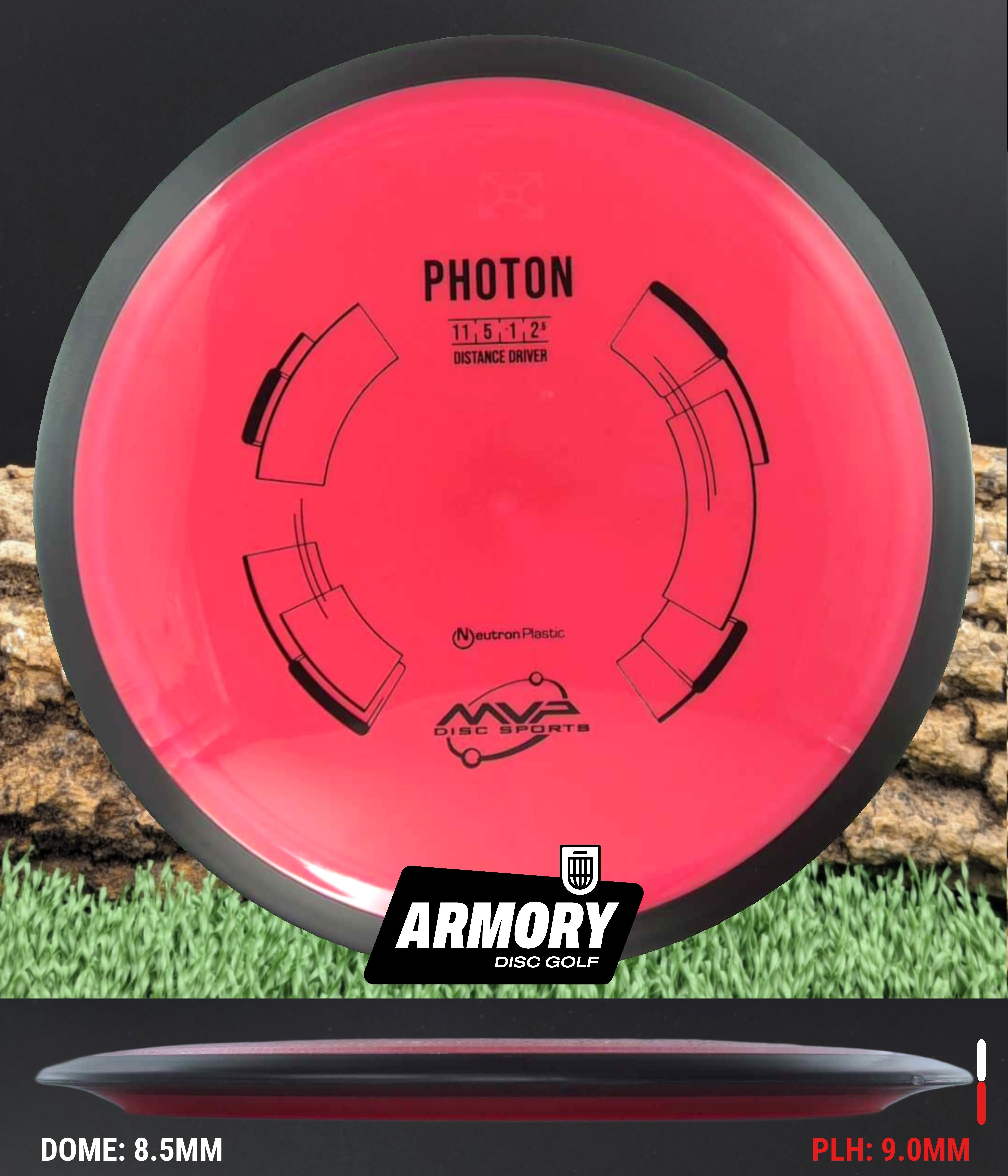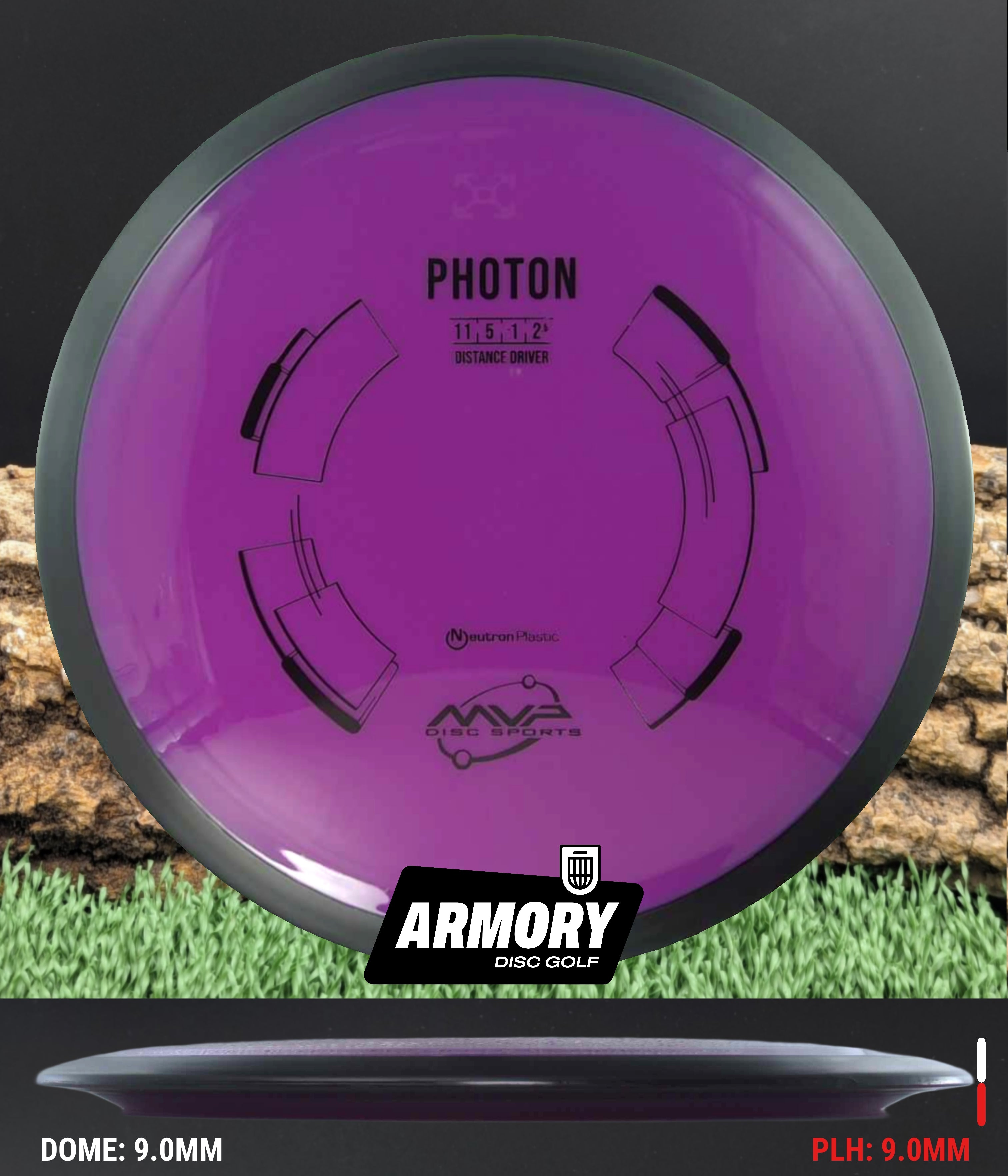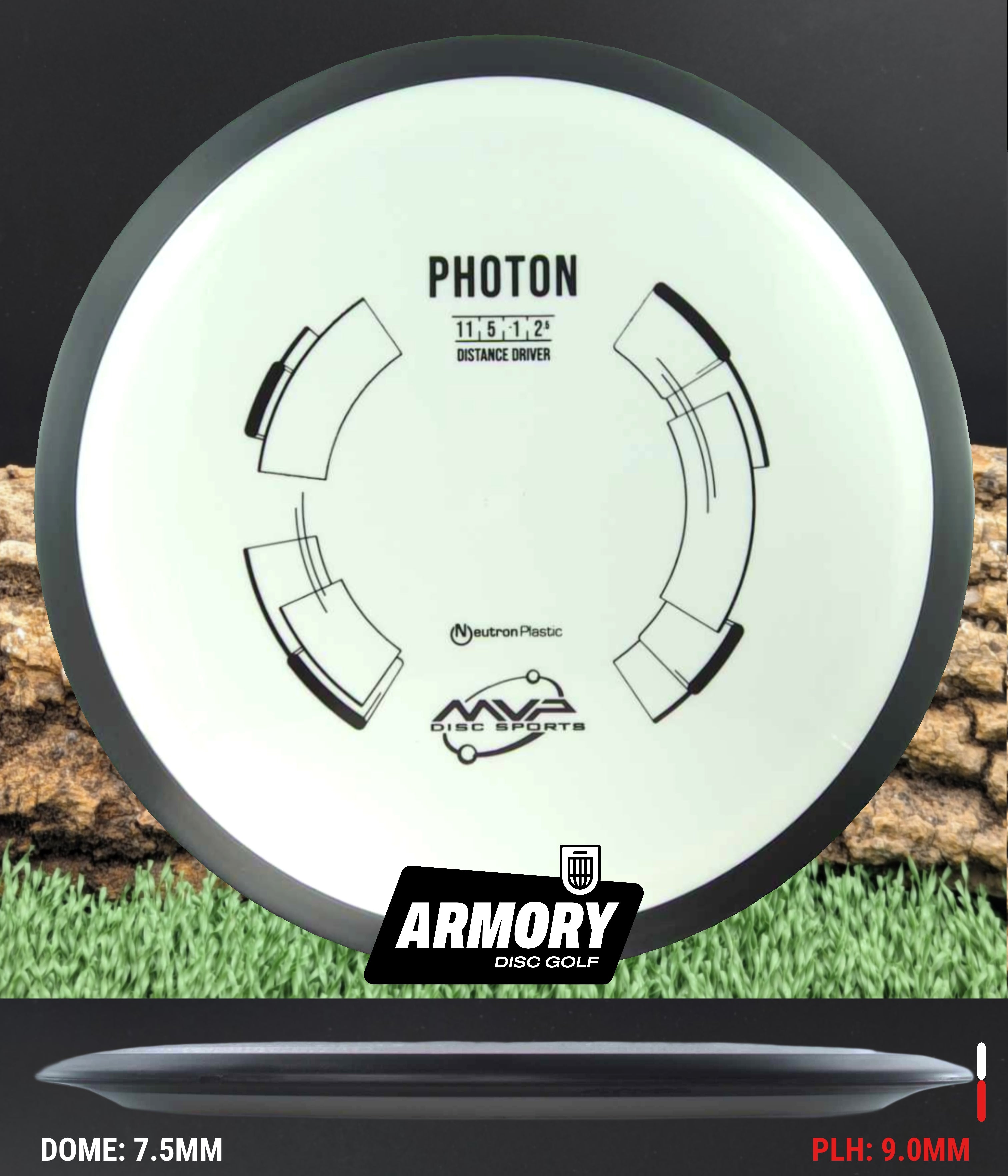 The Neutron Photon is a stable-to-overstable distance driver from MVP designed to deliver reliable, high-speed performance for power throwers. With flight numbers of 11 | 5 | –1 | 2.5, the Photon offers a touch of high-speed turn followed by a dependable fade, allowing for confident flex lines, straight bombs, and hard-fading finishes.