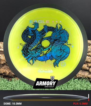 Also debuting this month, we’re bringing you the next Eagle McMahon Team Series disc in his new Synergy Series of stamps, illustrated once again by the impeccable Green C Studio, the Plasma Dimension! One of Eagle’s most used drivers, the Dimension is a demanding, 14.5 speed overstable driver with power-resistant stability and his first choice for his new series of stamps centered around the concept of duality in harmony. High power players will be able to manipulate stable lines as needed, while advanced and beginner players will have one of the strongest headwind fighters their bag could have. Find out why Eagle keeps his Dimension close by trying your own today!