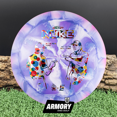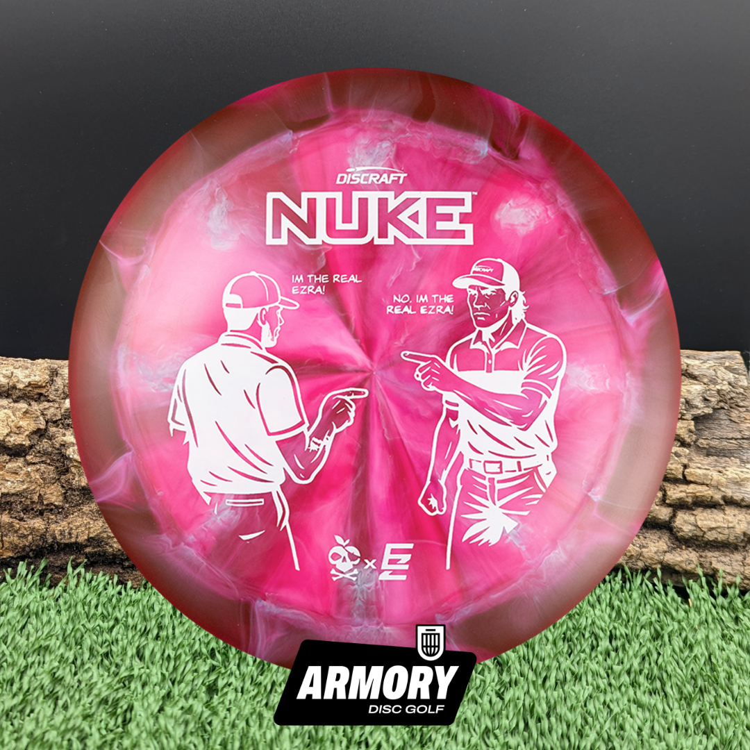 The Discraft Nuke is a staple in distance driver lineups worldwide — fast, glidey, and predictably stable. This Ezra vs Ezra edition brings together two of Discraft’s biggest personalities, Ezra Aderhold and Ezra Robinson, in a tongue-in-cheek collaboration stamped with humor and packed with power.