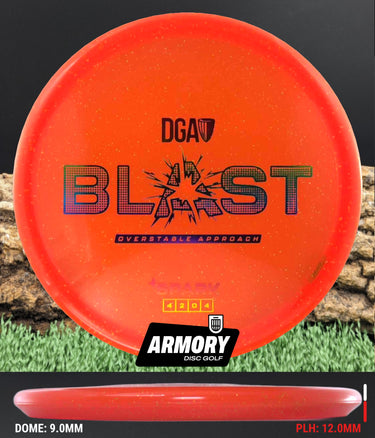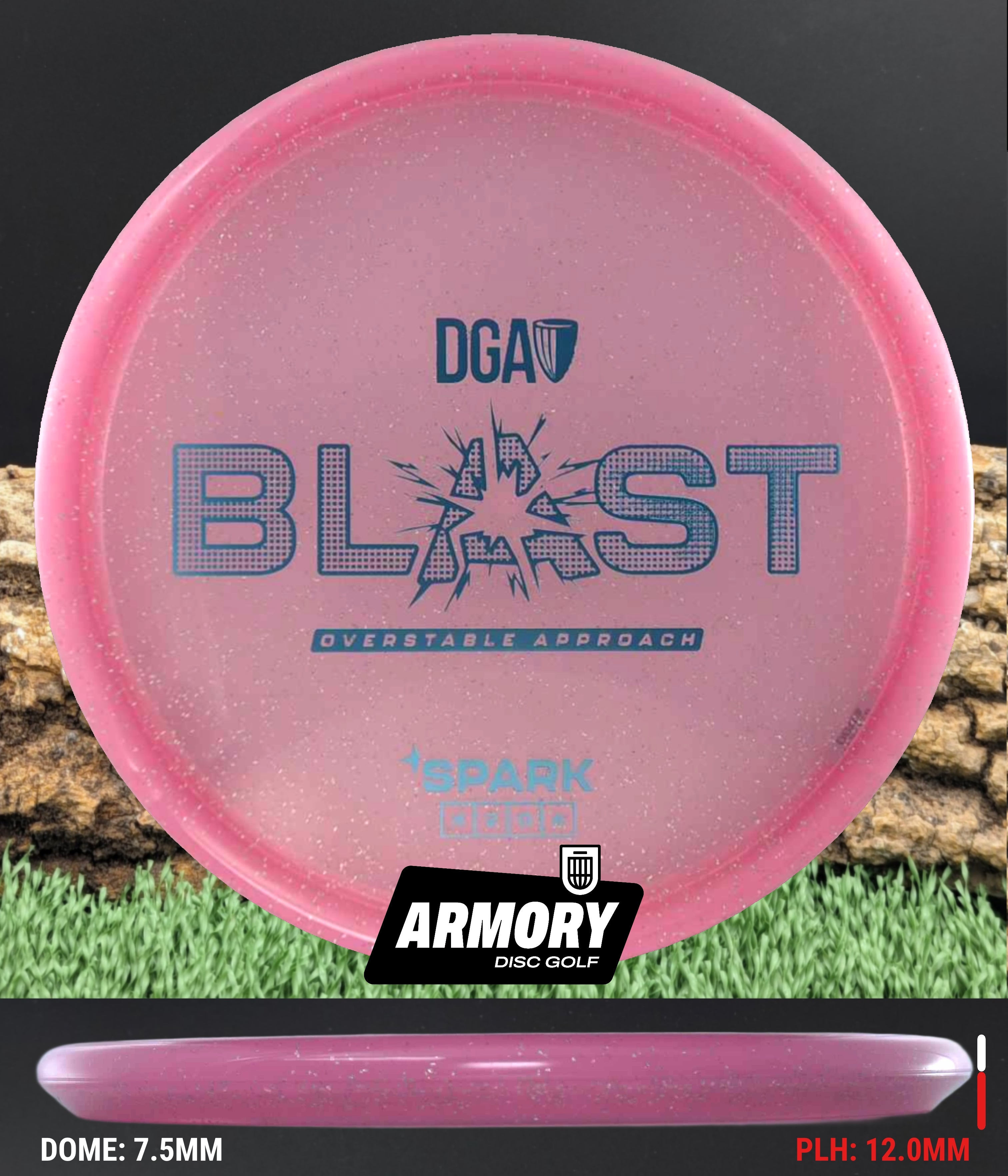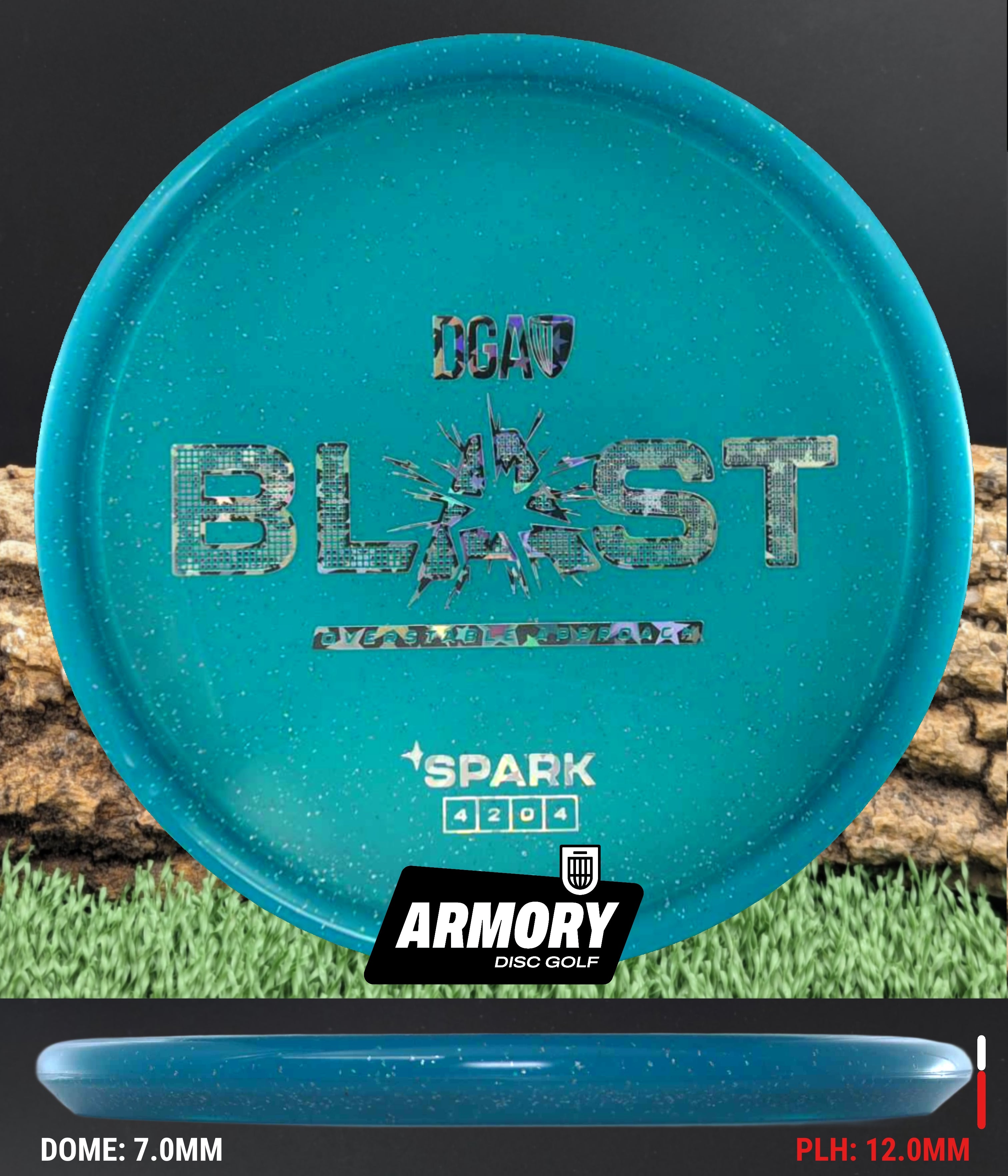 • The DGA Spark Blast is a fast, overstable putt-and-approach disc engineered for players who demand confidence and control. With flight numbers 4 | 2 | 0 | 4, the Blast resists torque, handles high power, and thrives in headwinds—all while delivering a forward-pushing fade that finishes reliably without stalling out early.