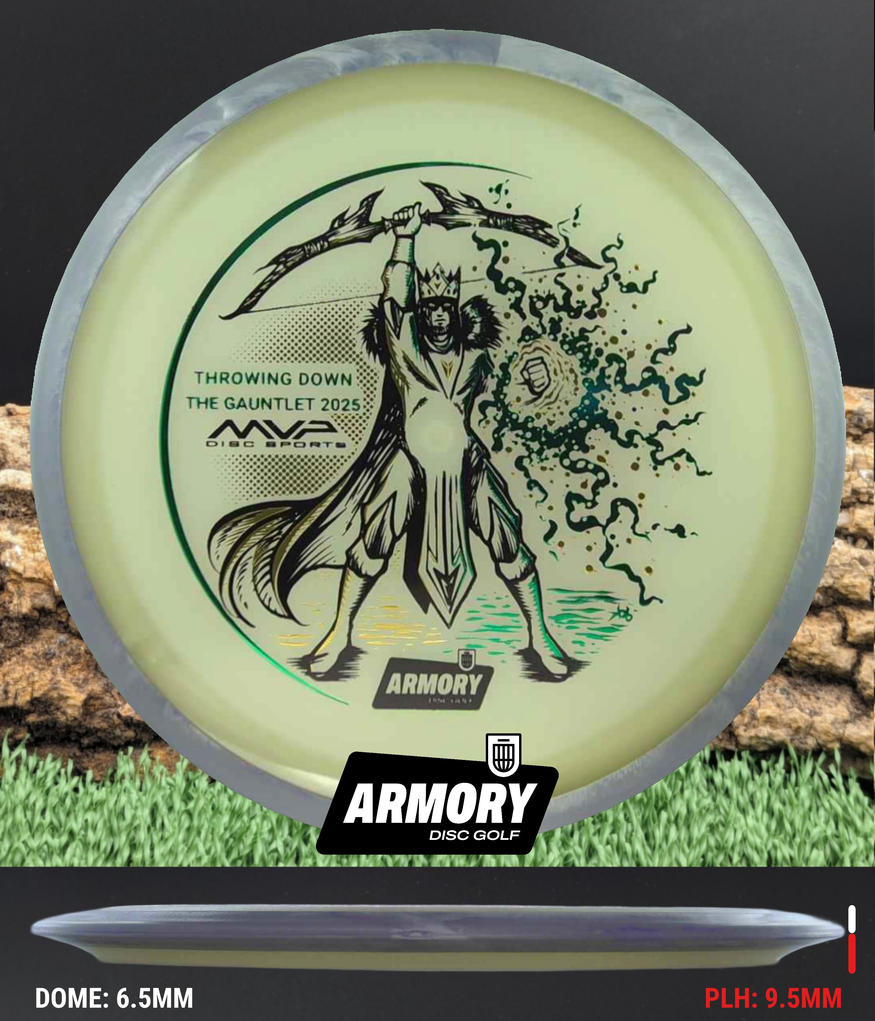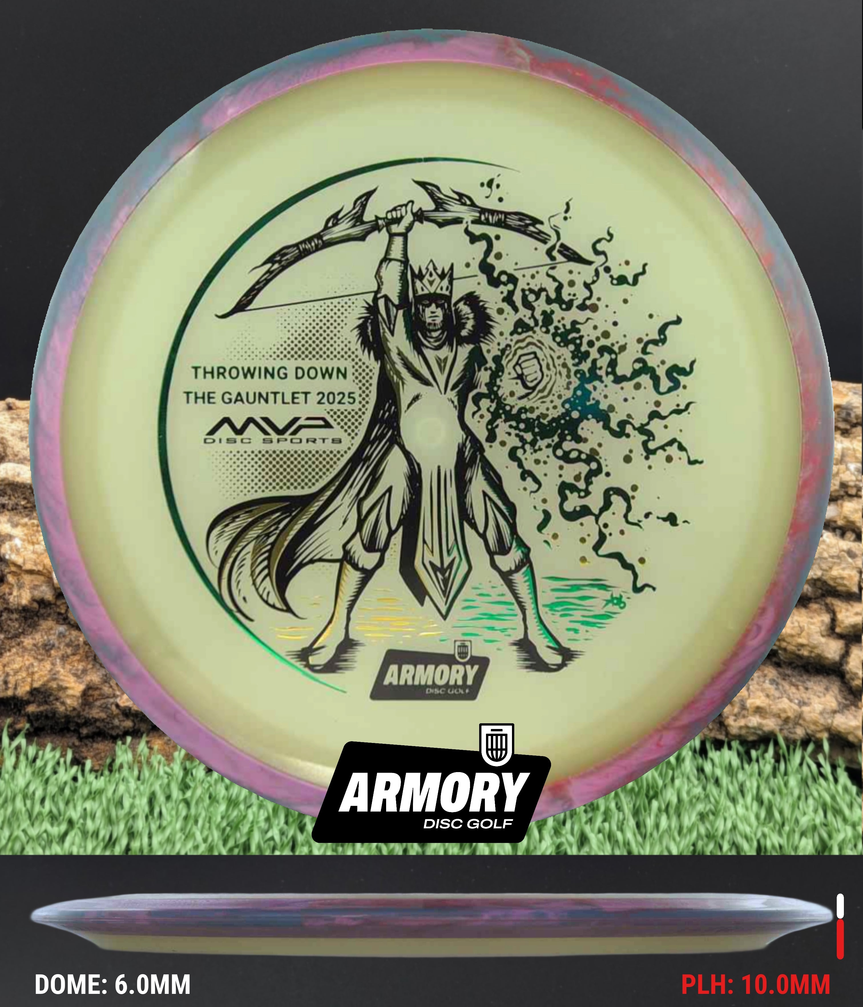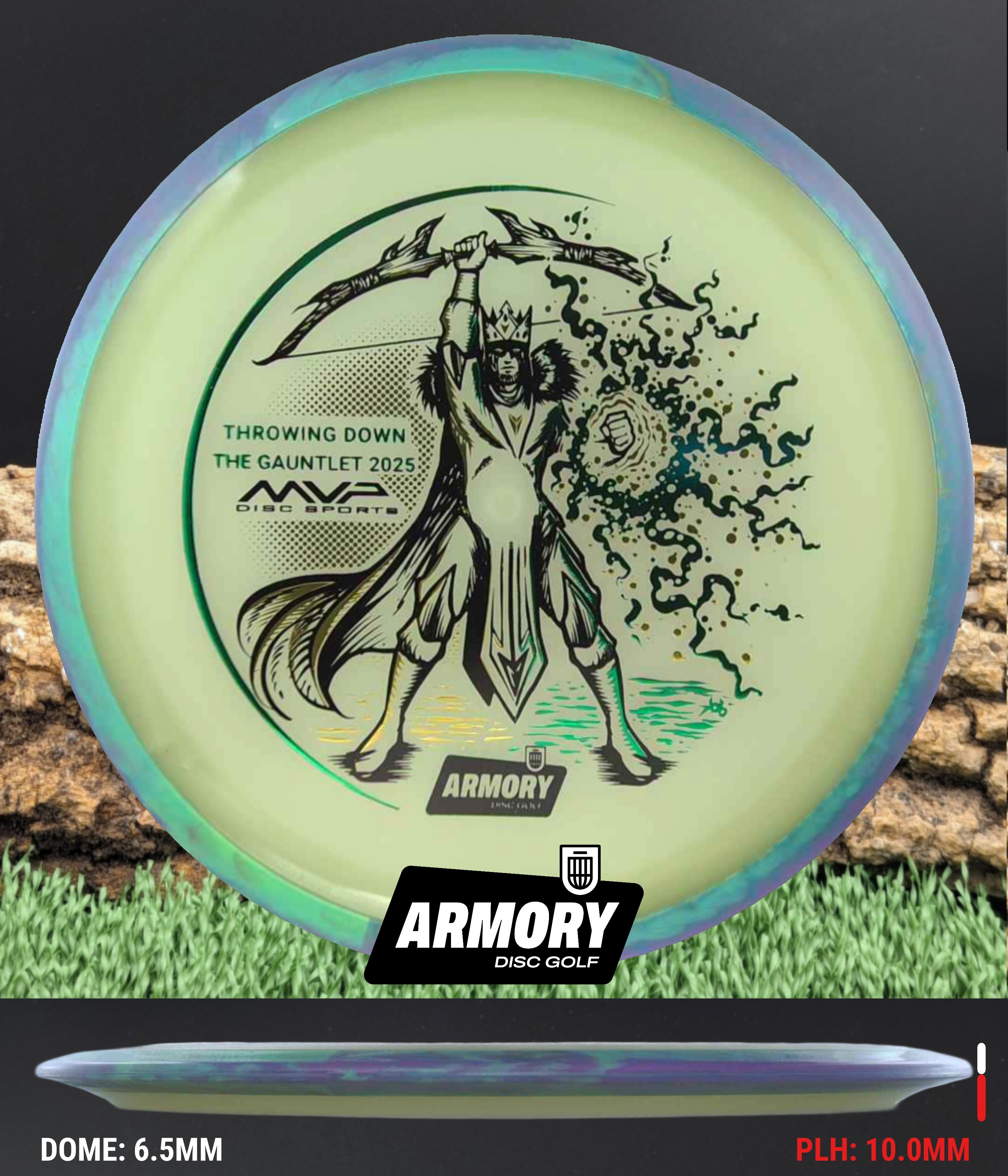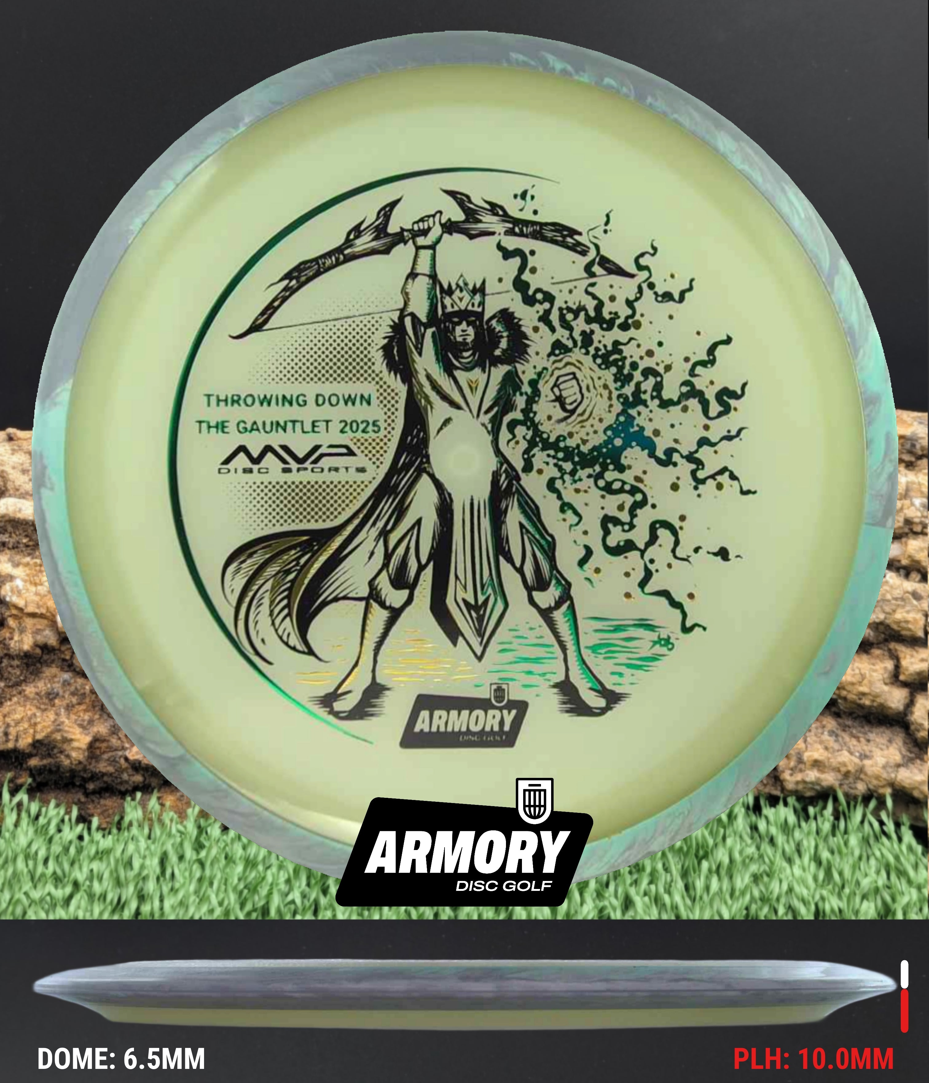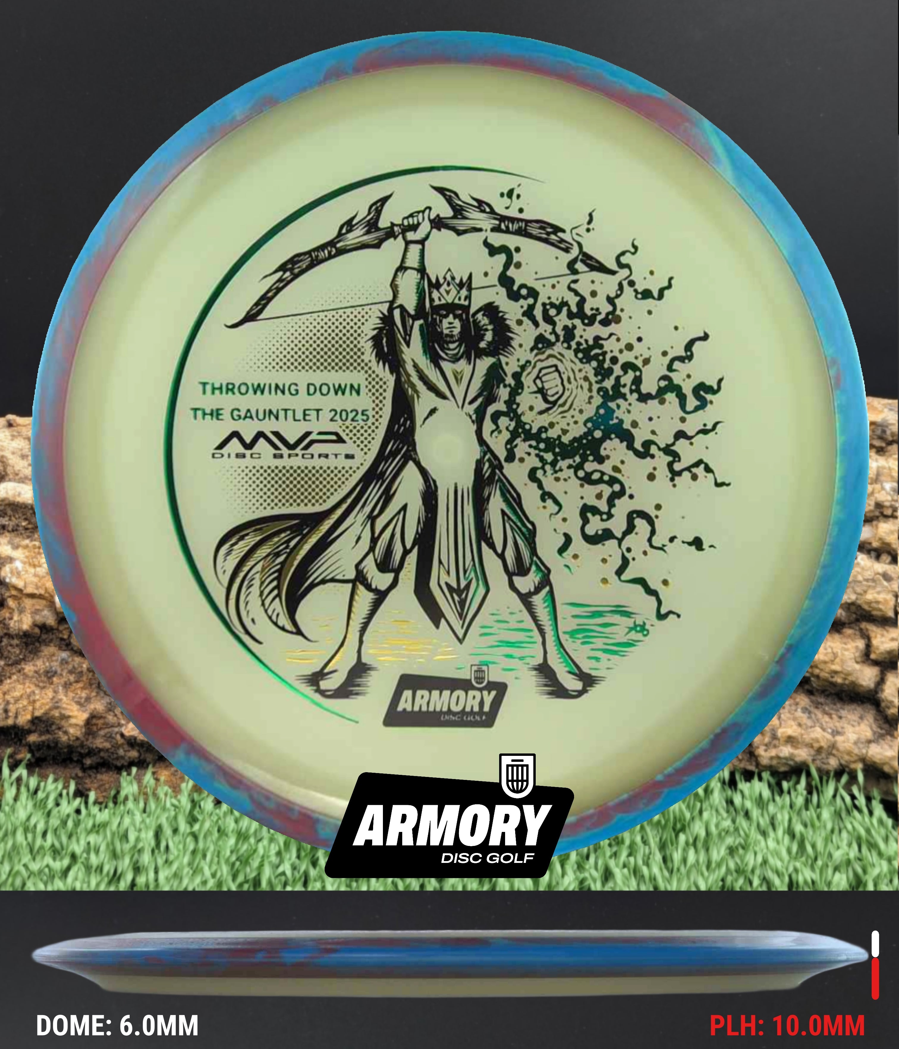Flat, stable, and glowing with victory — the Eclipse Insanity steps into the spotlight for the Throwing Down the Gauntlet Championship. Featuring a 3-foil black, gold, and emerald stamp from Kelly “KoB” Baber, this run depicts the crowned Woodland Syndicate general standing victorious with bow raised high — a perfect tribute to calculated power and precision.