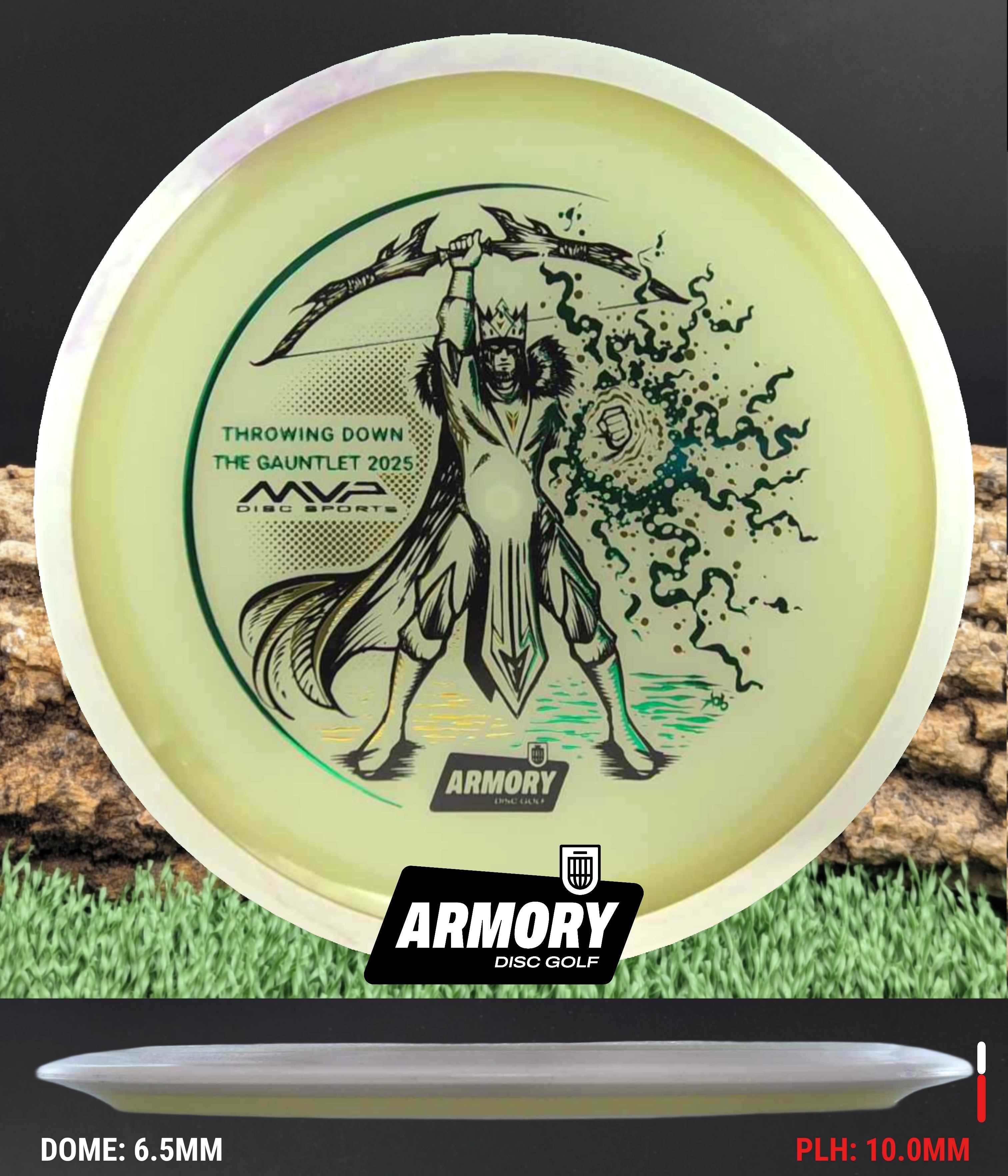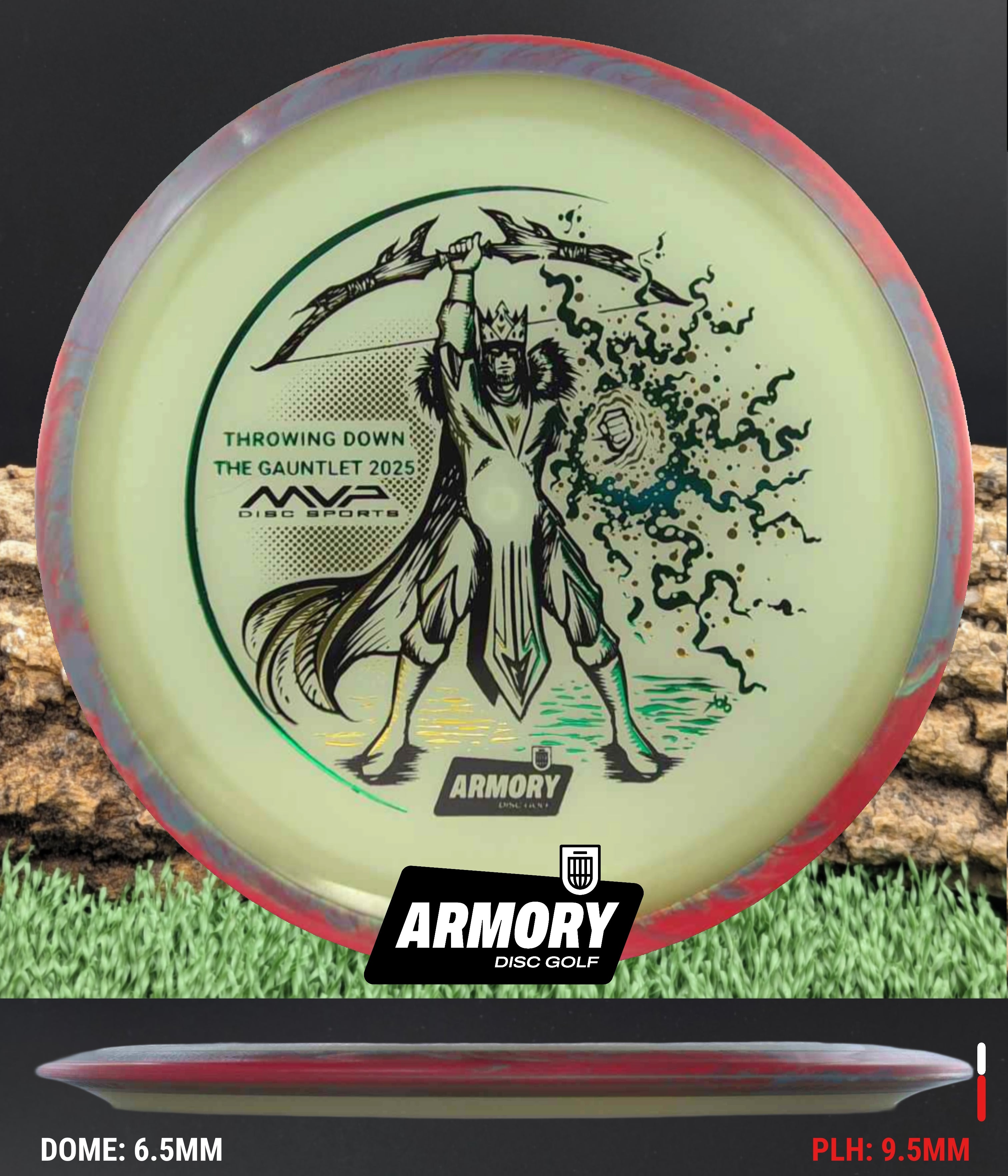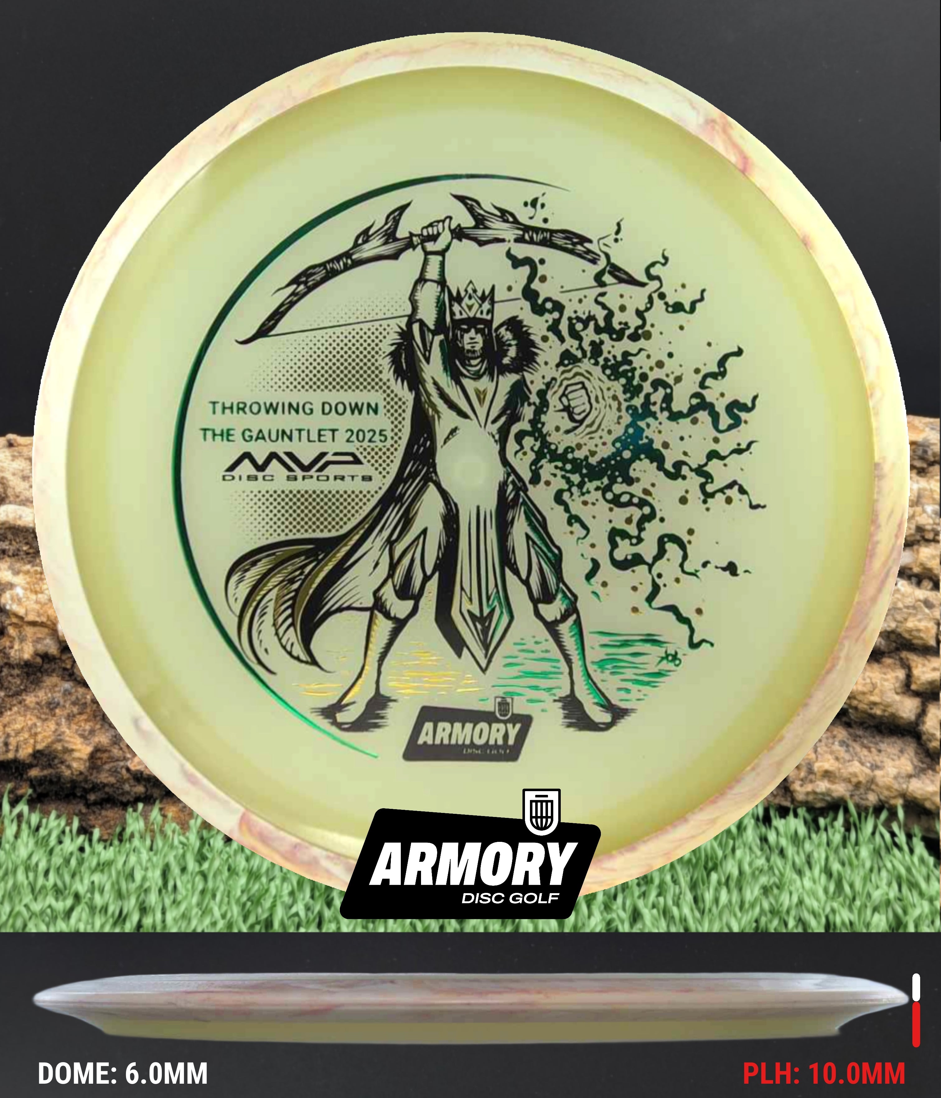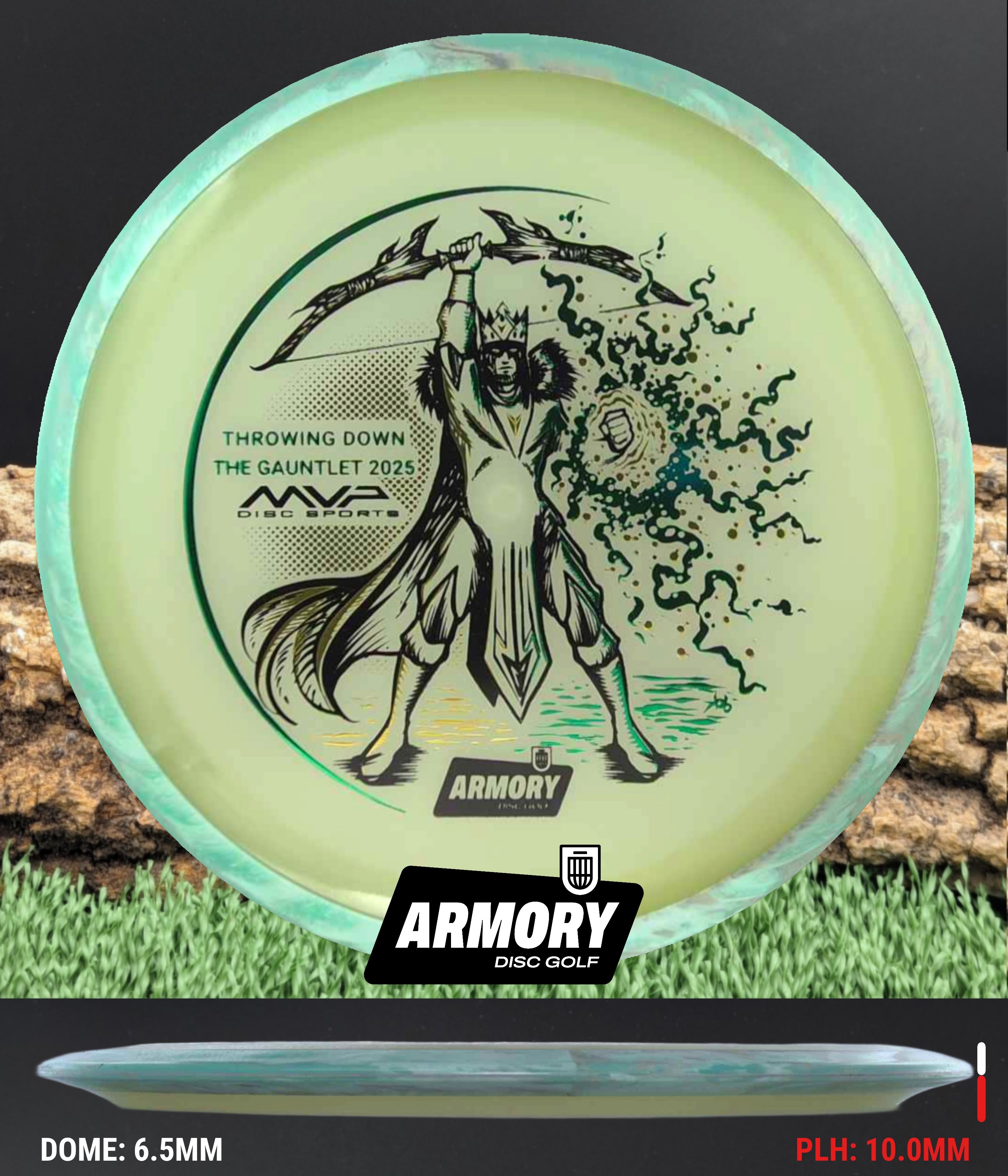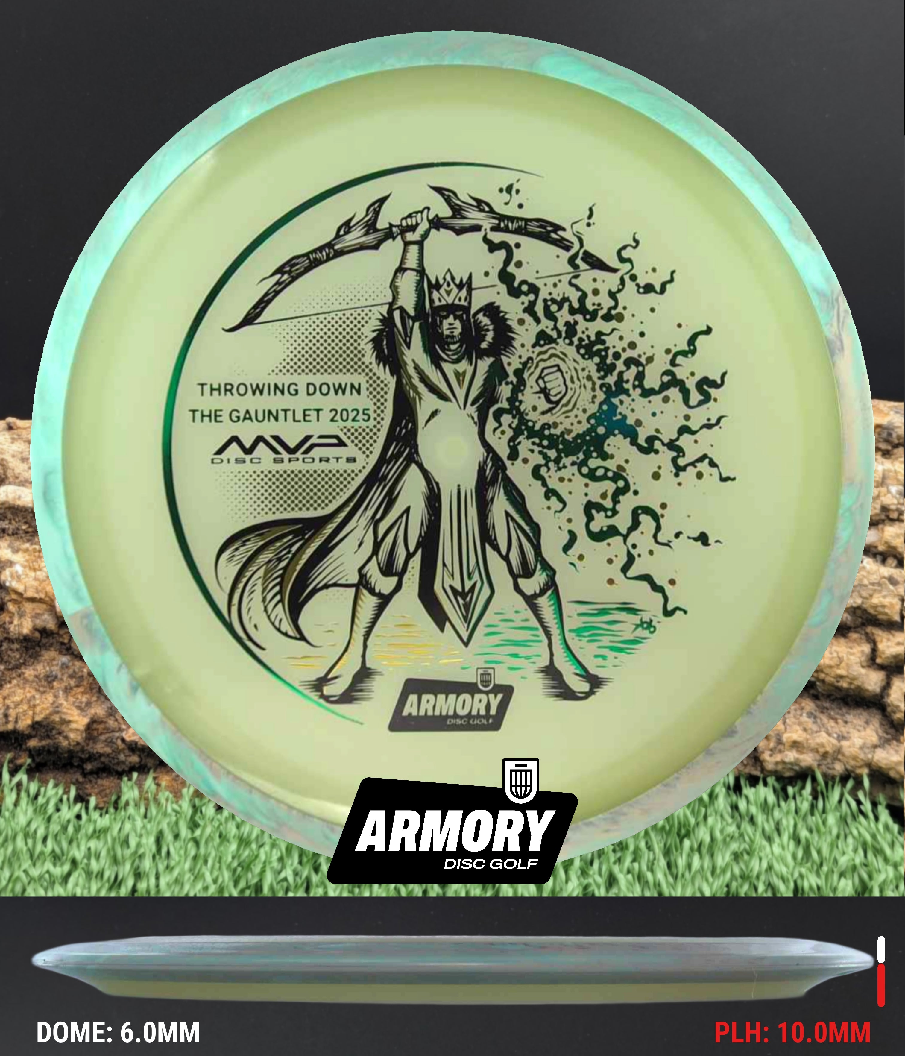 Flat, stable, and glowing with victory — the Eclipse Insanity steps into the spotlight for the Throwing Down the Gauntlet Championship. Featuring a 3-foil black, gold, and emerald stamp from Kelly “KoB” Baber, this run depicts the crowned Woodland Syndicate general standing victorious with bow raised high — a perfect tribute to calculated power and precision.